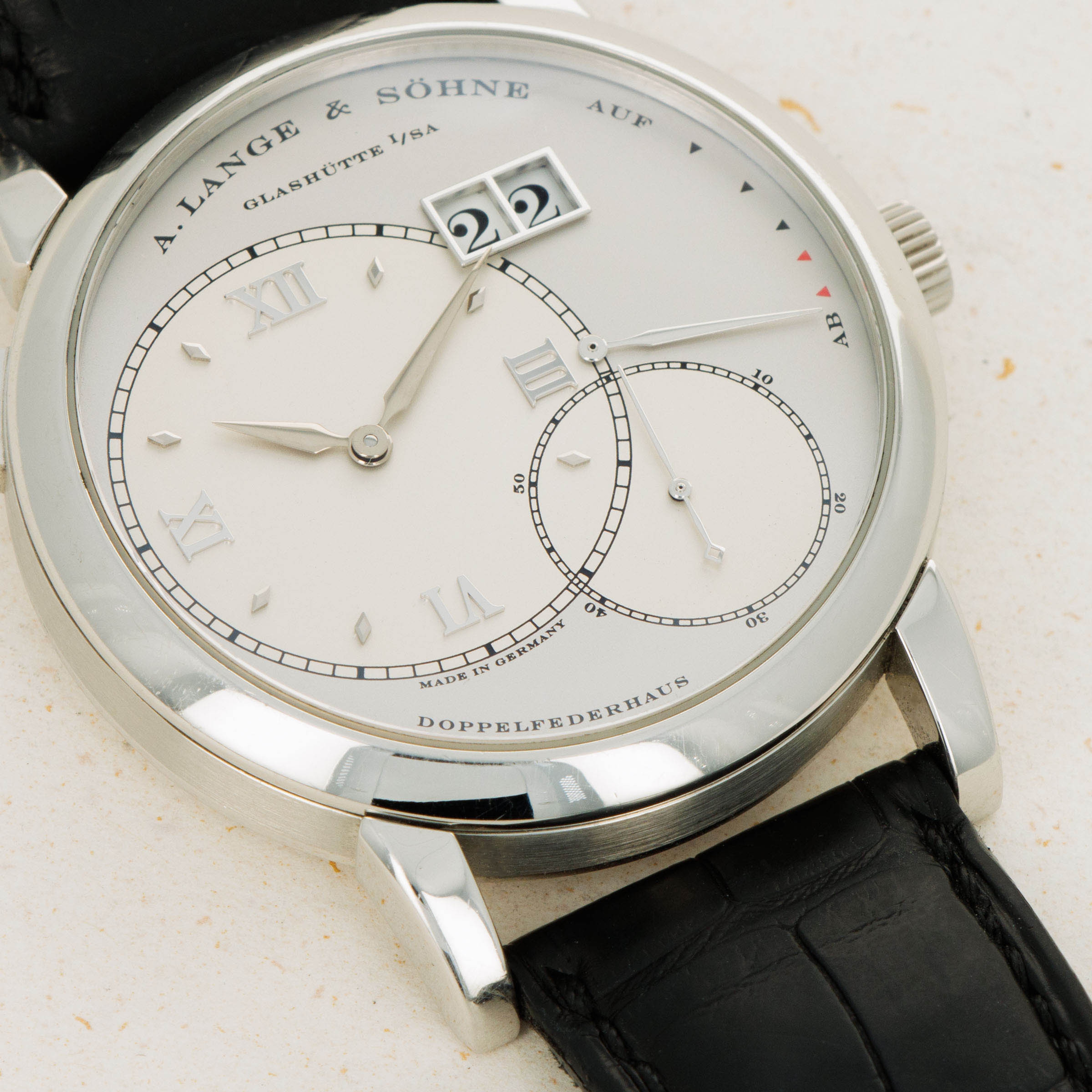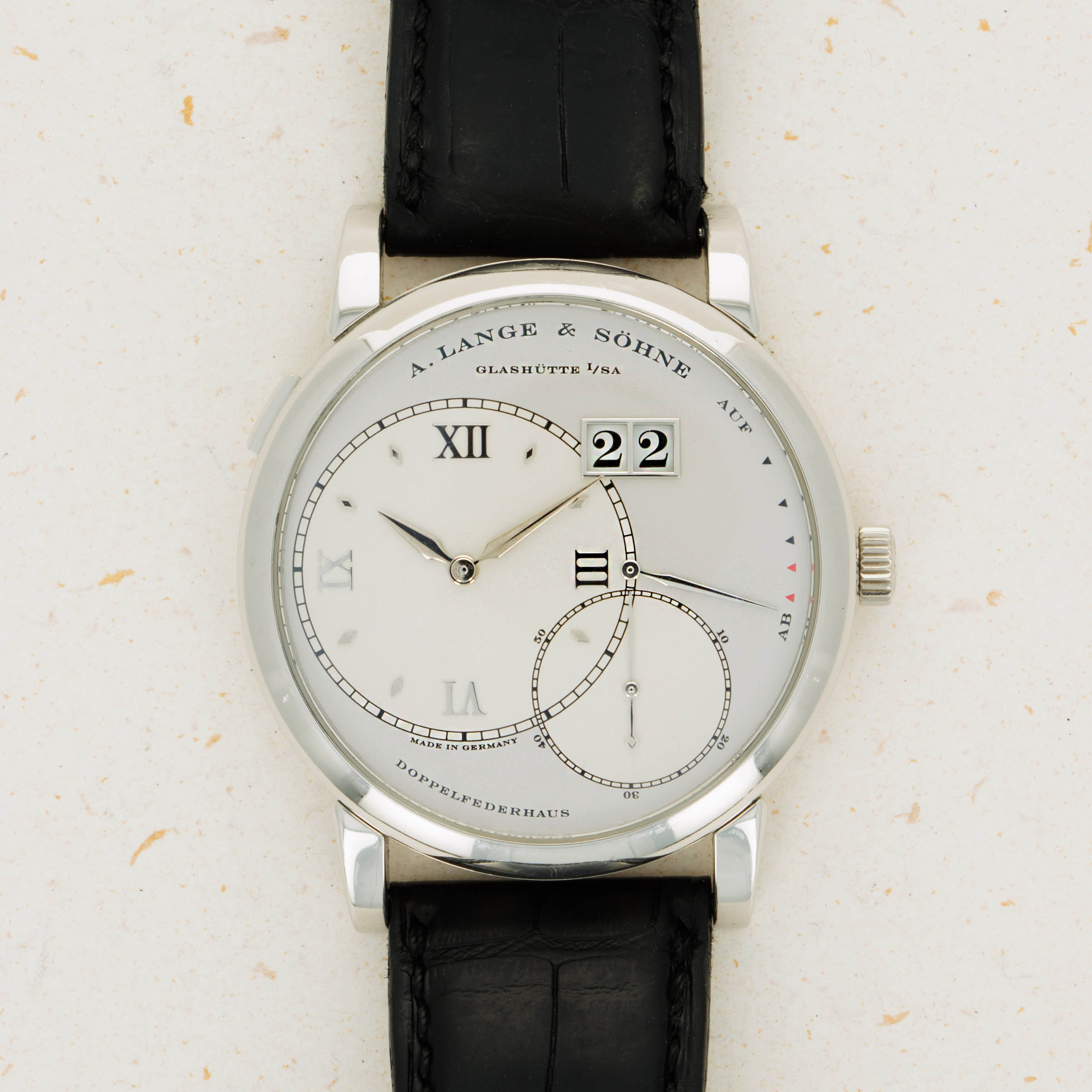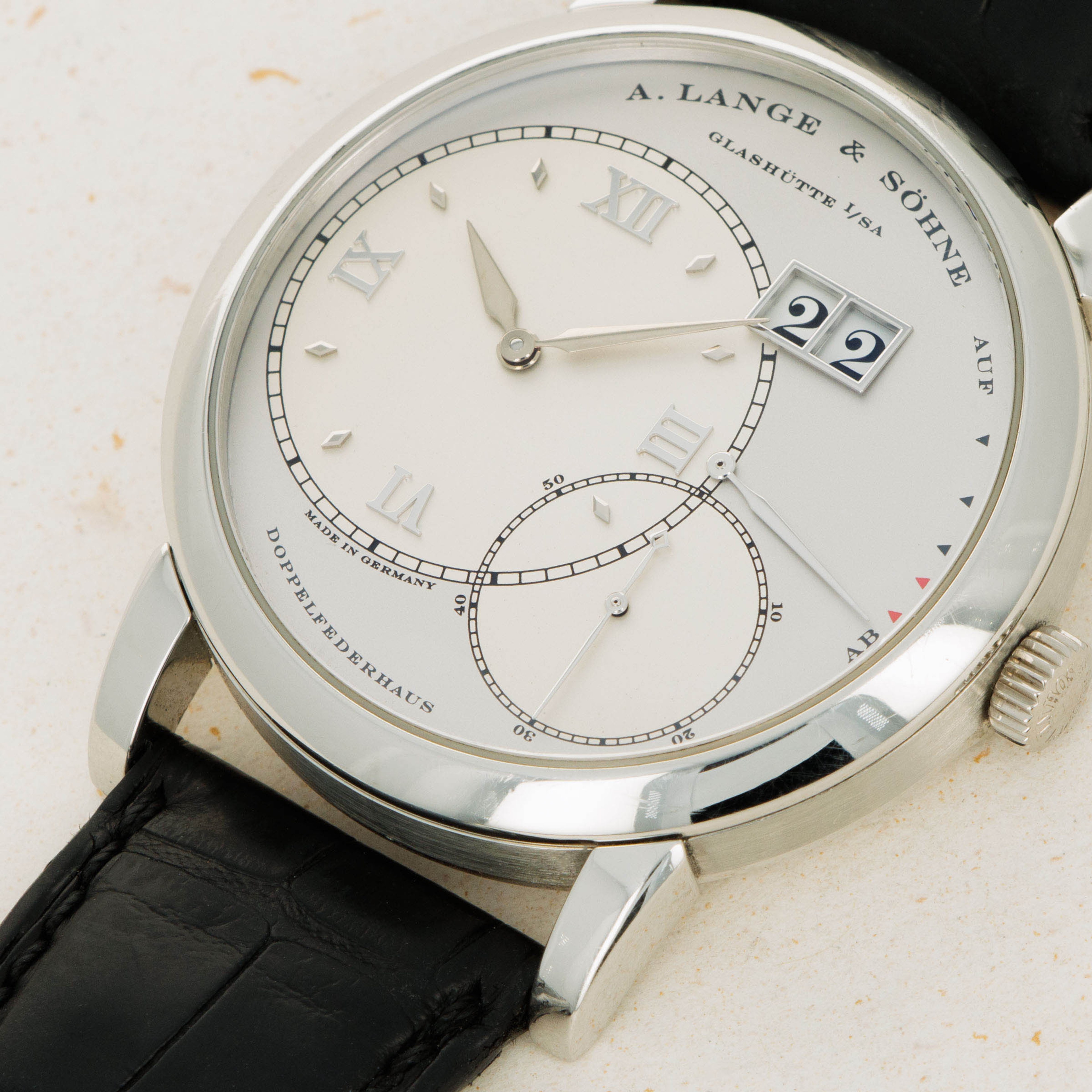 Released in 1994 as one of A. Lange & Söhne’s original watches after their relaunch, the Lange 1 is widely considered one of the most recognizable watches Lange has ever created. With its off-center outsize date indication - inspired by the Five-Minute Clock in the Semper Opera House, asymmetrically positioned hour and minute sub-dial, seconds sub-dial at 5 o’clock, and a power-reserve indicator at 3 o’clock, the Lange 1 has become a staple within the brand’s portfolio of iconic timepieces. Combining its heritage-inspired design with a more modern touch, the Grand Lange 1 was launched in 2003 as an expansion within the Lange 1 family, with a 3.4mm larger case to make the watch better fit within contemporary tastes and overlapping subdials to highlight its stance as a Lange 1 variant. Made of platinum fitted with a two-tone silver dial with brighter portions contained within its subdials, the Grand Lange 1 combines its understated design with elegant craftsmanship that is unreservedly ‘Lange’ in its execution. With its immaculately finished manual-wind cal. L901 on display behind its exhibition caseback, it carries its impeccable craftsmanship through its entire construction right through to its movement, a testament to Lange’s dedication to their timepieces.