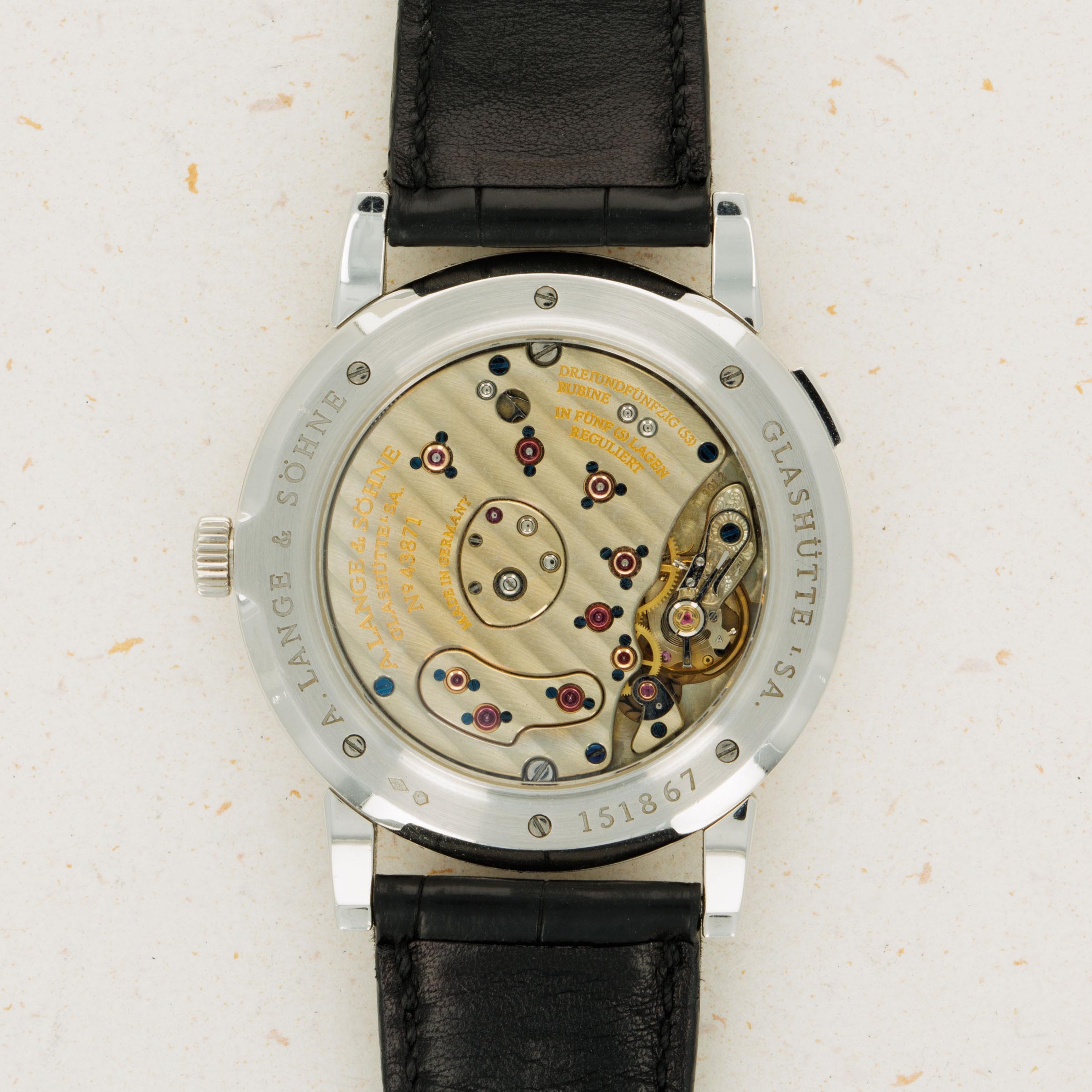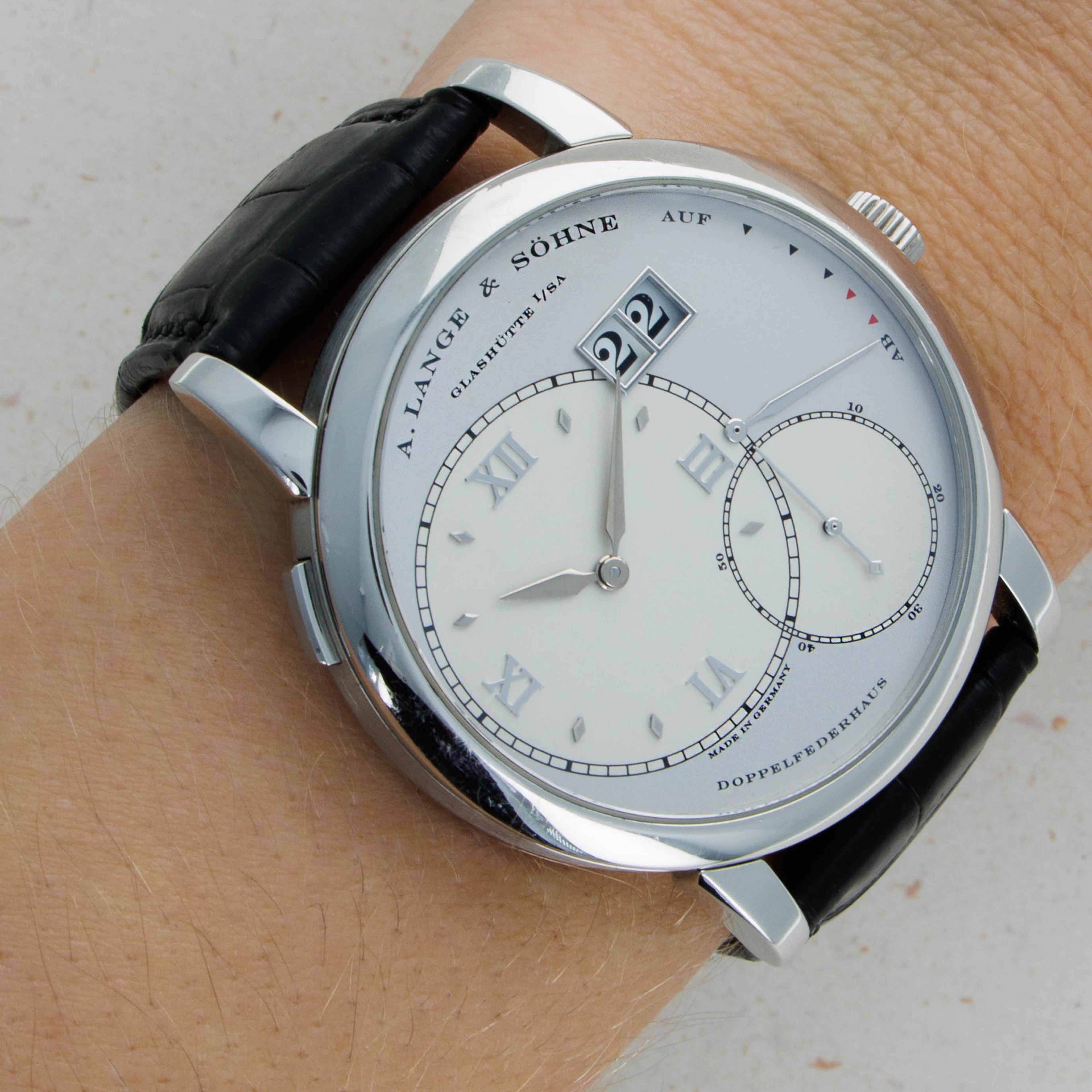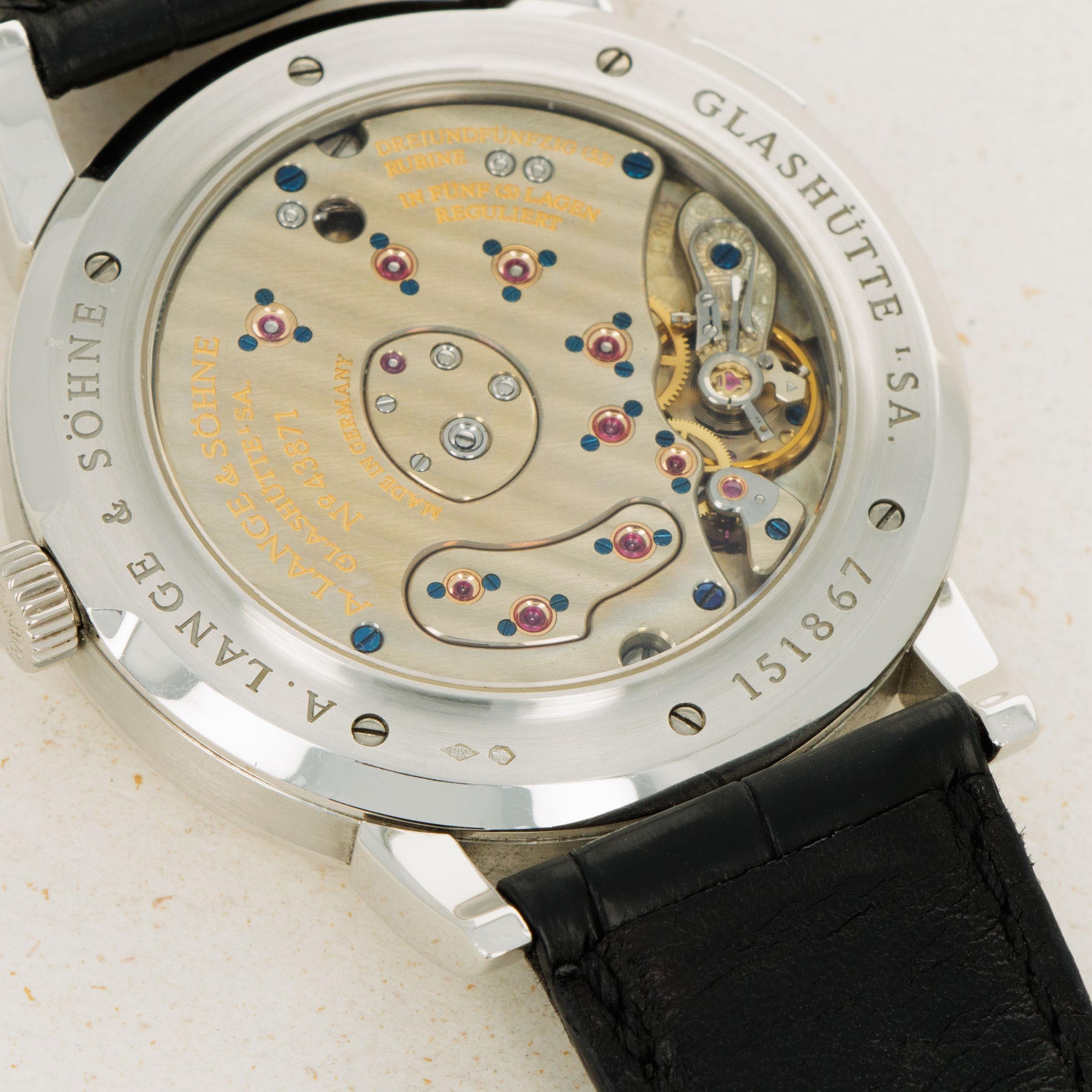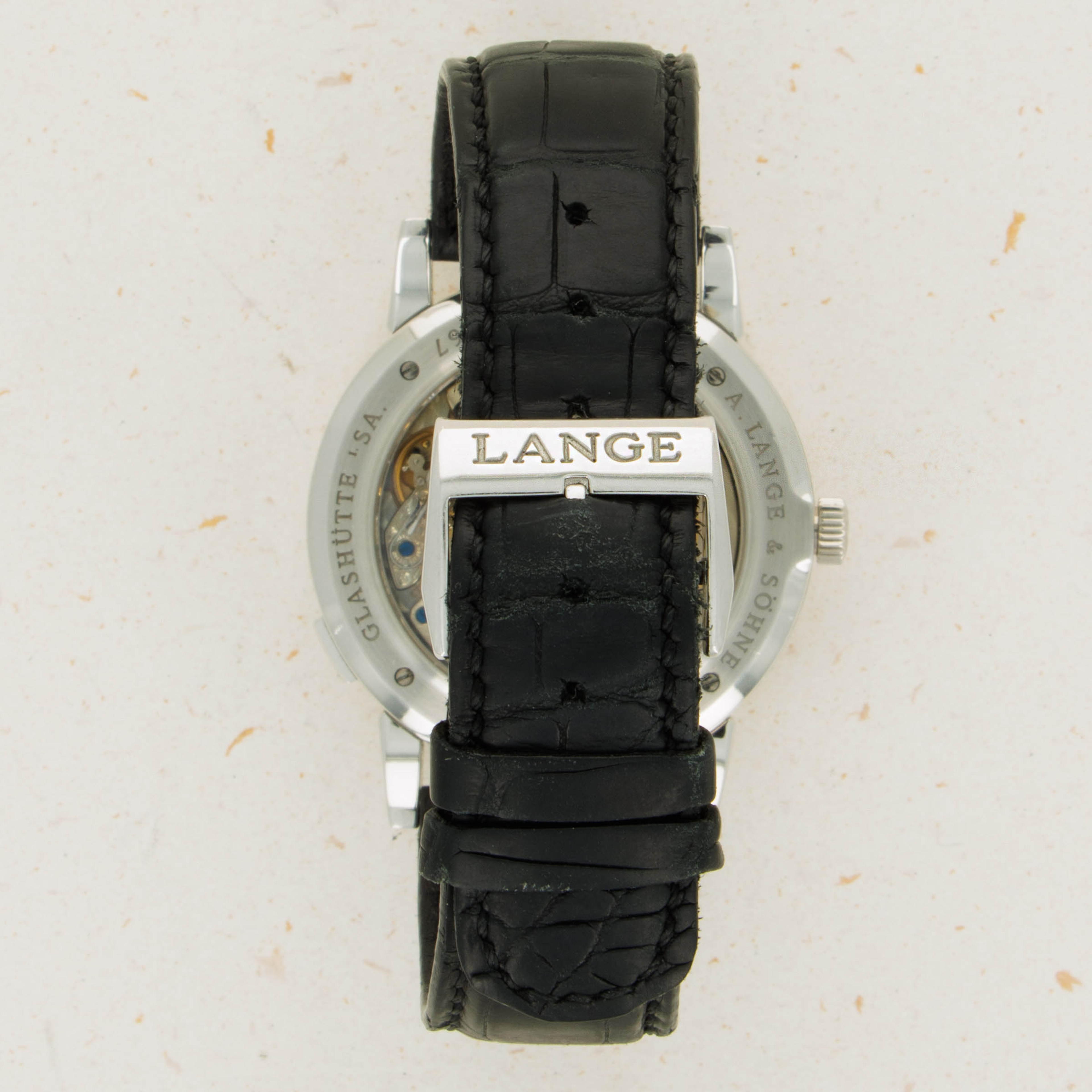 Released in 1994 as one of A. Lange & Söhne’s original watches after their relaunch, the Lange 1 is widely considered one of the most recognizable watches Lange has ever created. With its off-center outsize date indication - inspired by the Five-Minute Clock in the Semper Opera House, asymmetrically positioned hour and minute sub-dial, seconds sub-dial at 5 o’clock, and a power-reserve indicator at 3 o’clock, the Lange 1 has become a staple within the brand’s portfolio of iconic timepieces. Combining its heritage-inspired design with a more modern touch, the Grand Lange 1 was launched in 2003 as an expansion within the Lange 1 family, with a 3.4mm larger case to make the watch better fit within contemporary tastes and overlapping subdials to highlight its stance as a Lange 1 variant. Made of platinum fitted with a two-tone silver dial with brighter portions contained within its subdials, the Grand Lange 1 combines its understated design with elegant craftsmanship that is unreservedly ‘Lange’ in its execution. With its immaculately finished manual-wind cal. L901 on display behind its exhibition caseback, it carries its impeccable craftsmanship through its entire construction right through to its movement, a testament to Lange’s dedication to their timepieces.