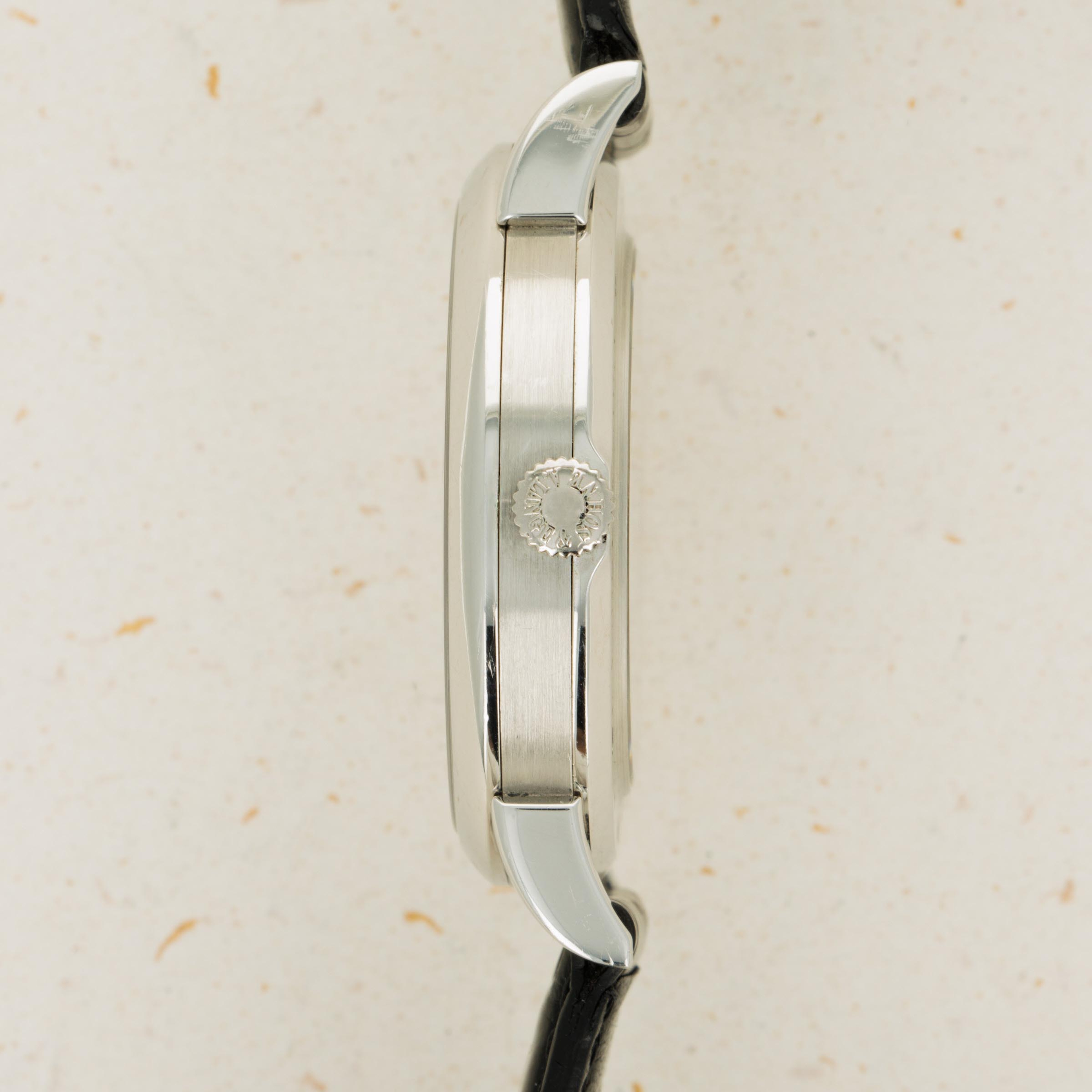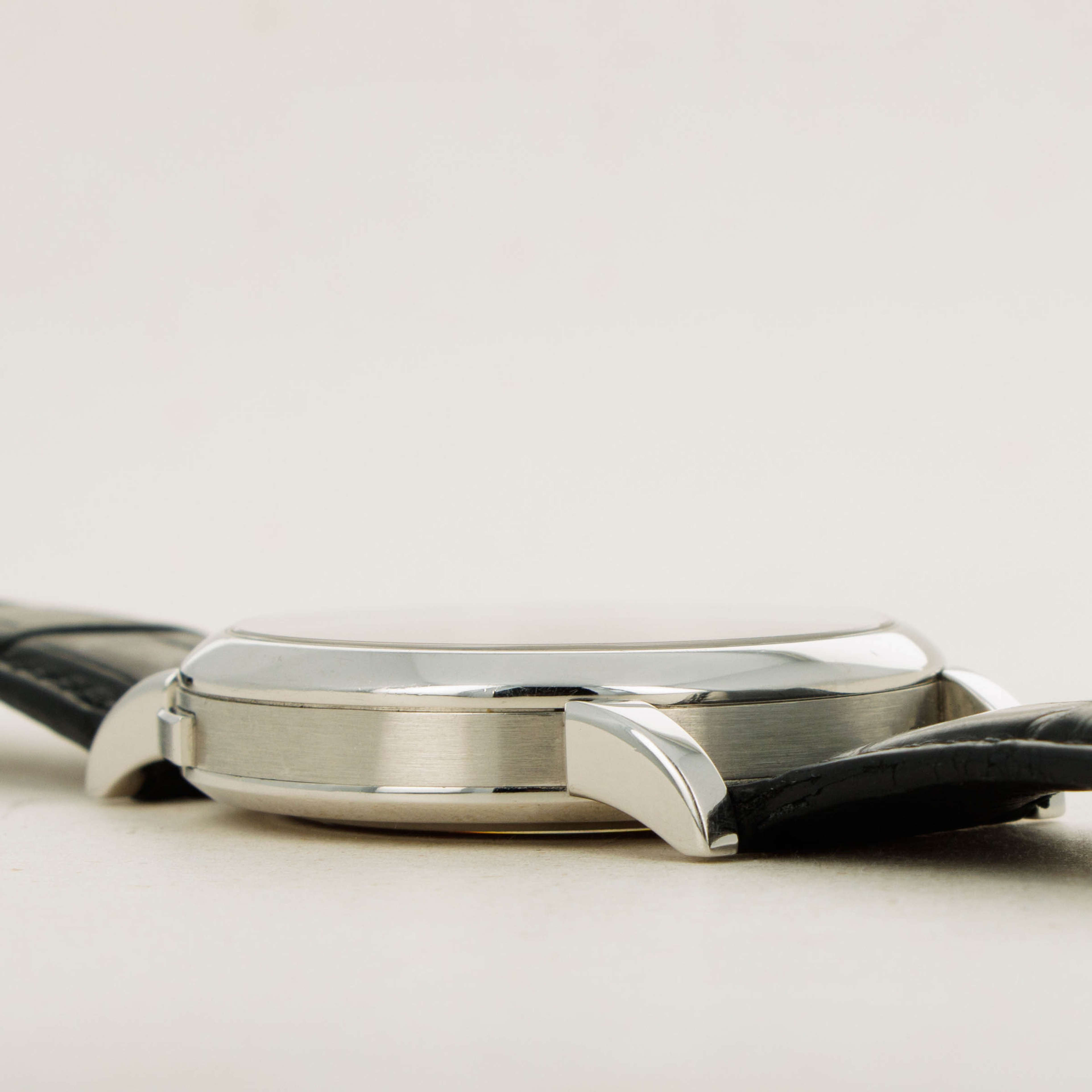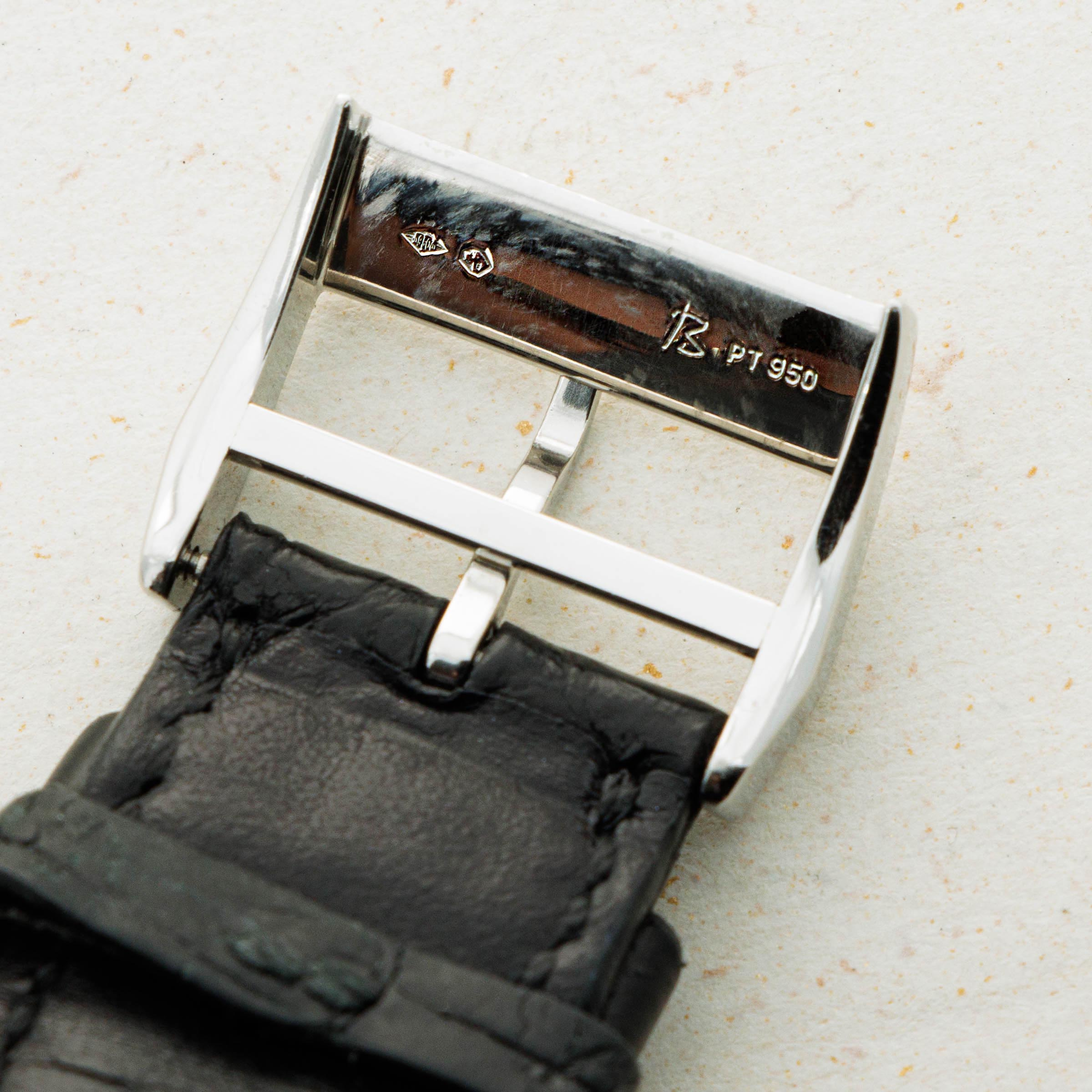 Watch is in excellent overall condition. Platinum case has visible scratches, primarily along the polished surfaces. Engravings along the caseback are crisp and well defined. Dial near-mint with no visible signs of wear. Watch comes with original platinum tang buckle.