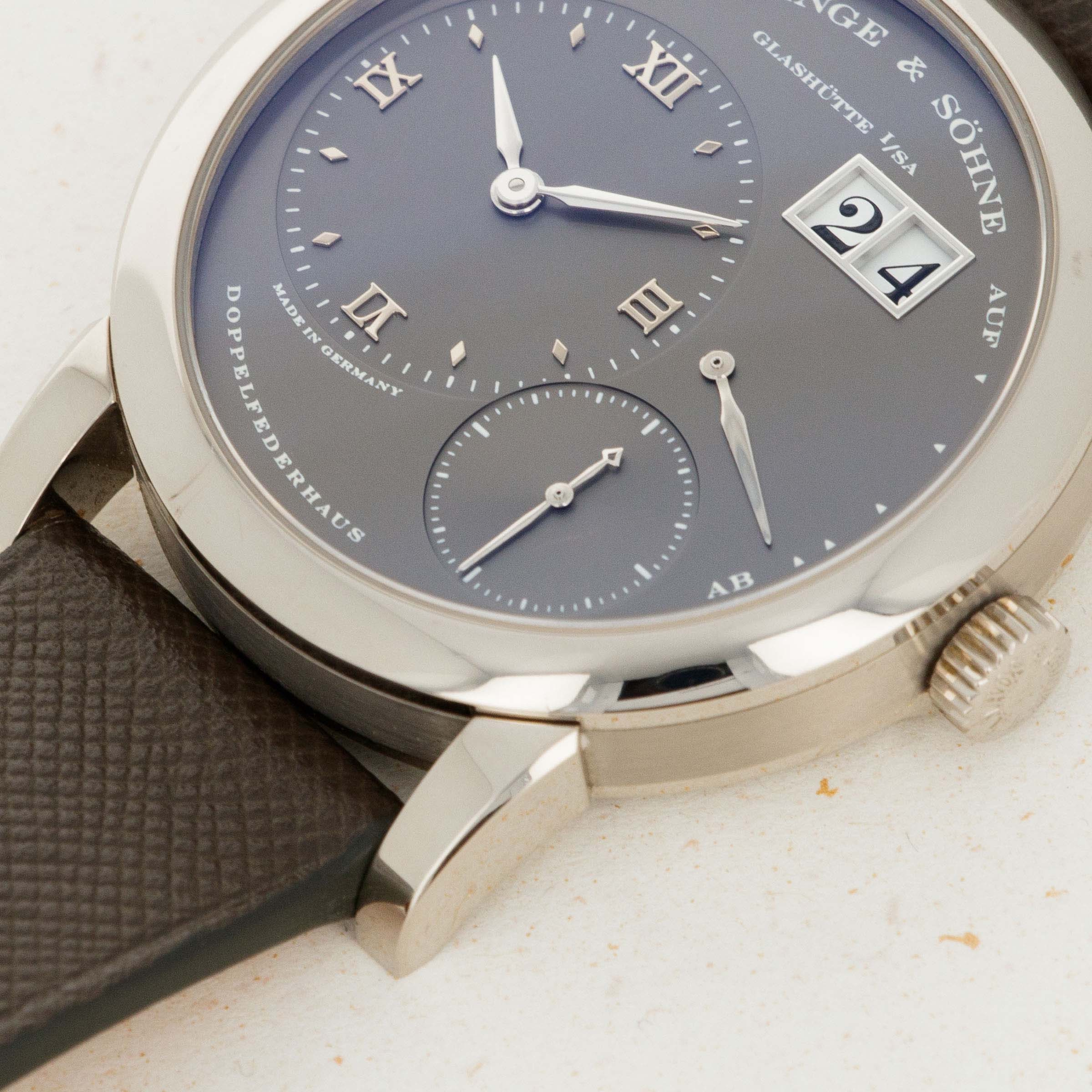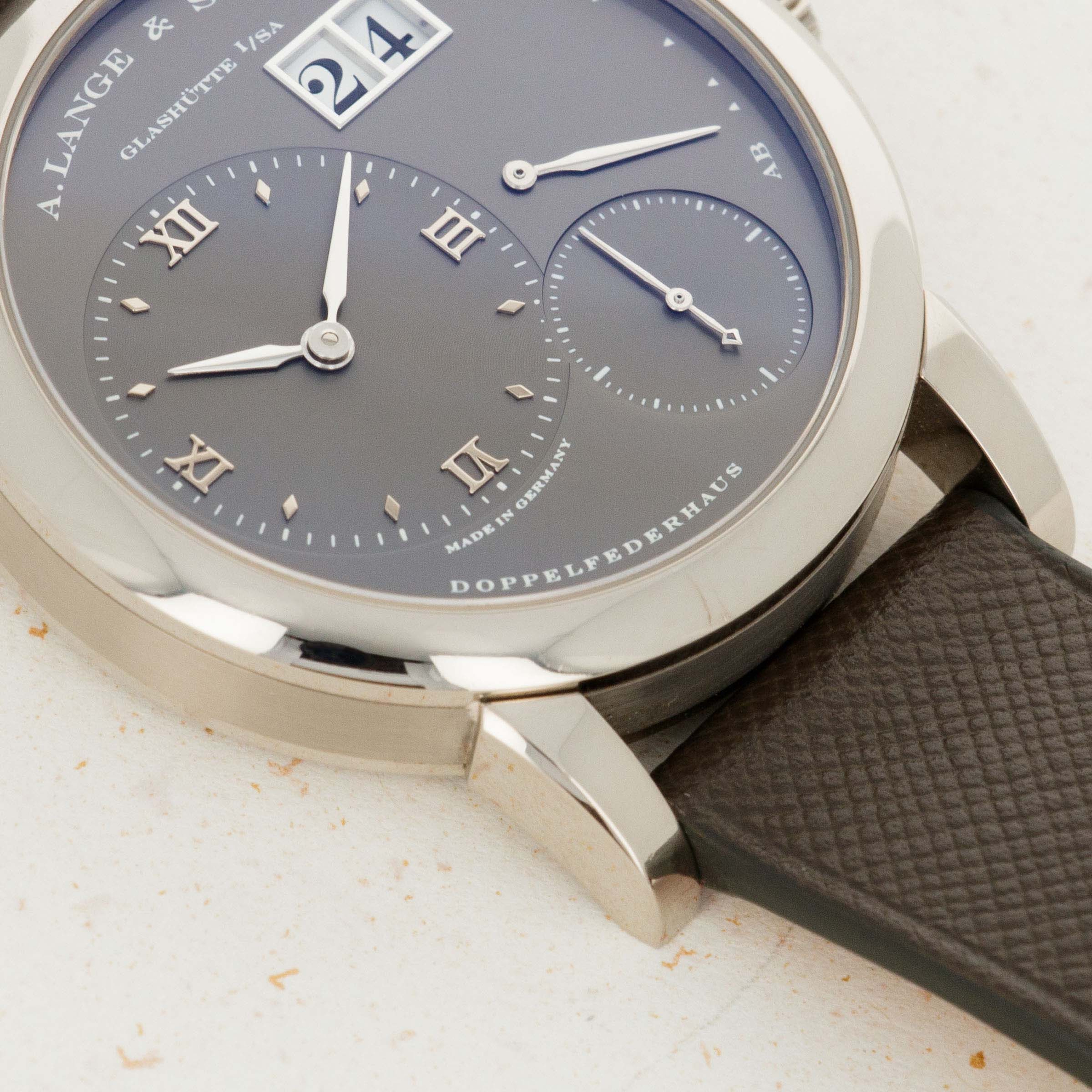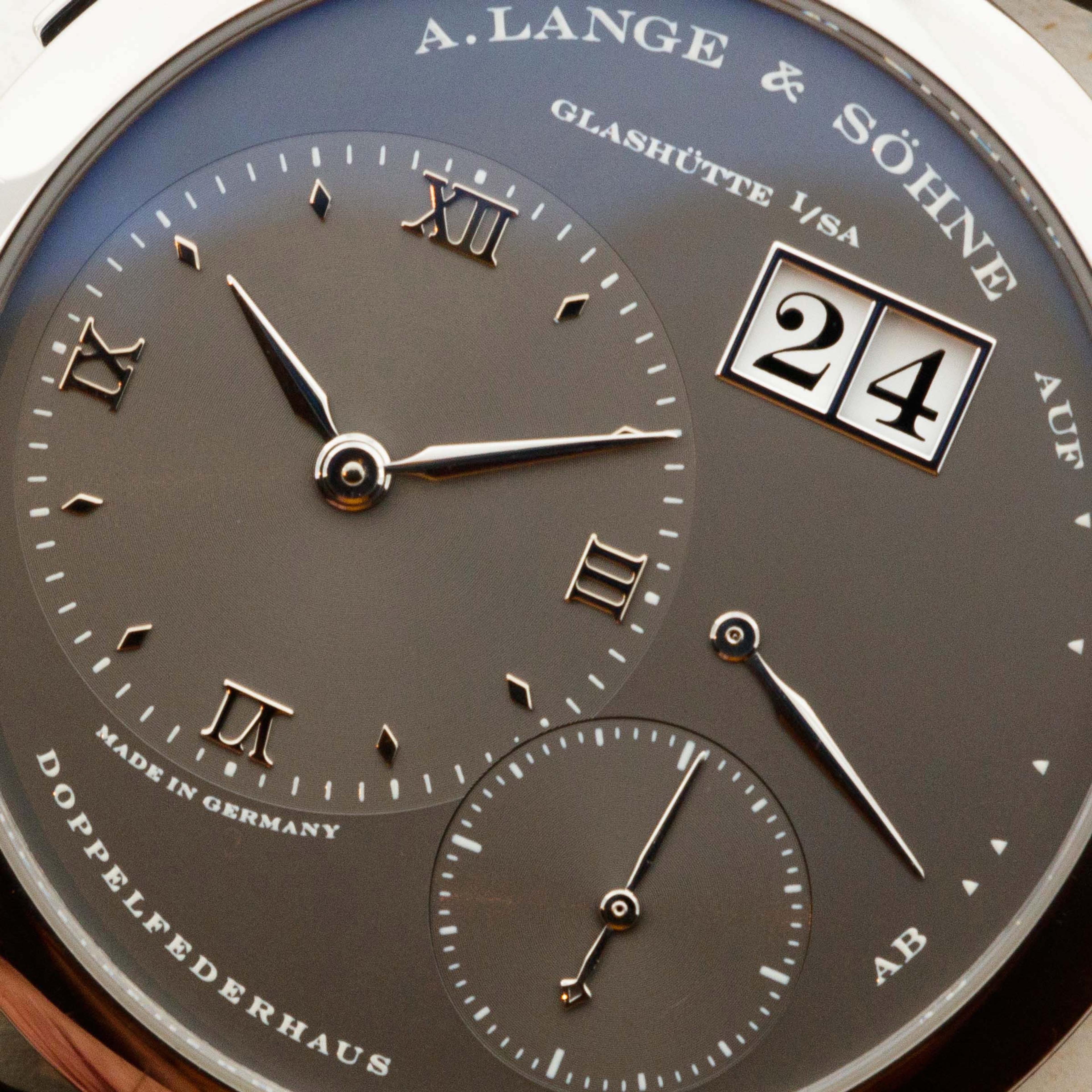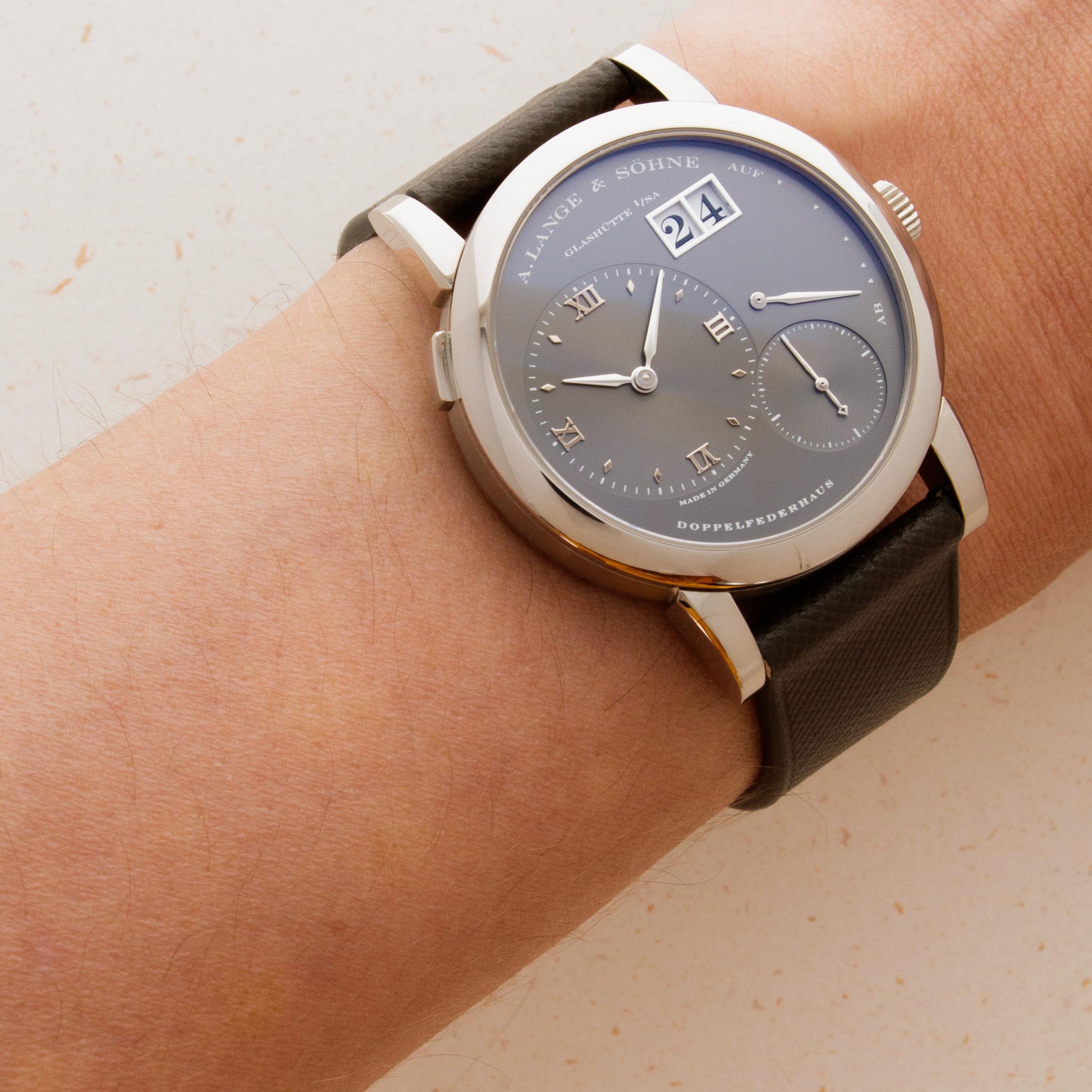 Featuring a galvanized grey sterling silver dial, the Lange 1's dial matches the subtle grey undertone of its 18kt white gold 38.5mm case, thus allowing its entire aesthetic to be monochromatic and fly under the radar with an air of total elegance.
