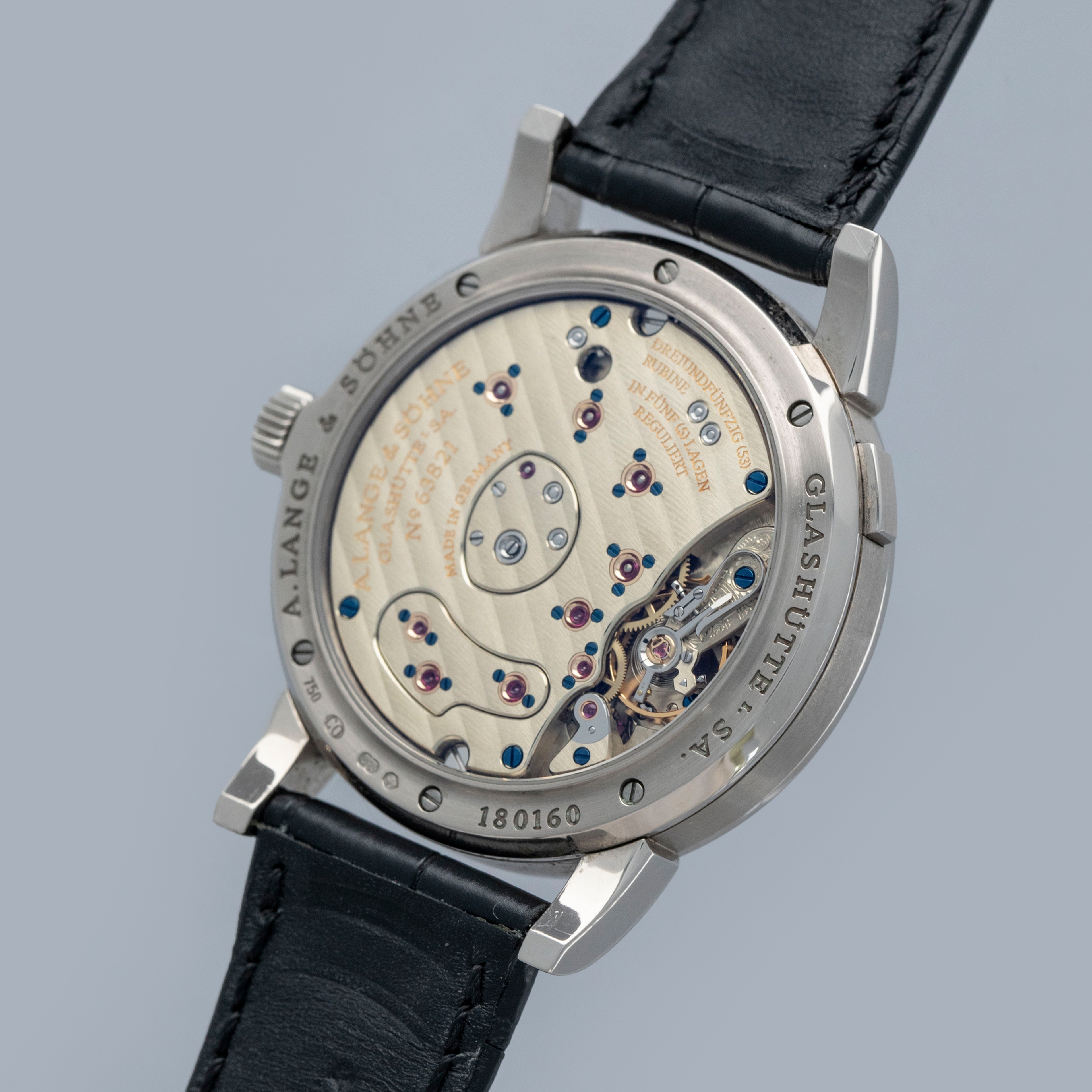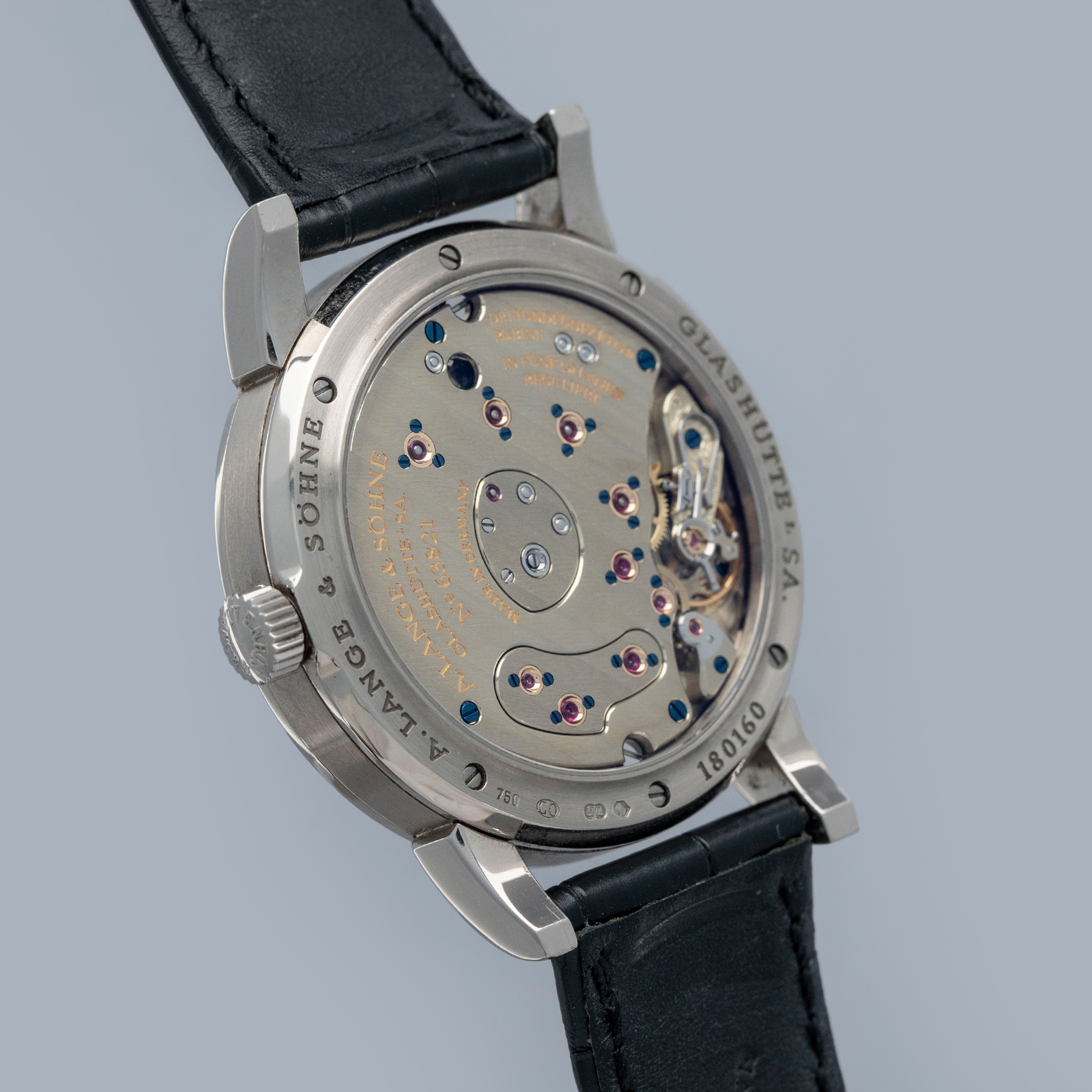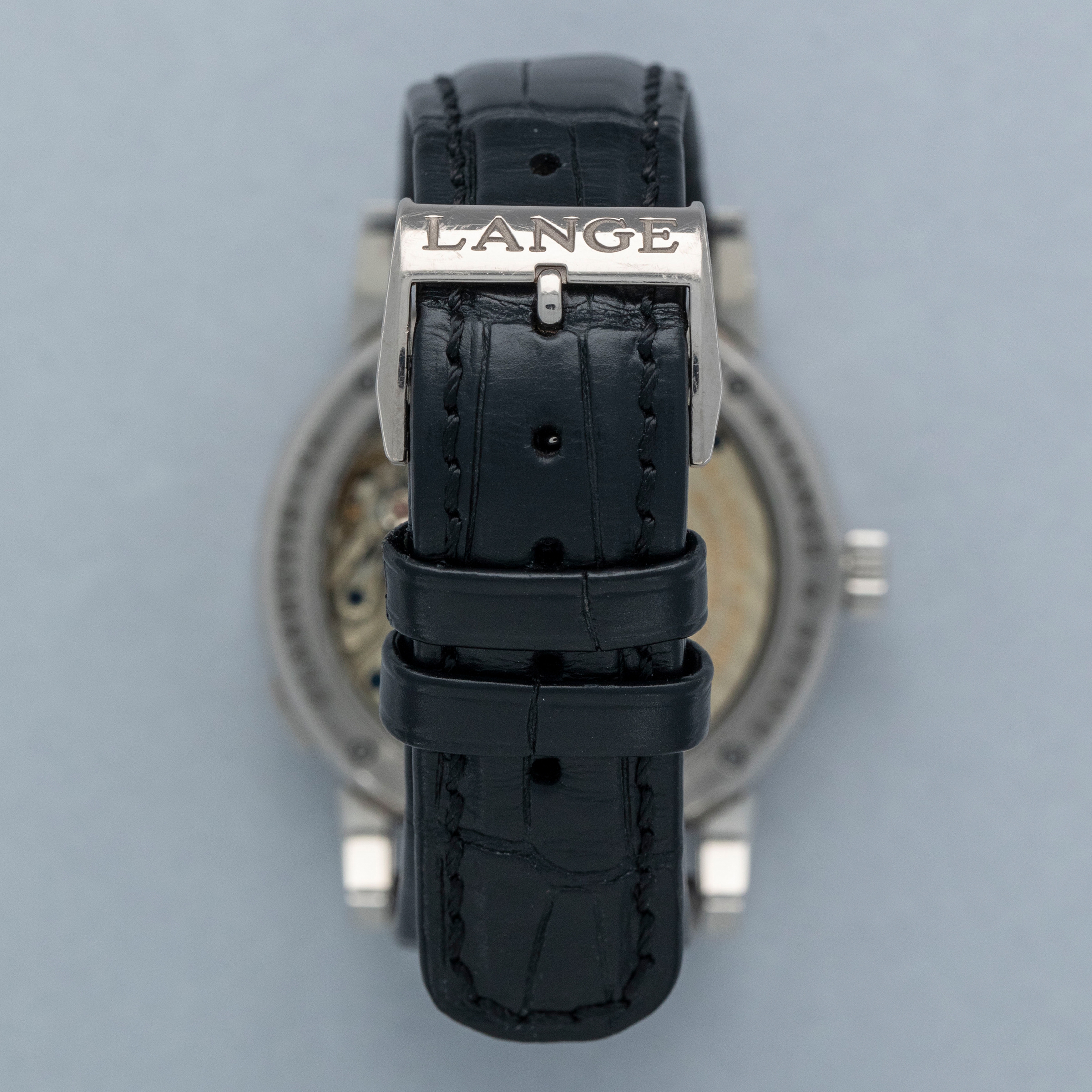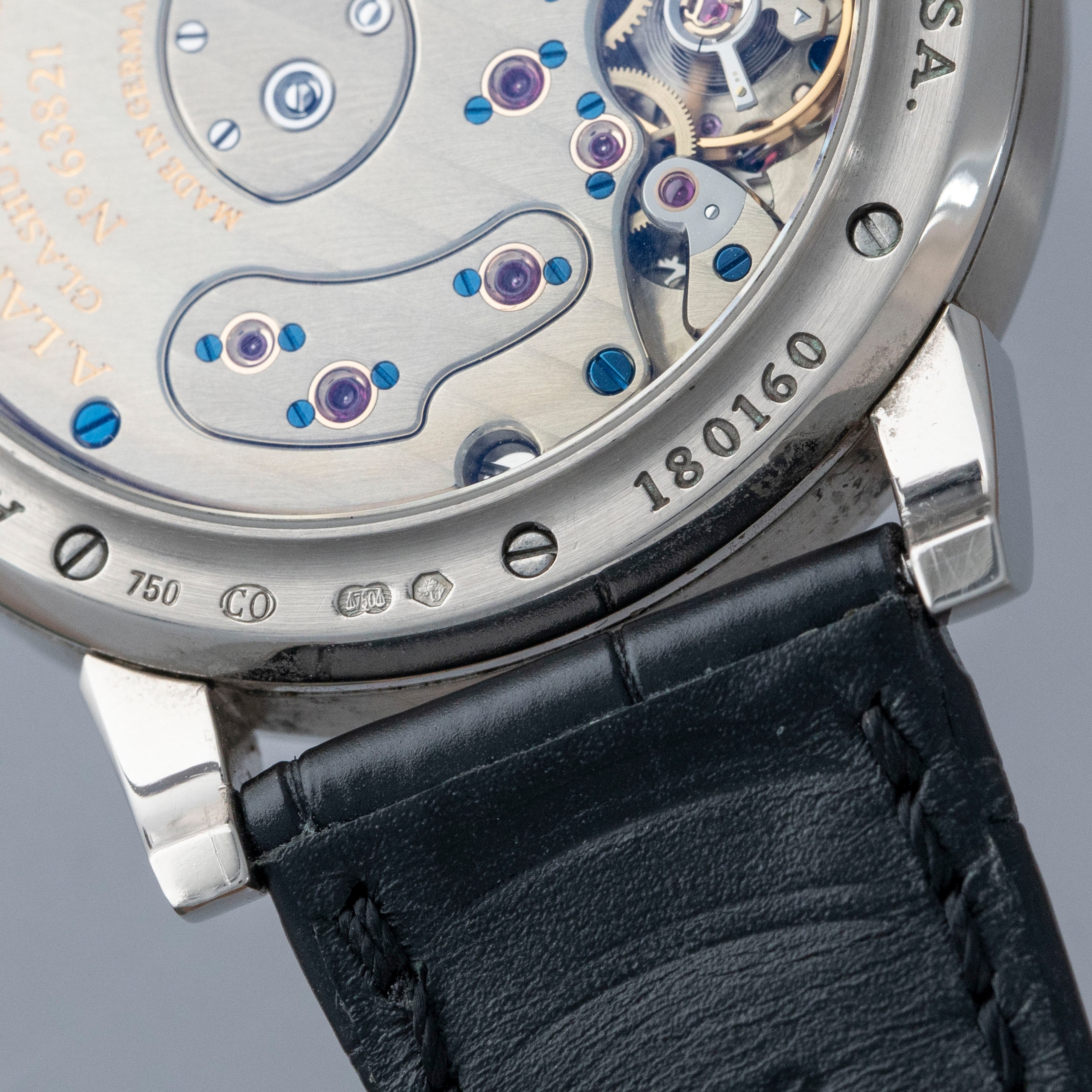 The watch is in overall excellent condition. The white gold case shows numerous light scratches and scuffs on the polished surfaces, with more noticeable marks on the backs of the lugs from strap changes. The display case back has light scratches around the edge, with crisp engravings and hallmarks. The dial and hands are near-mint. The watch is fitted with a black A. Lange & Söhne alligator strap and a white gold buckle, which shows some scratches.