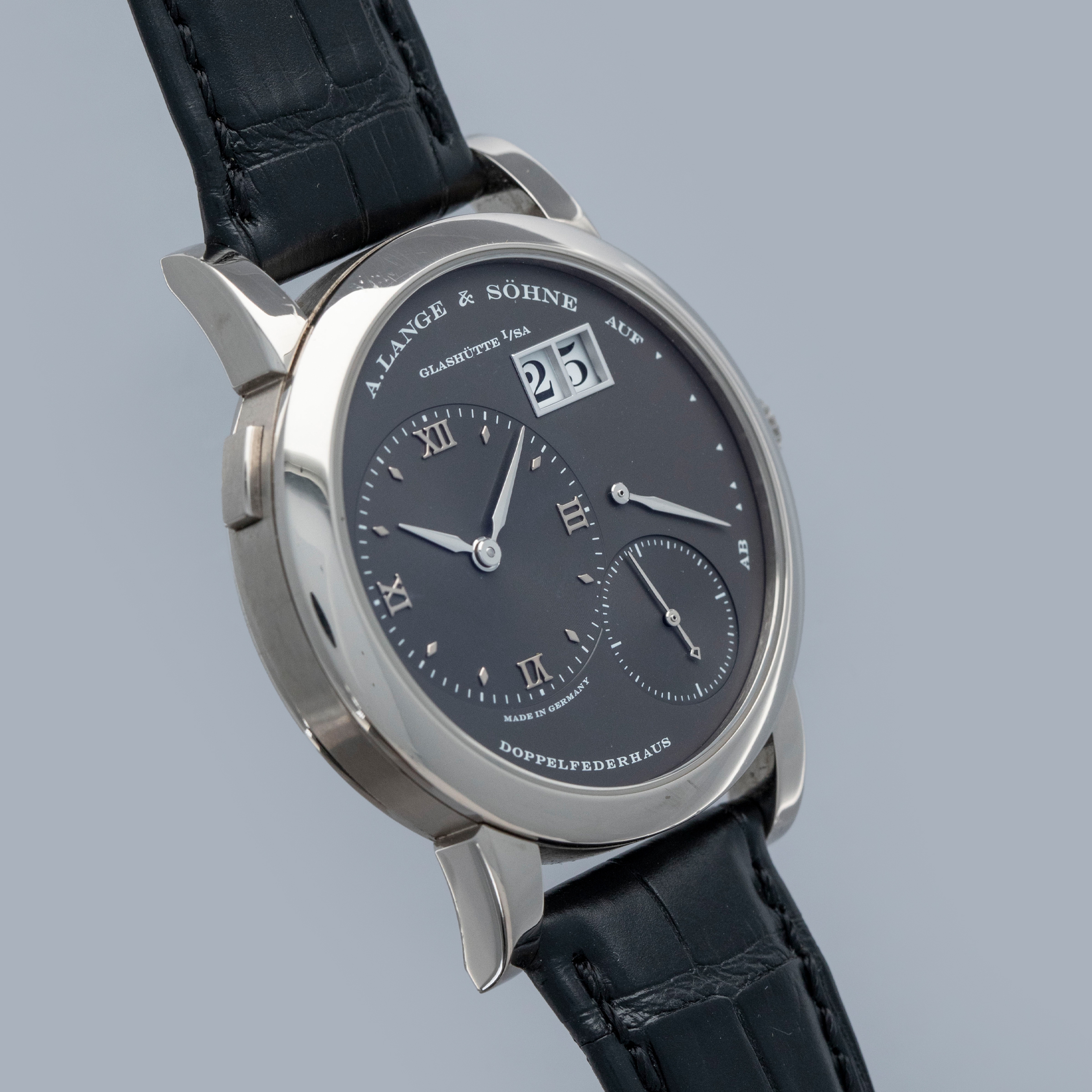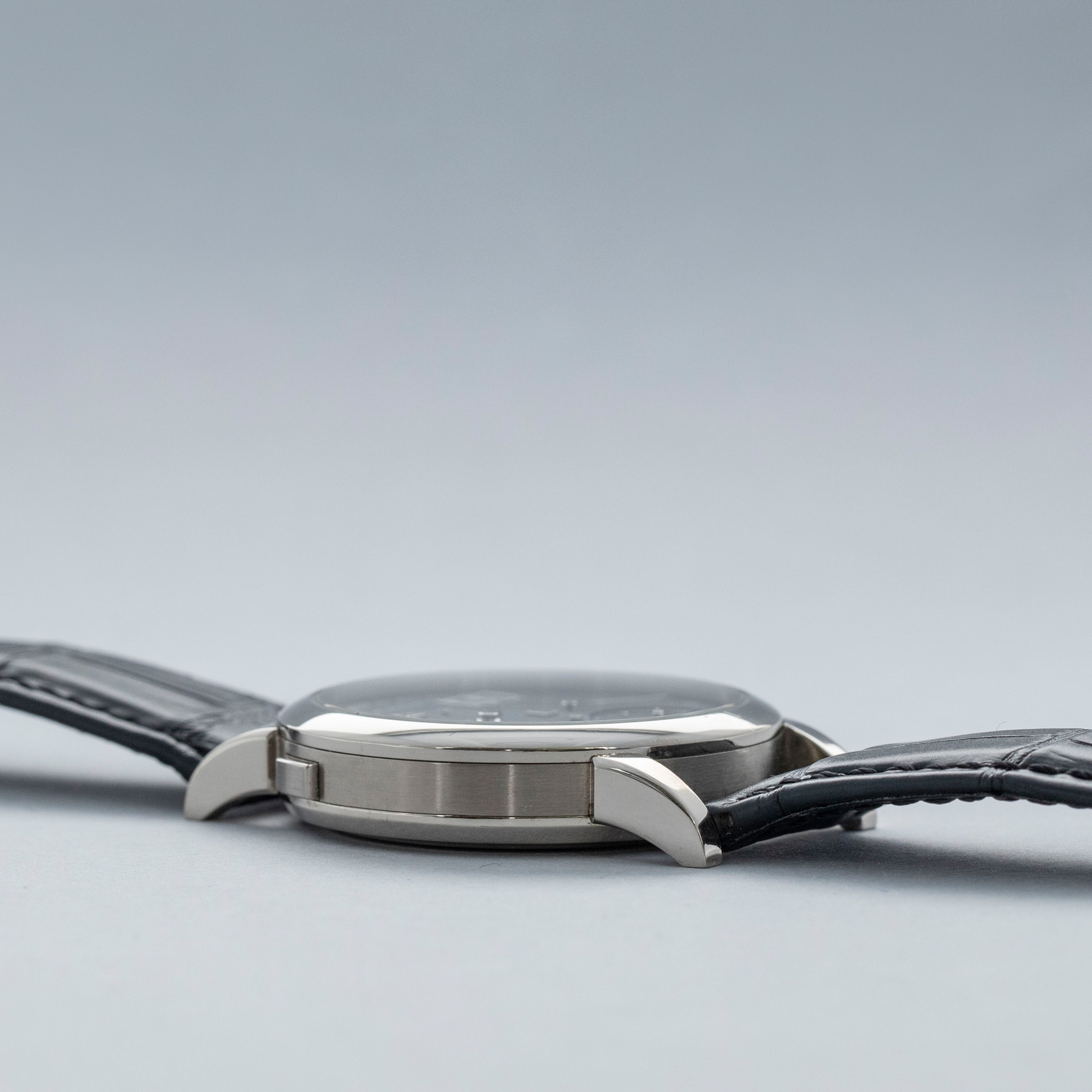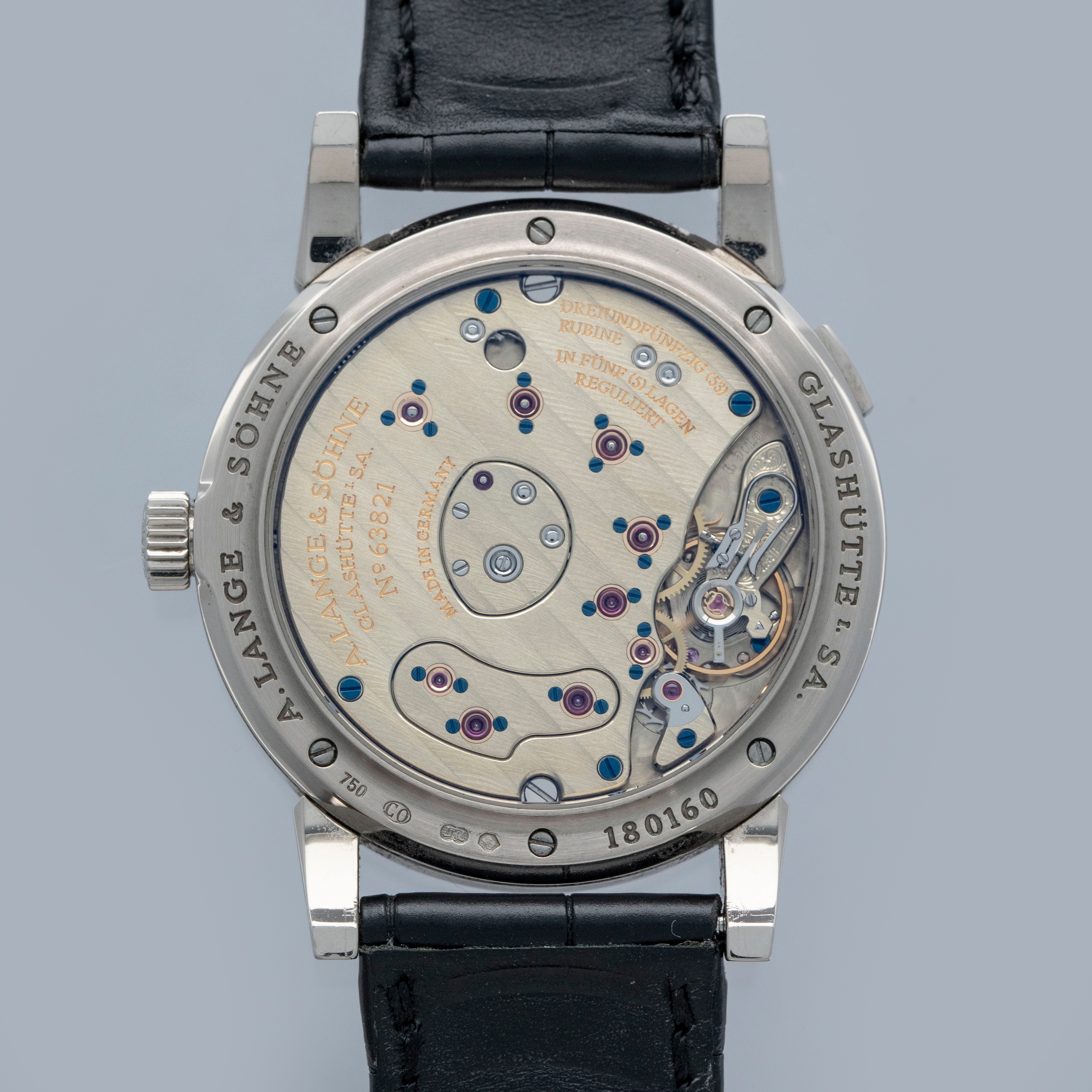 The watch is in overall excellent condition. The white gold case shows numerous light scratches and scuffs on the polished surfaces, with more noticeable marks on the backs of the lugs from strap changes. The display case back has light scratches around the edge, with crisp engravings and hallmarks. The dial and hands are near-mint. The watch is fitted with a black A. Lange & Söhne alligator strap and a white gold buckle, which shows some scratches.