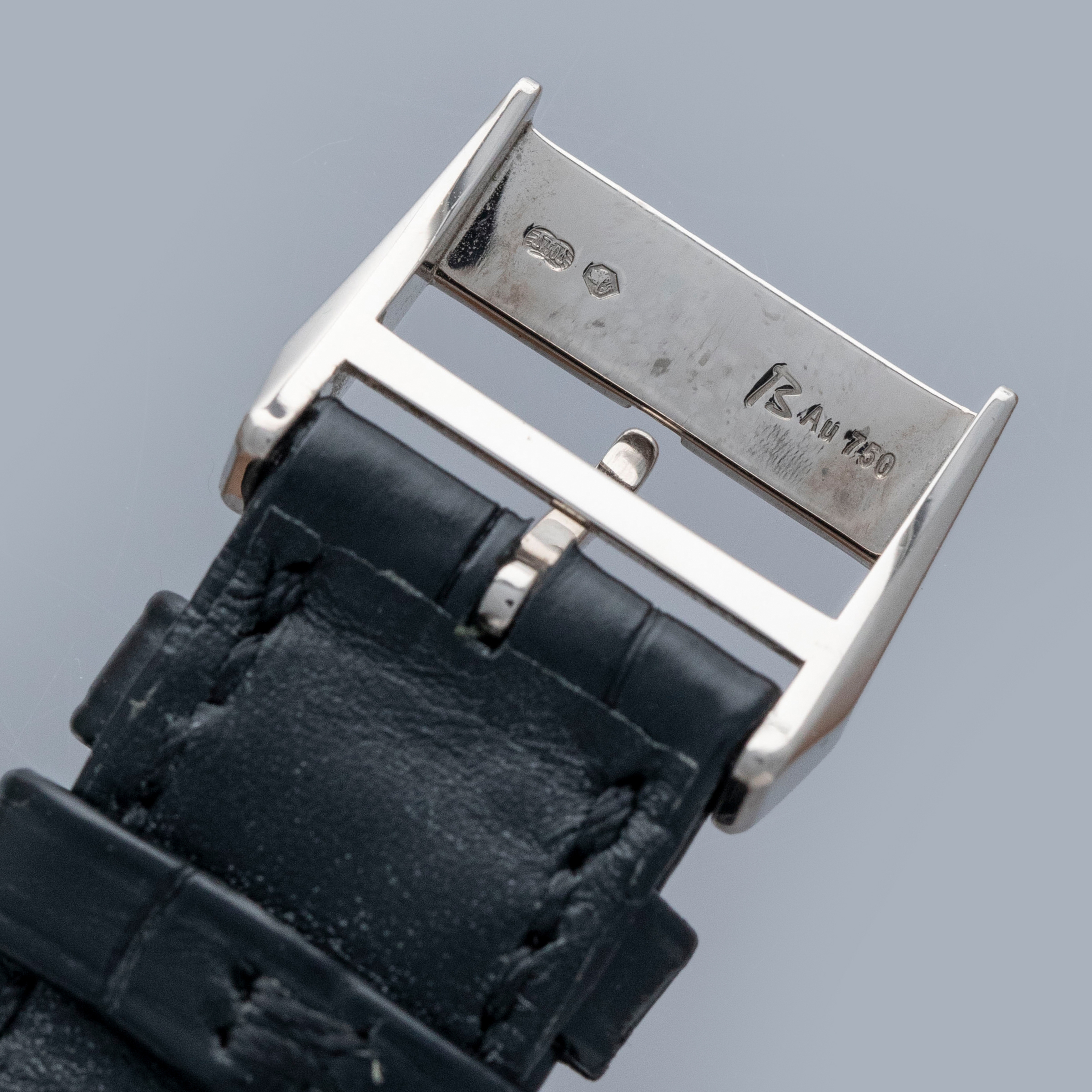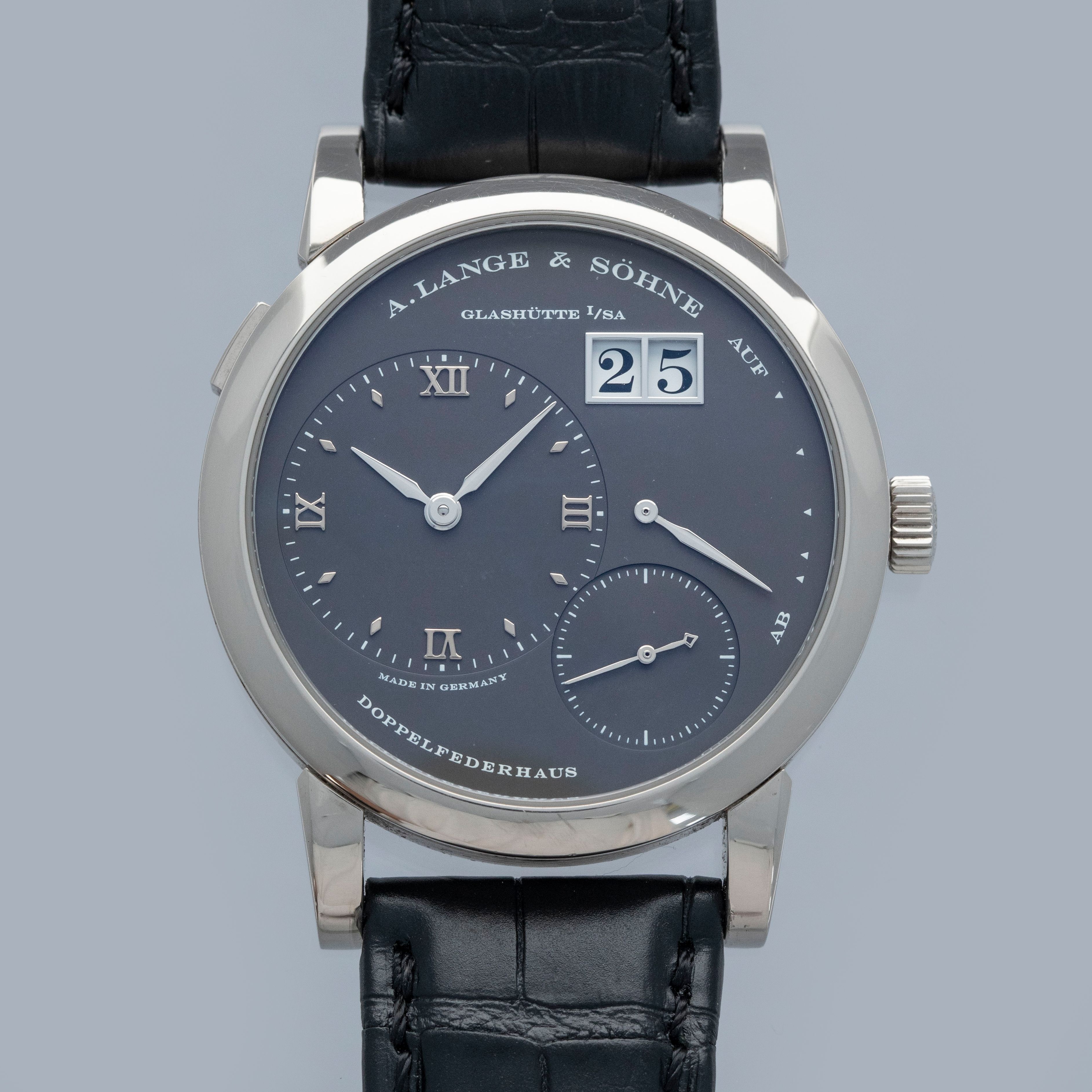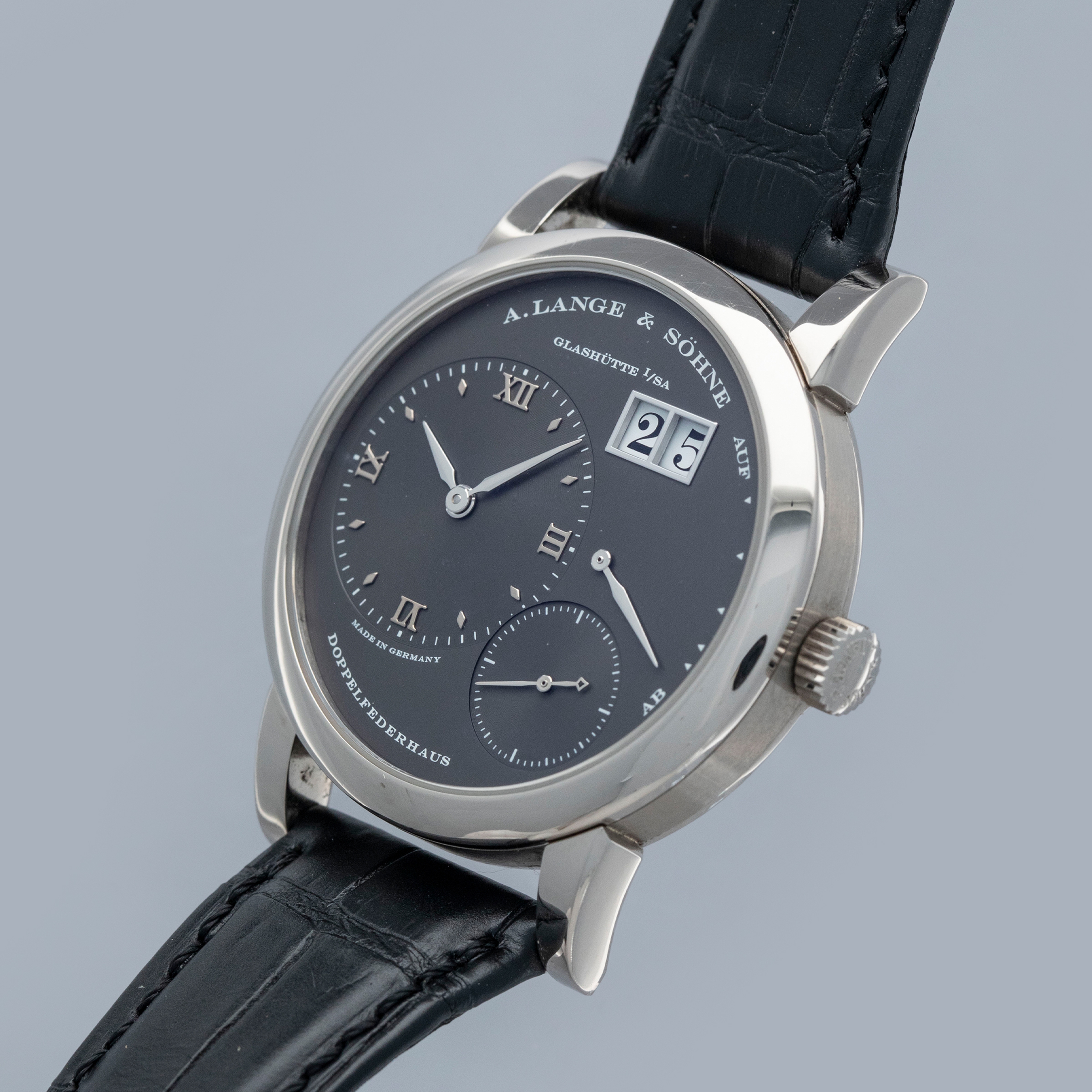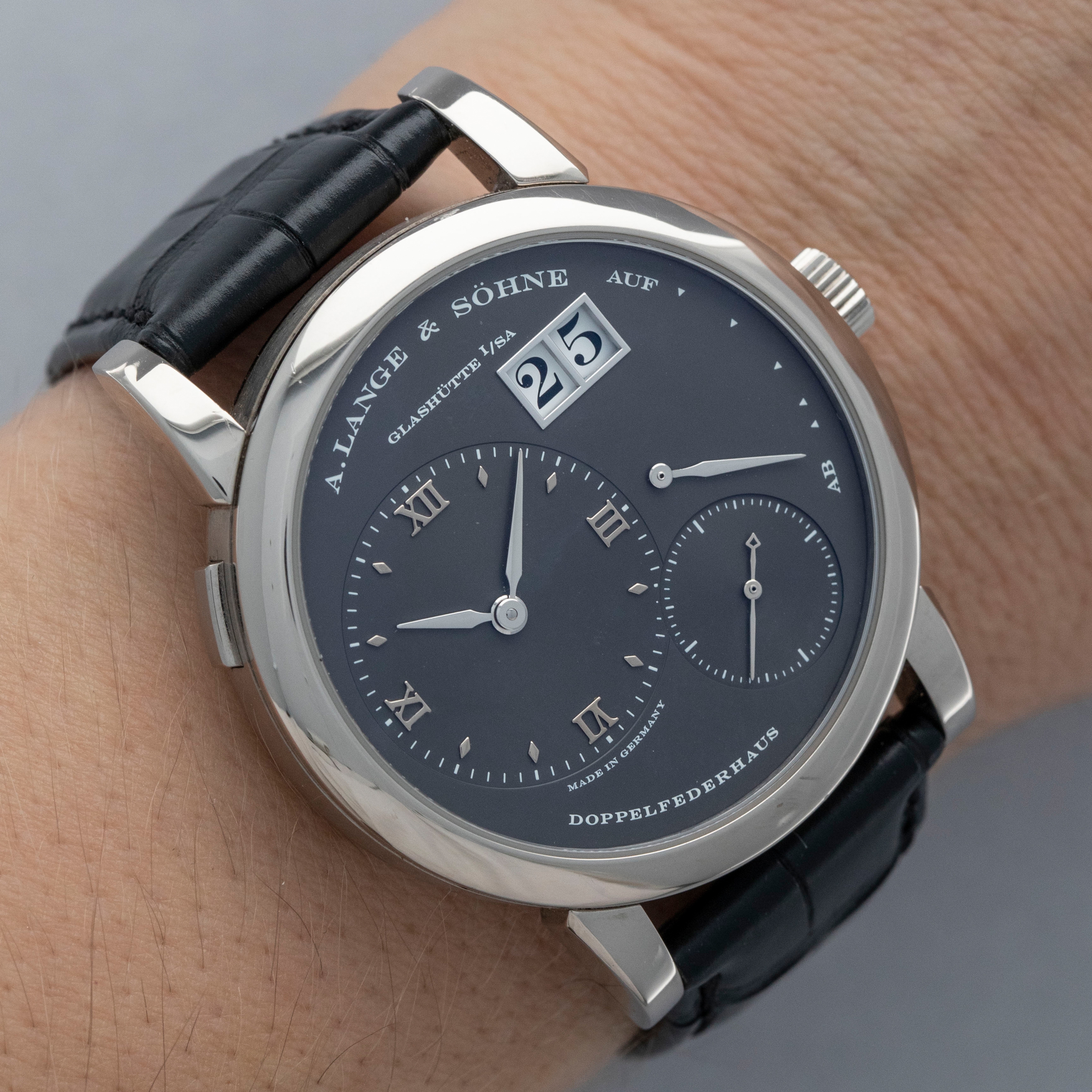 The watch is in overall excellent condition. The white gold case shows numerous light scratches and scuffs on the polished surfaces, with more noticeable marks on the backs of the lugs from strap changes. The display case back has light scratches around the edge, with crisp engravings and hallmarks. The dial and hands are near-mint. The watch is fitted with a black A. Lange & Söhne alligator strap and a white gold buckle, which shows some scratches.