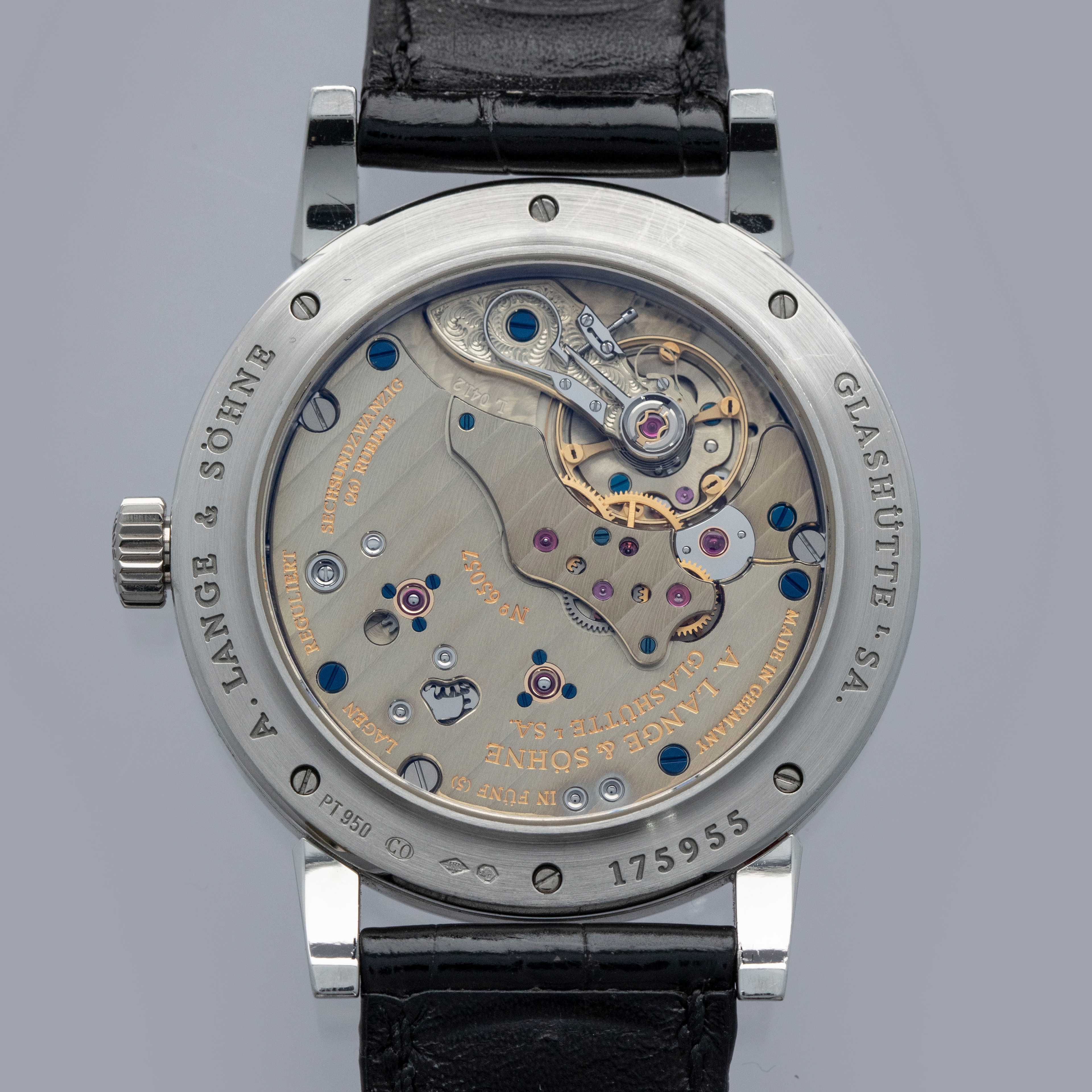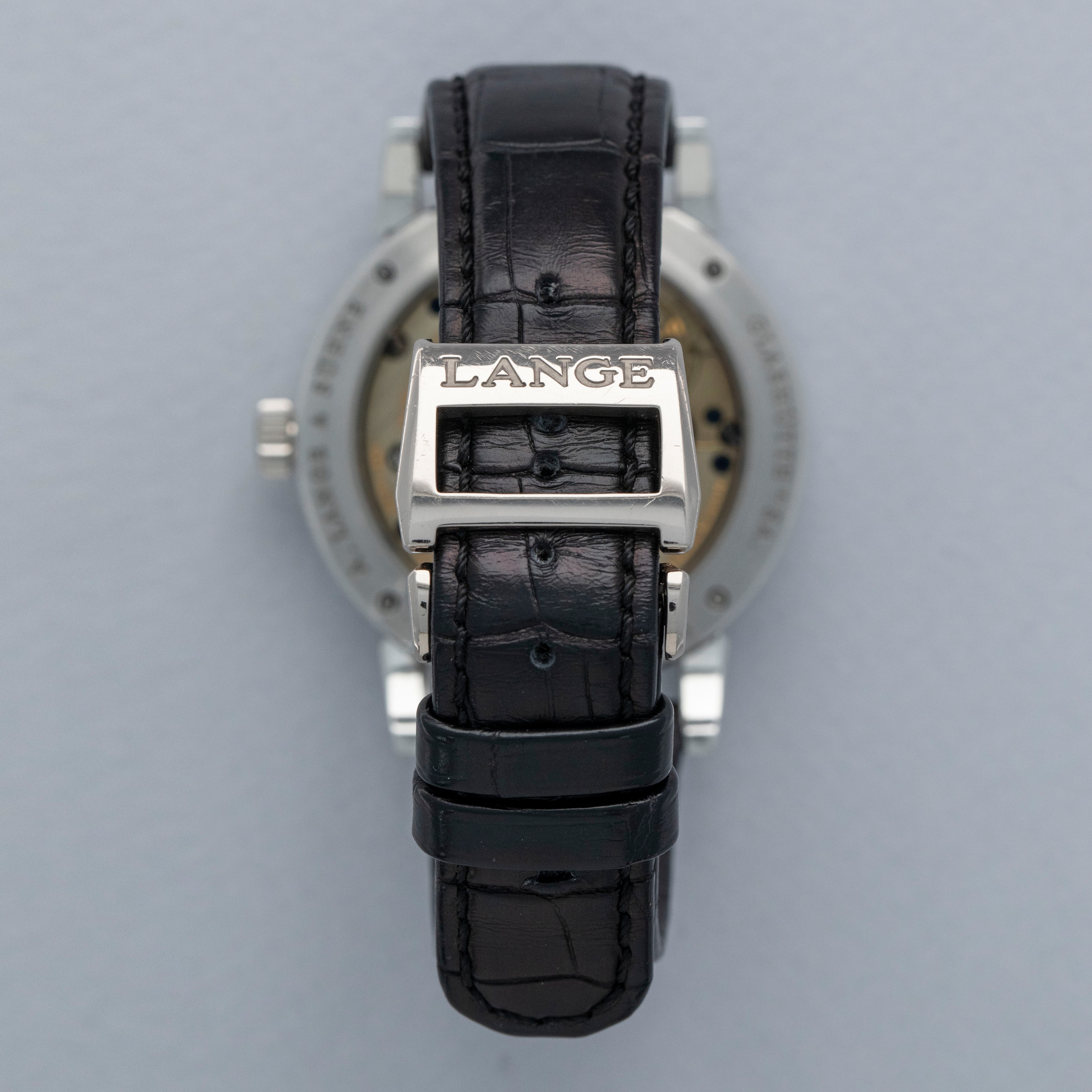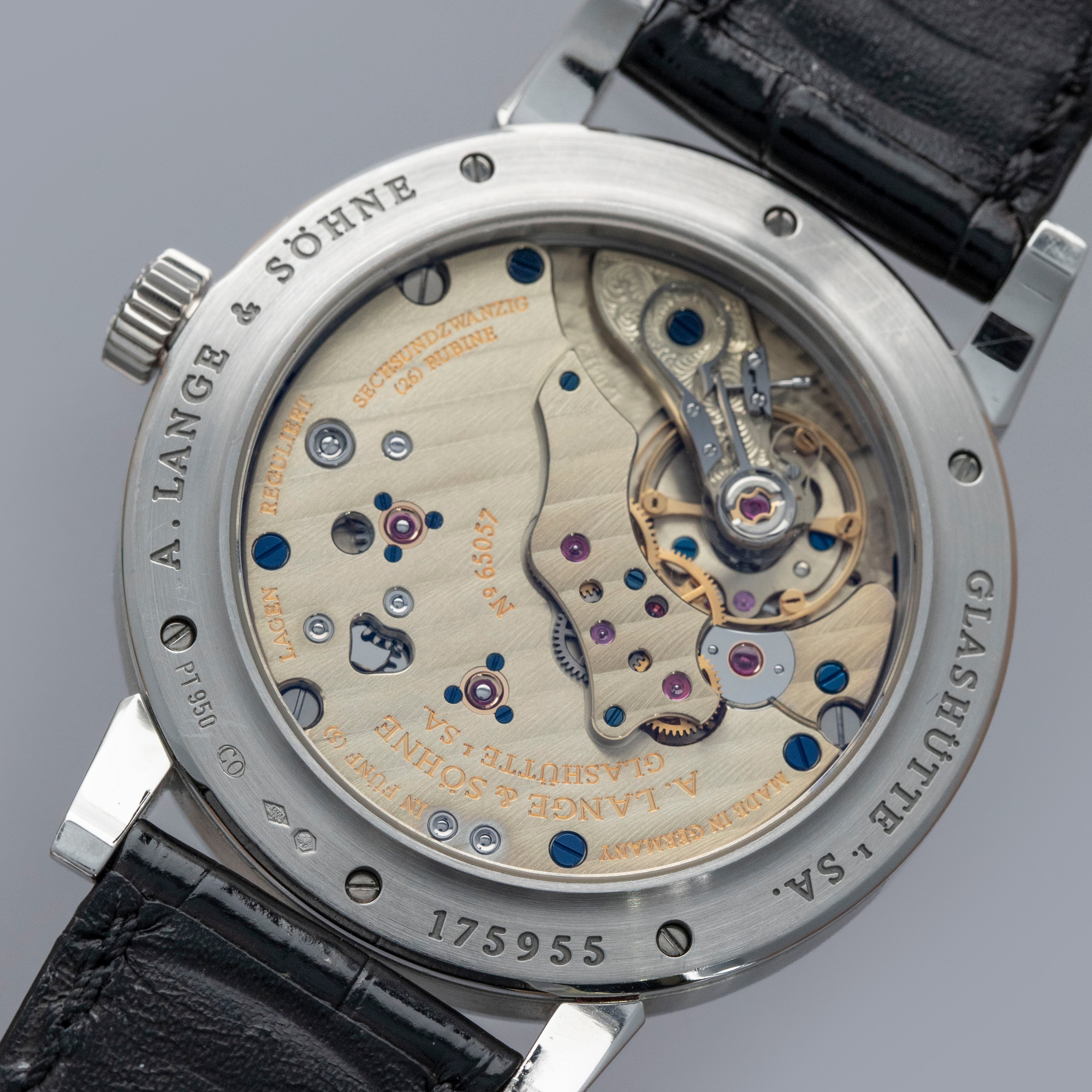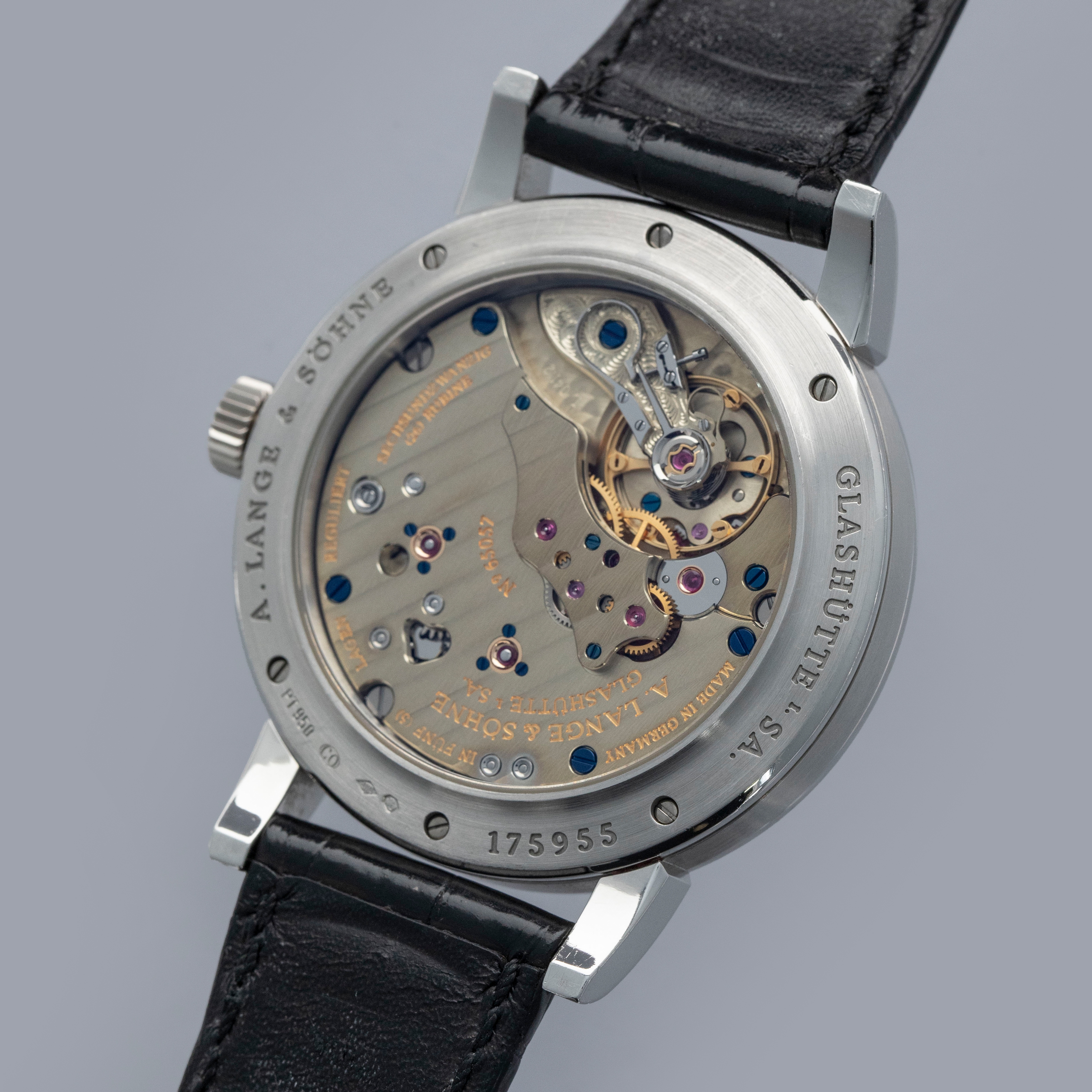 Watch is in overall excellent condition. The platinum case shows light surface scratches, with a couple of slightly more noticeable small nicks visible on the bezel. The display case back shows light marks around the outer edge, while the engravings and hallmarks remain well defined. The dial and hands remain like new. It is fitted with a black A. Lange & Söhne alligator strap and a platinum deployant clasp showing light surface scratches. Comes complete with inner and outer boxes, warranty and instruction books, and document holder.