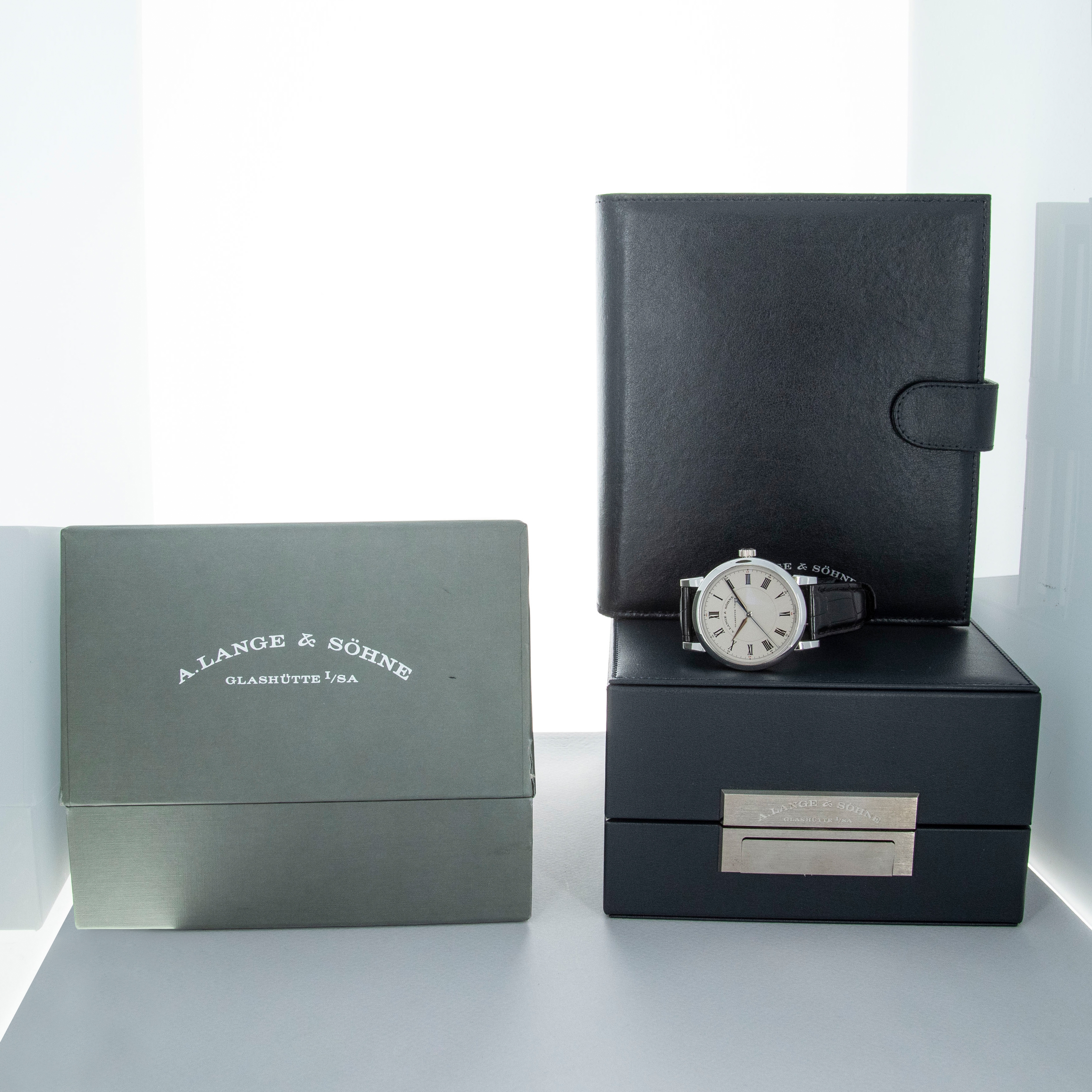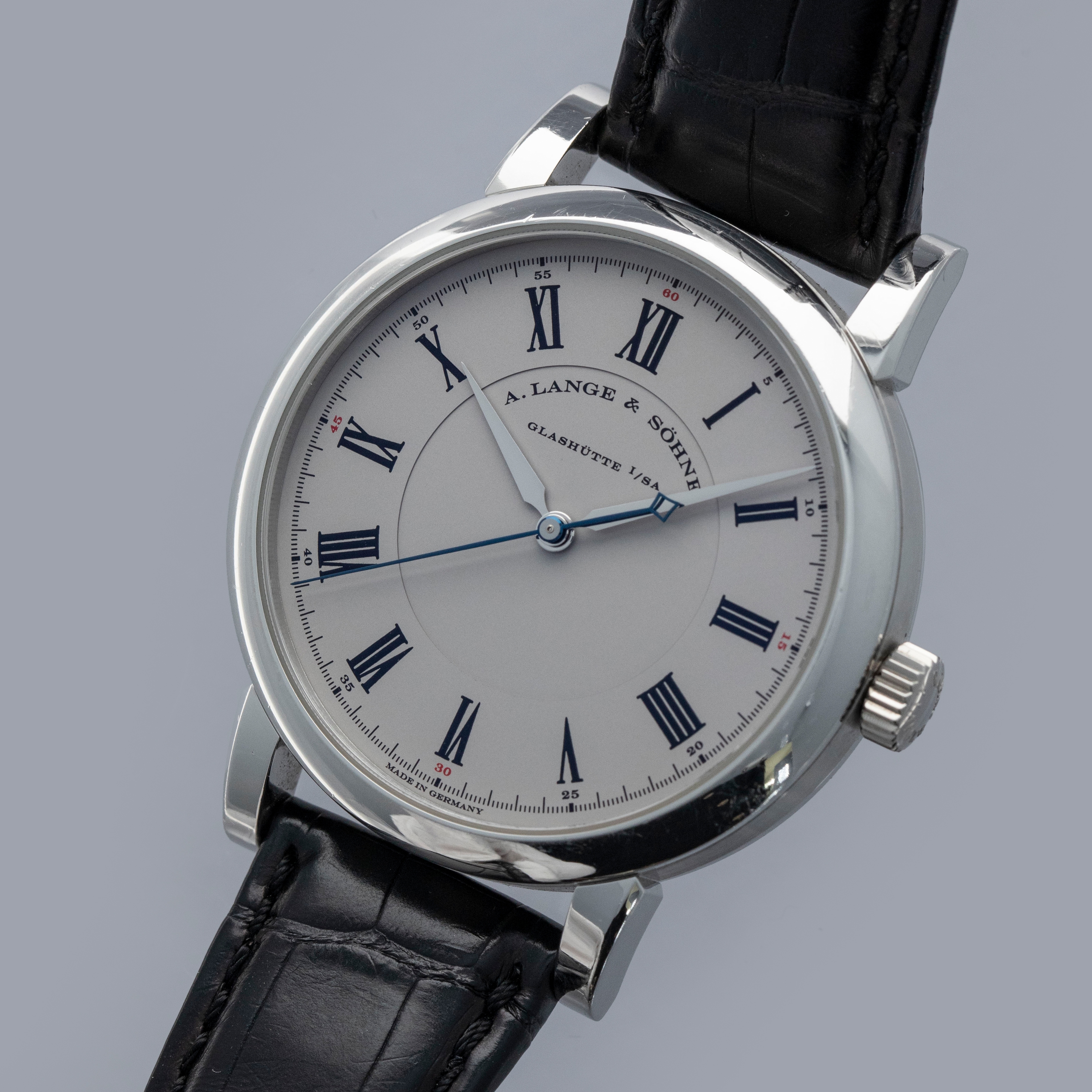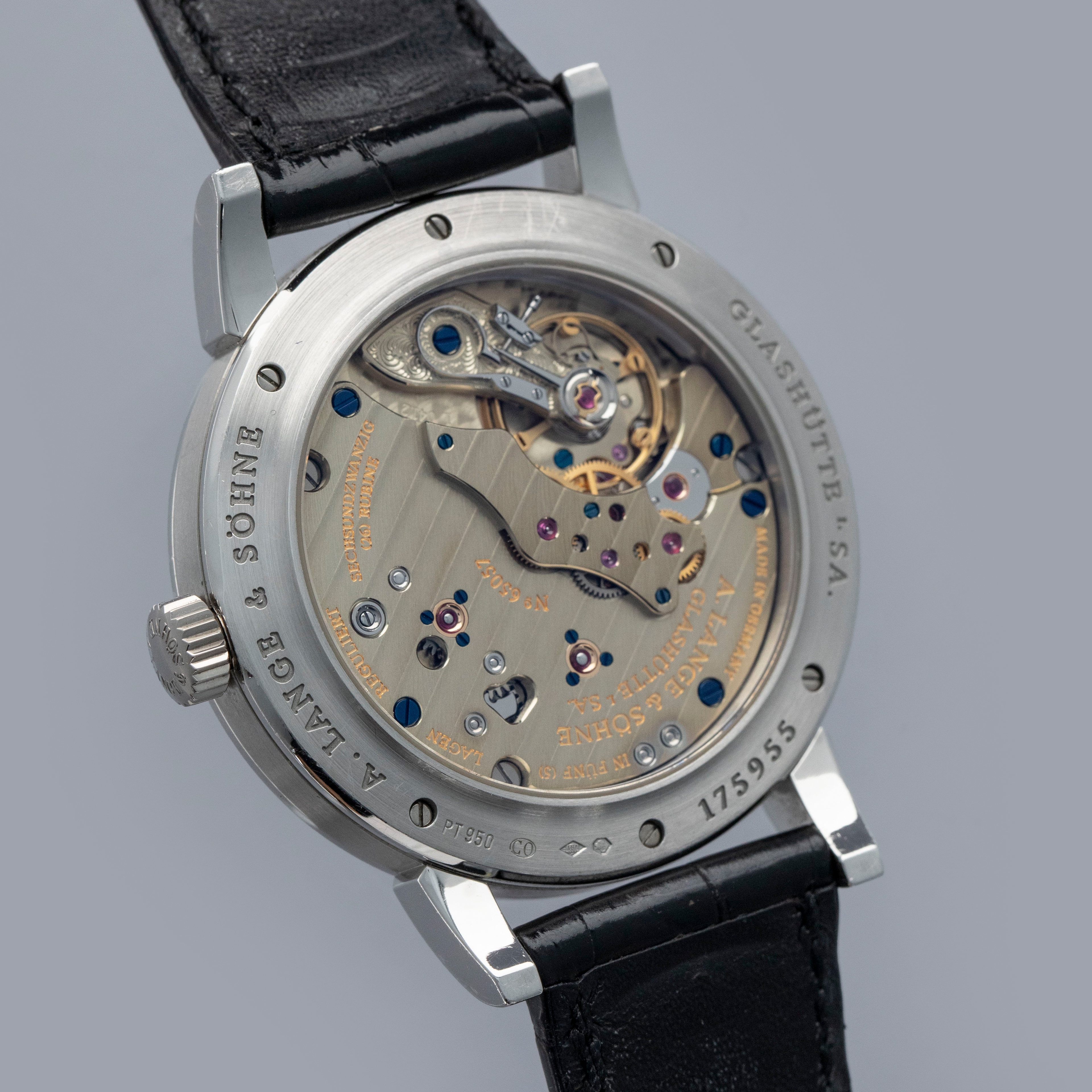 Watch is in overall excellent condition. The platinum case shows light surface scratches, with a couple of slightly more noticeable small nicks visible on the bezel. The display case back shows light marks around the outer edge, while the engravings and hallmarks remain well defined. The dial and hands remain like new. It is fitted with a black A. Lange & Söhne alligator strap and a platinum deployant clasp showing light surface scratches. Comes complete with inner and outer boxes, warranty and instruction books, and document holder.
