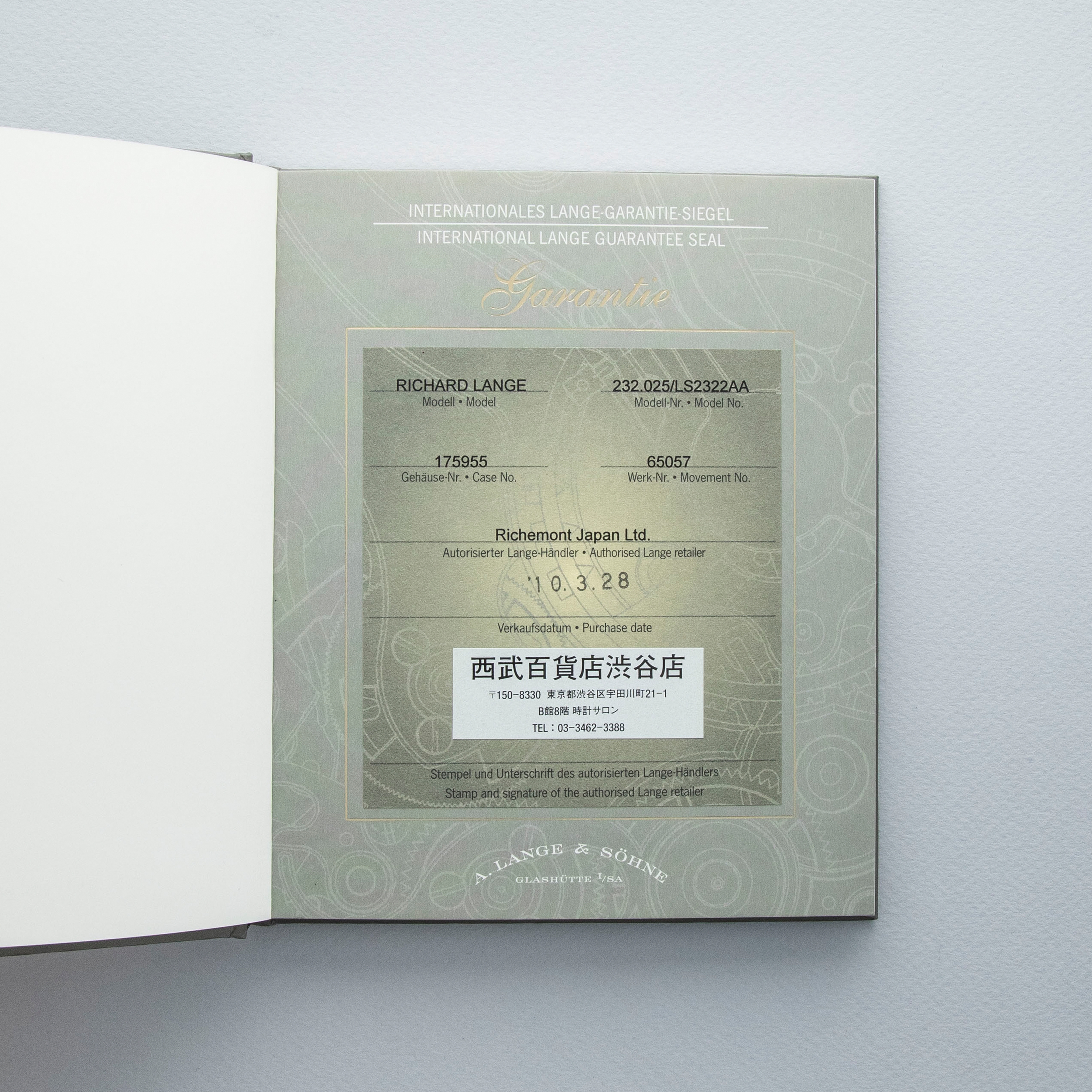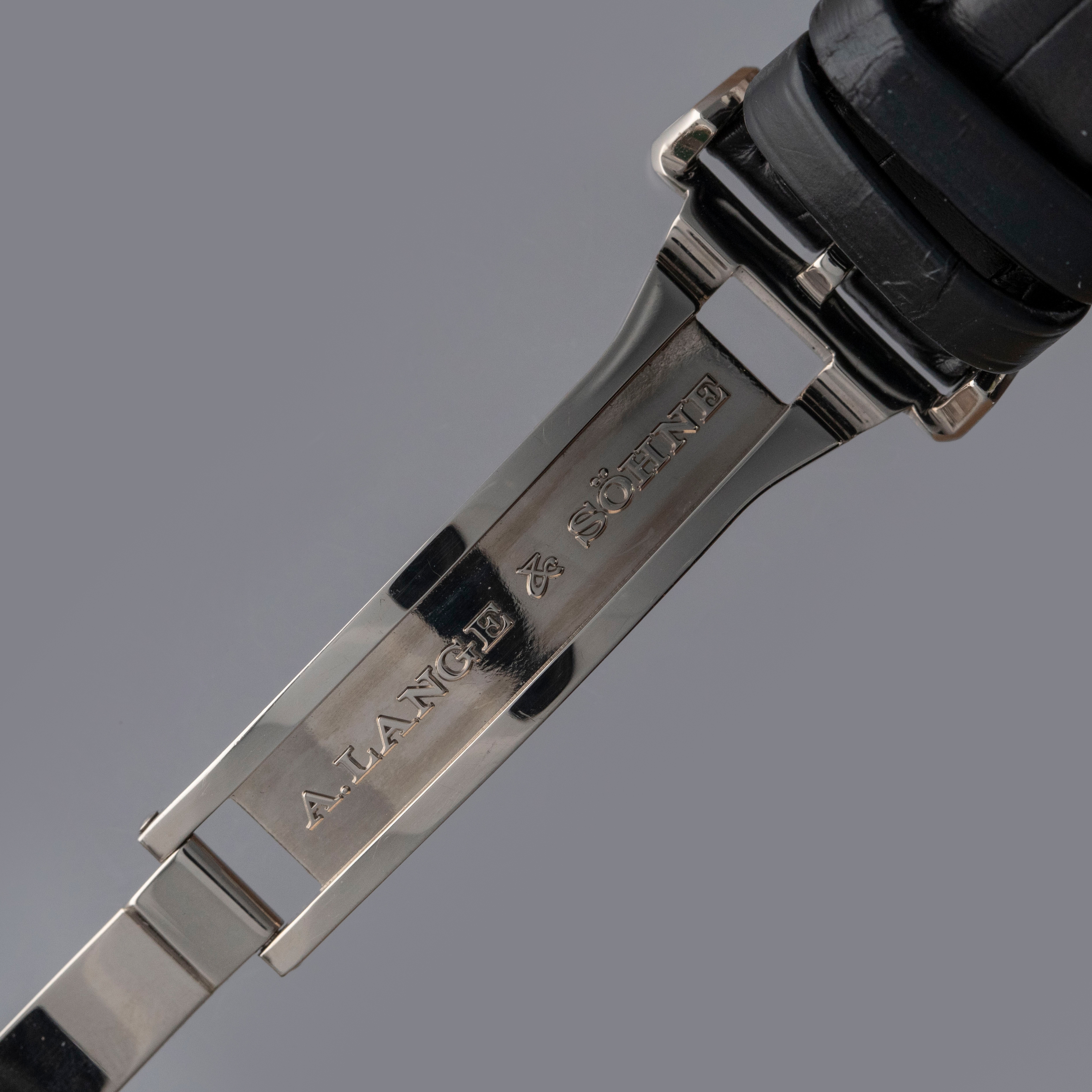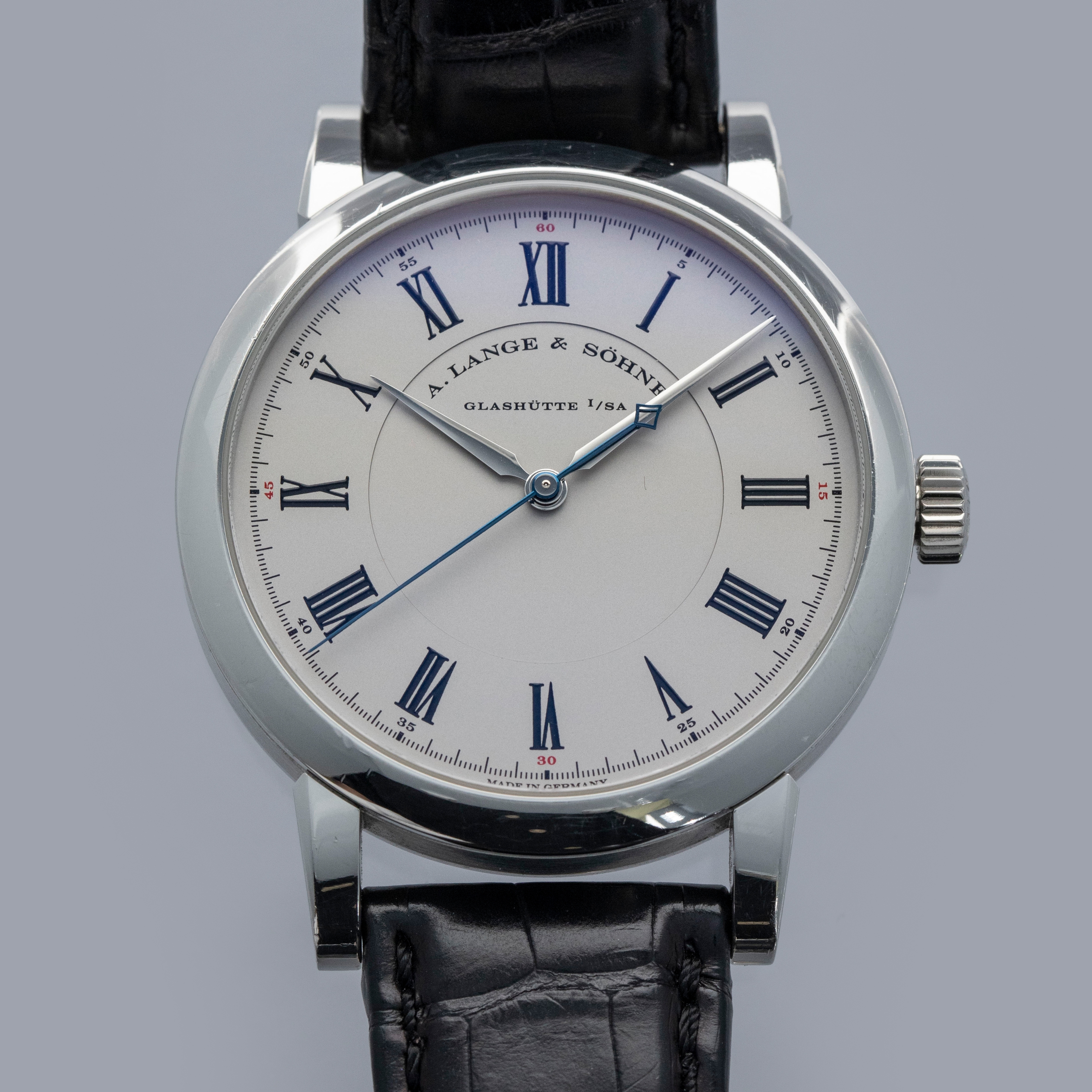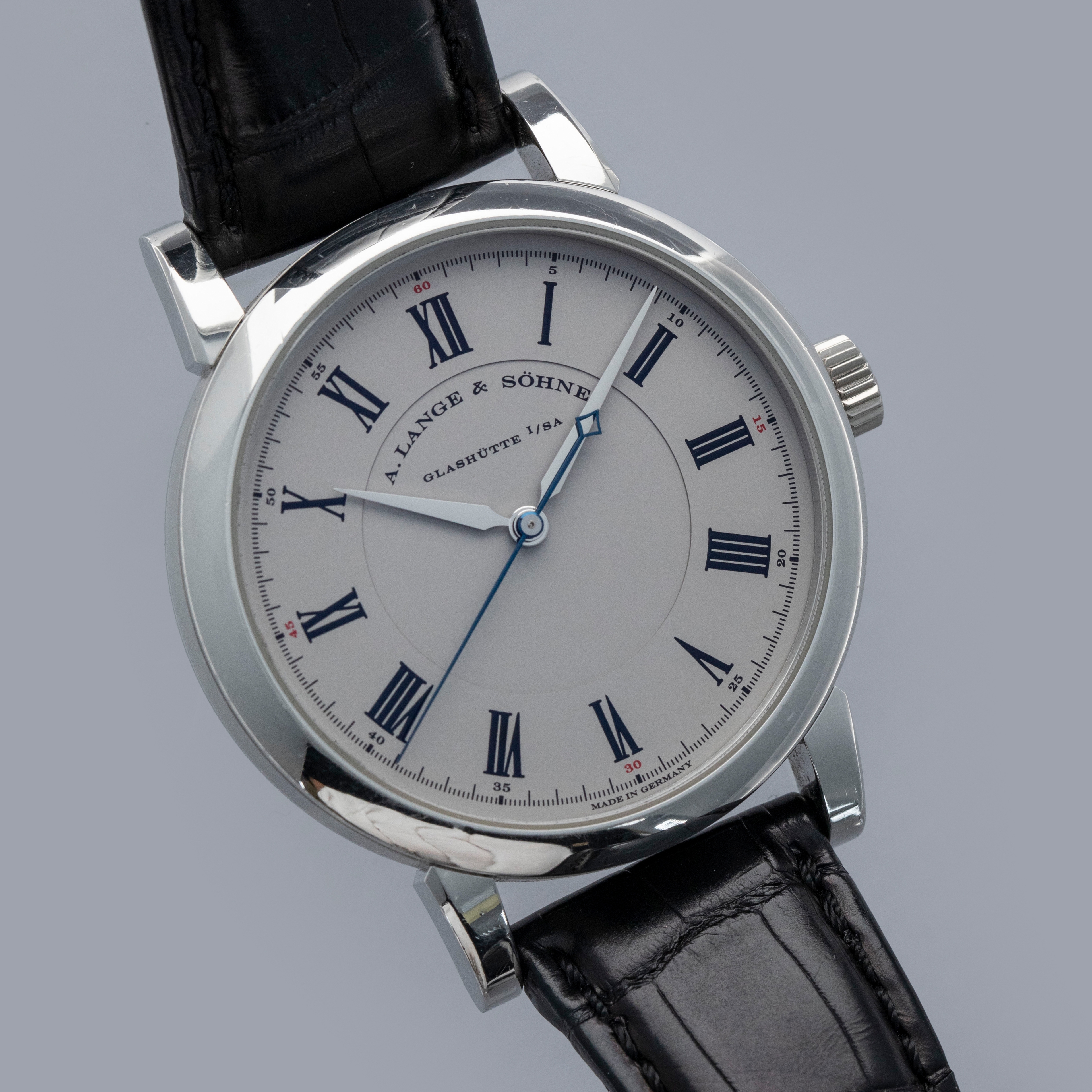 Watch is in overall excellent condition. The platinum case shows light surface scratches, with a couple of slightly more noticeable small nicks visible on the bezel. The display case back shows light marks around the outer edge, while the engravings and hallmarks remain well defined. The dial and hands remain like new. It is fitted with a black A. Lange & Söhne alligator strap and a platinum deployant clasp showing light surface scratches. Comes complete with inner and outer boxes, warranty and instruction books, and document holder.