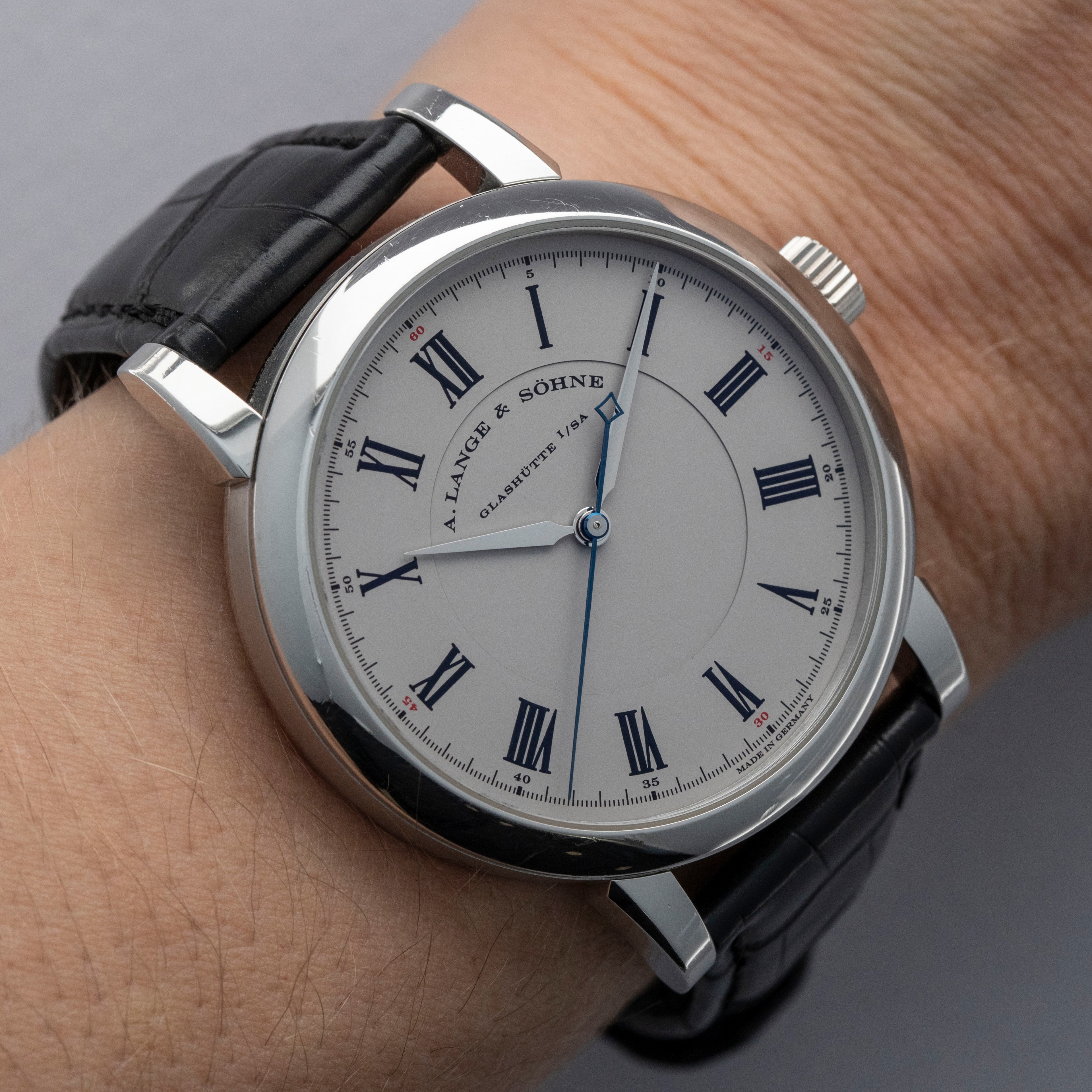 In keeping with its inspiration as an observation watch, the Richard Lange features a large 40mm case that has been imbued with Lange's luxurious craftsmanship through the watchmaker's use of platinum.