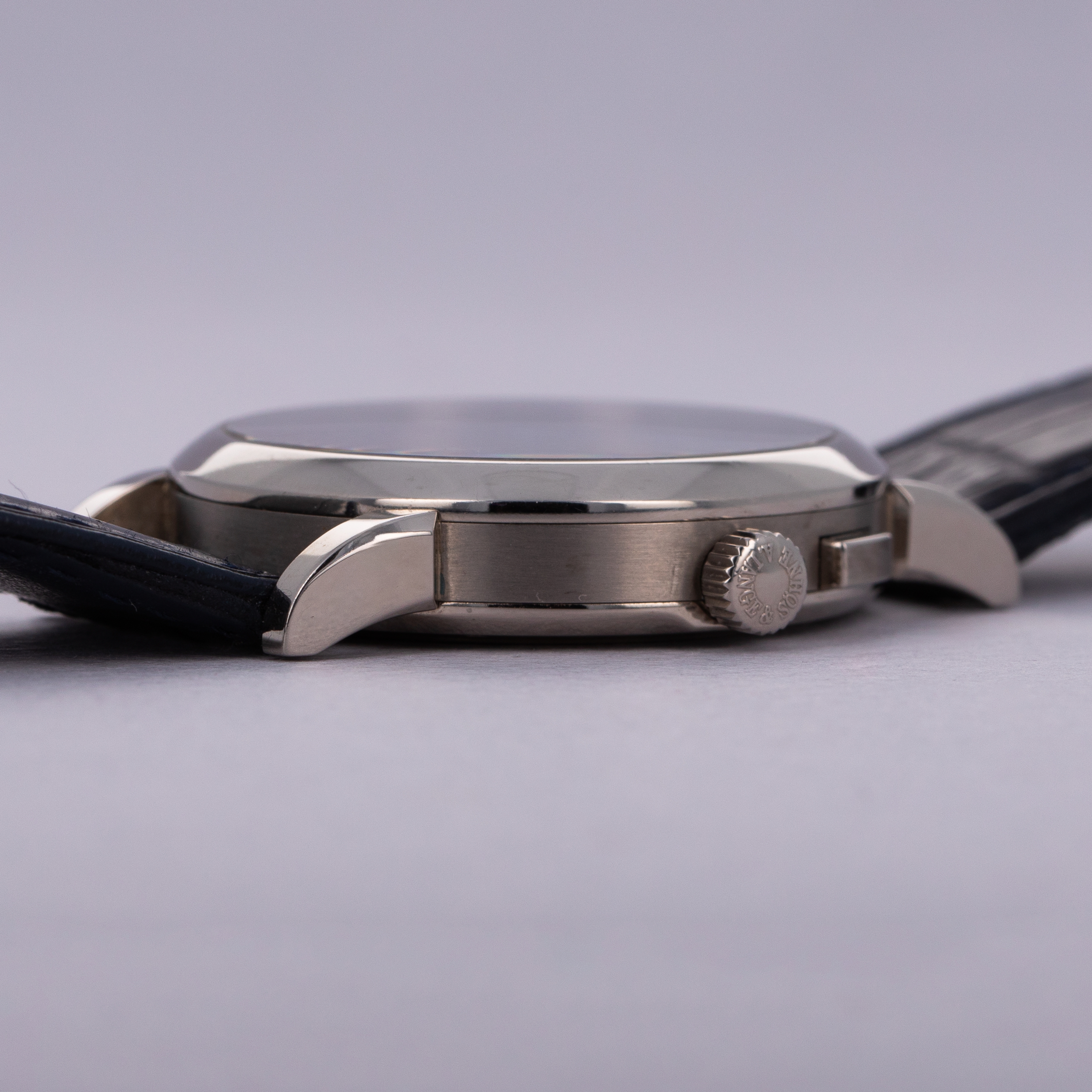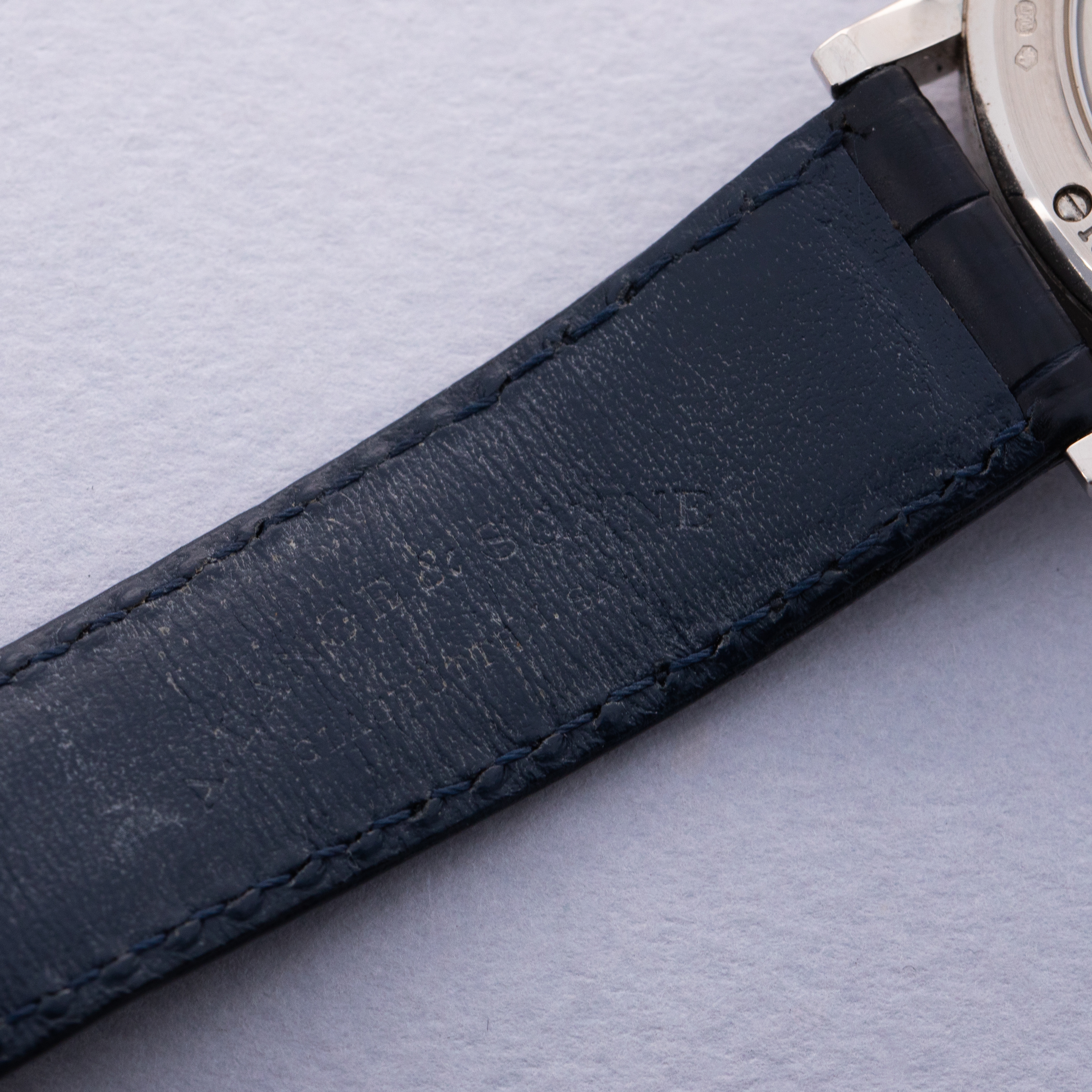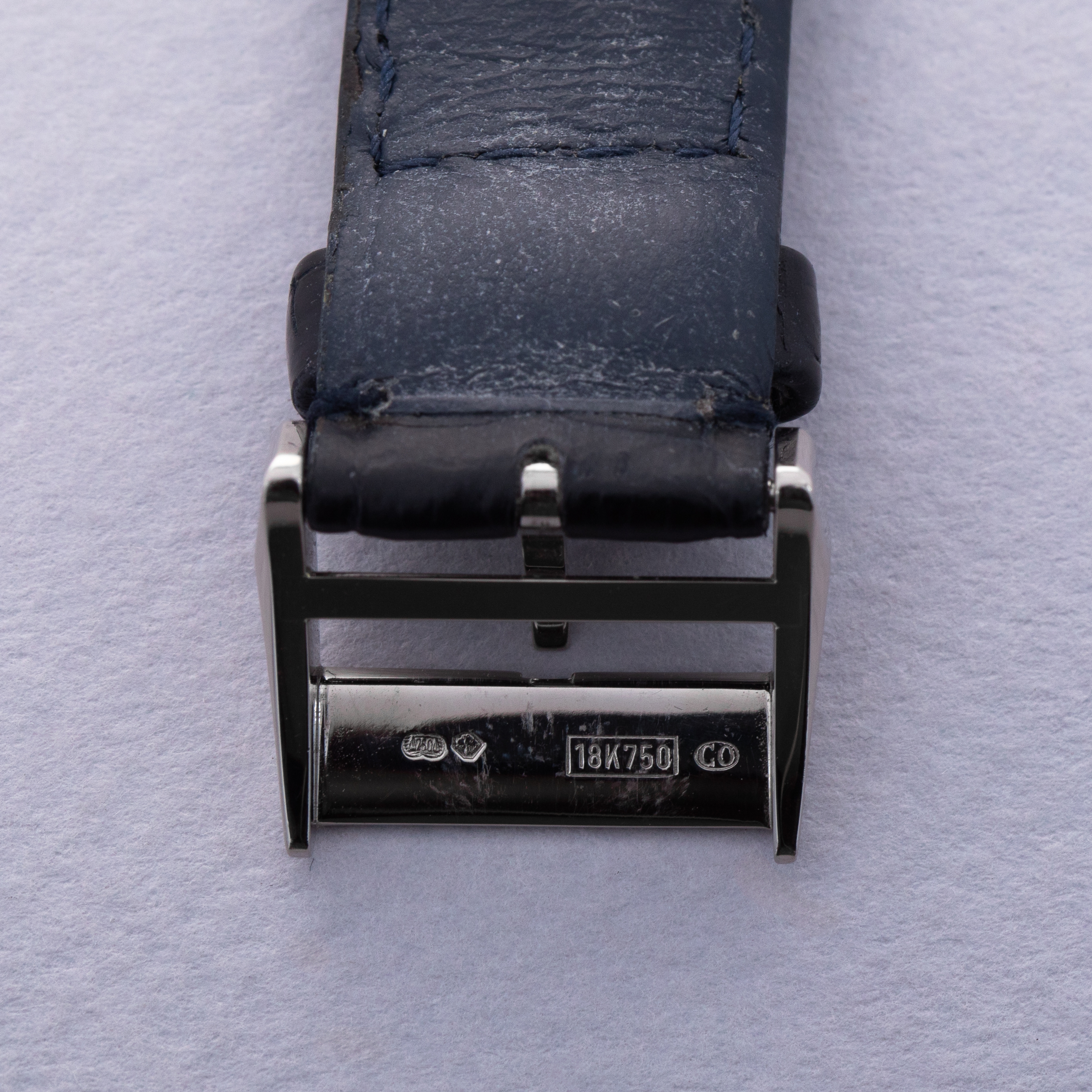Watch is in excellent overall condition. The case shows light signs of wear. There are scratches and marks visible on the surfaces and edges, including scratches and hairlines along the bezel, and commensurate wear along the lugs. Blue dial in near-mint condition, with little to no signs of wear or aging. Watch comes with original strap and 18k WG tang buckle. Please note: The watch winds and ticks at time of cataloging, but the timing machine readout is poor and a service is recommended.