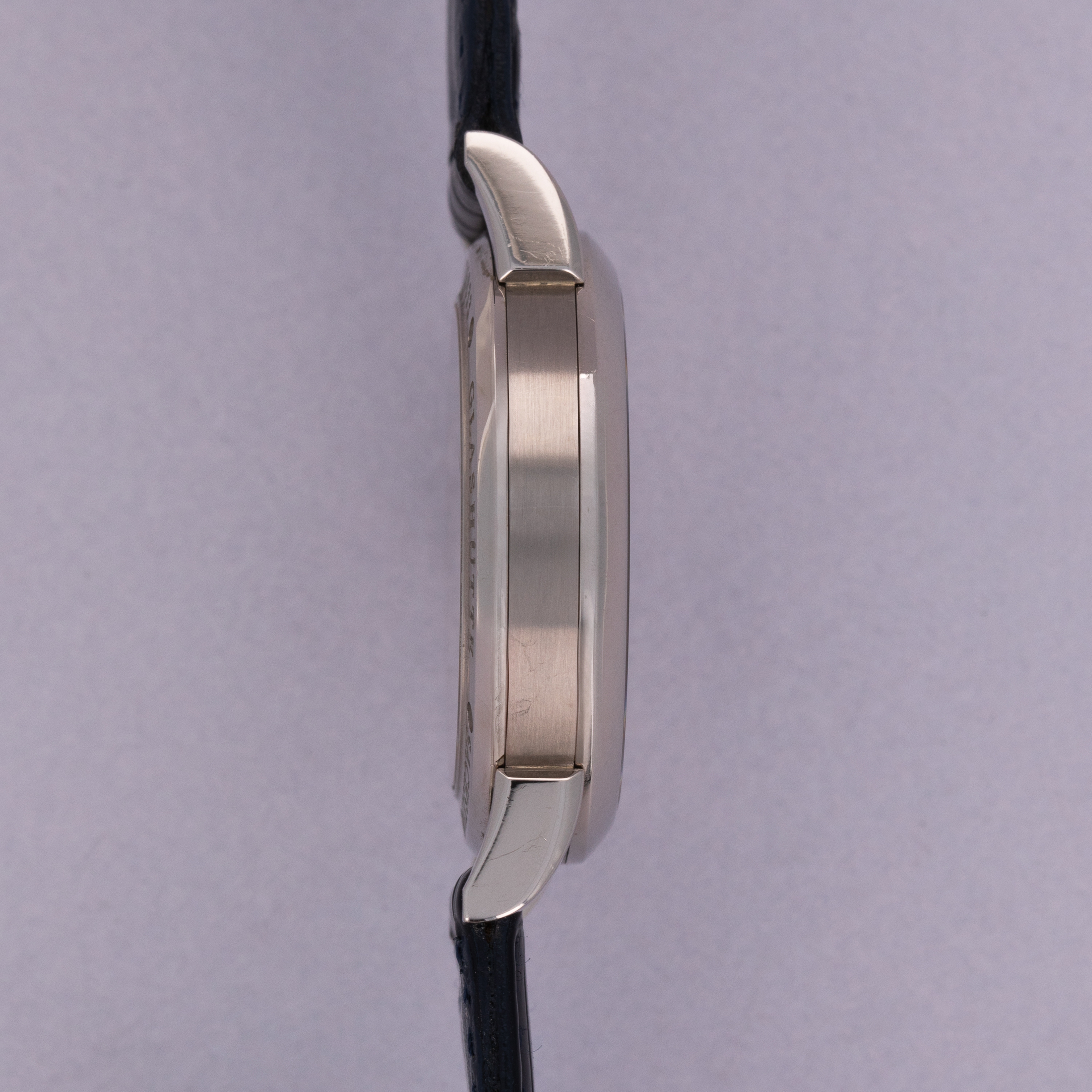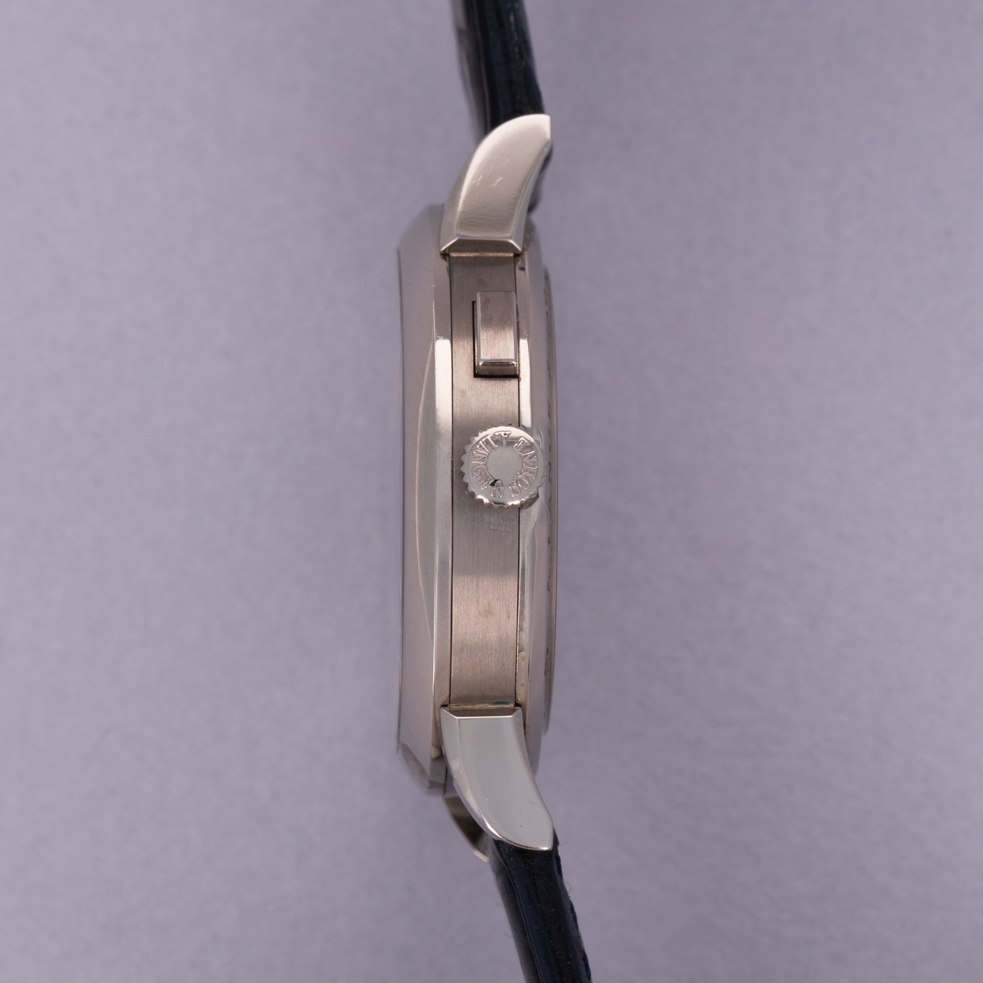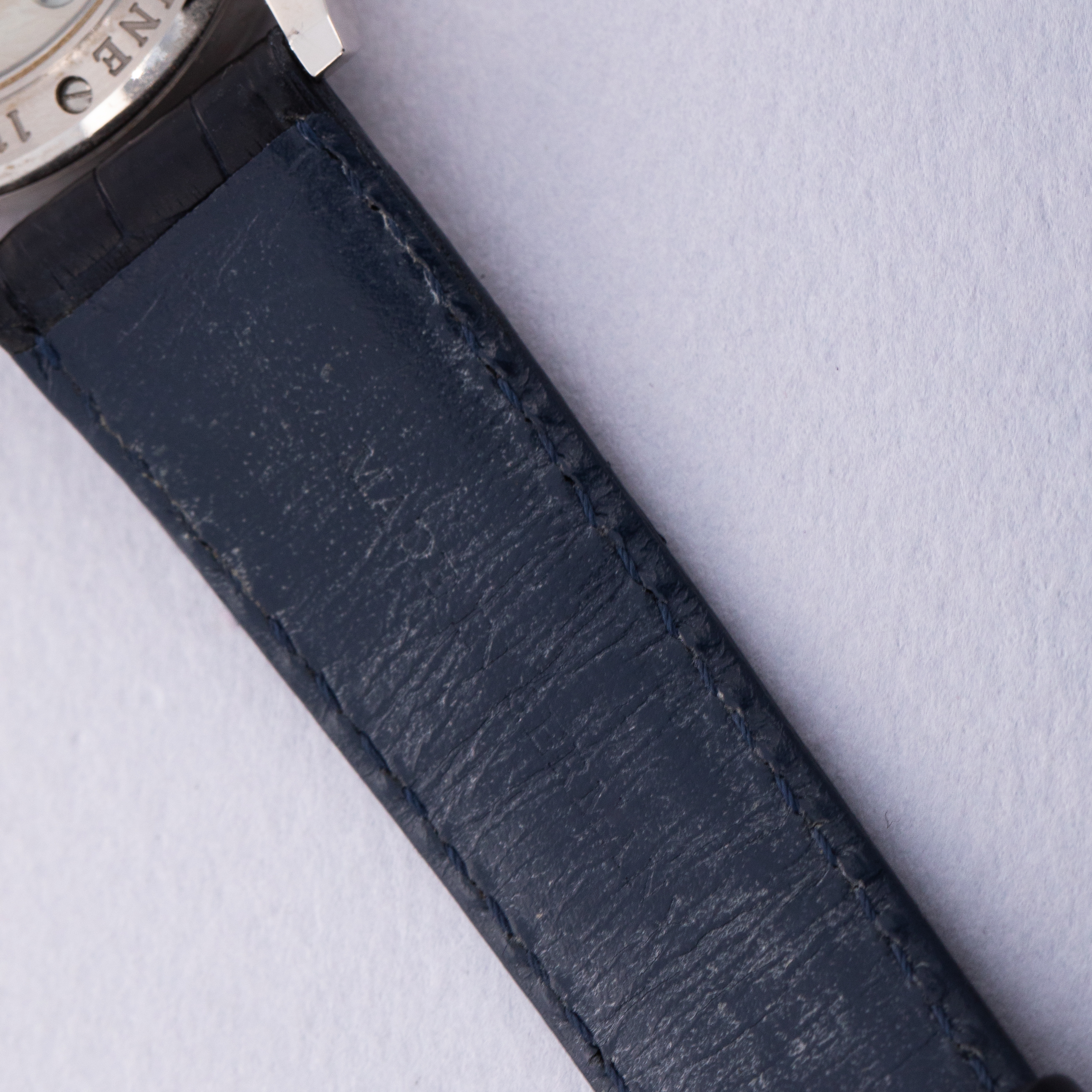 Watch is in excellent overall condition. The case shows light signs of wear. There are scratches and marks visible on the surfaces and edges, including scratches and hairlines along the bezel, and commensurate wear along the lugs. Blue dial in near-mint condition, with little to no signs of wear or aging. Watch comes with original strap and 18k WG tang buckle. Please note: The watch winds and ticks at time of cataloging, but the timing machine readout is poor and a service is recommended.