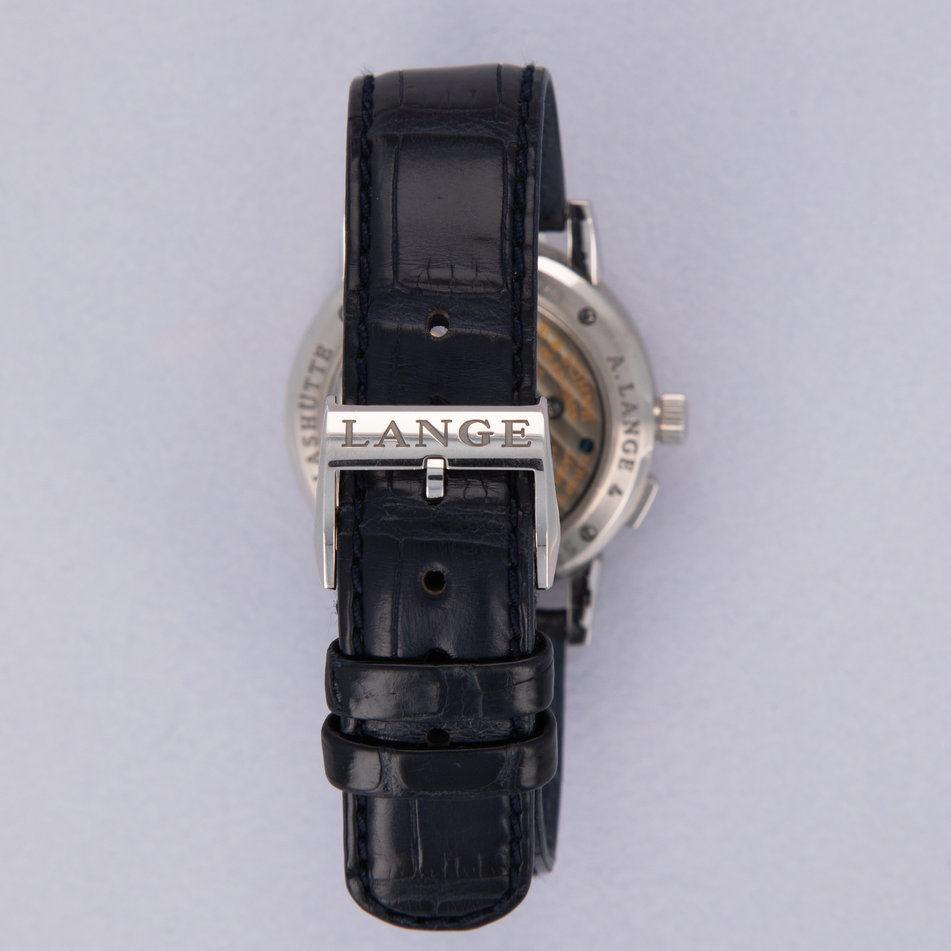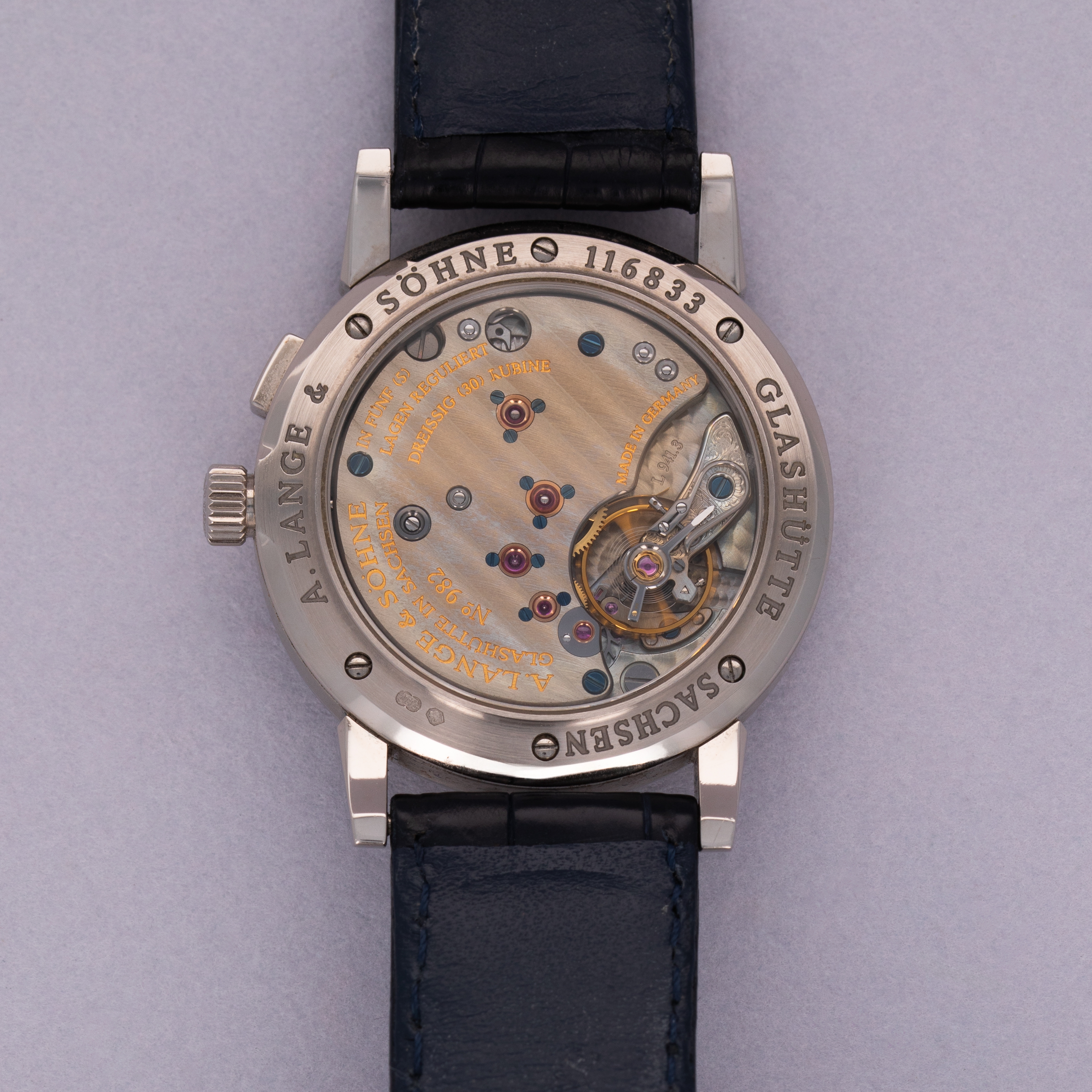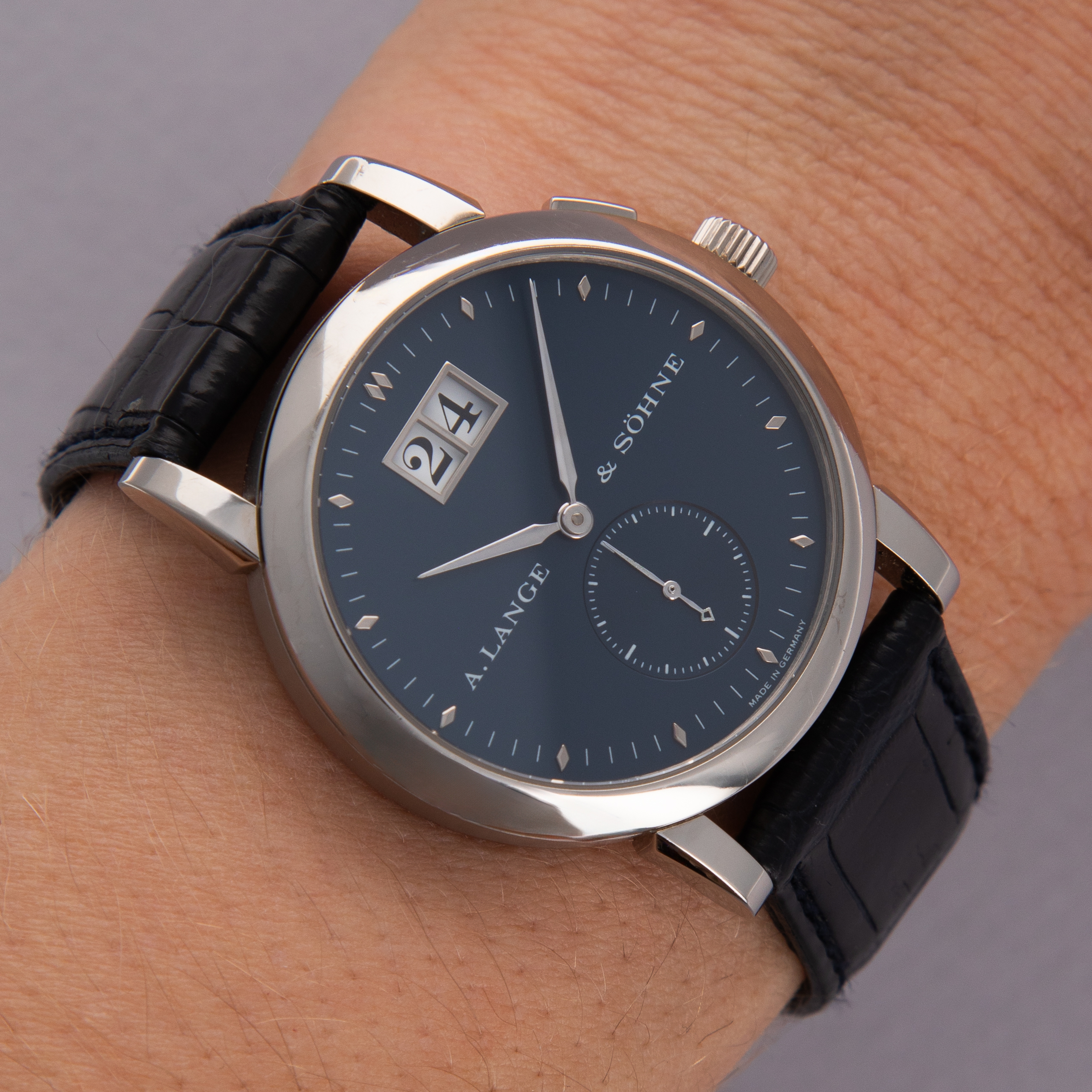 With its dark blue dial, the Saxonia's white gold hands and large outsize date are perfectly legible as they pop against the dark backdrop and remain easy to read at a glance.
