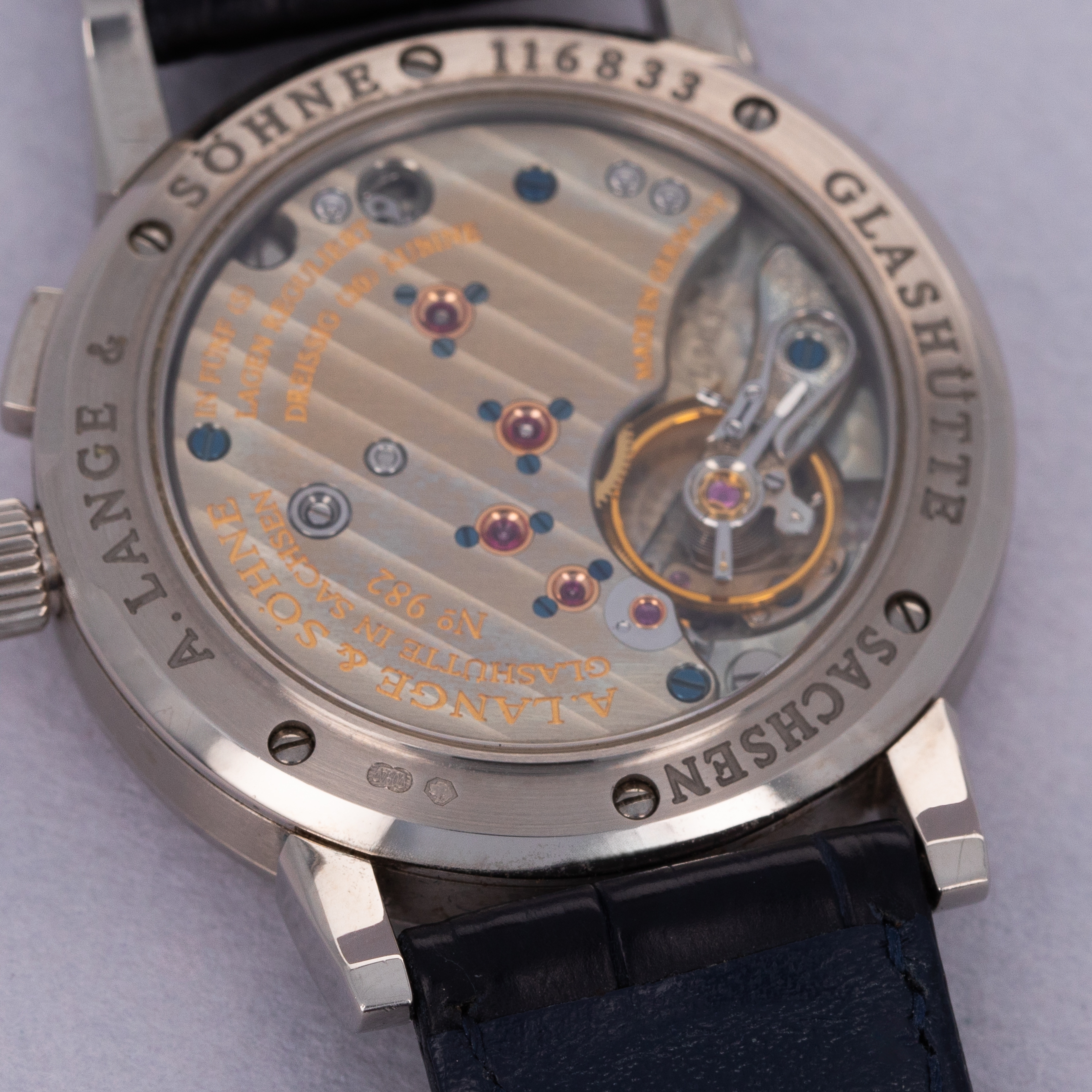 First released in 1994 as Lange & Söhne's prototypical dress watch, the Saxonia has had an undeniable air of elegance, sophistication, and stunning design baked into its aesthetic since it first made its way onto the wrists of watch collectors. Since then, the collection has evolved to include some of the most stunning dress watches around, much like the ref. 105.027 that we have here. Offered between the short period of just 1997 and 2002, the ref. 105.027 comes crafted from 18k white gold and features a stunning symmetrical dark blue dial with Lange & Söhne's signature outsize date complication and a small seconds subdial to boot, making it a truly refined design of utter elegance and decorum. Sporting an exhibition caseback, the Saxonia ref. 105.027 proudly displays its immaculately finished manual-wind movement – perhaps one of Lange's most esteemed features. Considered to be one of the ultimate dress watches, it doesn't take too long to figure out why collectors hold Lange & Söhne to such high regard - their watches are simply incredible.