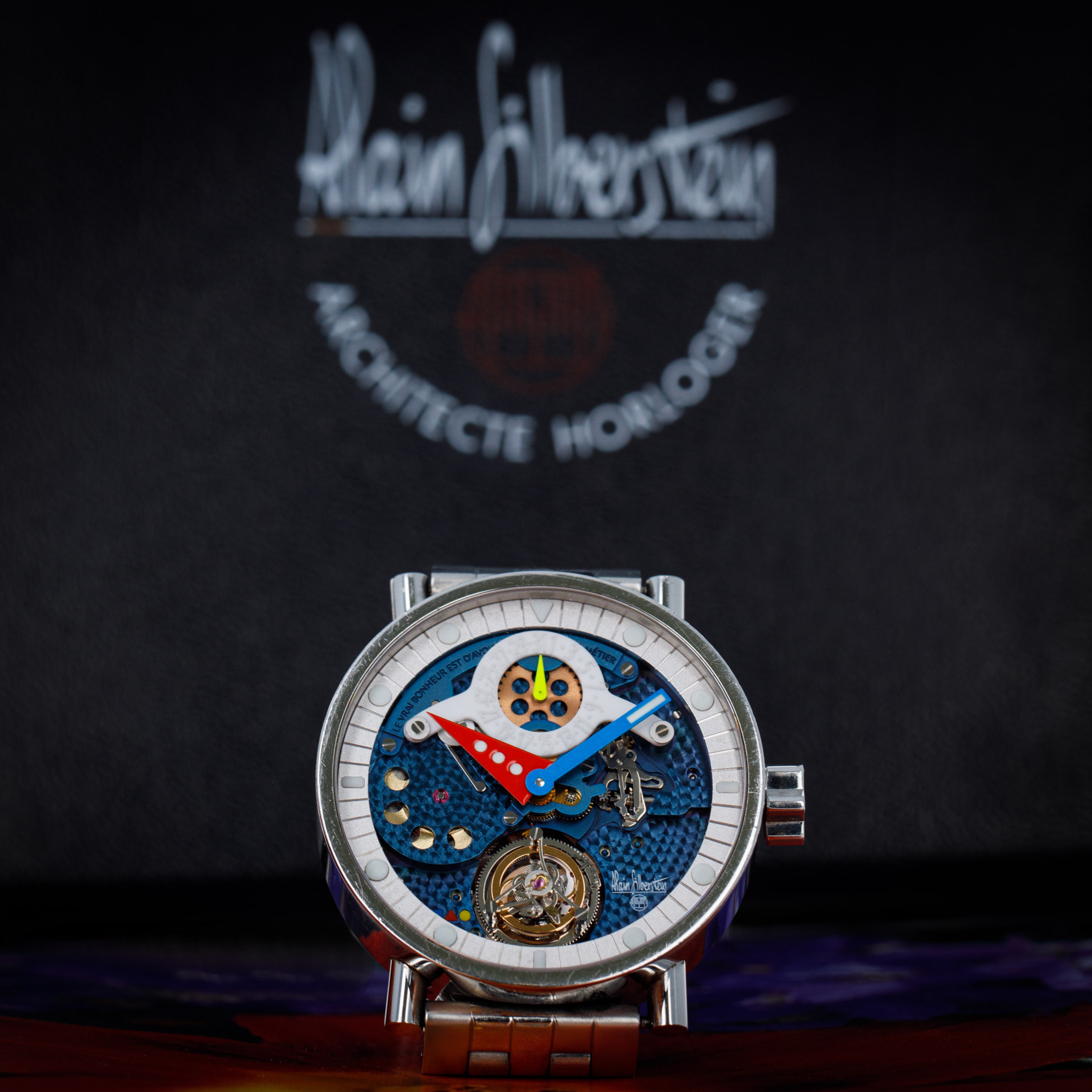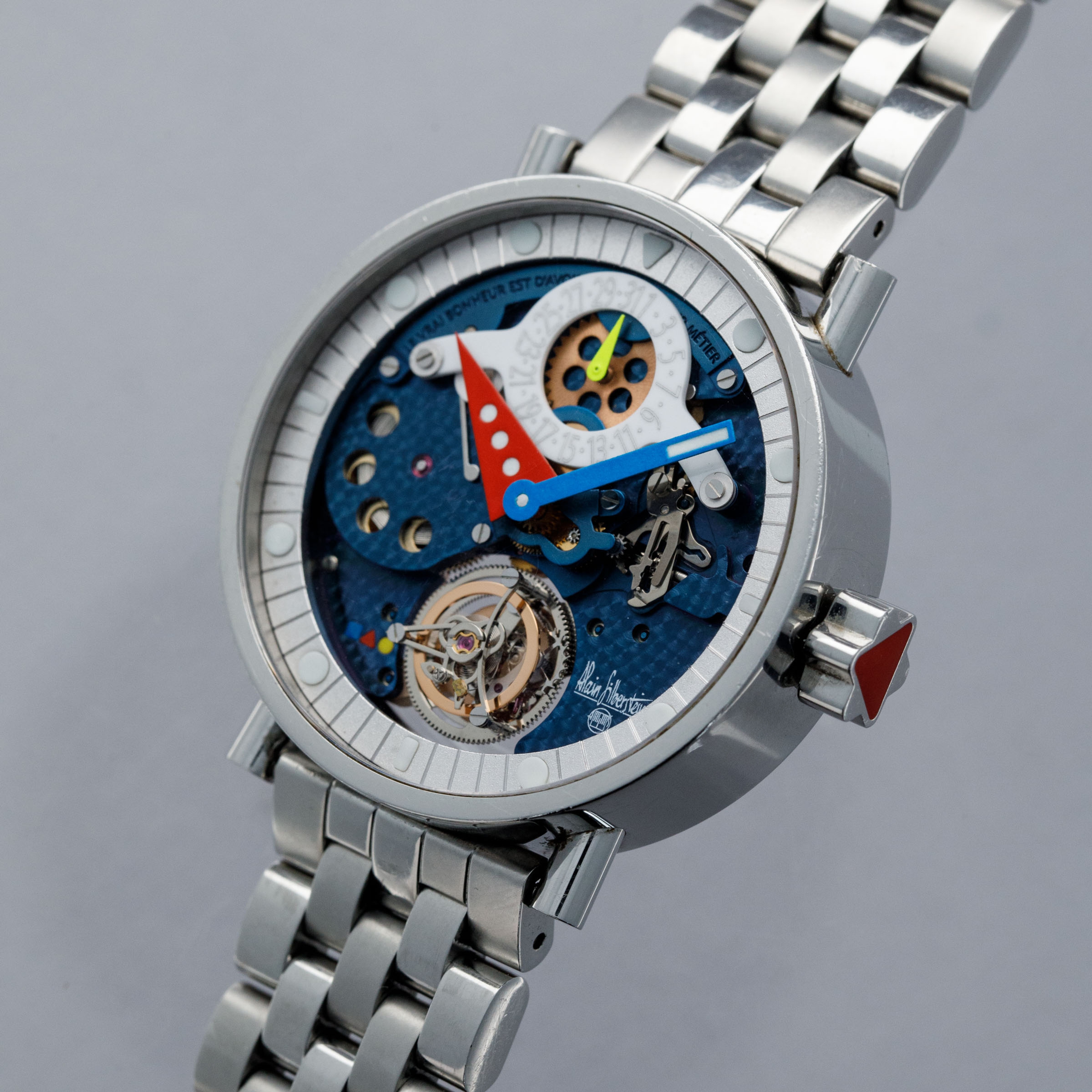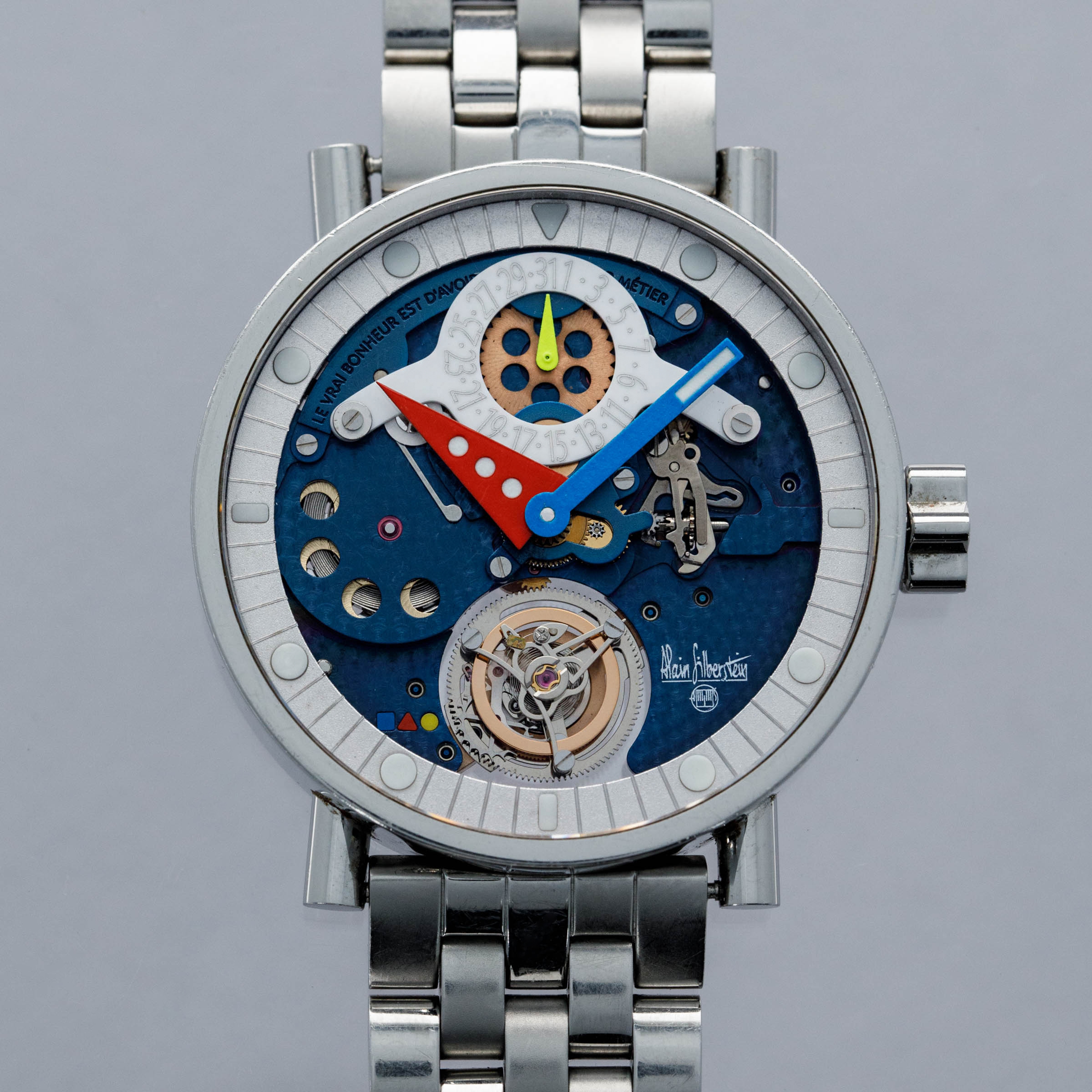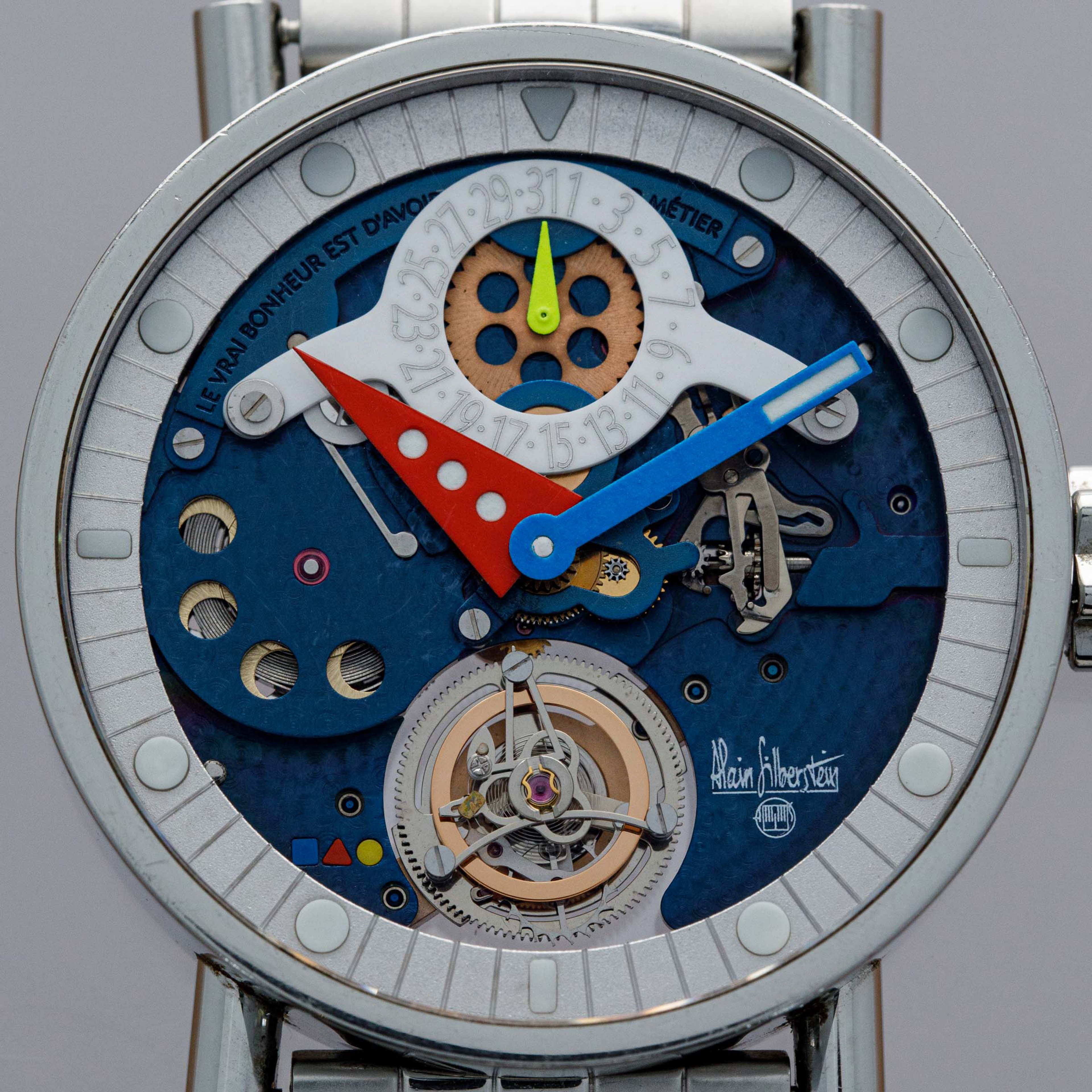 An architect and designer by trade, it is no surprise that Alain Silberstein’s timepieces feature some of the most unique aesthetic choices you'll see through the use of bright colors, odd geometric shapes, and distinctive artistry. Founded in 1987, Alain Silberstein represents the less serious side of watchmaking without sacrificing quality, craftsmanship, or attention to detail – tenants of modern fine horology. With the brand no longer producing watches of their own, Alain Silberstein’s influence on the industry is now represented through collaborations or discontinued pieces like the Tourbillon Volant ref. TMA1-002 that we have here. Launched in 2004 as a limited edition series of just 9 pieces, this timepiece features the hours, minutes, a pointer date and a 60-second tourbillon that sit atop its skeletonized blue dial. A stainless steel timepiece packed with complications that contrast its playful design in such a way that highlights the brand’s overarching desire to appeal to watchmaking’s most important tenants while not getting too lost in an otherwise fun contemporary design, this watch is a perfect example of what made Alain Silberstein so popular in the brand’s hay-day.