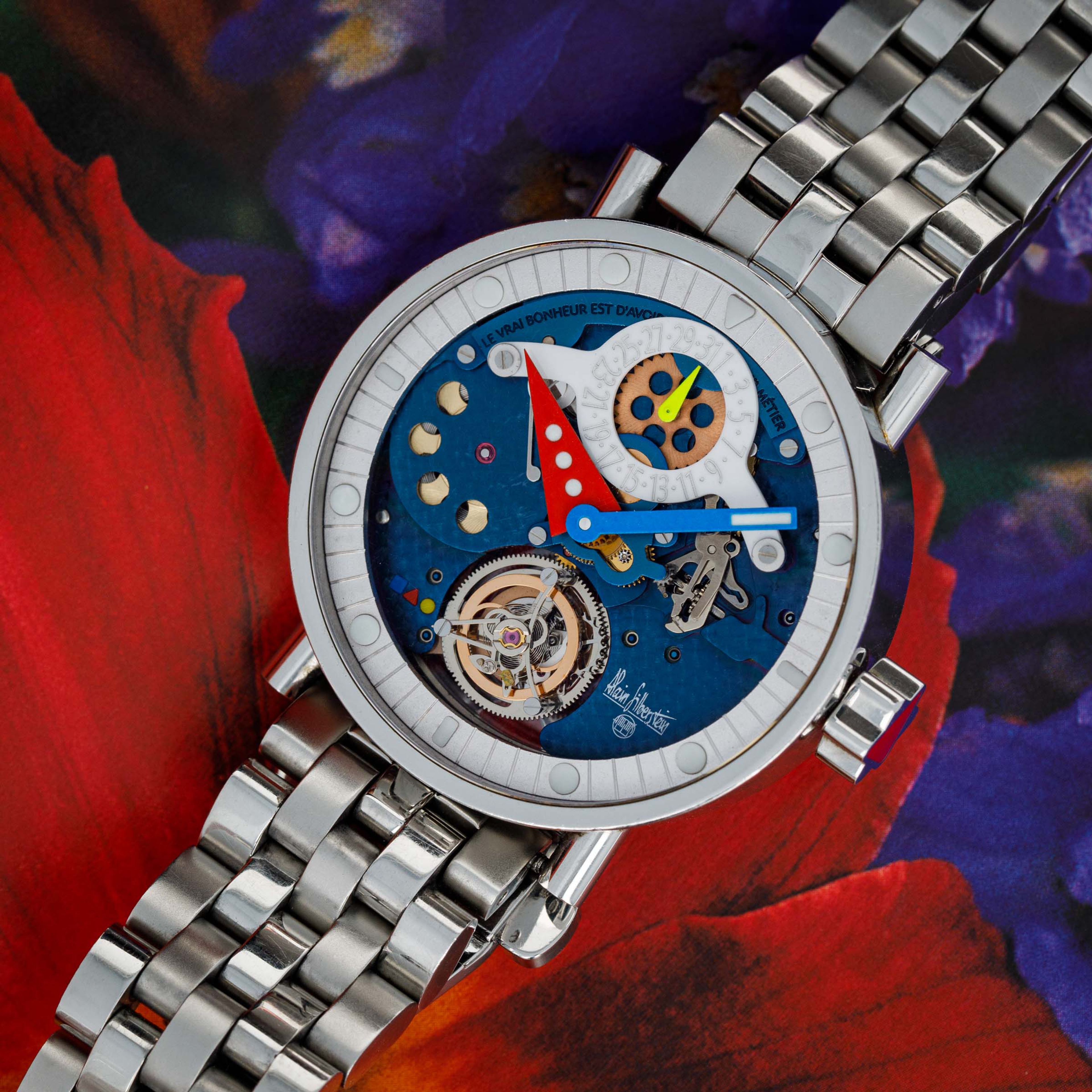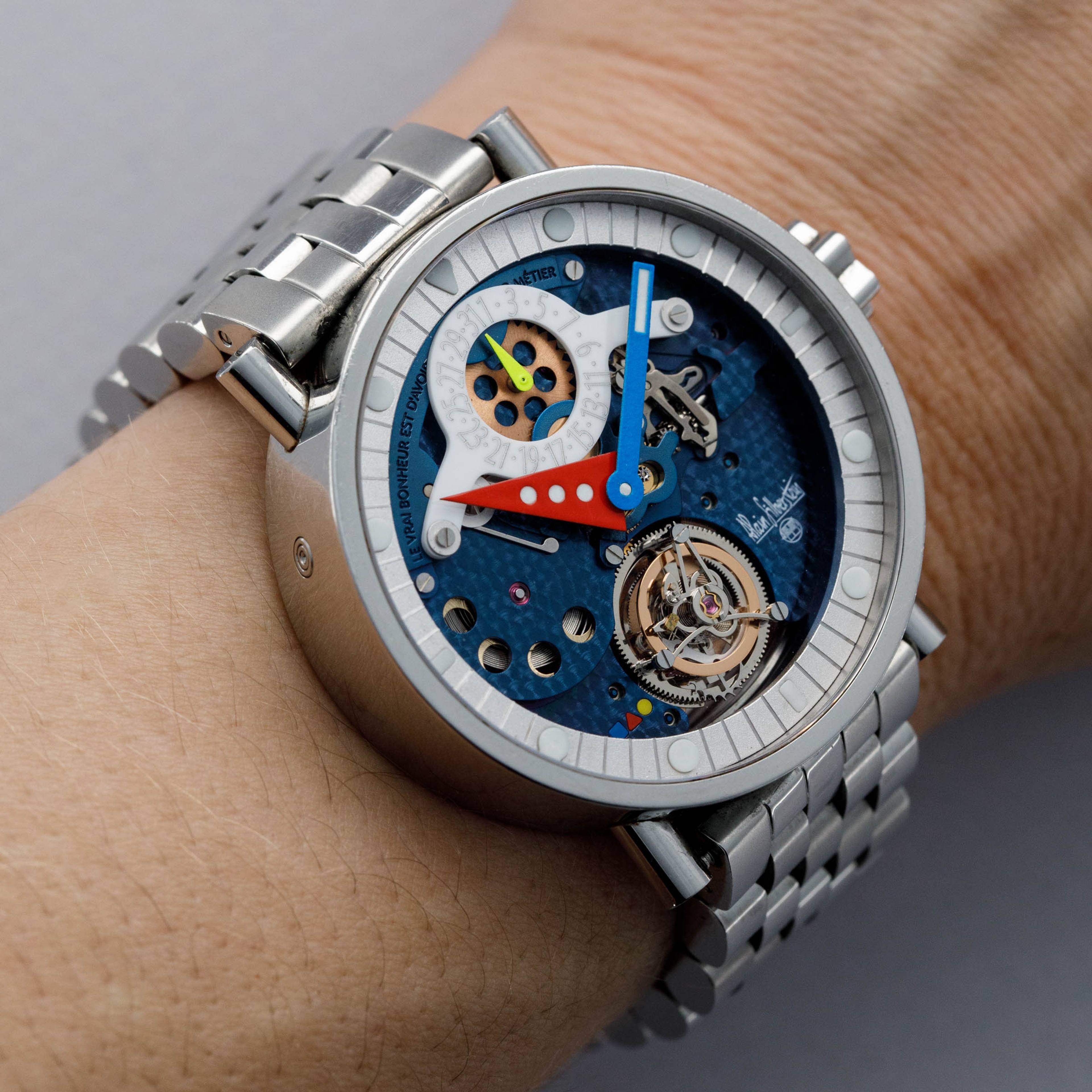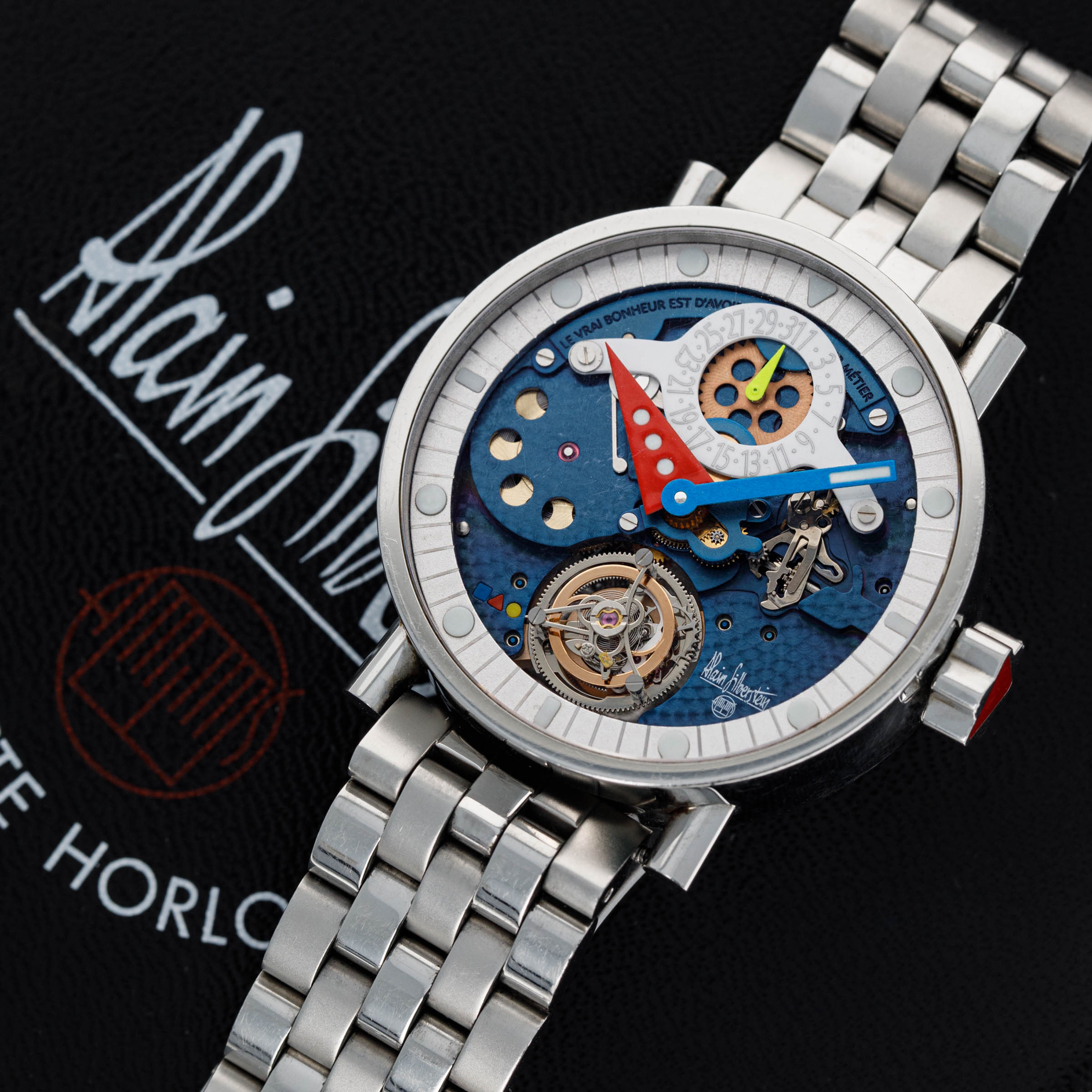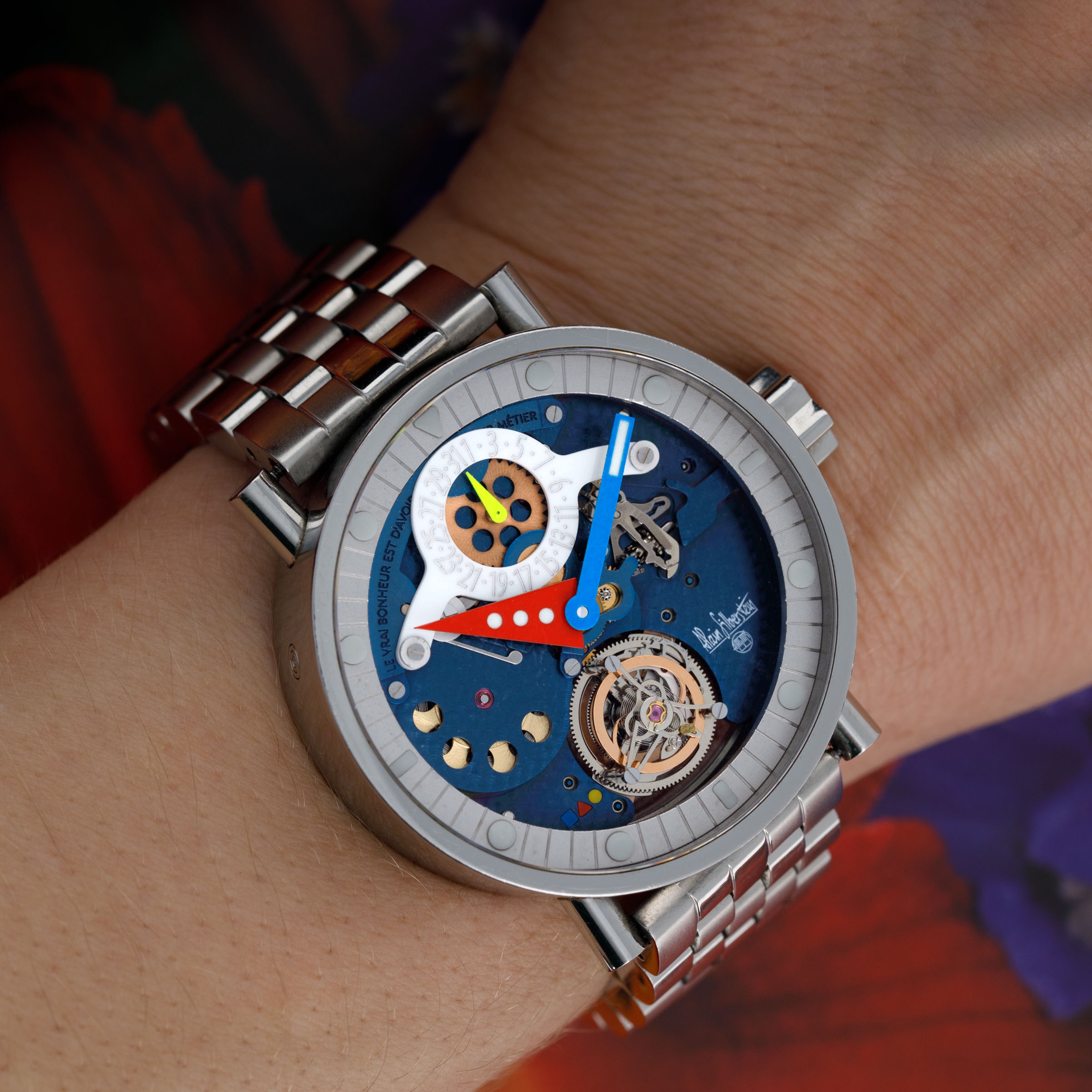An architect and designer by trade, it is no surprise that Alain Silberstein’s timepieces feature some of the most unique aesthetic choices you'll see through the use of bright colors, odd geometric shapes, and distinctive artistry. Founded in 1987, Alain Silberstein represents the less serious side of watchmaking without sacrificing quality, craftsmanship, or attention to detail – tenants of modern fine horology. With the brand no longer producing watches of their own, Alain Silberstein’s influence on the industry is now represented through collaborations or discontinued pieces like the Tourbillon Volant ref. TMA1-002 that we have here. Launched in 2004 as a limited edition series of just 9 pieces, this timepiece features the hours, minutes, a pointer date and a 60-second tourbillon that sit atop its skeletonized blue dial. A stainless steel timepiece packed with complications that contrast its playful design in such a way that highlights the brand’s overarching desire to appeal to watchmaking’s most important tenants while not getting too lost in an otherwise fun contemporary design, this watch is a perfect example of what made Alain Silberstein so popular in the brand’s hay-day.