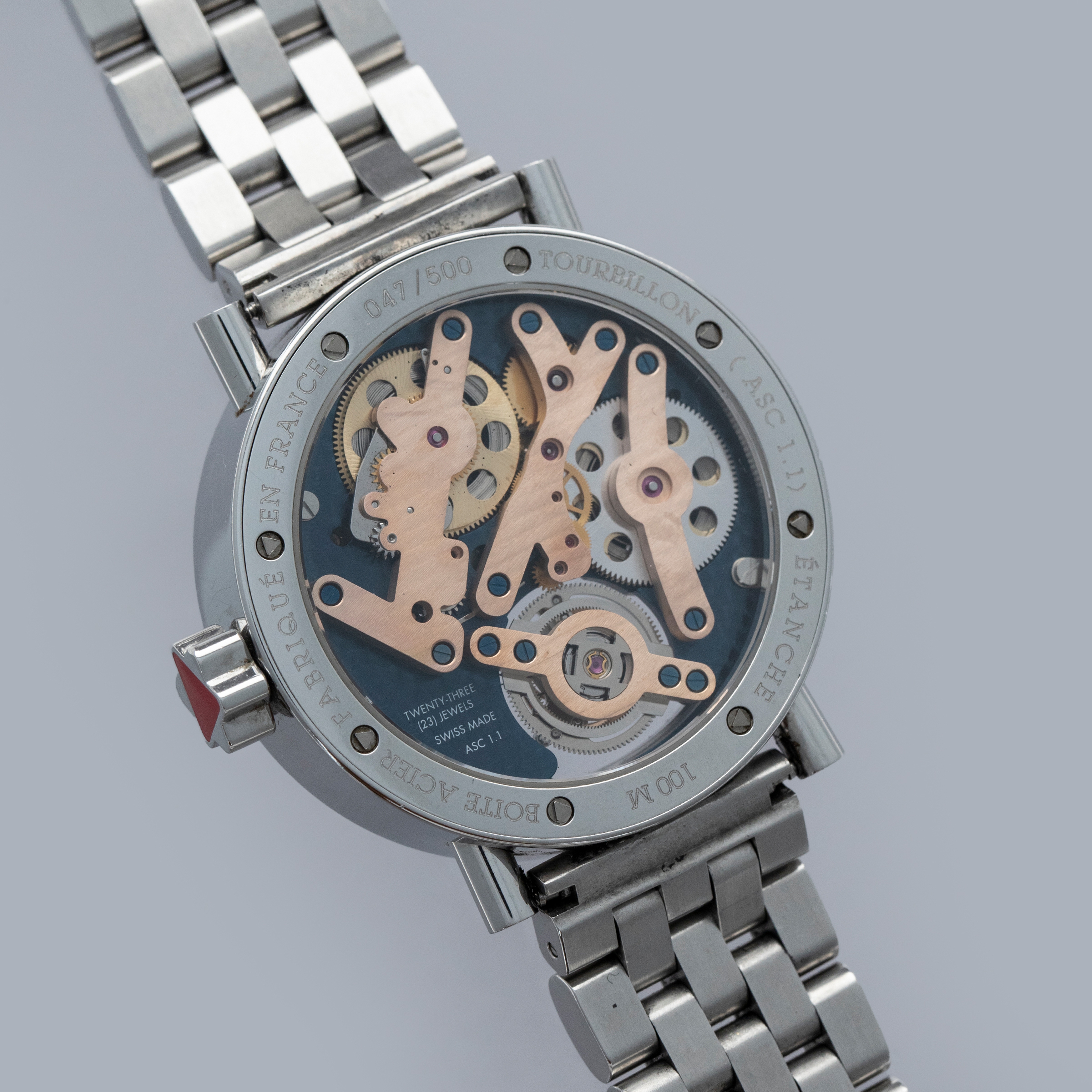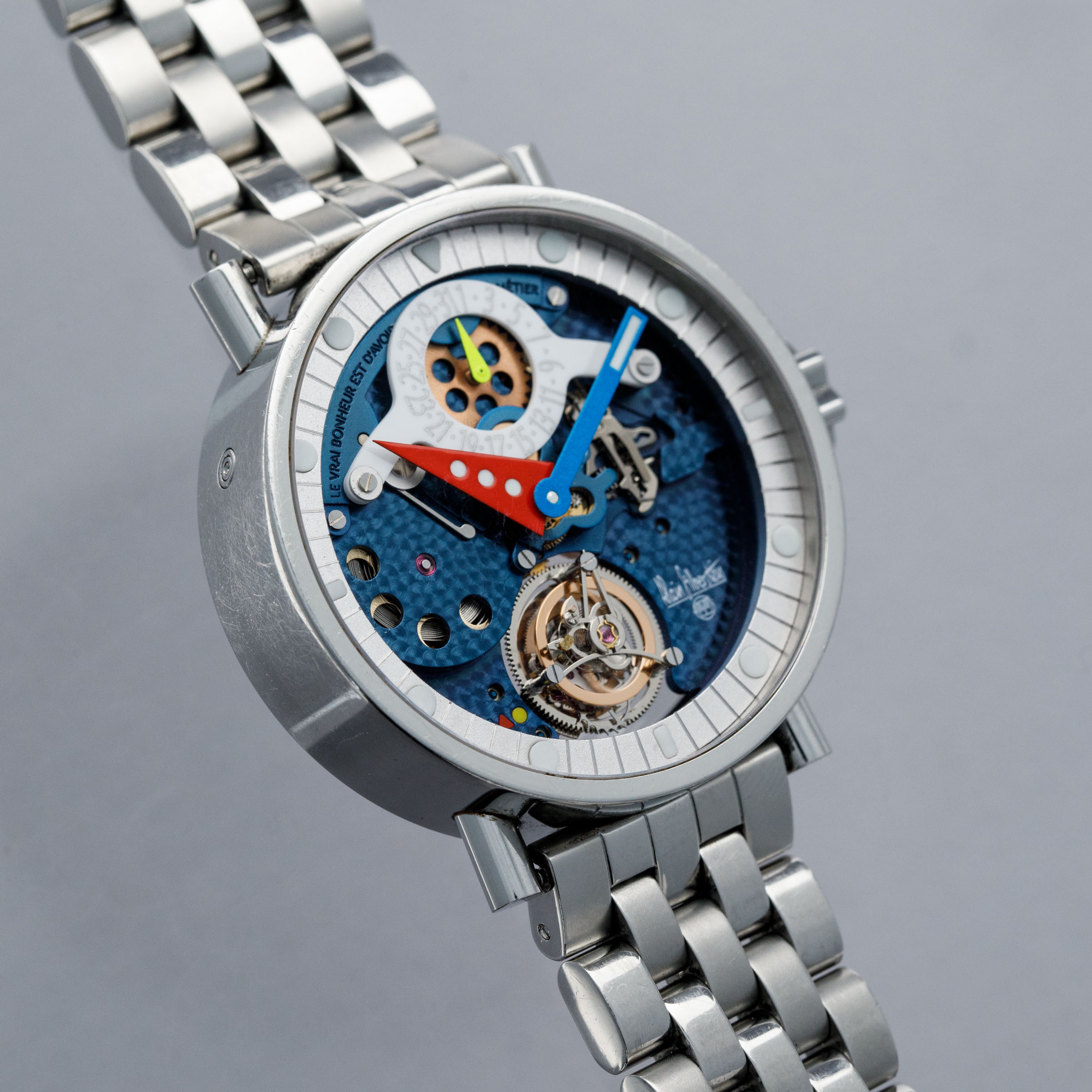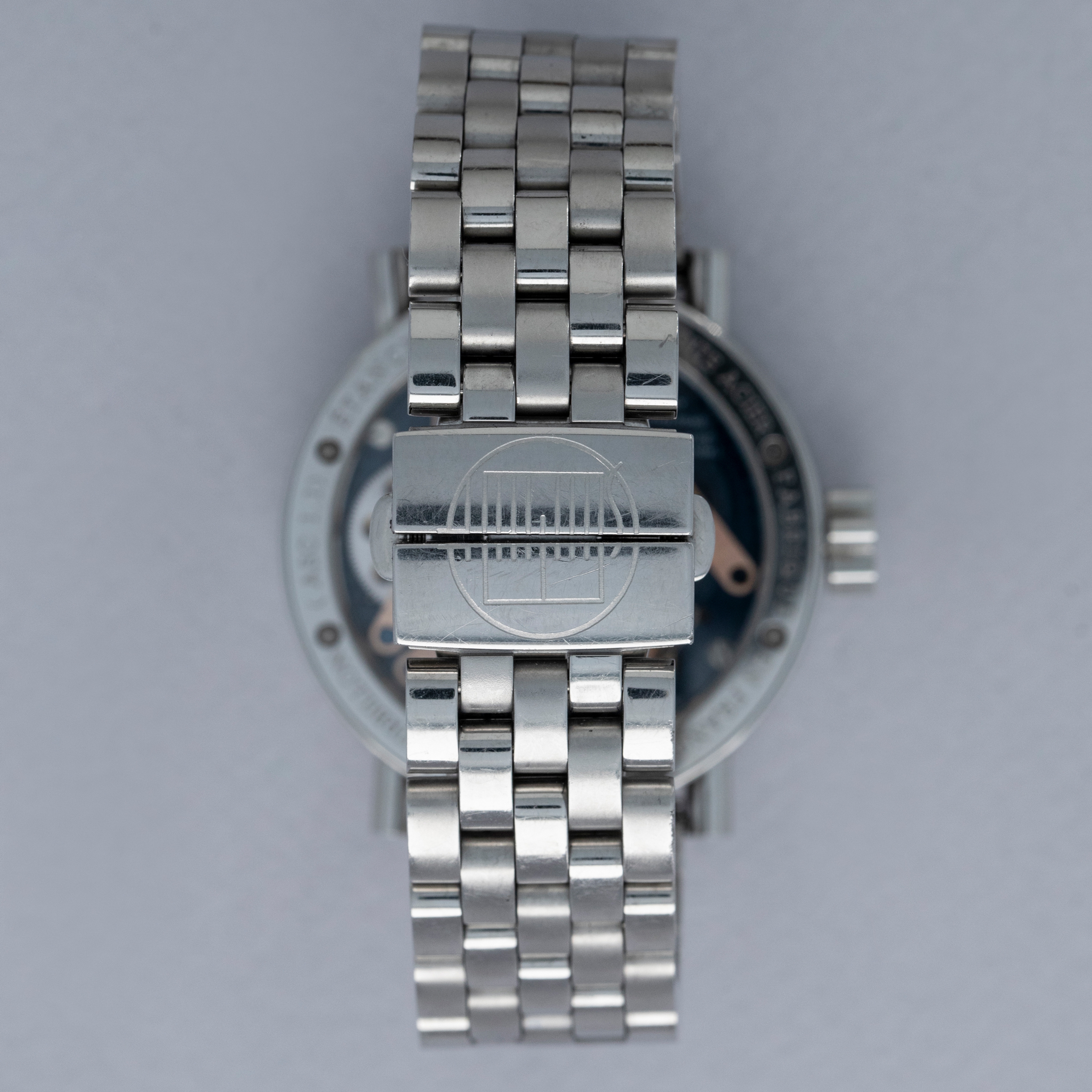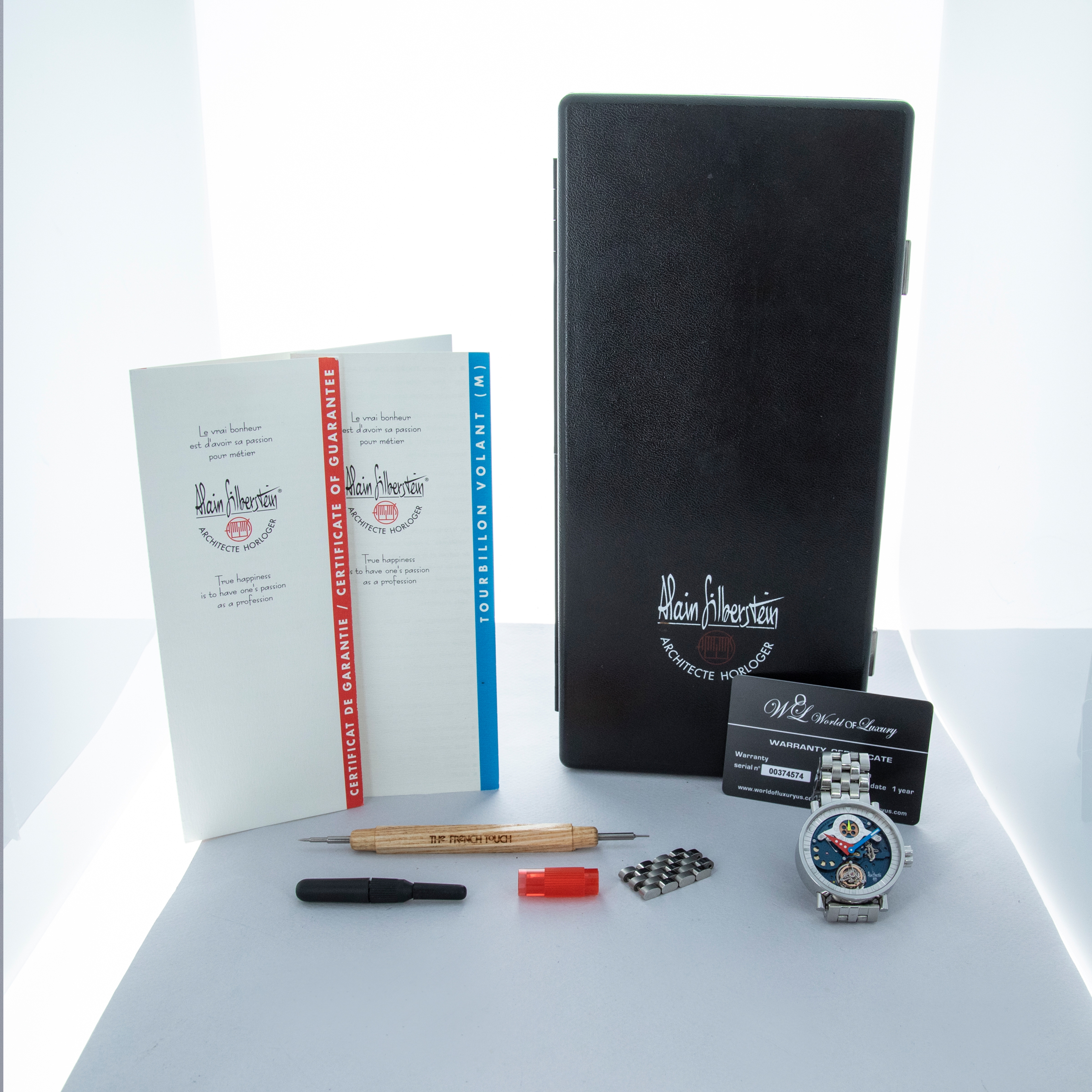 An architect and designer by trade, it is no surprise that Alain Silberstein’s timepieces feature some of the most unique aesthetic choices you'll see through the use of bright colors, odd geometric shapes, and distinctive artistry. Founded in 1987, Alain Silberstein represents the less serious side of watchmaking without sacrificing quality, craftsmanship, or attention to detail – tenants of modern fine horology. With the brand no longer producing watches of their own, Alain Silberstein’s influence on the industry is now represented through collaborations or discontinued pieces like the Tourbillon Volant ref. TMA1-002 that we have here. Launched in 2004 as a limited edition series of just 9 pieces, this timepiece features the hours, minutes, a pointer date and a 60-second tourbillon that sit atop its skeletonized blue dial. A stainless steel timepiece packed with complications that contrast its playful design in such a way that highlights the brand’s overarching desire to appeal to watchmaking’s most important tenants while not getting too lost in an otherwise fun contemporary design, this watch is a perfect example of what made Alain Silberstein so popular in the brand’s hay-day.