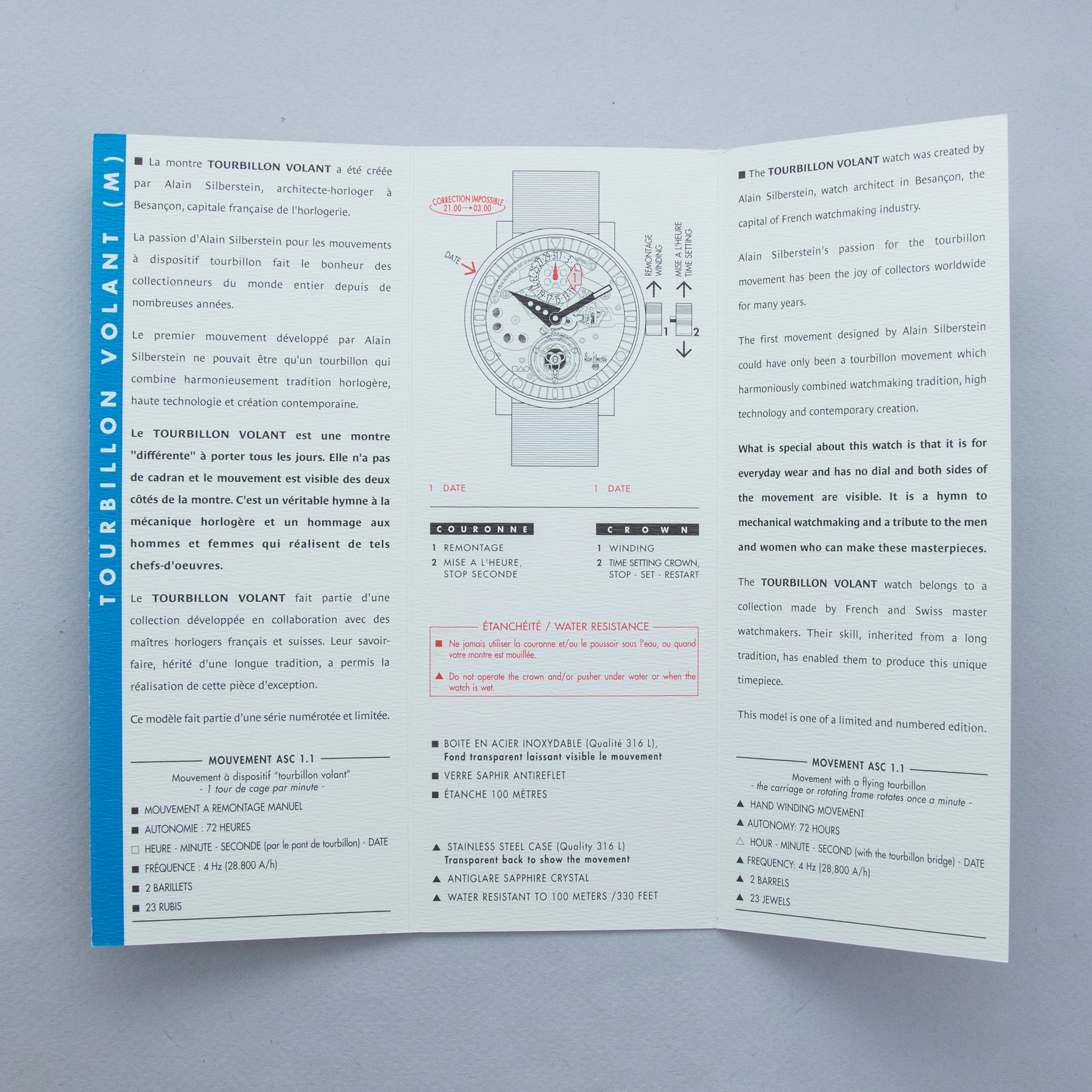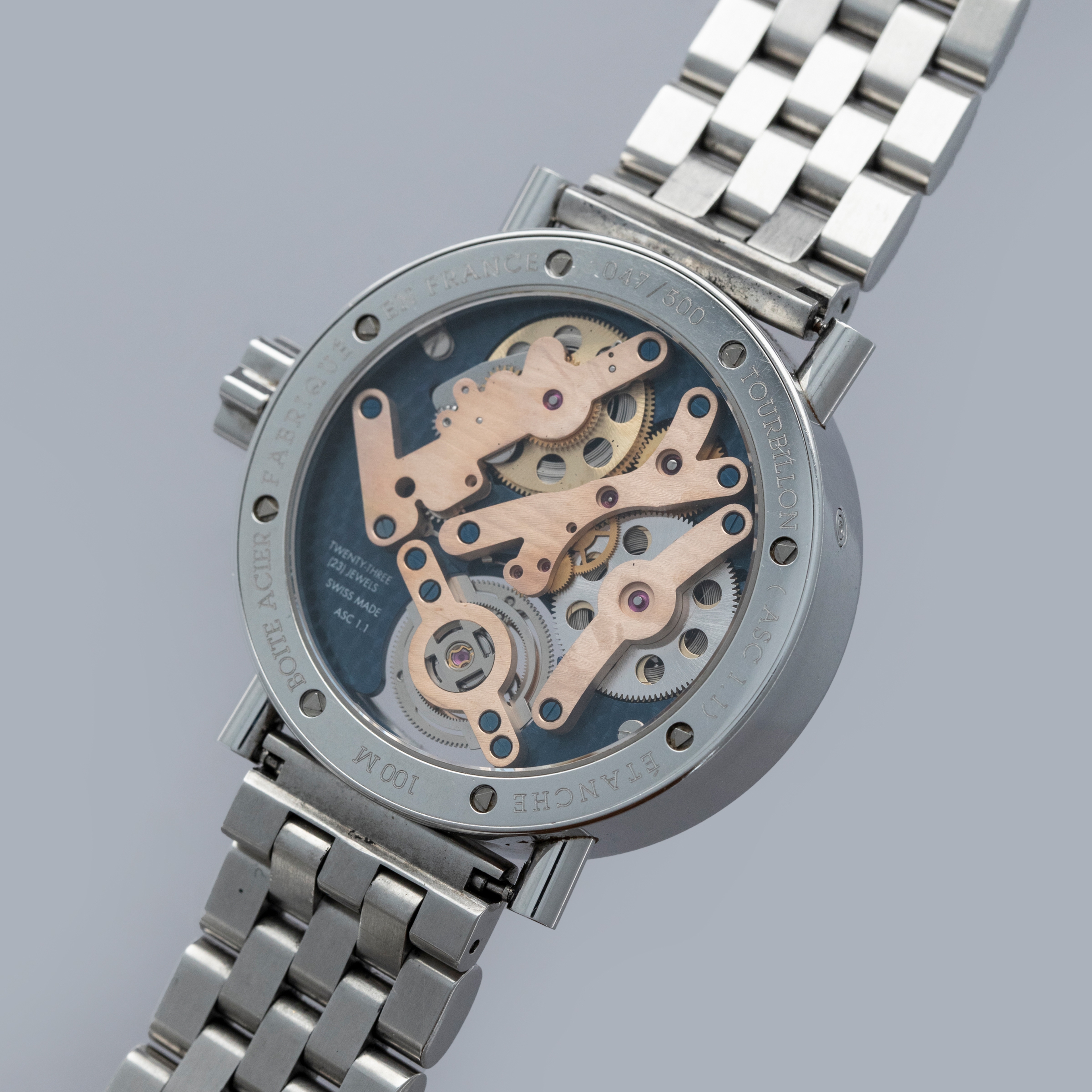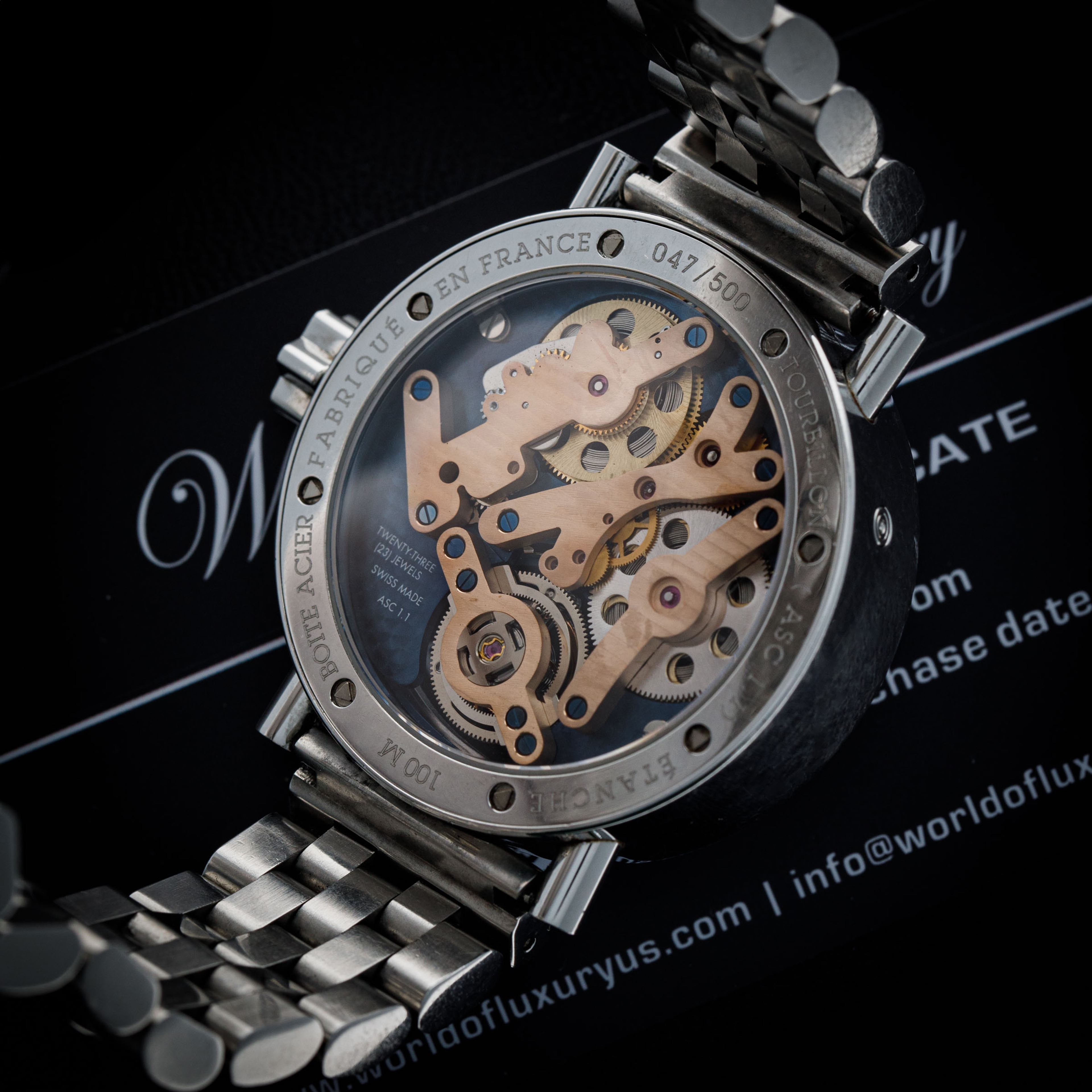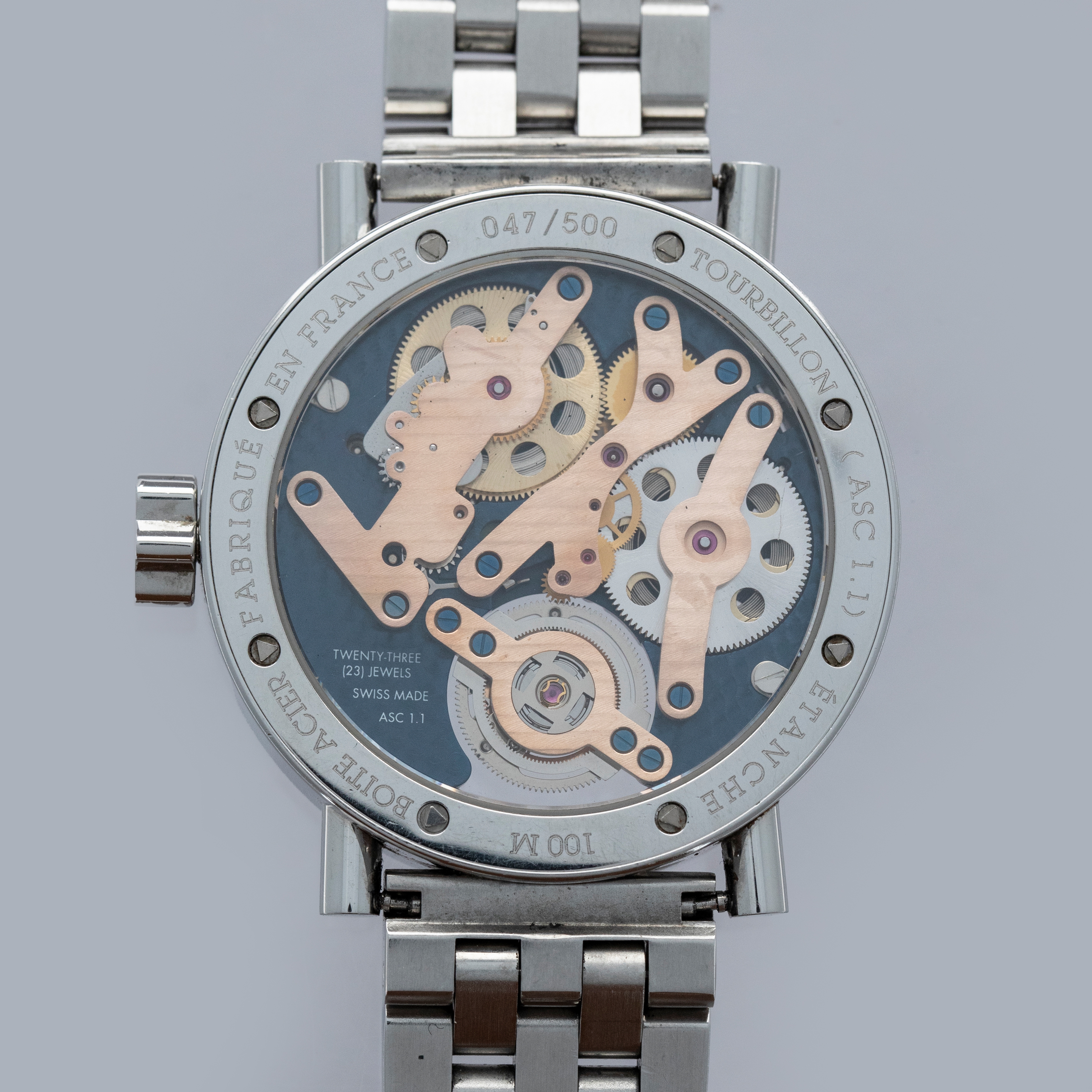 An architect and designer by trade, it is no surprise that Alain Silberstein’s timepieces feature some of the most unique aesthetic choices you'll see through the use of bright colors, odd geometric shapes, and distinctive artistry. Founded in 1987, Alain Silberstein represents the less serious side of watchmaking without sacrificing quality, craftsmanship, or attention to detail – tenants of modern fine horology. With the brand no longer producing watches of their own, Alain Silberstein’s influence on the industry is now represented through collaborations or discontinued pieces like the Tourbillon Volant ref. TMA1-002 that we have here. Launched in 2004 as a limited edition series of just 9 pieces, this timepiece features the hours, minutes, a pointer date and a 60-second tourbillon that sit atop its skeletonized blue dial. A stainless steel timepiece packed with complications that contrast its playful design in such a way that highlights the brand’s overarching desire to appeal to watchmaking’s most important tenants while not getting too lost in an otherwise fun contemporary design, this watch is a perfect example of what made Alain Silberstein so popular in the brand’s hay-day.