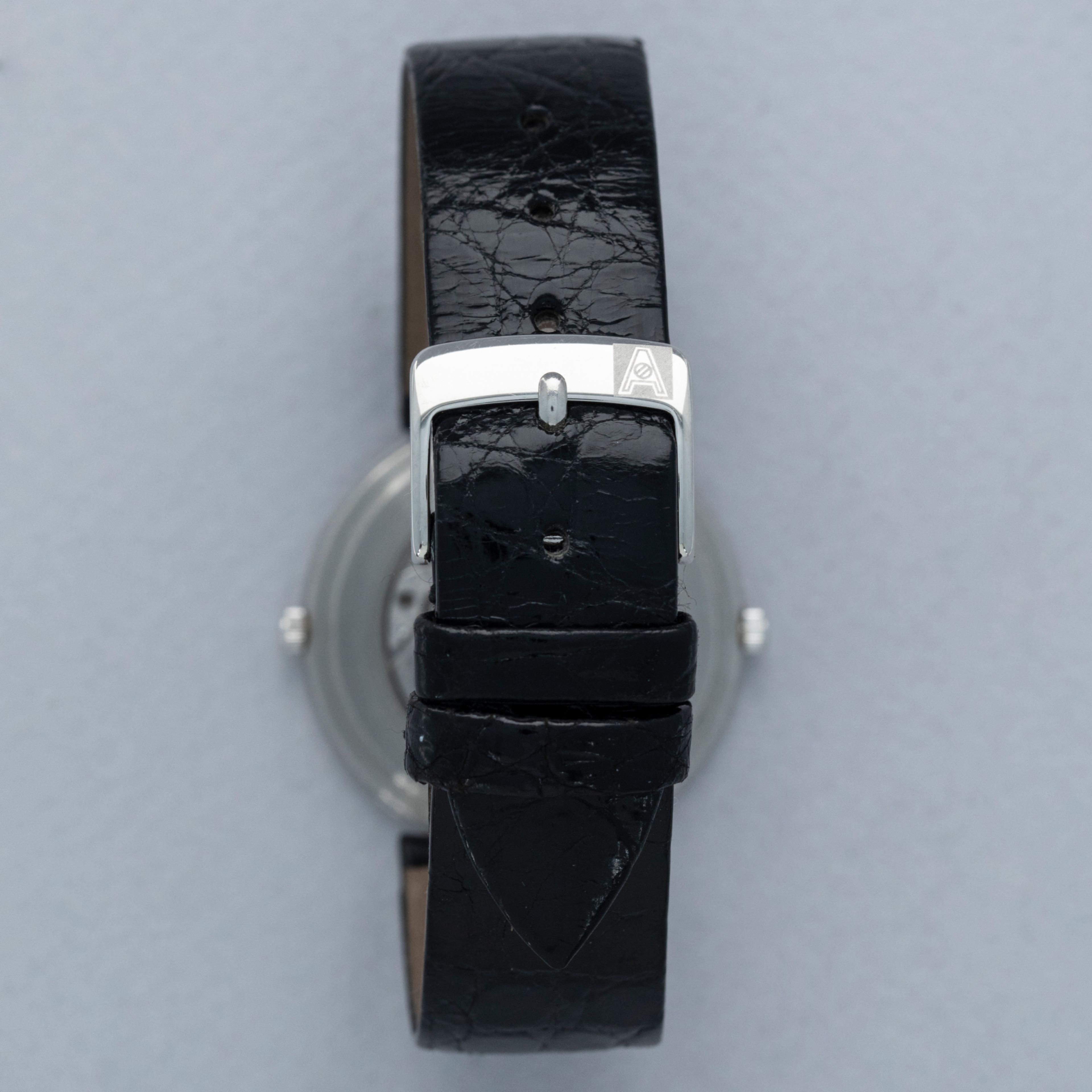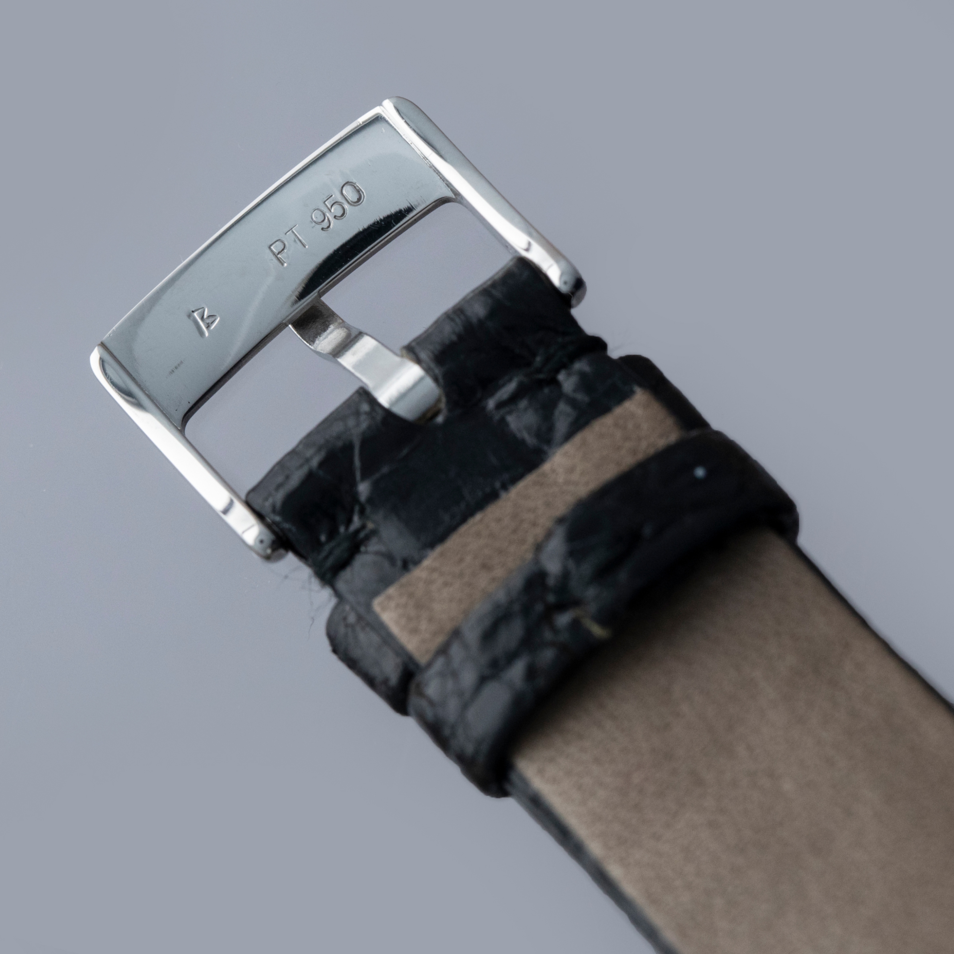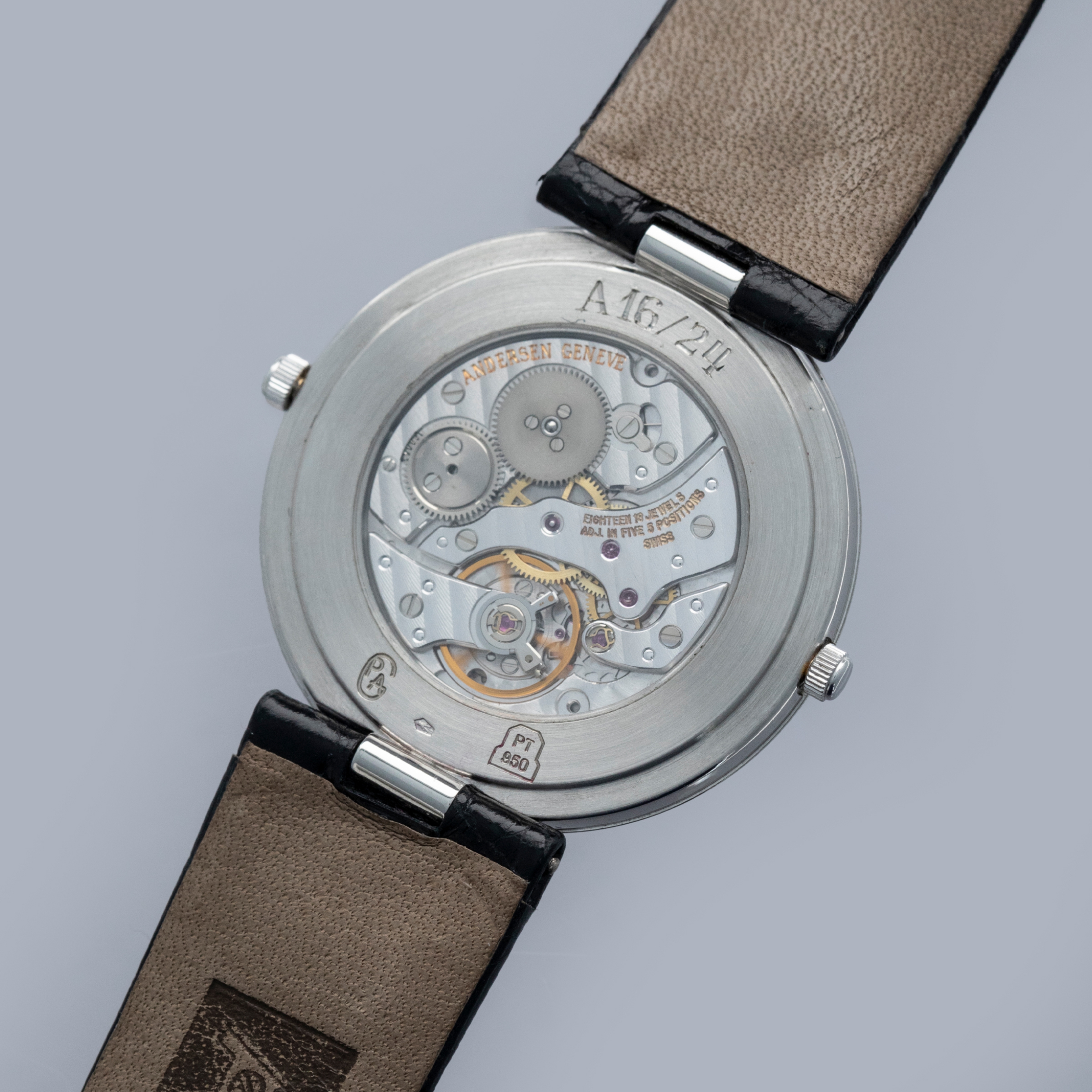 The platinum case is in excellent condition, with a few light scratches and marks. The display case back is also excellent, showing a few minor scratches and light marks and with crisp engravings and hallmarks. The dial is truly excellent, featuring very clean white metal no-lume hands. The watch is fitted with a black leather Andersen strap and a platinum A-logo pin buckle, both in excellent condition.