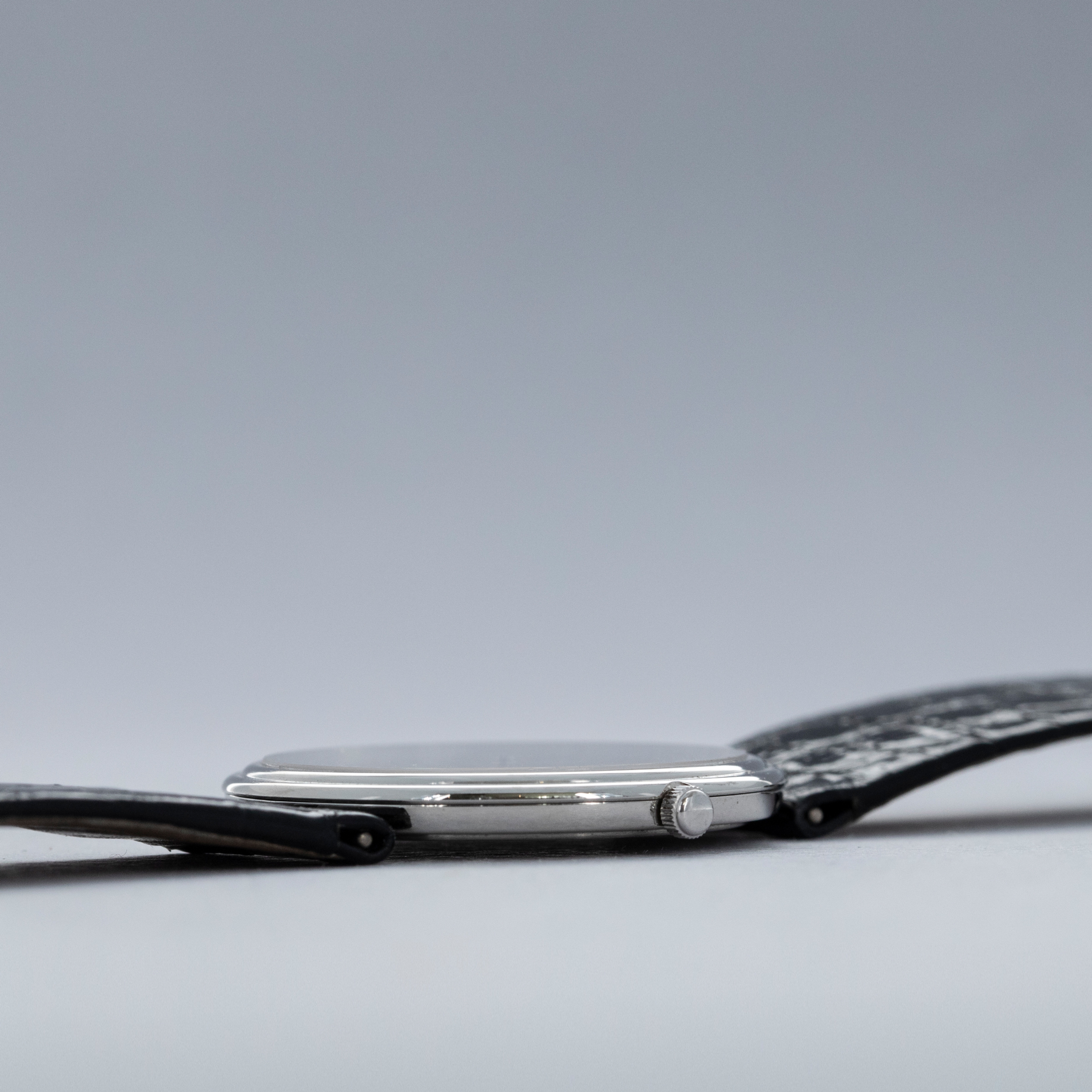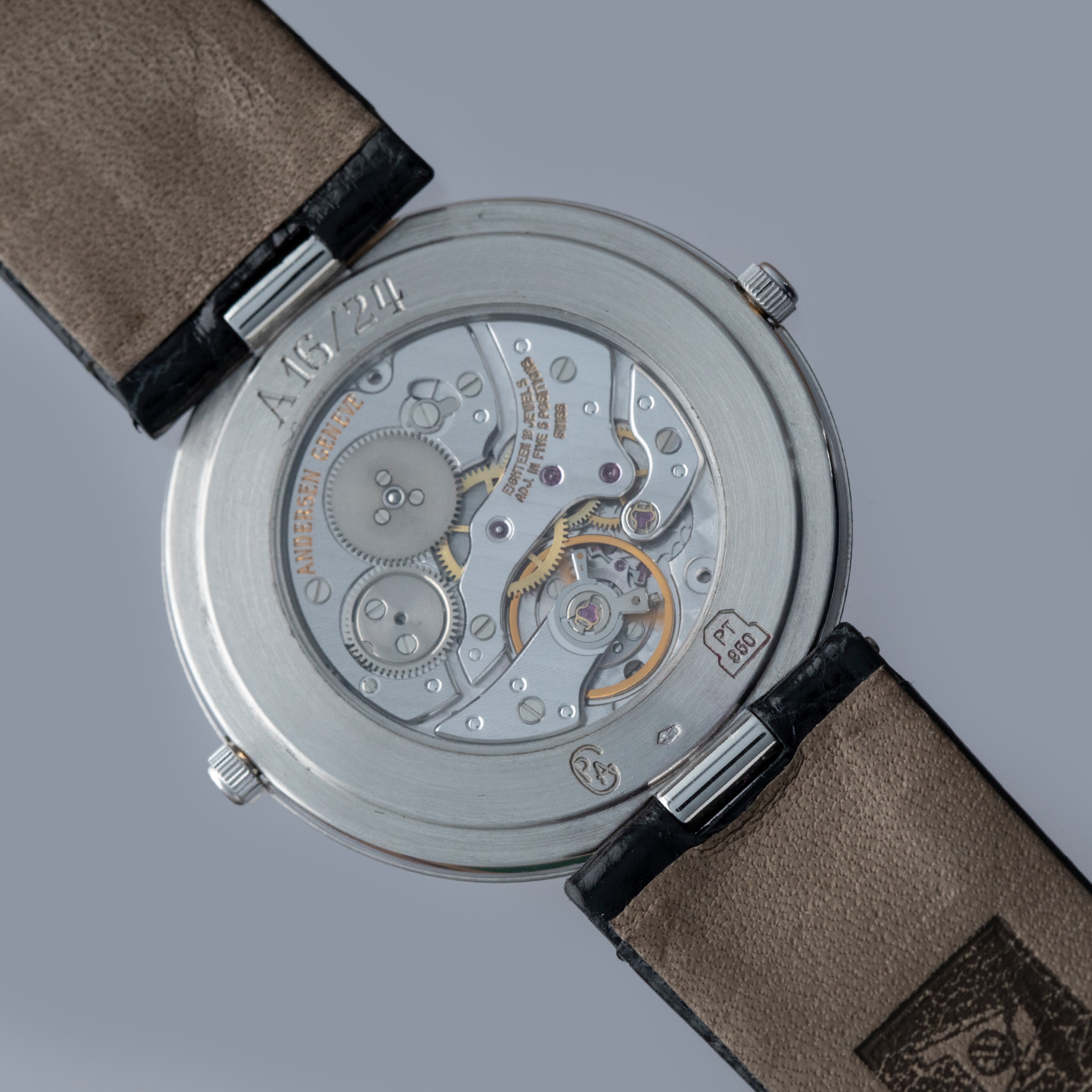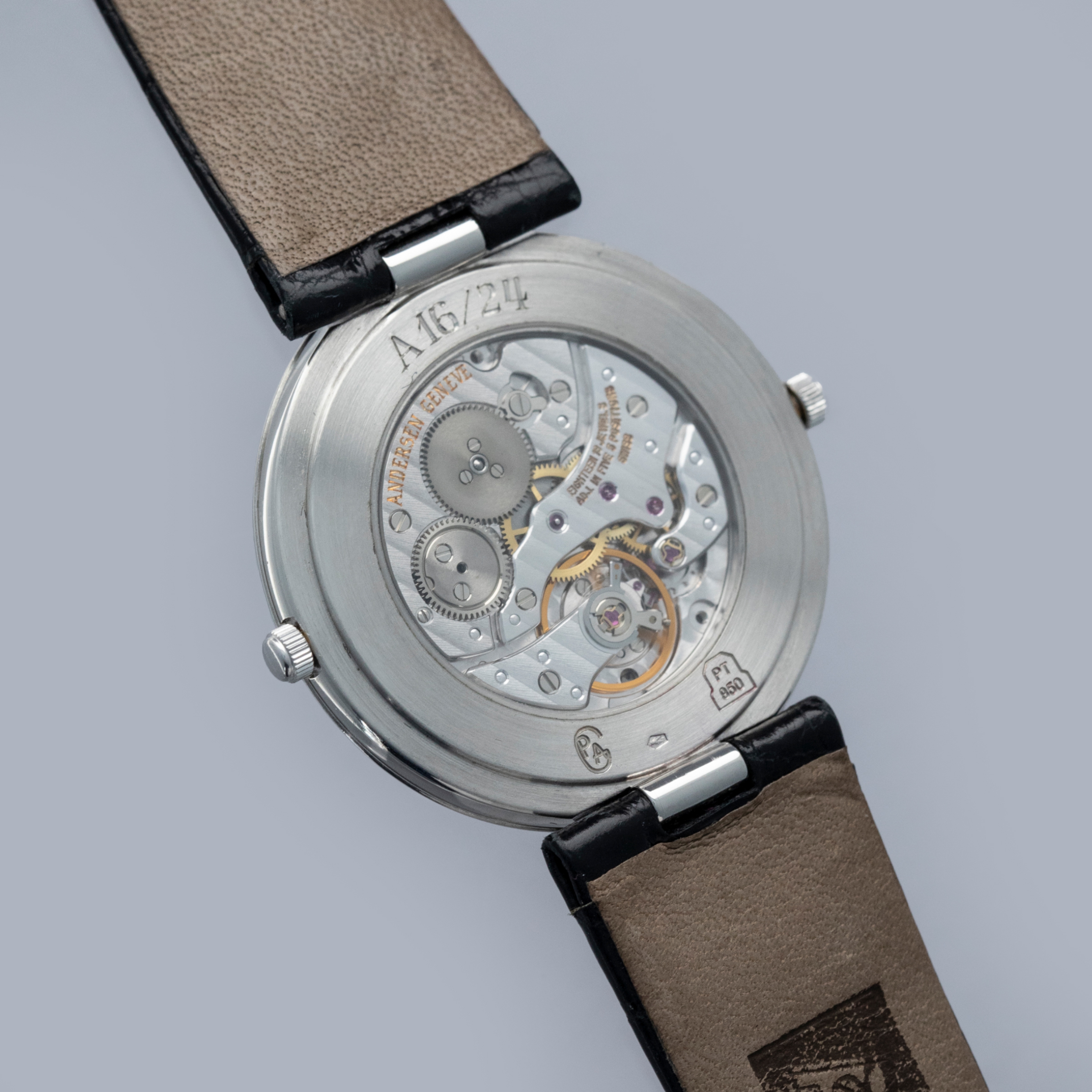 The platinum case is in excellent condition, with a few light scratches and marks. The display case back is also excellent, showing a few minor scratches and light marks and with crisp engravings and hallmarks. The dial is truly excellent, featuring very clean white metal no-lume hands. The watch is fitted with a black leather Andersen strap and a platinum A-logo pin buckle, both in excellent condition.