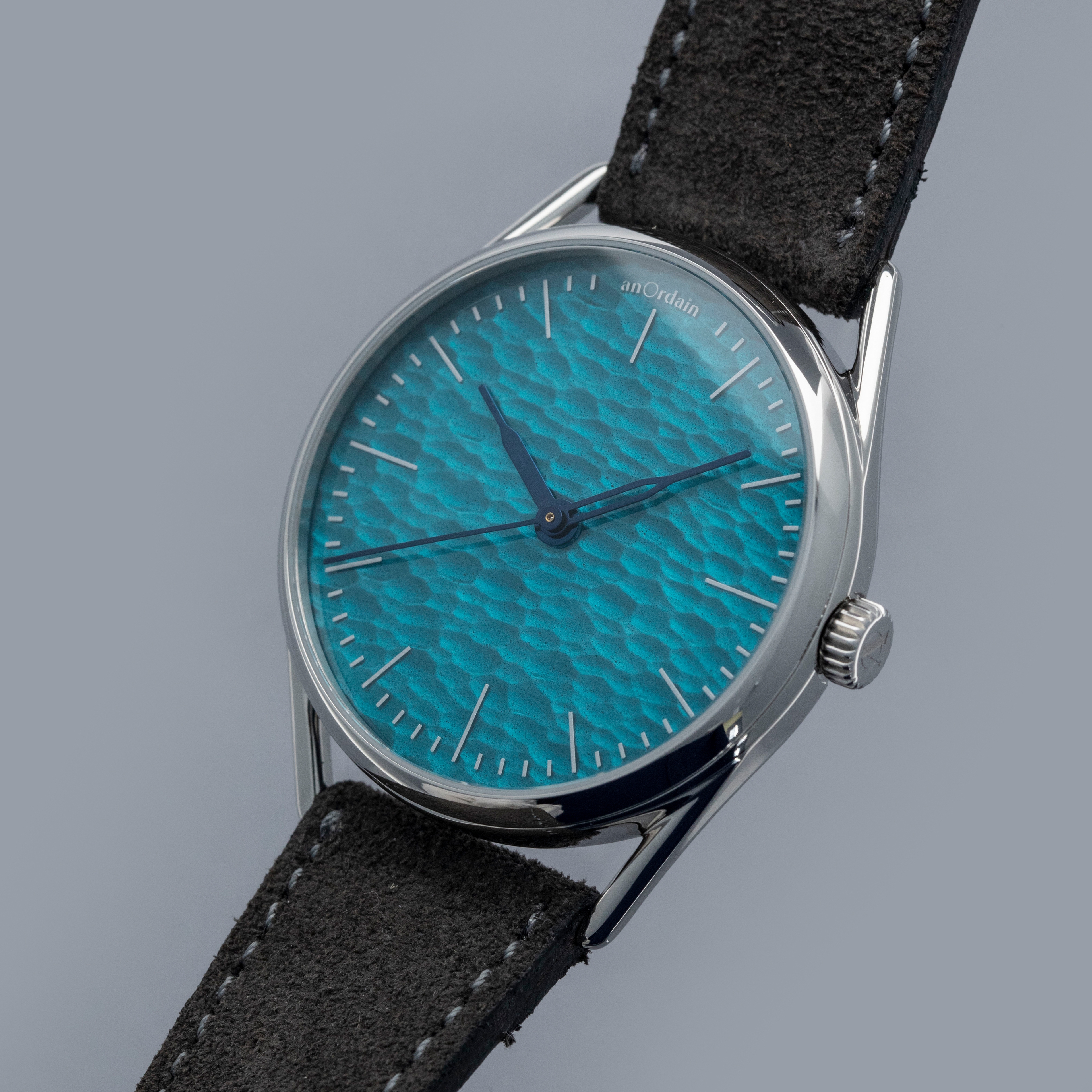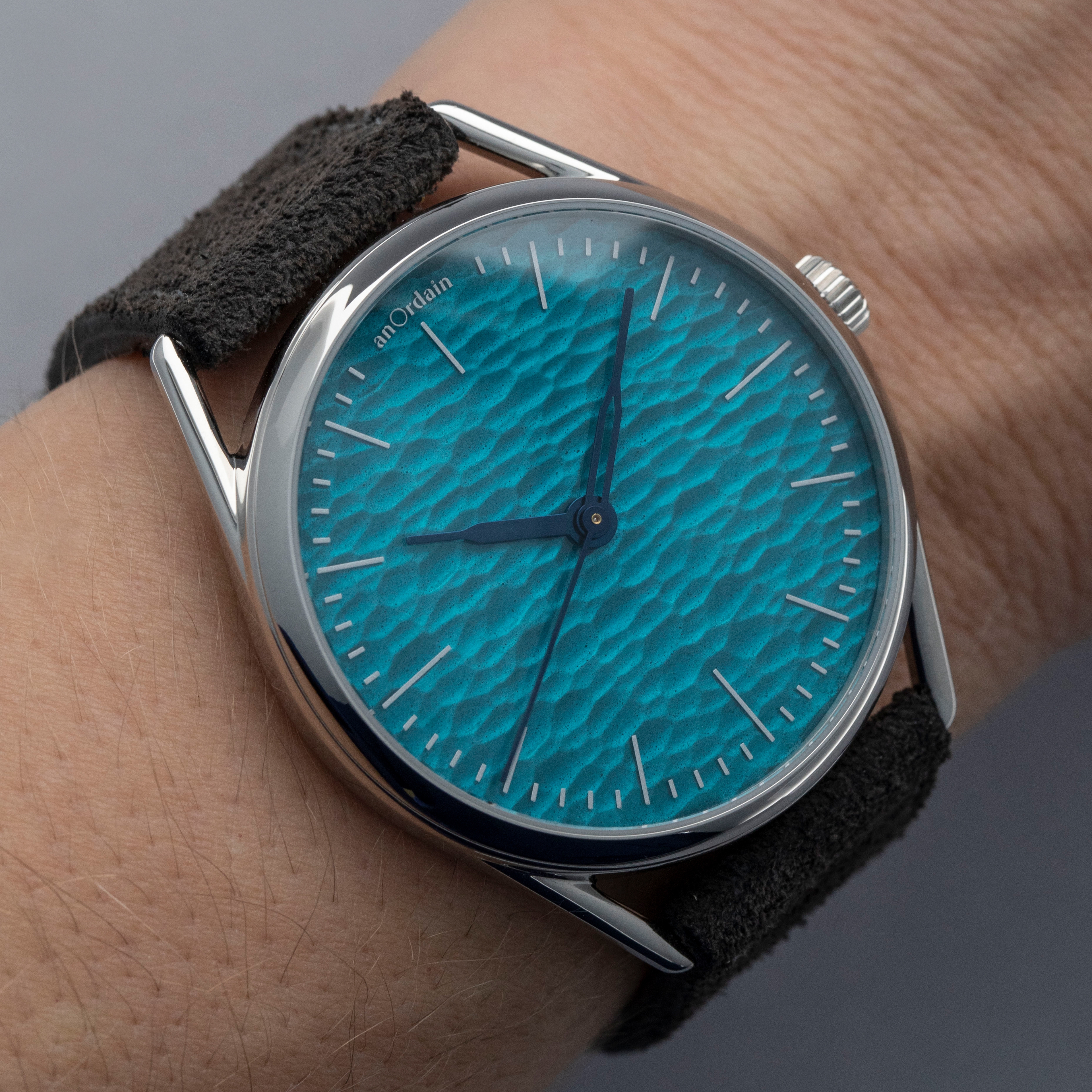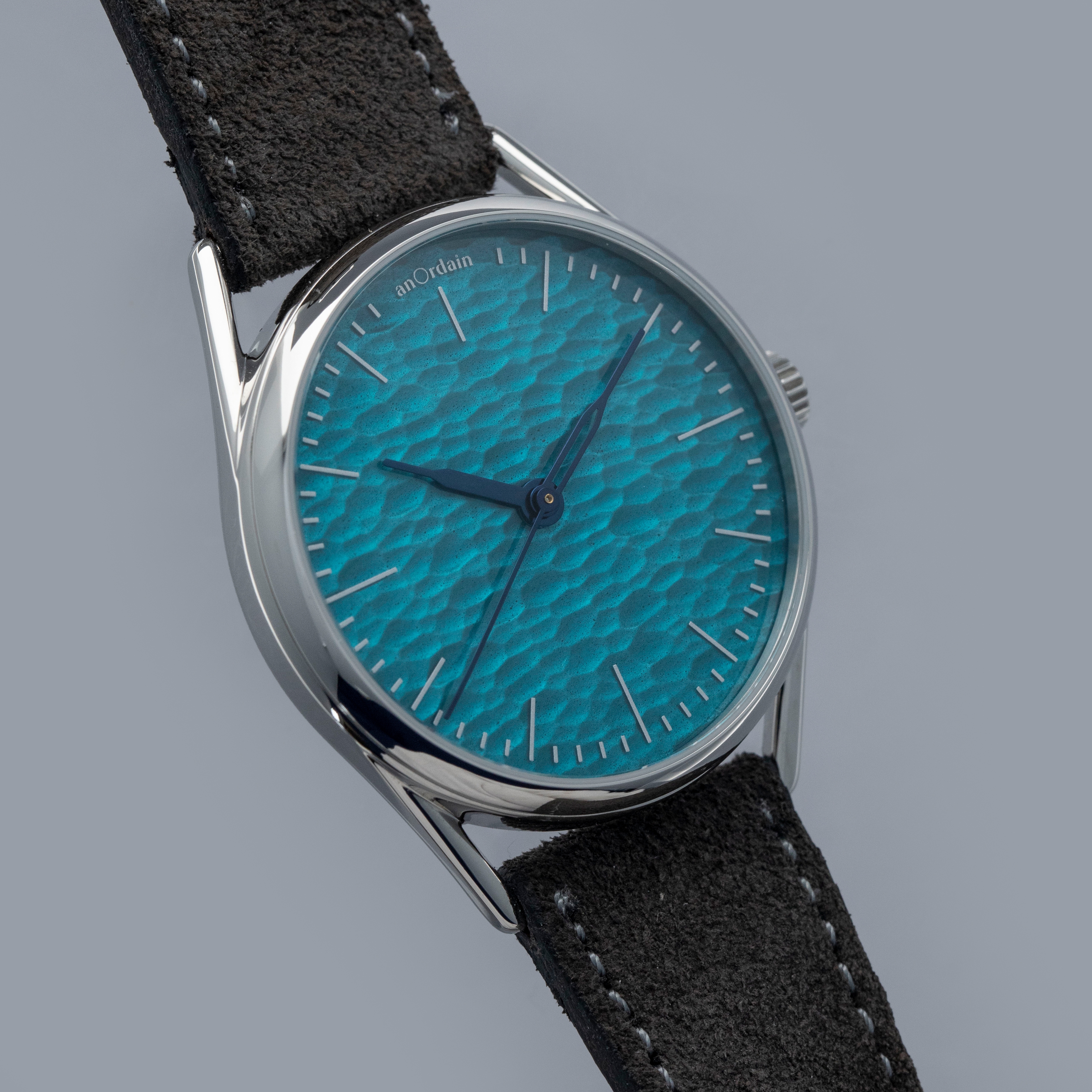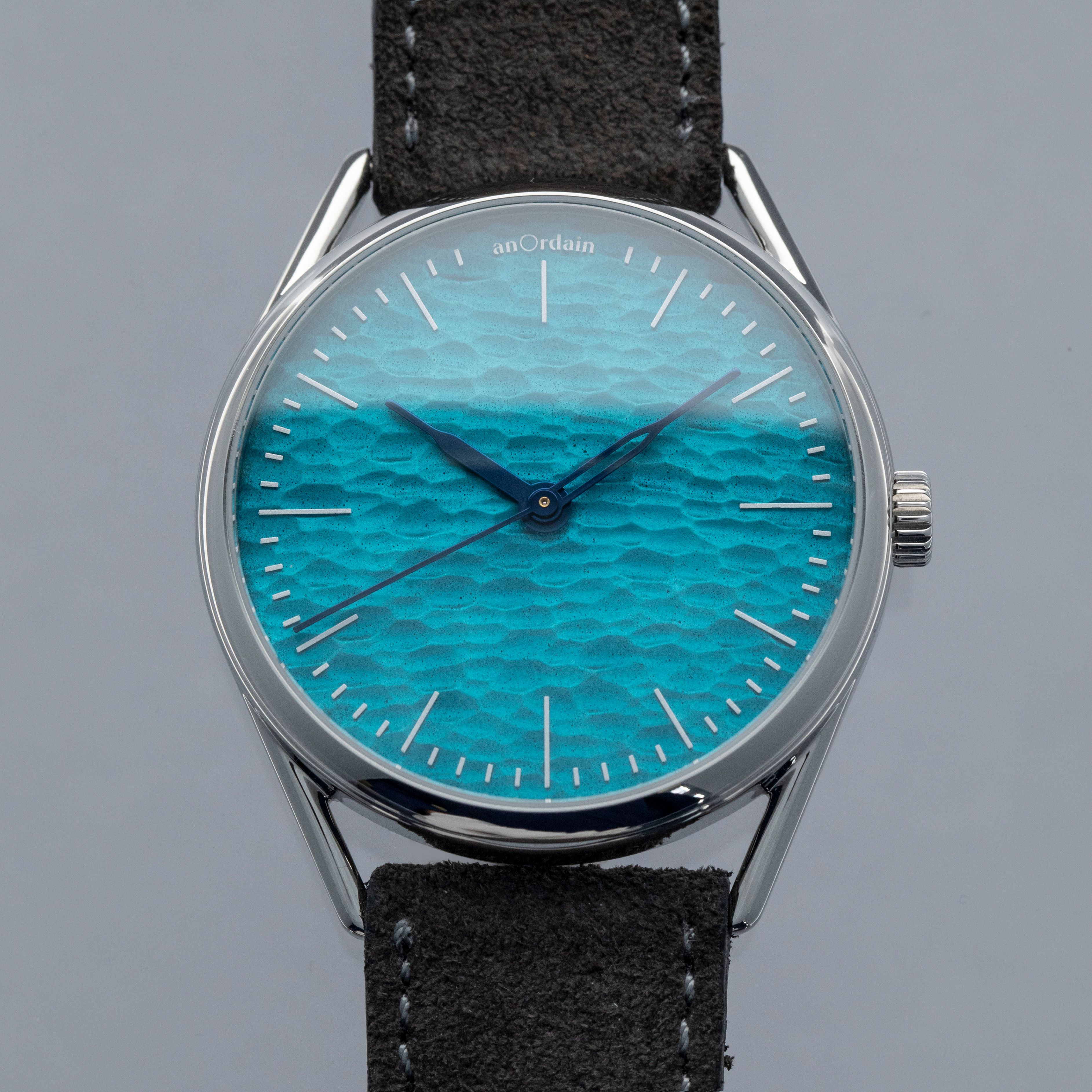Boasting a rich aqua blue dial with a rippled texture that is hand-carved onto a block of ash before being 3D scanned and turned into a 3D model for the dial's base, the Model 3 Method showcases the depths AnOrdain will go to to create a beautiful display.