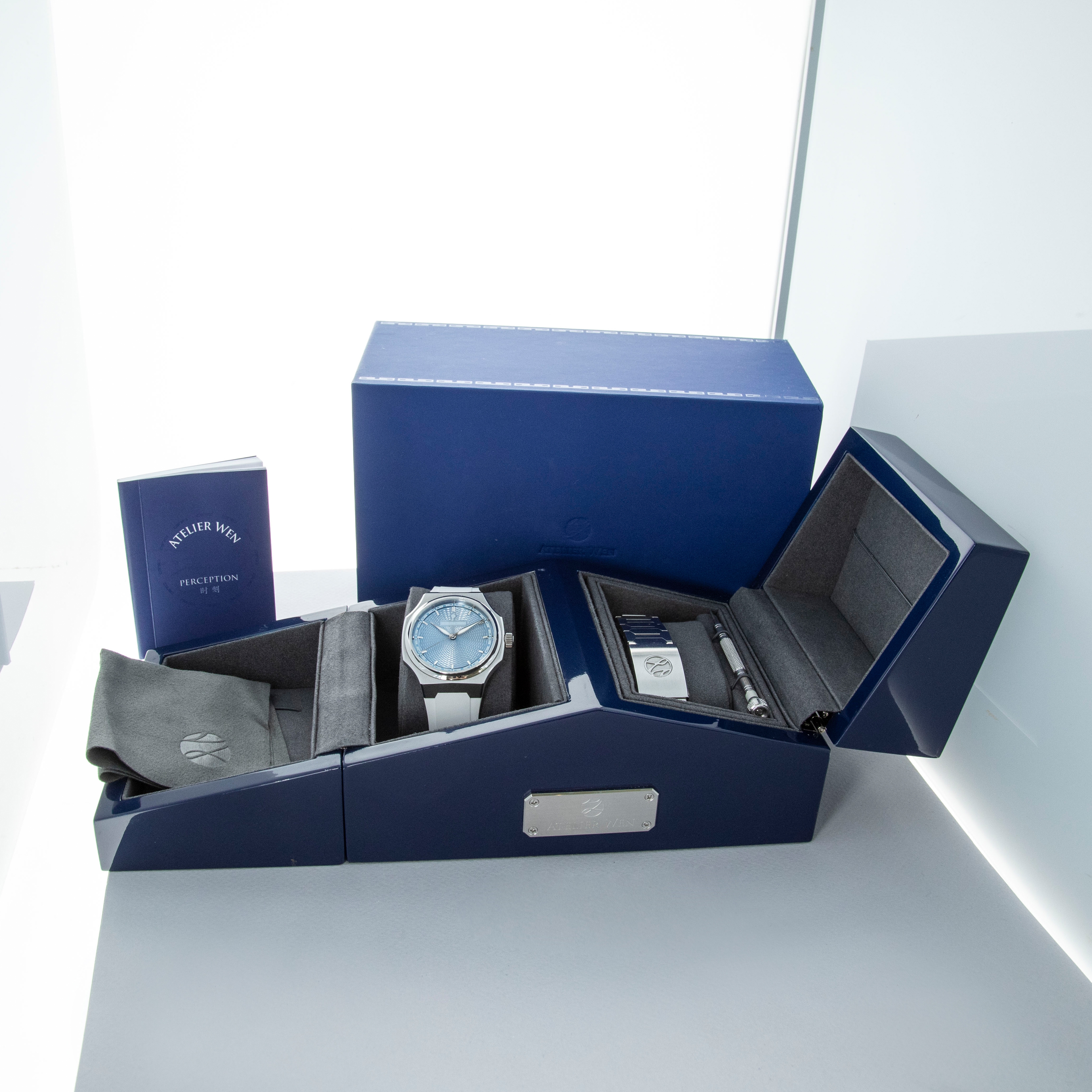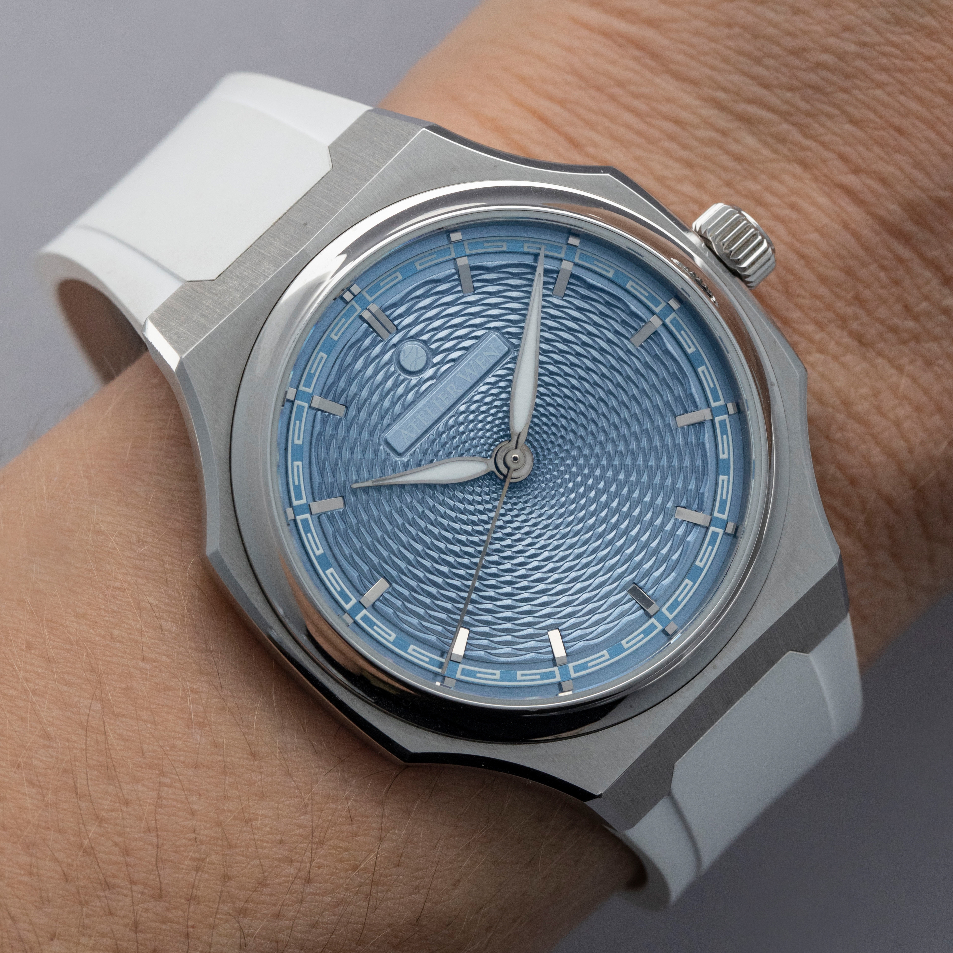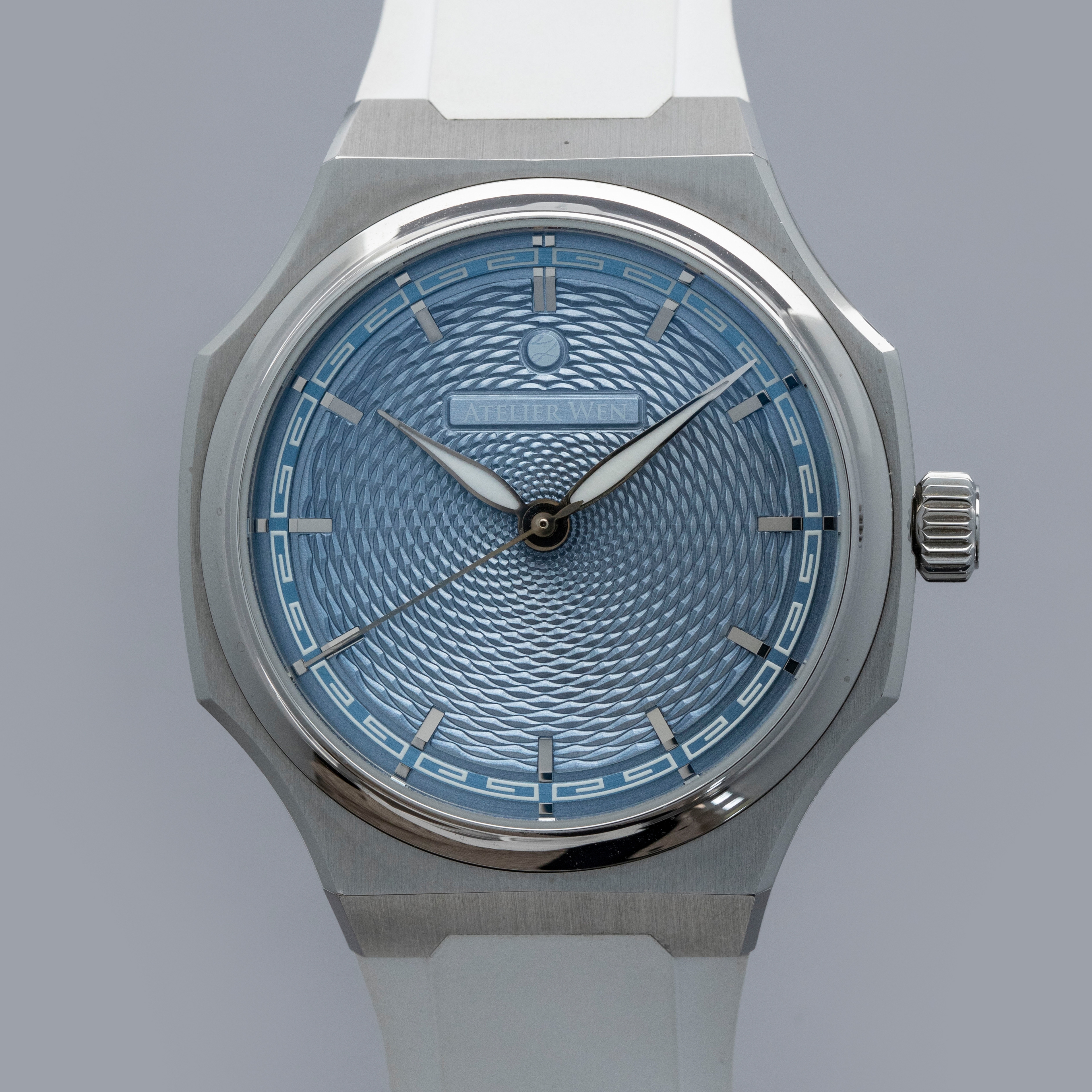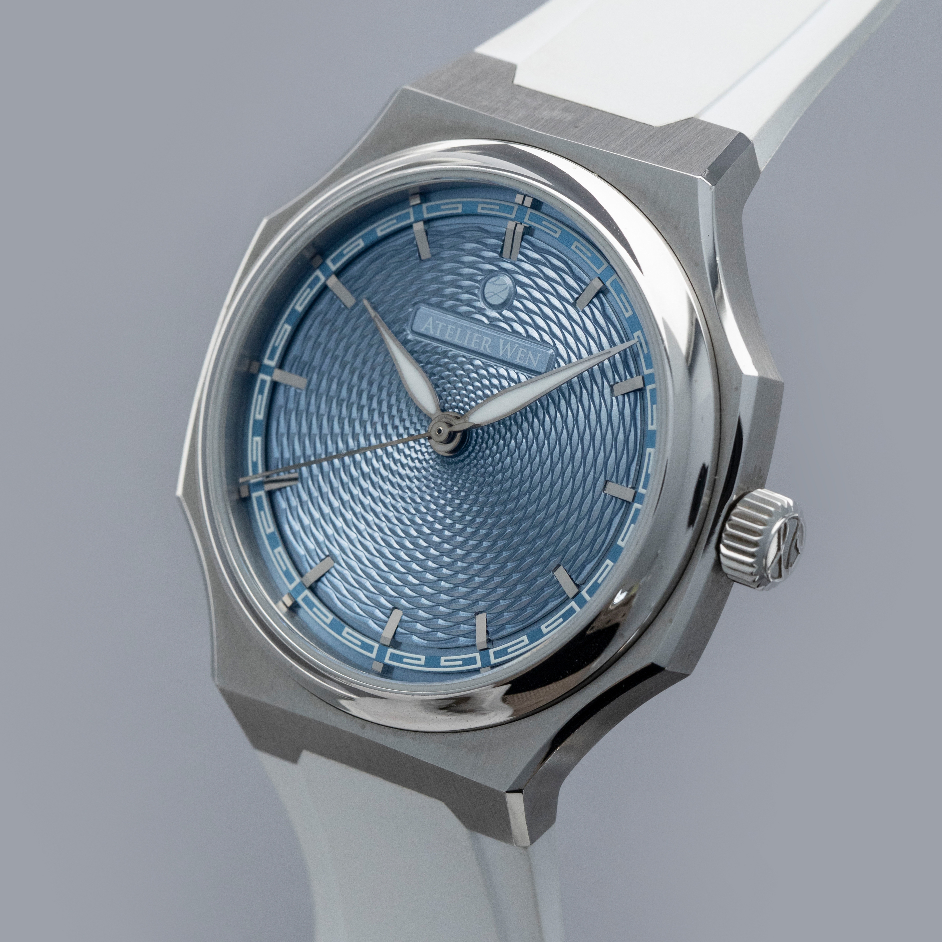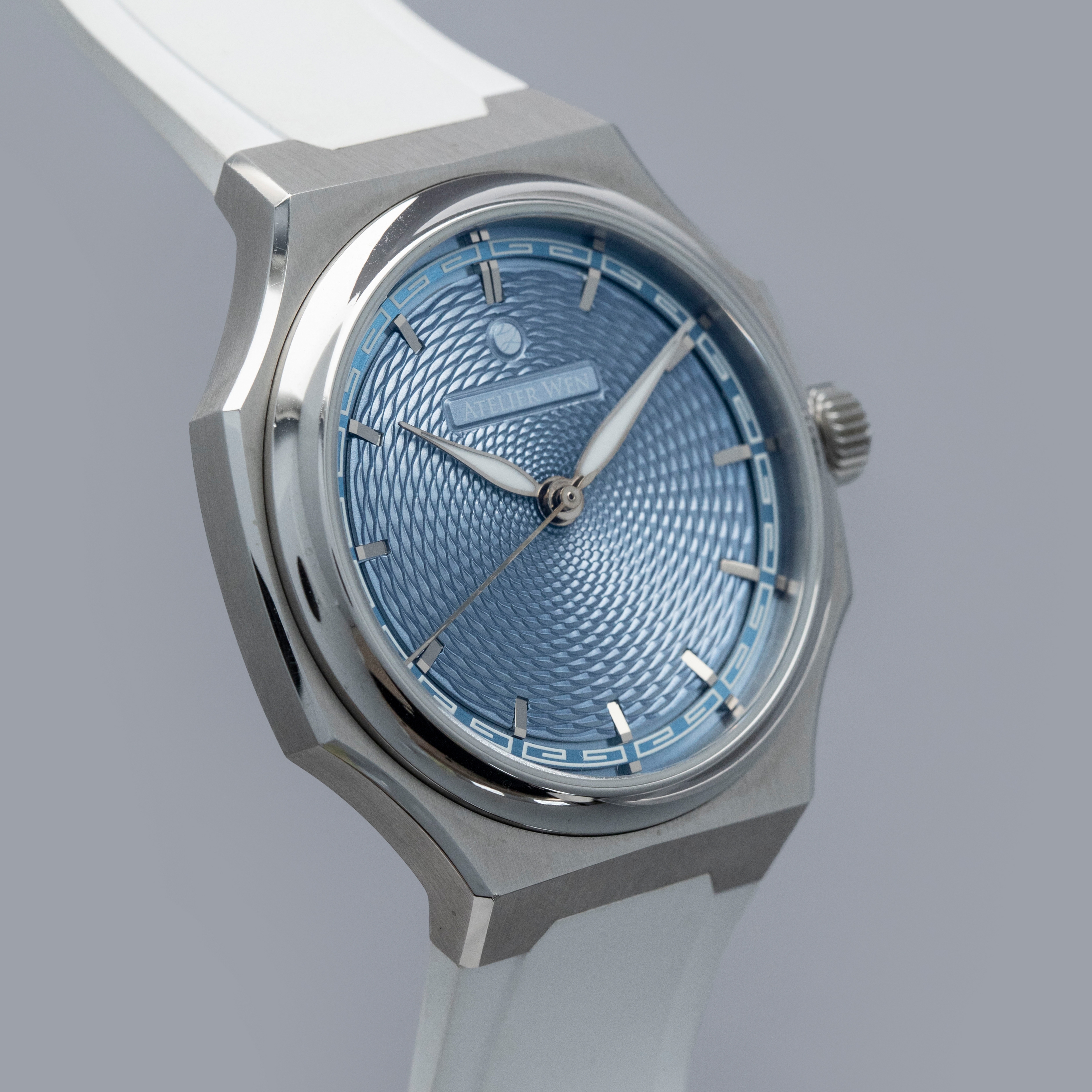A masterclass in contemporary Chinese watchmaking that fuses avant-garde design with artisanal craftsmanship, the Atelier Wen Perception is anchored by a bold yet refined 40mm stainless steel case that stands an impressively-thin 9.4mm tall. Exuding modern elegance while paying homage to traditional Chinese aesthetics, the Perception's dial is a visual masterpiece. Featuring a bright blue dial with a hand-engraved guilloché finish created through a rare, labor-intensive rose-engine technique, its display is unlike anything for its price point. Featuring intricate geometric patterns that catch the light in captivating ways, the Perception showcases the exceptional artistry still contained with China's horological industry.