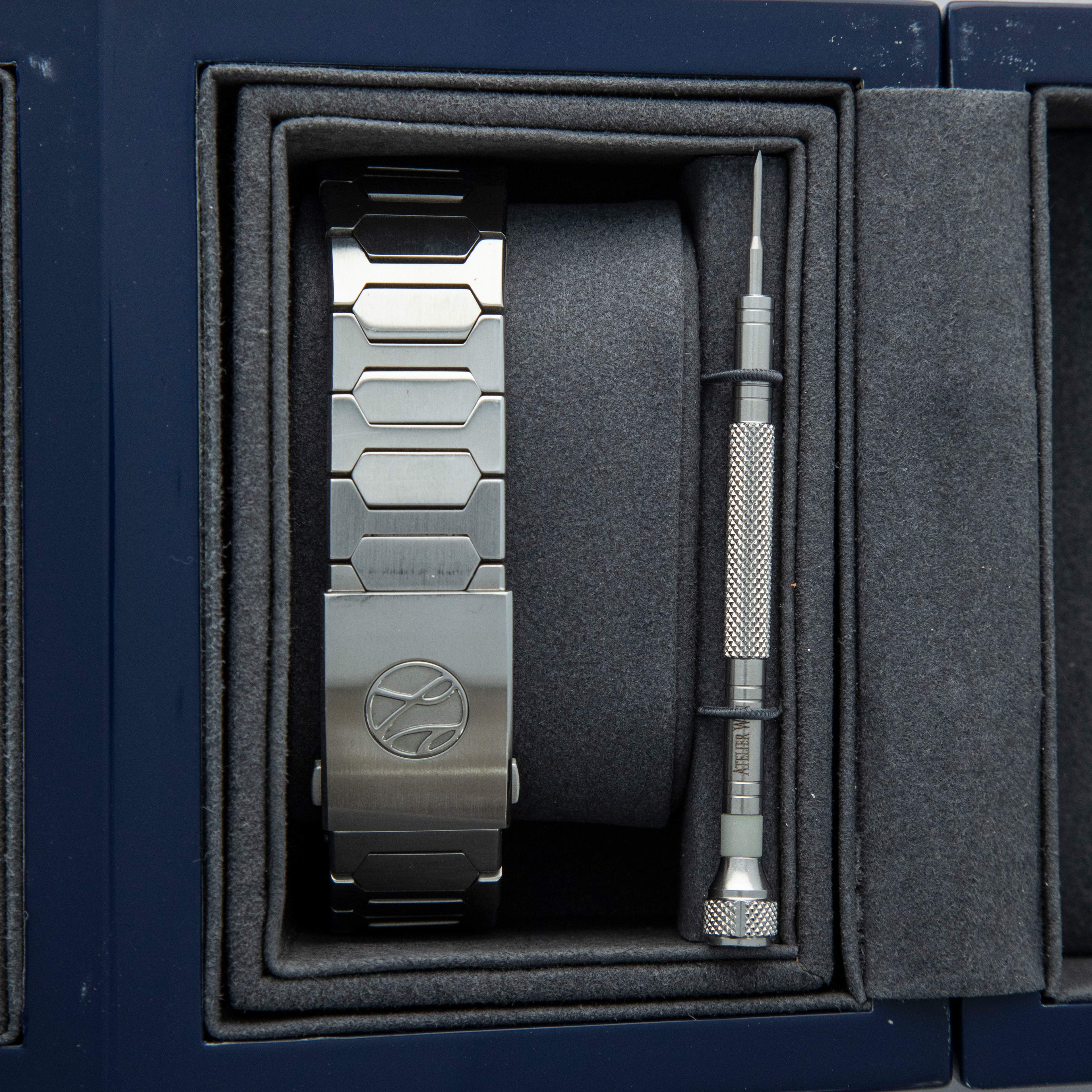 Watch, Box, Papers, Stainless Steel Bracelet, and Screwdriver