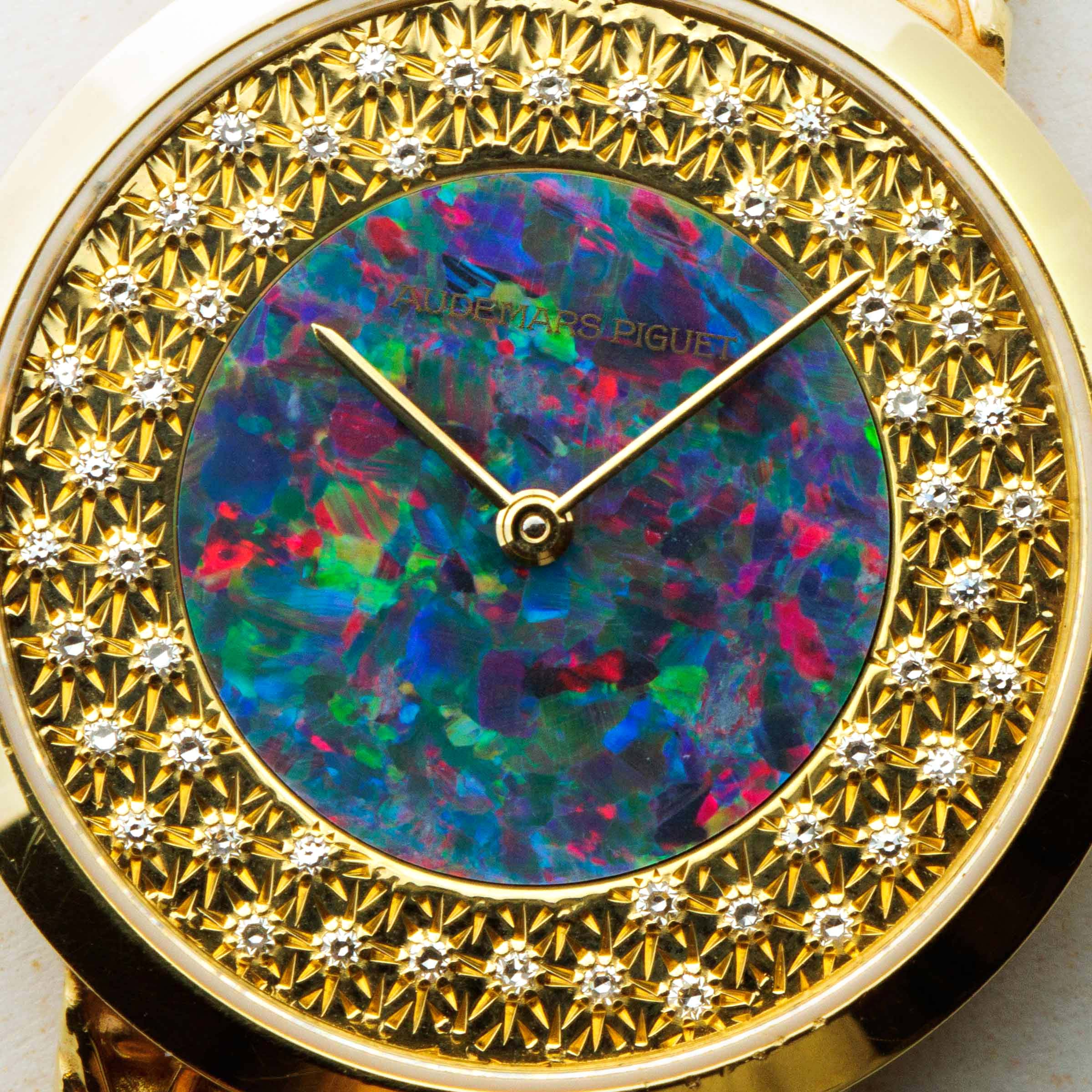 Famed for their aggressively avant-garde take on design and aesthetics, Audemars Piguet has long been known to blend aspects of their history with their own take on horology. As a result, timepieces that feature both period-defining designs and aspects of AP’s historical DNA can be produced, just like this example. Featuring a round 18kt yellow gold case and a matching 18kt yellow gold bracelet with a diamond-set lace dial that boasts an opal center, this timepiece blends AP’s love of opulence with their desire to celebrate their unique designs. Powered by a thin quartz movement, this timepiece ensures that AP’s female clientele could enjoy AP’s high level of craftsmanship without having to compromise on the fit and finish of the watch. With its beautifully intricate construction and opulent sense of design this example’s immaculately woven bracelet, plethora of diamonds and colorful opal center combine to create a timepiece with a unique aesthetic that jumps off the wrist and packs a serious punch of style.