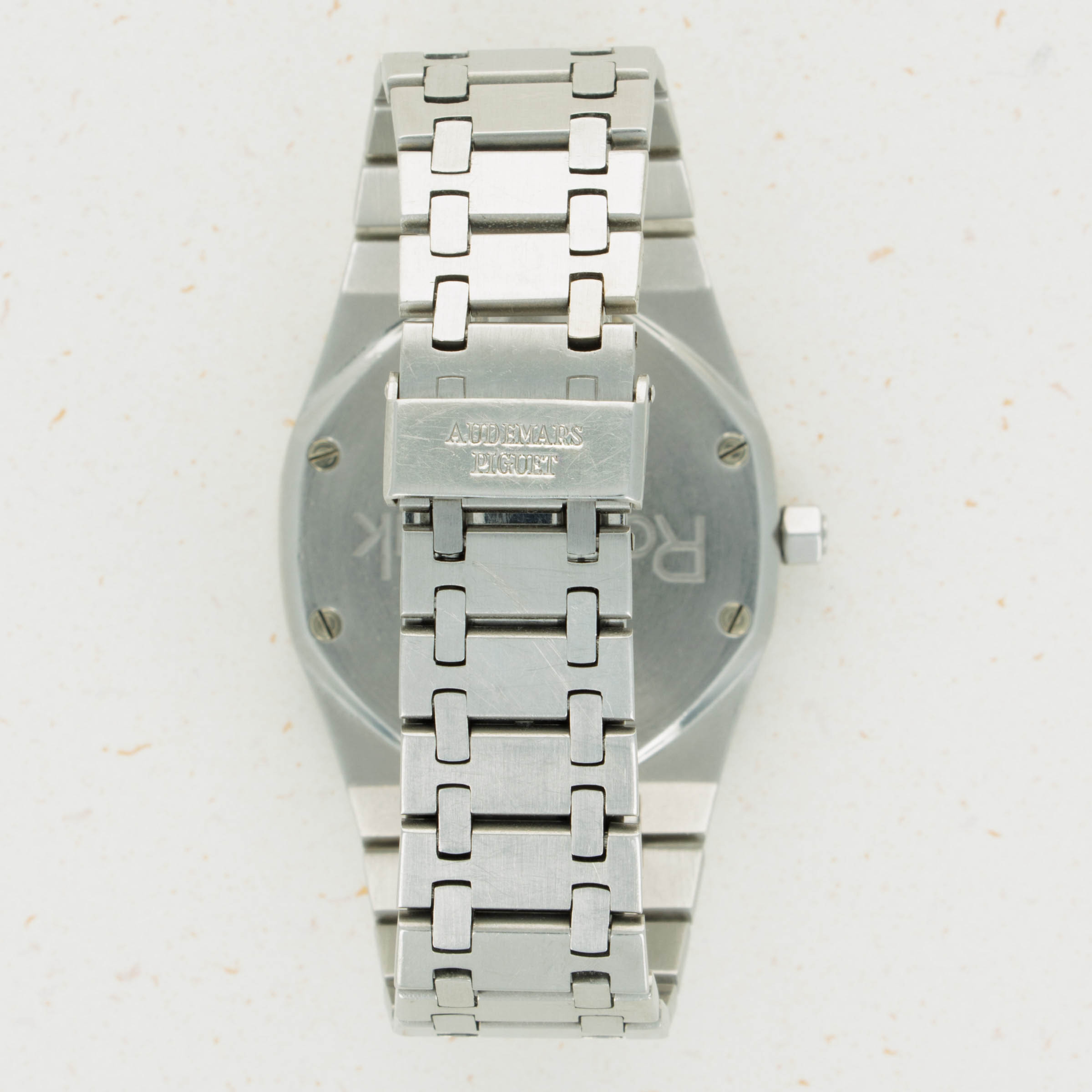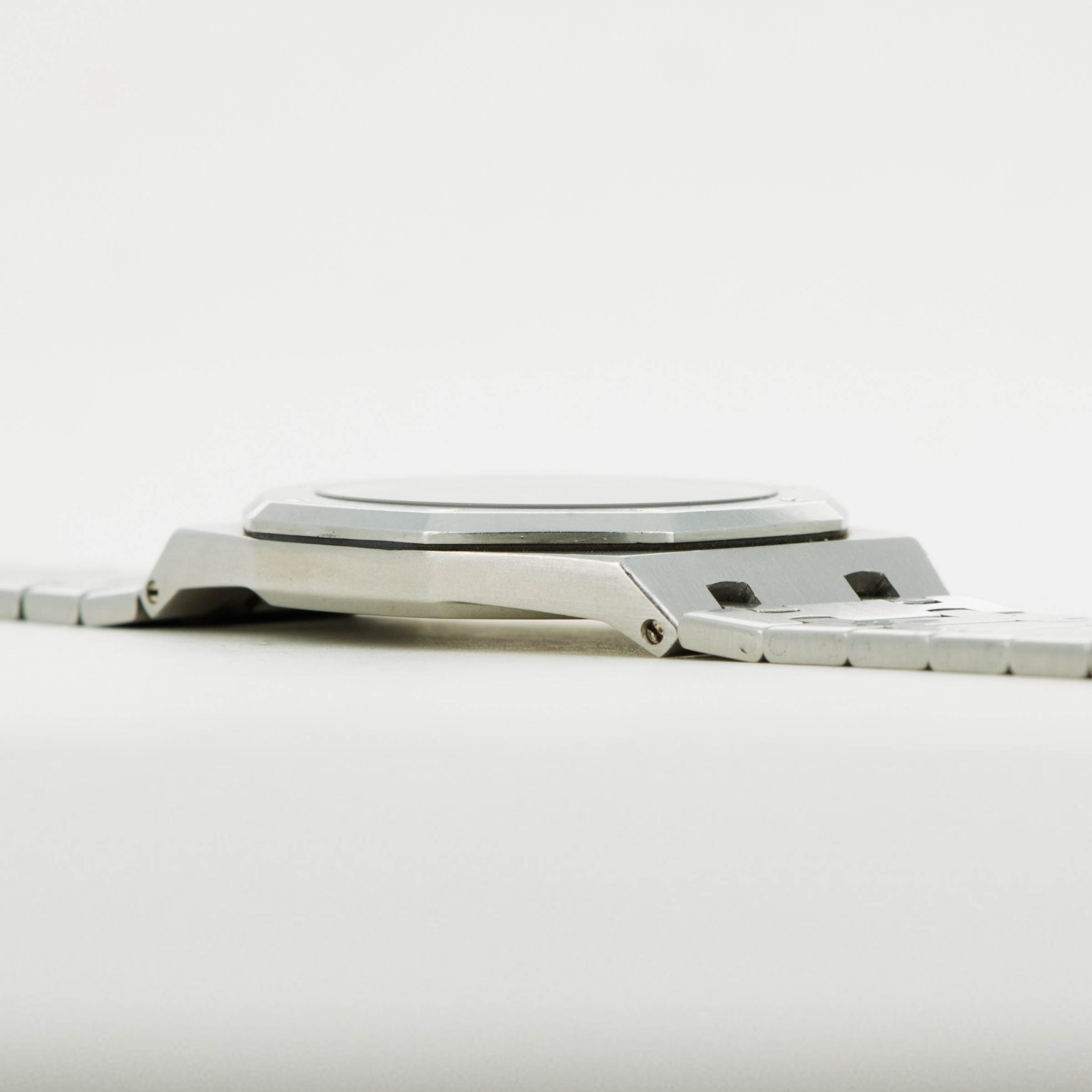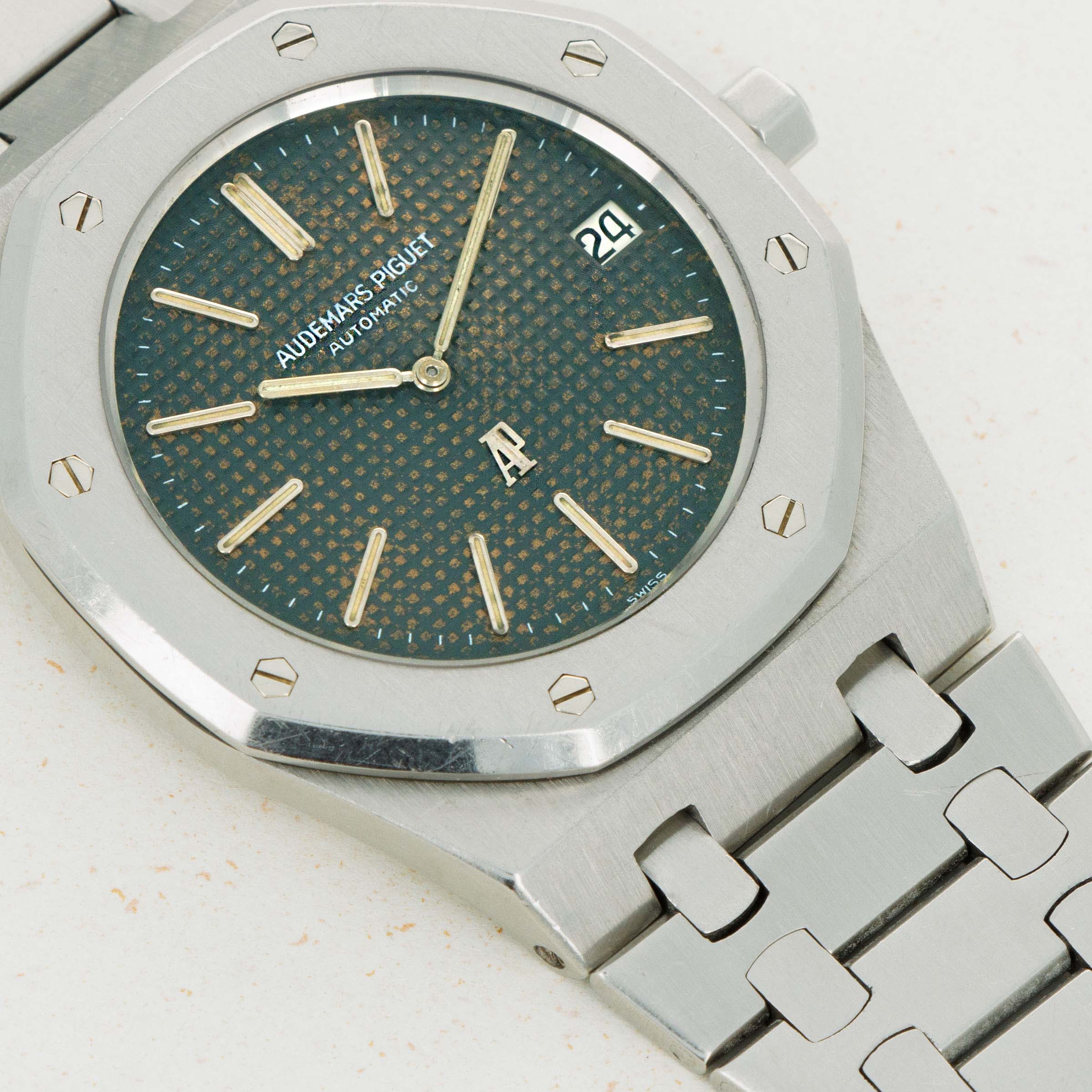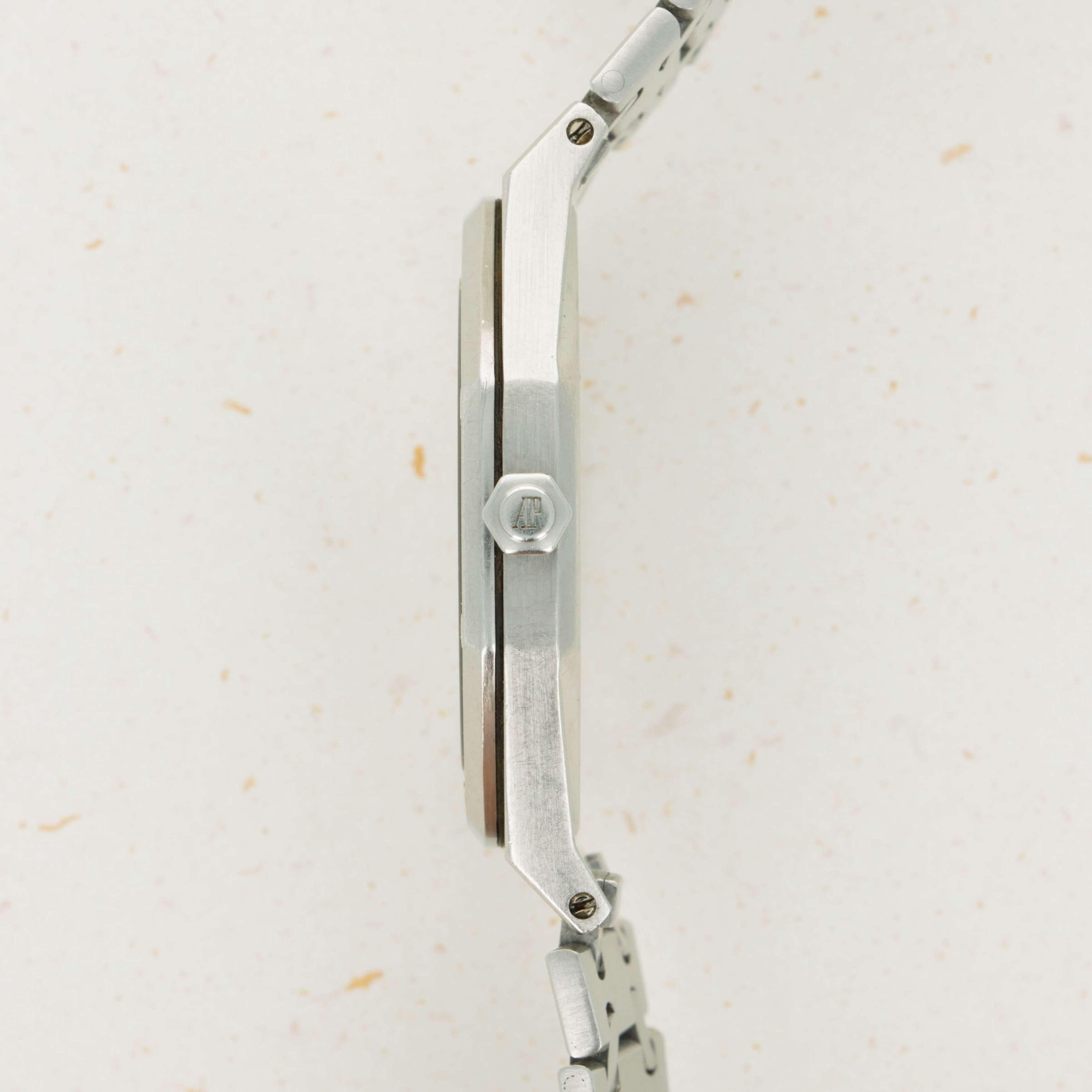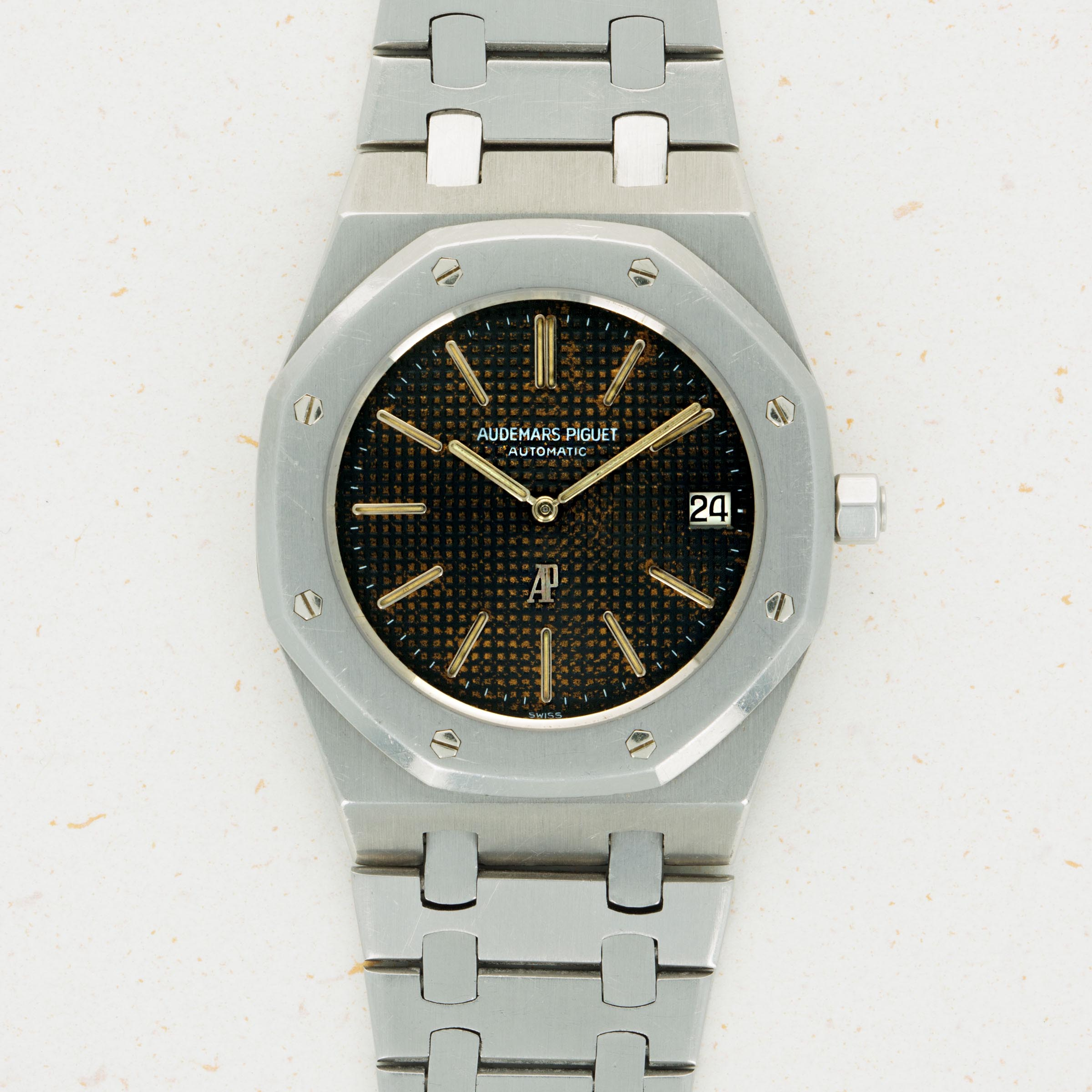 Released in 1972 and designed by Gerald Genta, watchmaking's most famous designer, the Audemars Piguet Royal Oak was the first stainless steel luxury sports watch ever to exist. Released as a tactic to survive the quartz crisis, the Royal Oak can single-handedly be thanked for AP's existence today due to its astounding success, albeit it wasn't an overnight hit. Its sizeable tonneau-shaped case, signature integrated bracelet, octagonal bezel, exposed screws, and steel construction failed to win over collectors until a few years later. Launched in 1972 as a limited series of 1000 pieces, the A-Series ref. 5402 was the first series of Royal Oak to be released. With its 39mm stainless steel case it was quickly nicknamed the “Jumbo” due to how much larger it was compared to other watches from the time. With its ‘Petite Tapisserie’ dial, the A-Series can be identified by the position of its AP logo at 6 o’clock. Today, the Royal Oak is one of the most highly-coveted timepieces in all horology as its previously dismissed design details have permeated across the industry and into watches like the Patek Philippe Nautilus, Vacheron Constantin Overseas, Rolex Oysterquartz, amongst many other legendary timepieces. Offered with a partially tropicalized dial, this example’s dial boasts a beautiful golden hue that matches and accentuates the creamy yellow patina of its iconic luminescent hour markers and hands.
