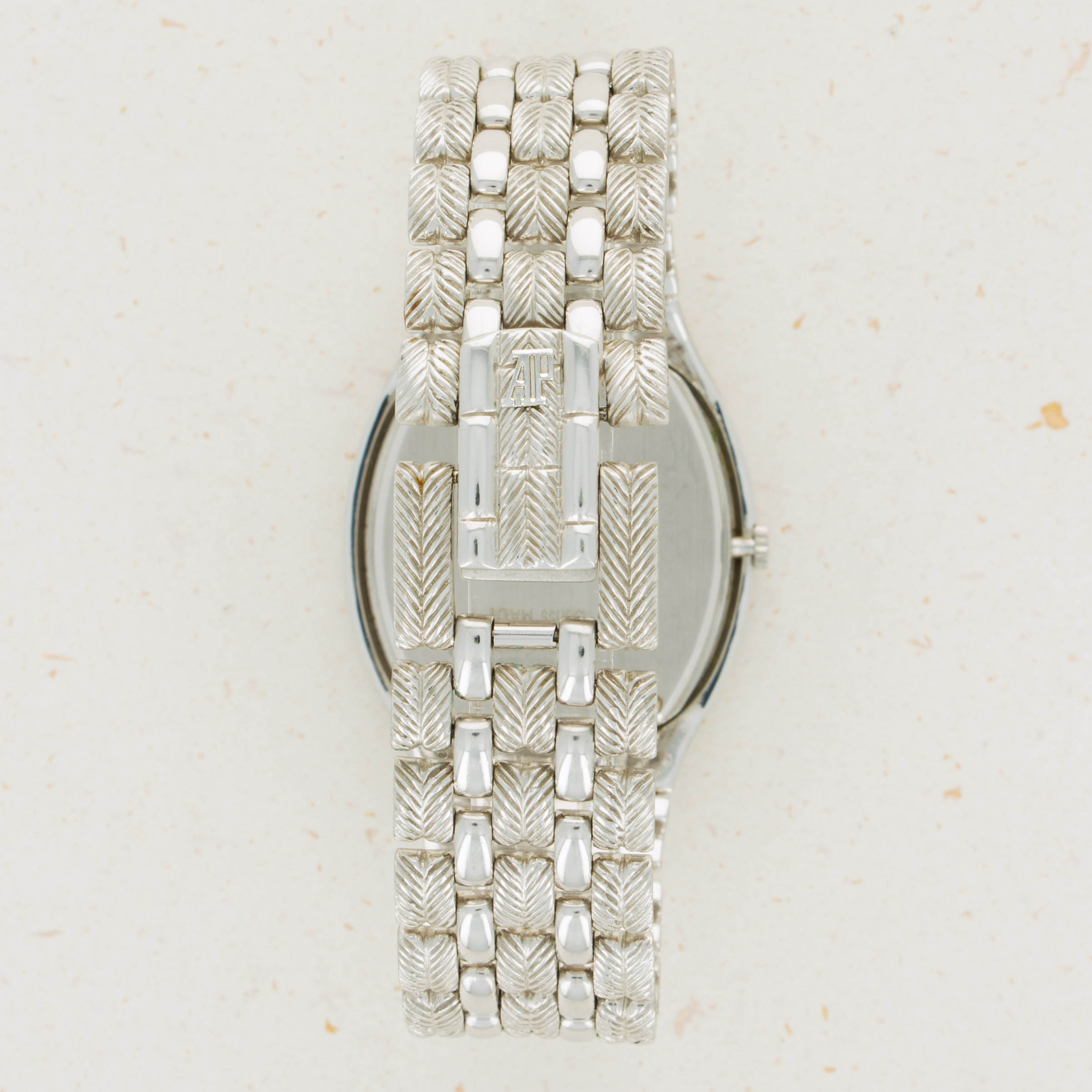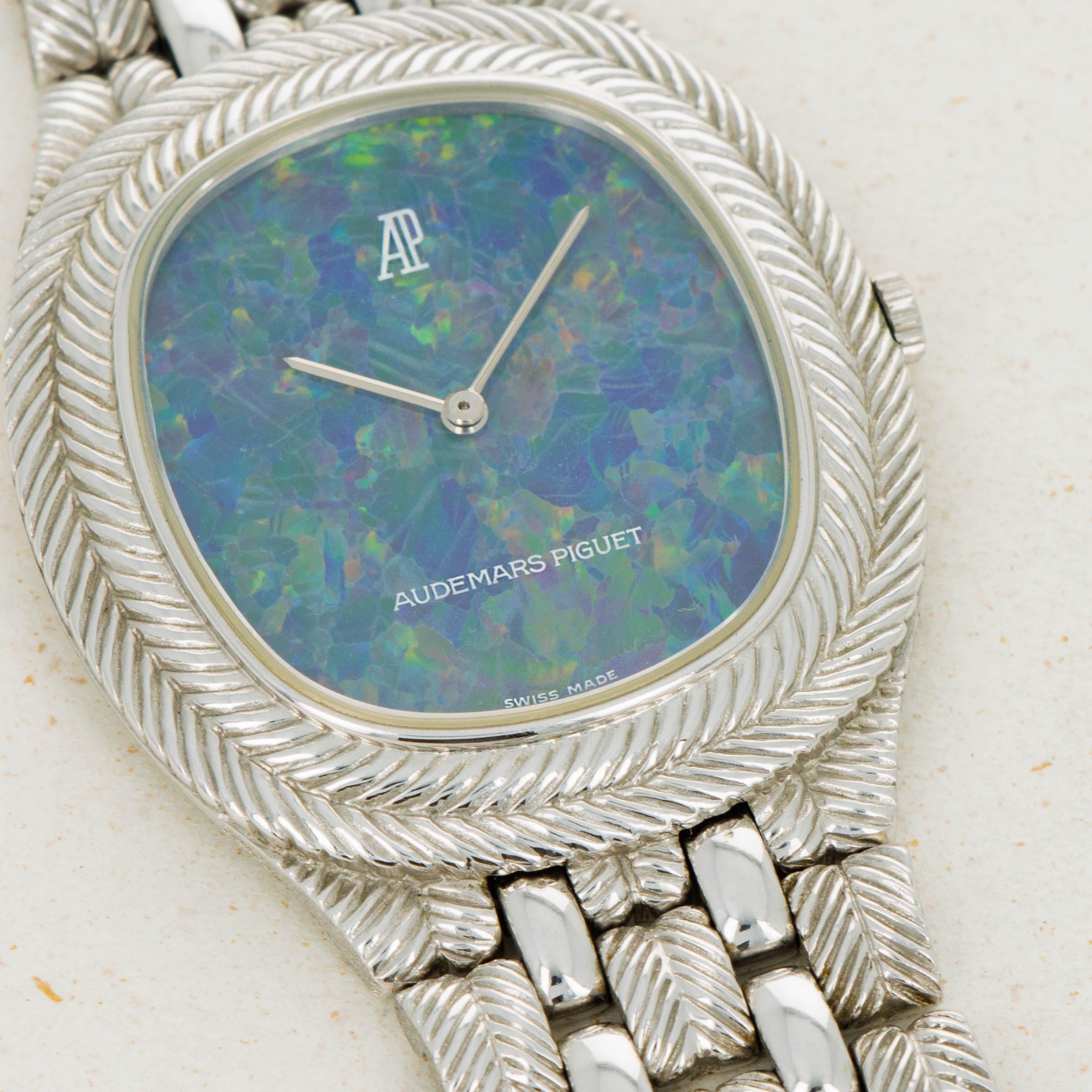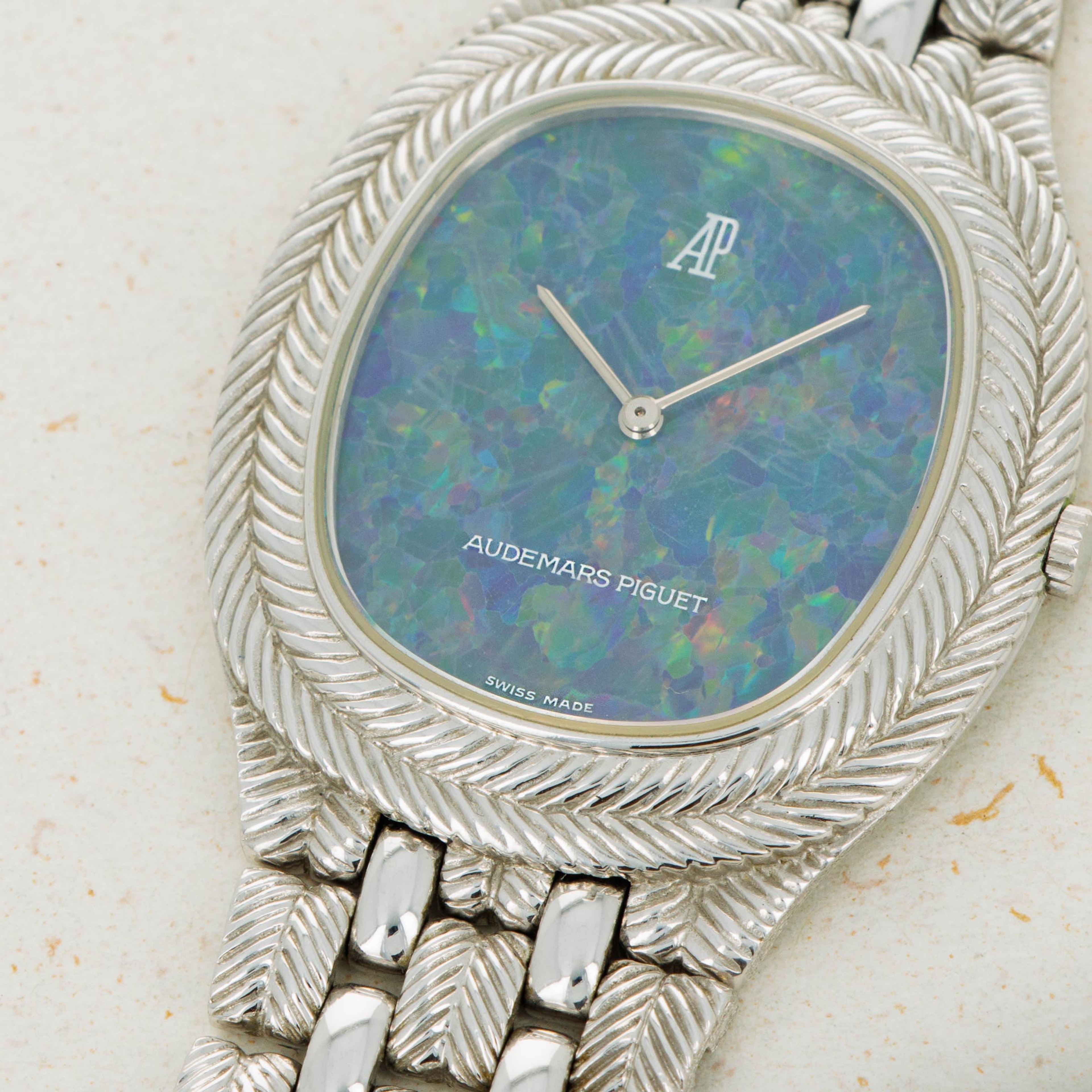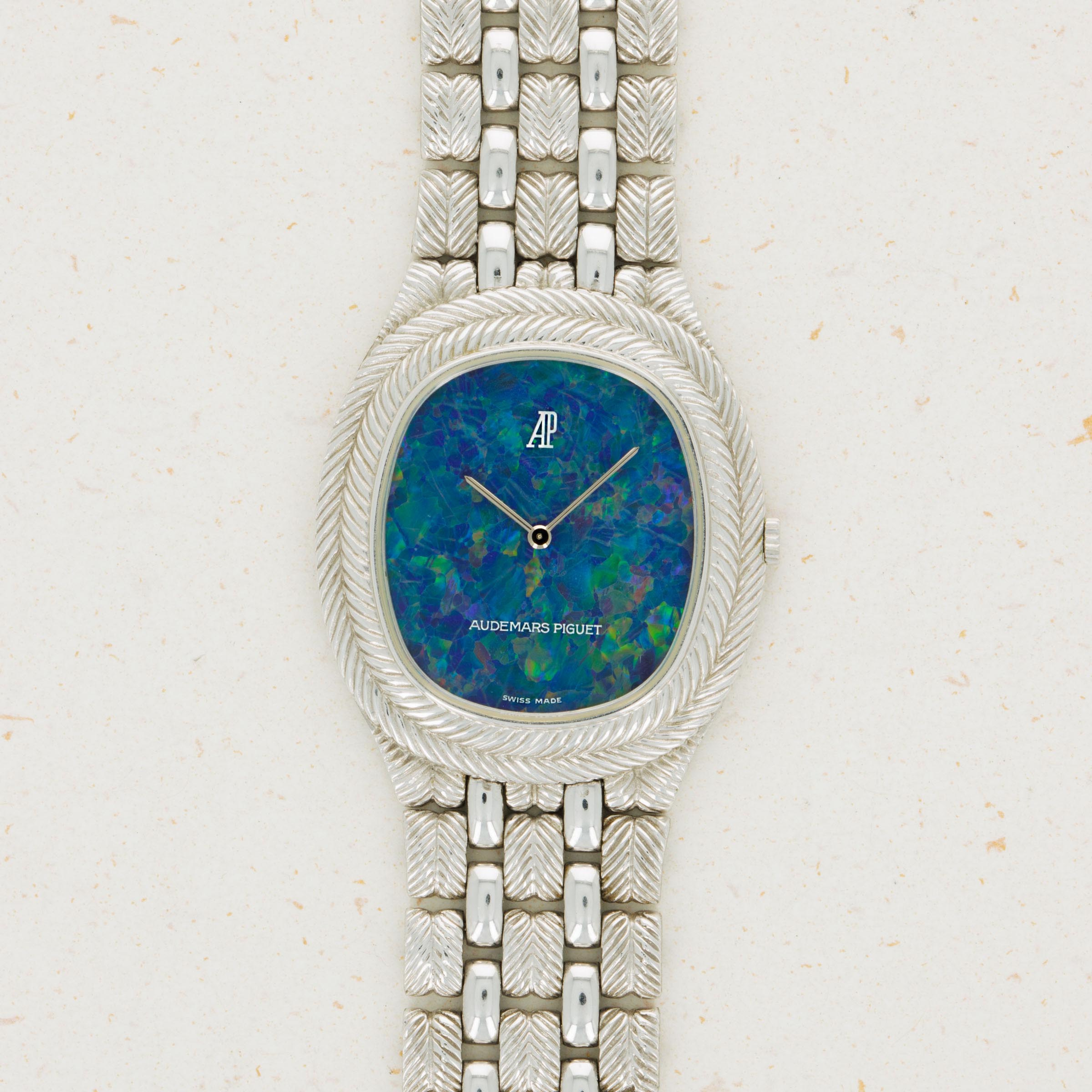 Famed for their embrace of avant-garde aesthetics, Audemars Piguet’s design language has become known for how clearly it breaks away from the typically reserved designs of its fellow watchmakers. Offered here as the embodiment of that idea is an 18kt white gold timepiece that features a braided rope-style bezel whose texture is continued along and through its integrated bracelet and around the watch. Contrasting this heavy texture is the timepiece’s polished surfaces that flow down two of its bracelet links, which reflect the juxtaposition of this example’s bright 18kt white gold construction with its incredible stone dial. A vivid array of blues, greens, reds and oranges, this example’s opal display brightly contrasts 18kt white gold’s simplicity, much in the same way that the timepiece’s own construction makes an understated metal appear much more complex than a lot of watchmakers would make it. An interesting blend of colors and textures, this timepiece champion’s AP’s artistic creativity and their craftmanship alike to stunning effect.