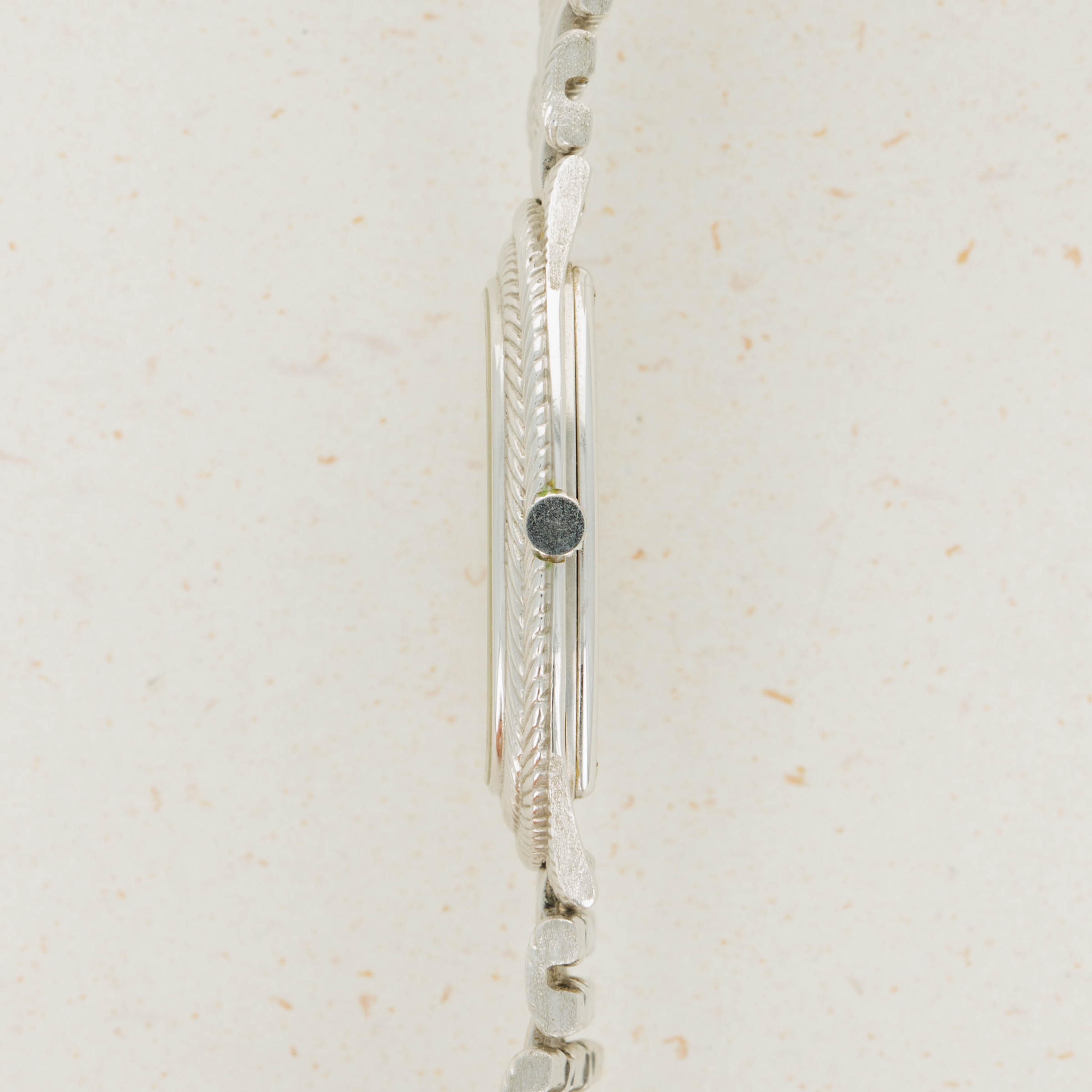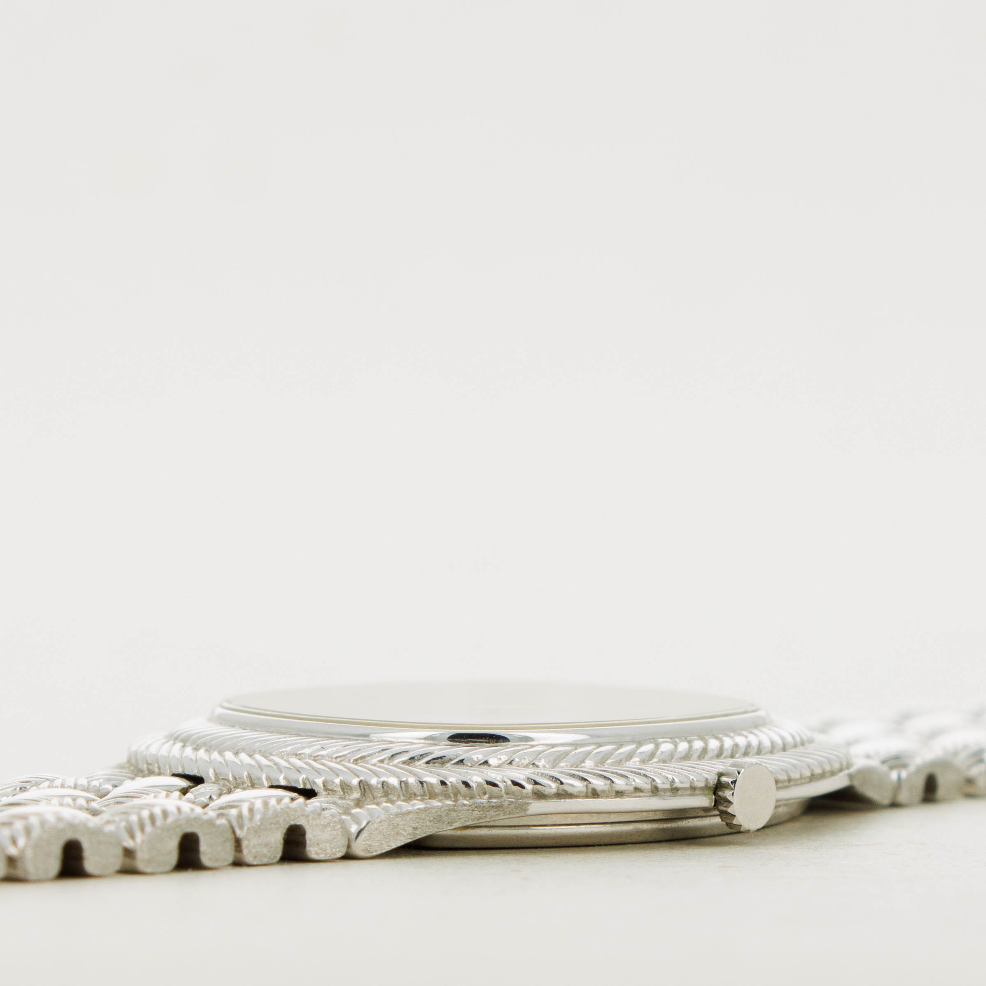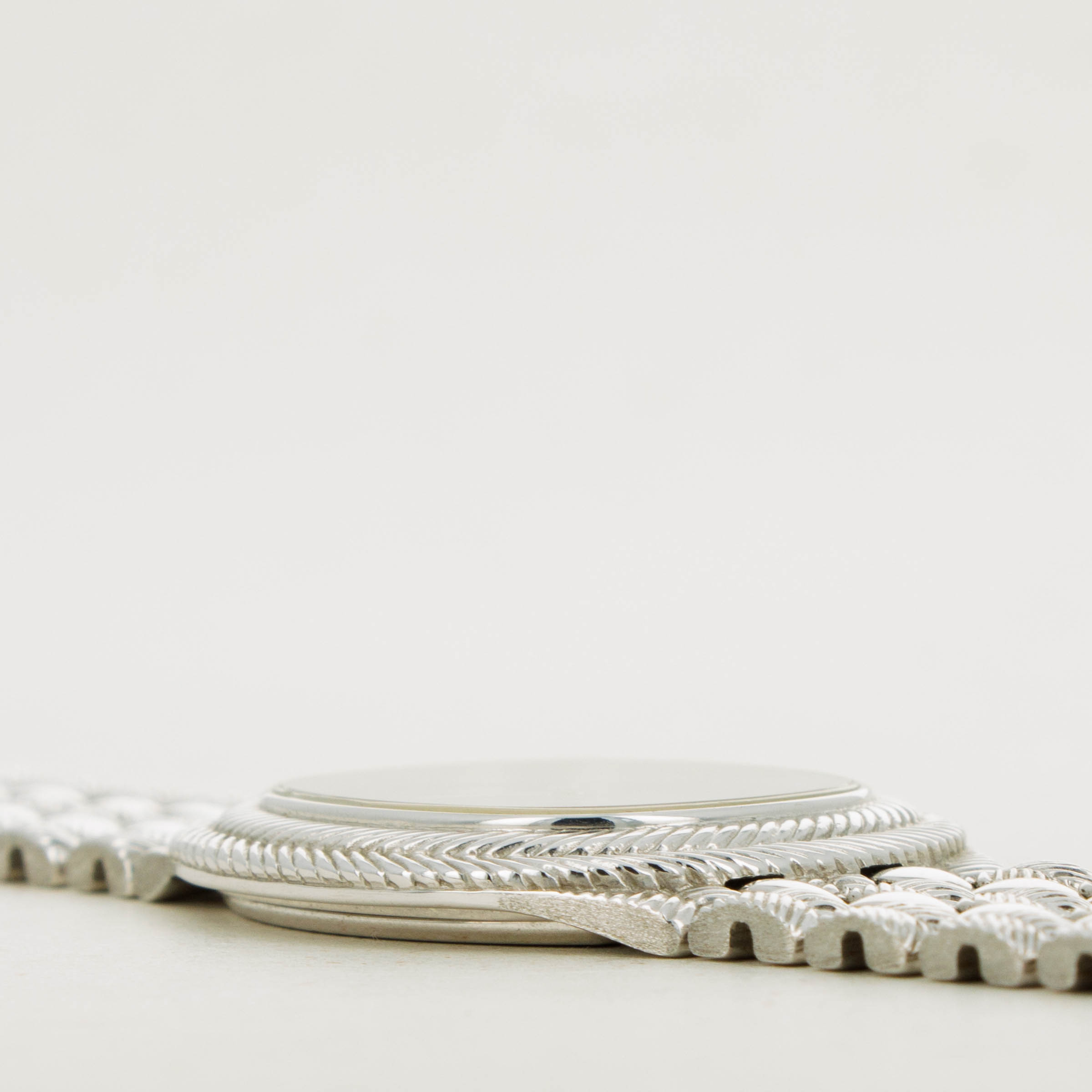 Boasting an elaborate 18kt white gold construction, this timepiece features a braided-style bezel and bracelet whose texture gives this watch an entirely unique presence on the wrist as the light bounces off its case and dial.