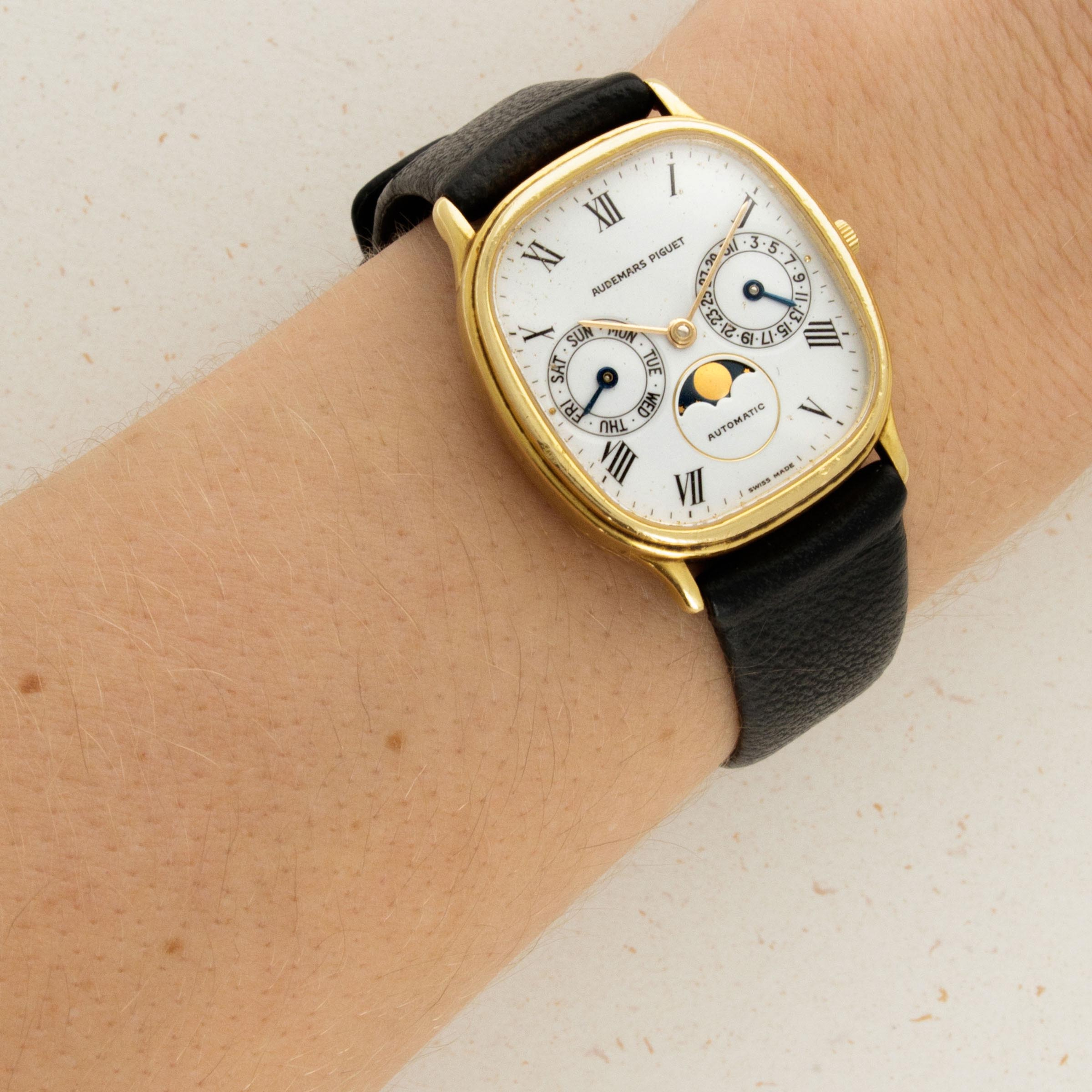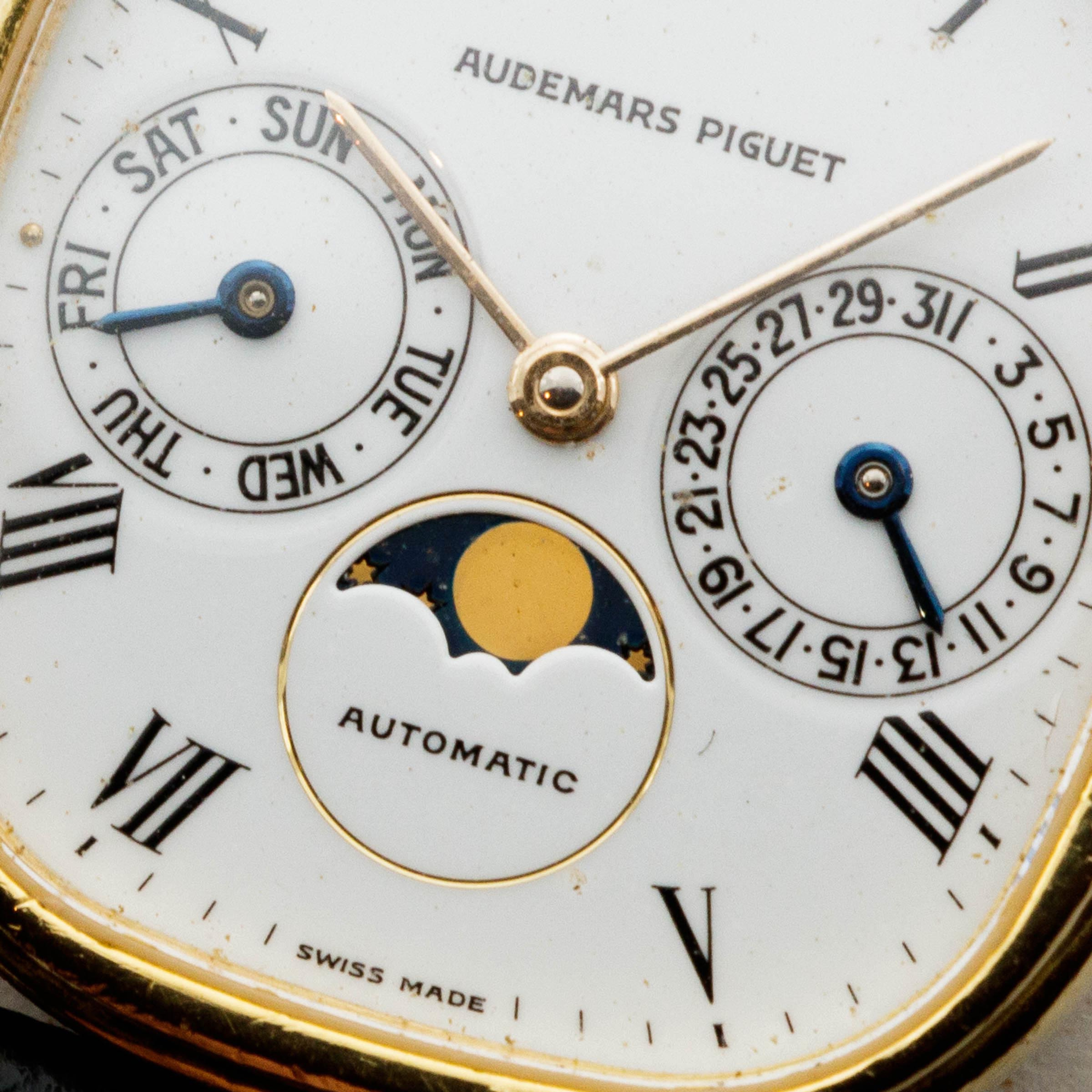 Speaking to Audemars Piguet's classical aesthetic before the Royal Oak began to dominate AP’s identity, this stunning Day-Date Moonphase stands as a beautiful piece of vintage watchmaking. With classical detailing in abundance, its thin rectangular 18kt yellow gold case features softened corners and gentle lugs that allow this wonderful piece to fill the wrist with a presence that few vintage watches care to emulate. Featuring a white dial, this watch remains entirely understated with black Roman numerals, vintage AP branding and inscriptions, and a clean symmetrical dial with blued steel day and date subdial hands and yellow gold hands for the hours and minutes that combine with the colorful moon phase indicator to serve as playful pops of color on what would otherwise be an entirely monochromatic piece of design. A wonderful watch, this timepiece is an excellent reminder of AP’s roots as a traditional watchmaker who are filled with a rich history and proud sense of tradition and craftsmanship.