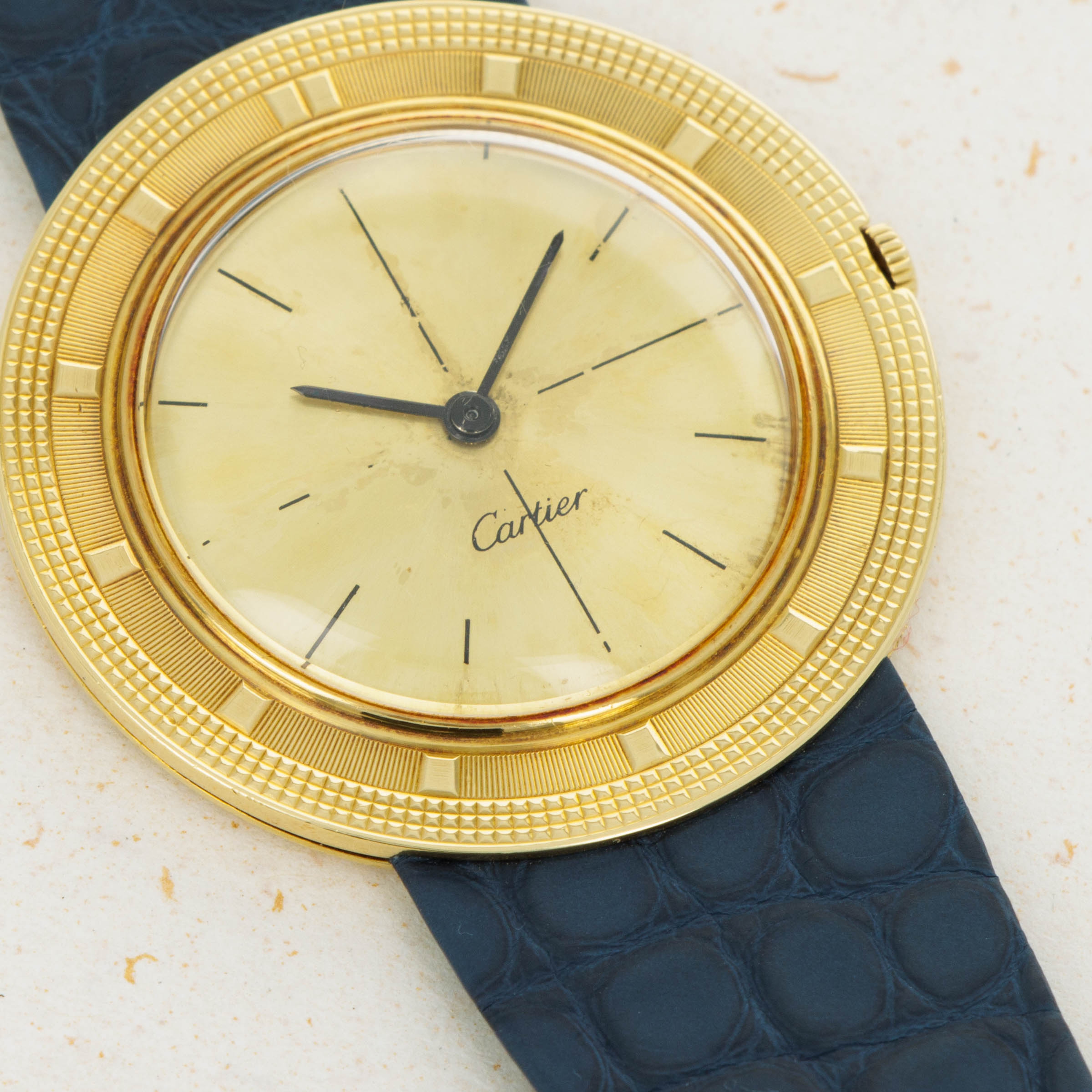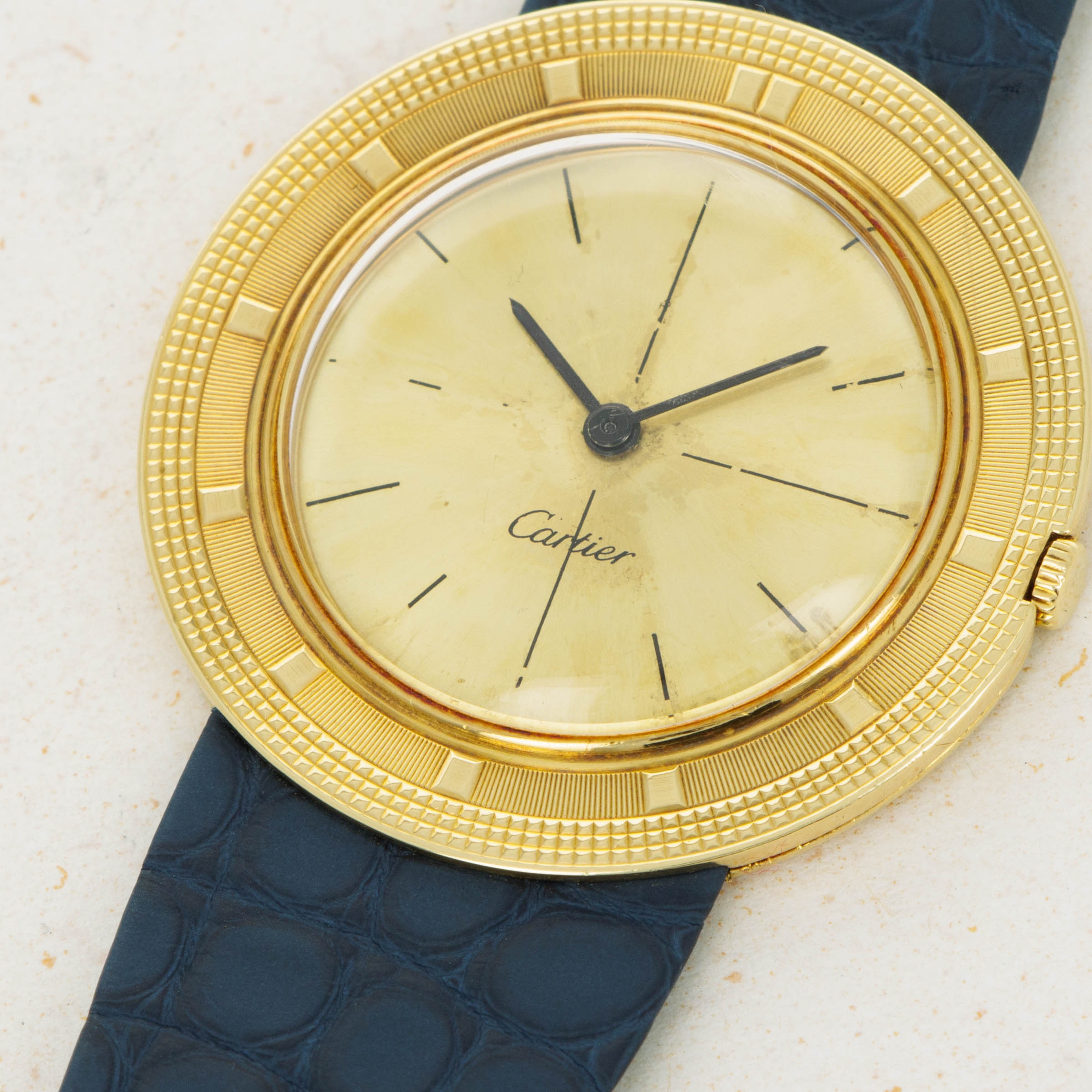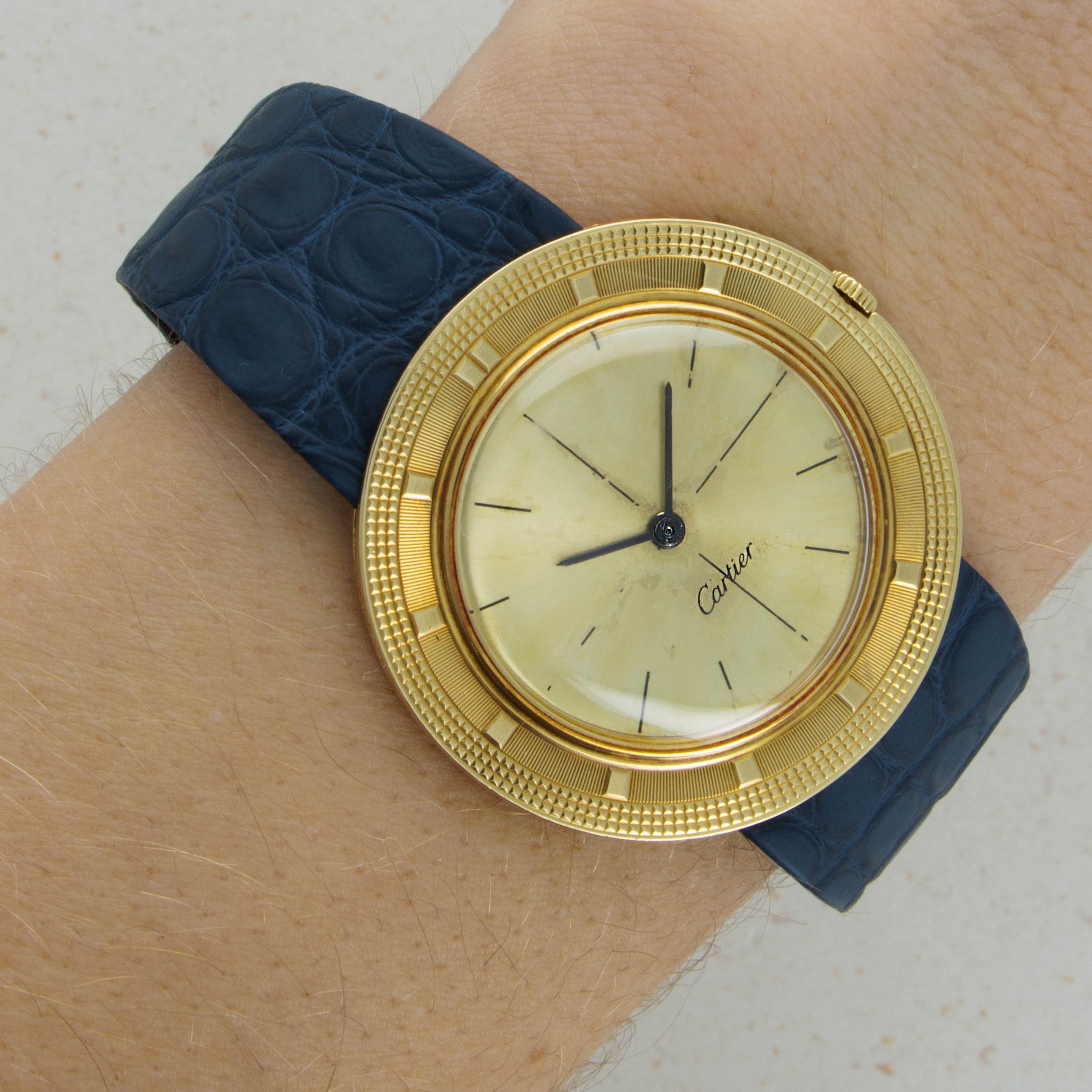 While the Disco Volante's multi-textural bezel is easily its most distinctive feature, this example's pièce de résistance is its Cartier-signed champagne sector dial, an extremely rare inclusion in vintage Audemars Piguet watches.