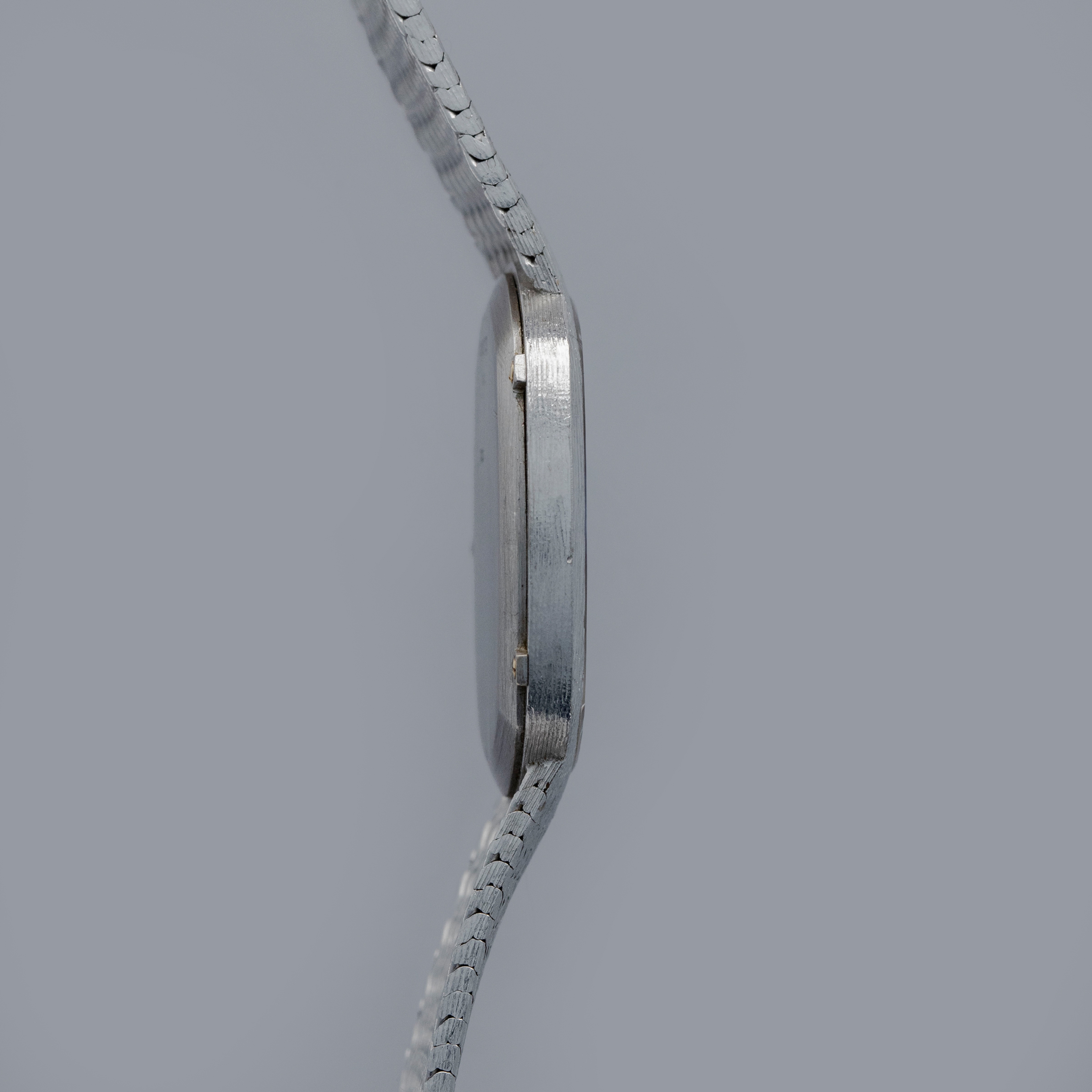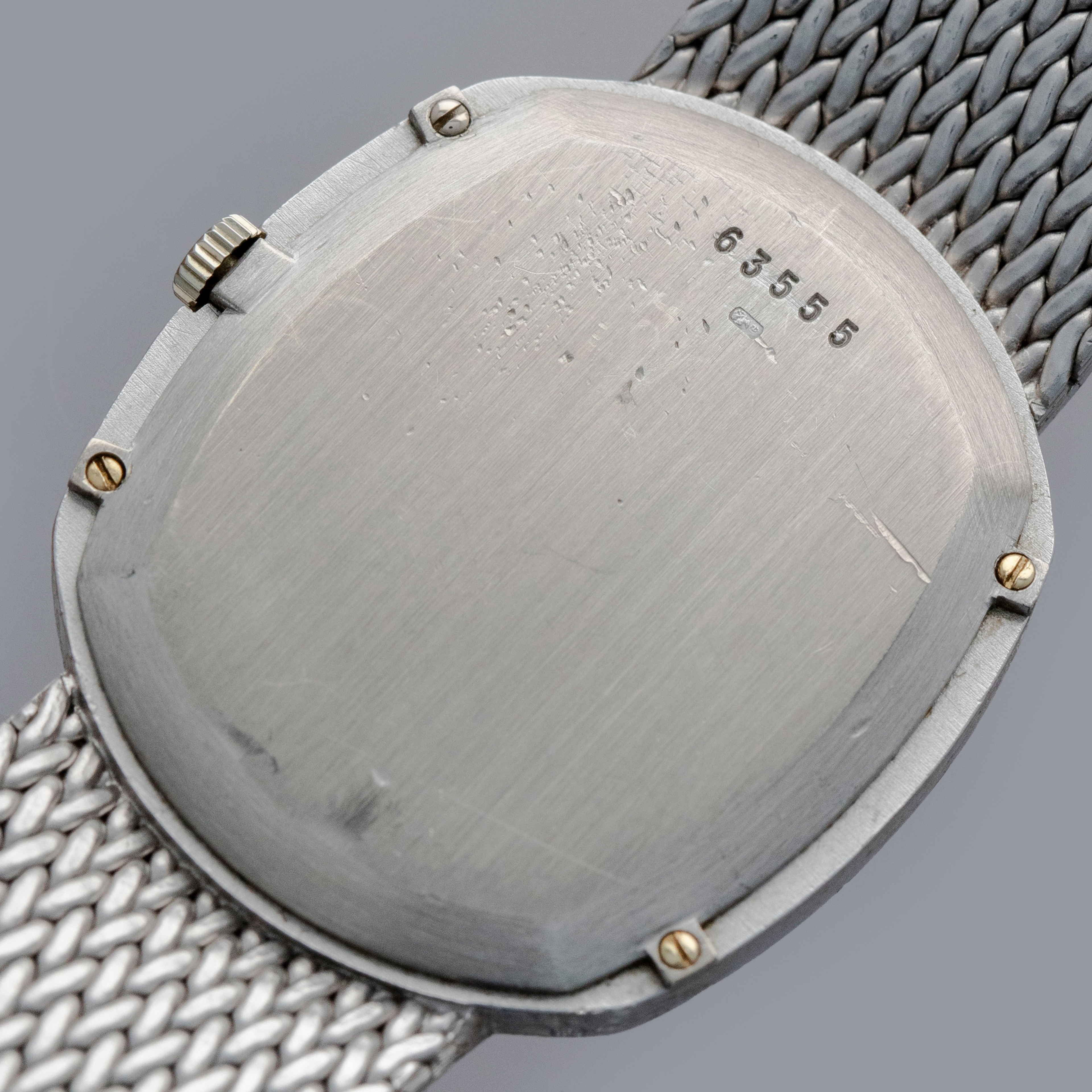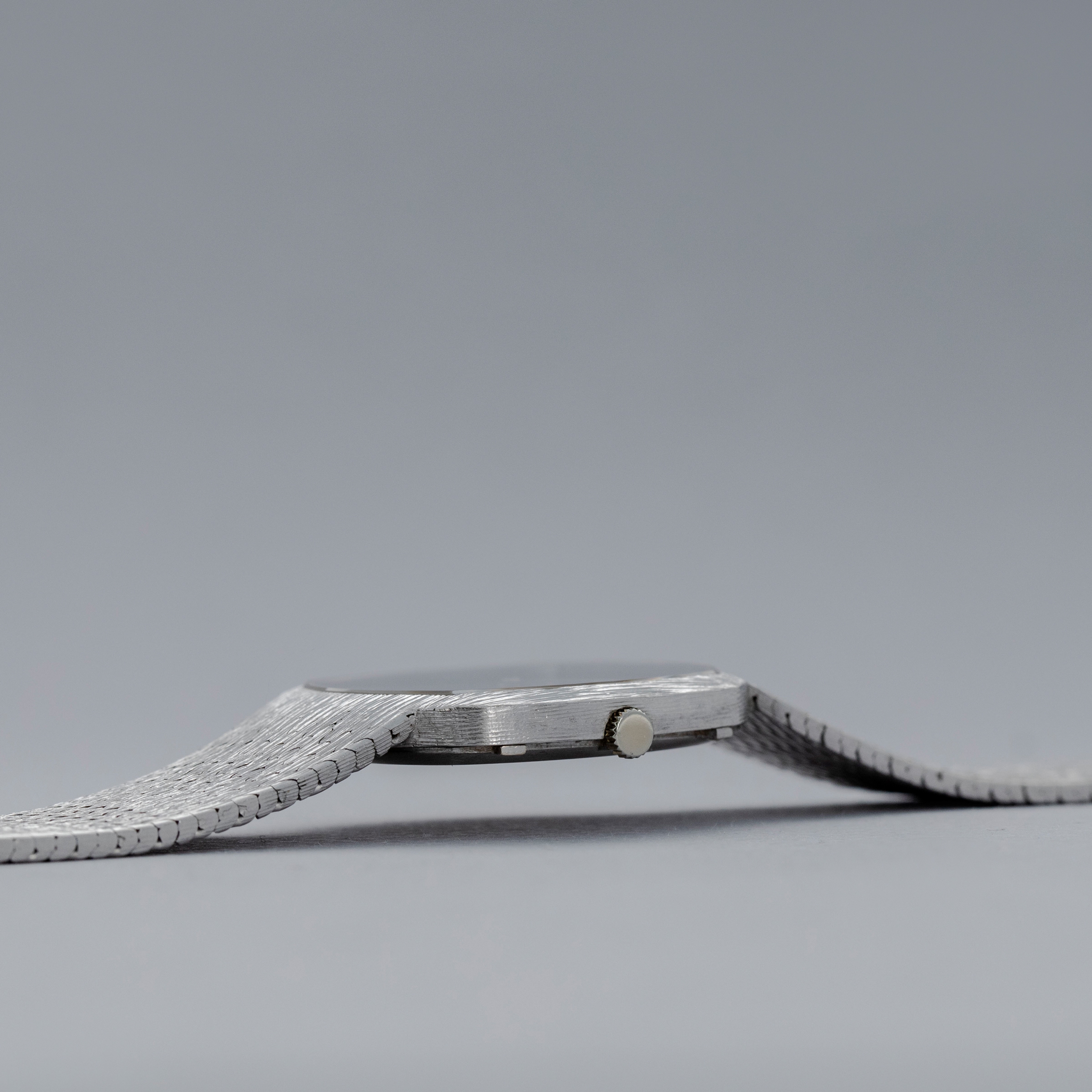 The watch is in overall excellent condition. The textured white gold case with integrated bracelet shows only minor signs of surface wear. The case back has some scratches and marks but retains a well-defined stamp and hallmark. The original lapis lazuli dial is in excellent condition, with no visible hairline cracks on the dial surface. The white gold hands are clean. The bracelet currently fits a 7 1/4” wrist.
