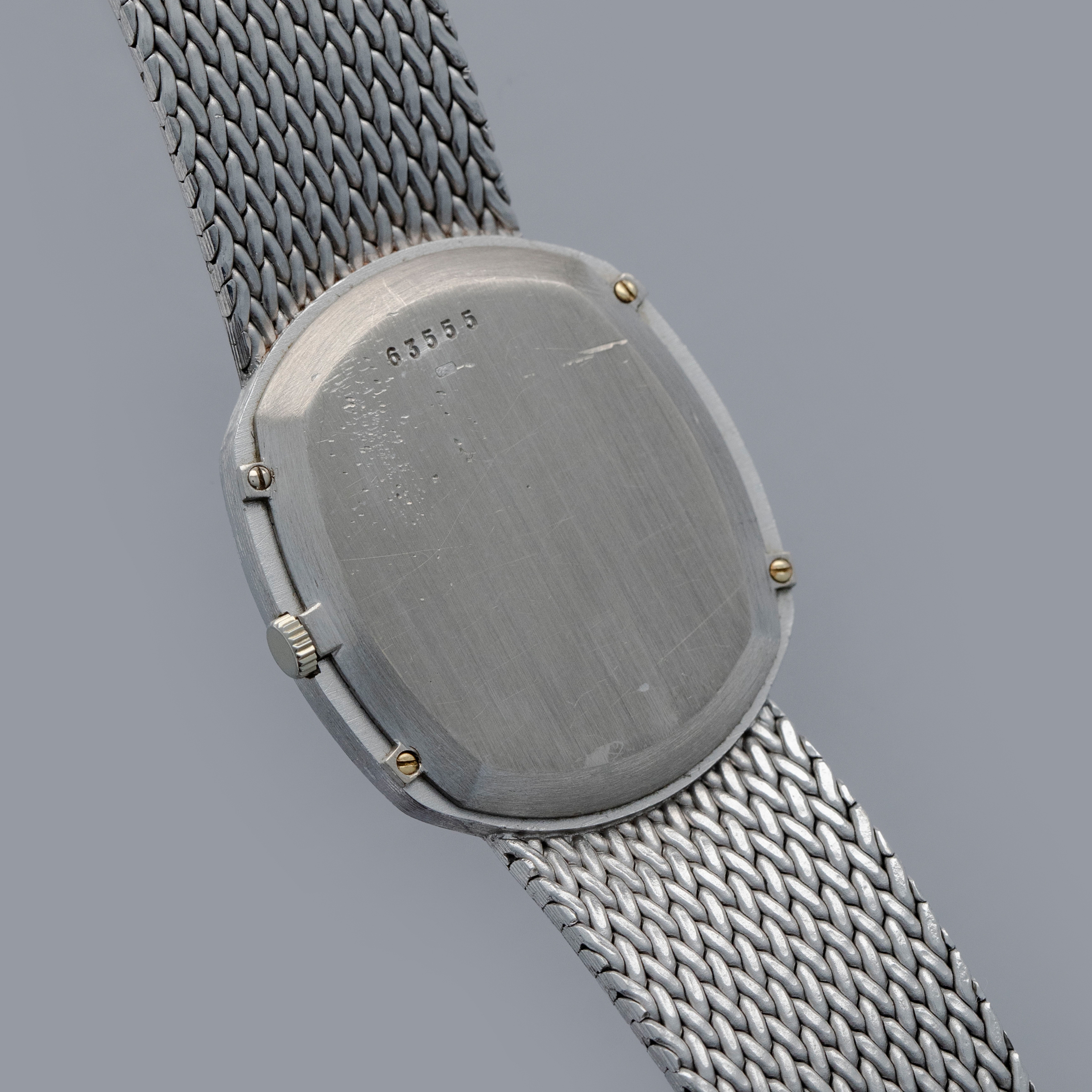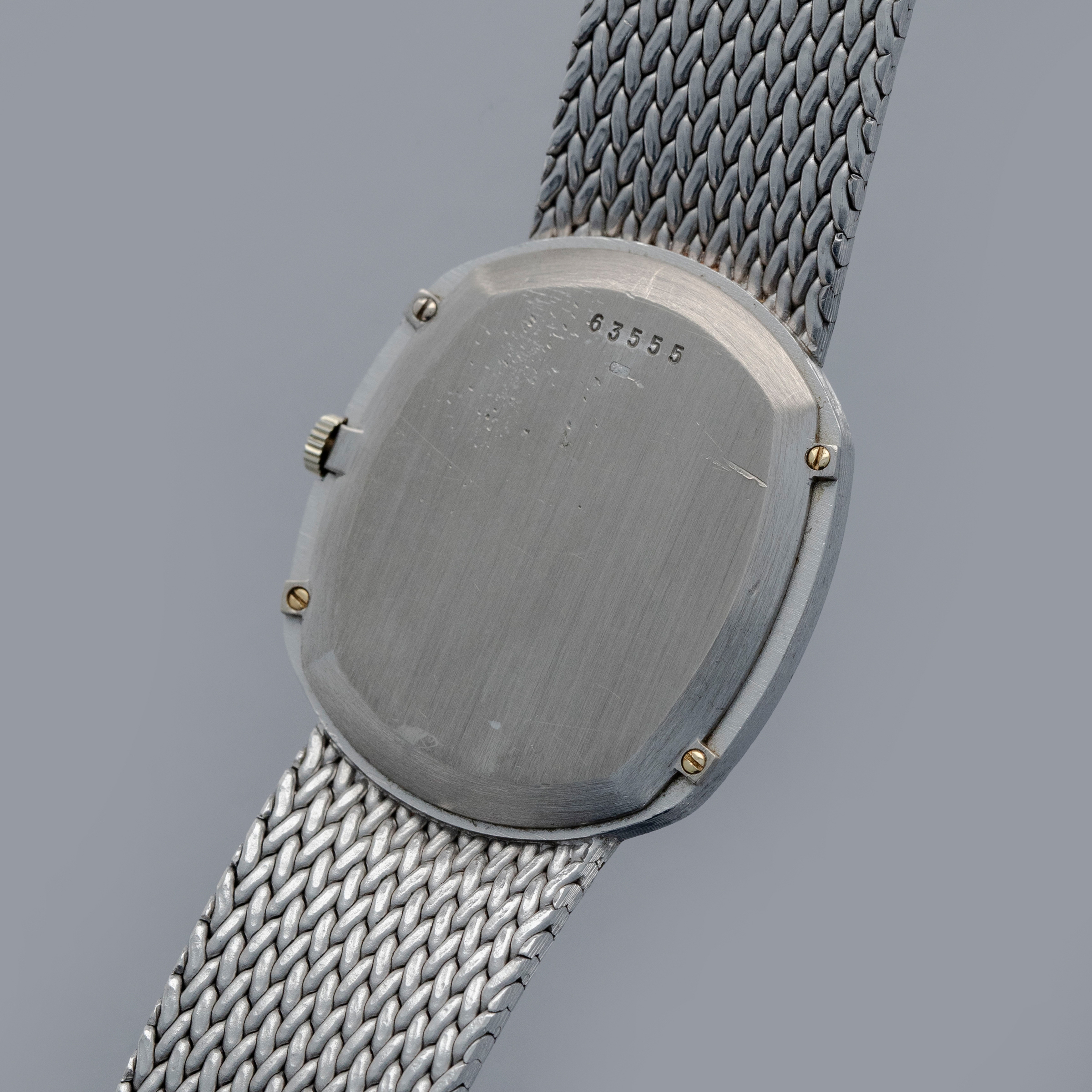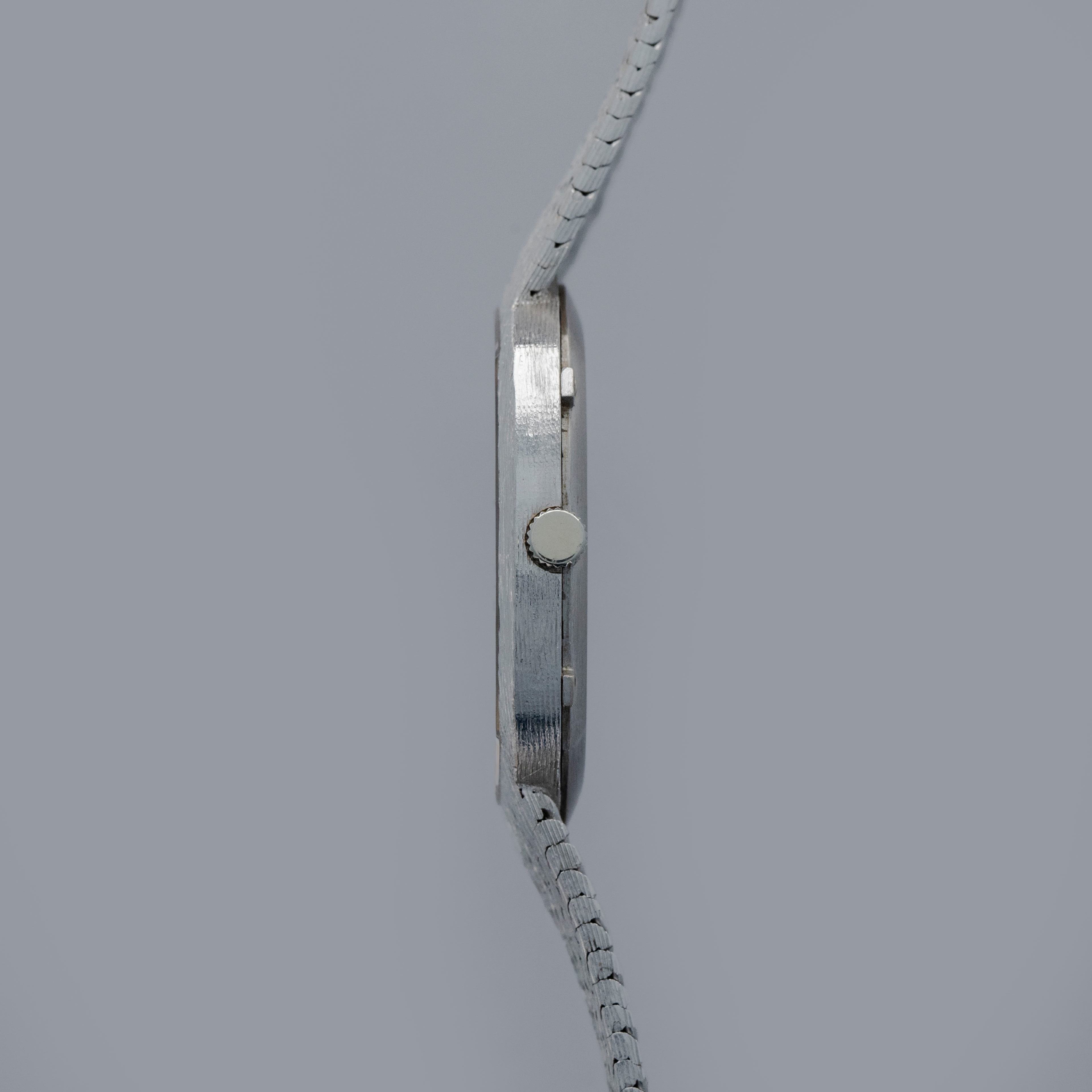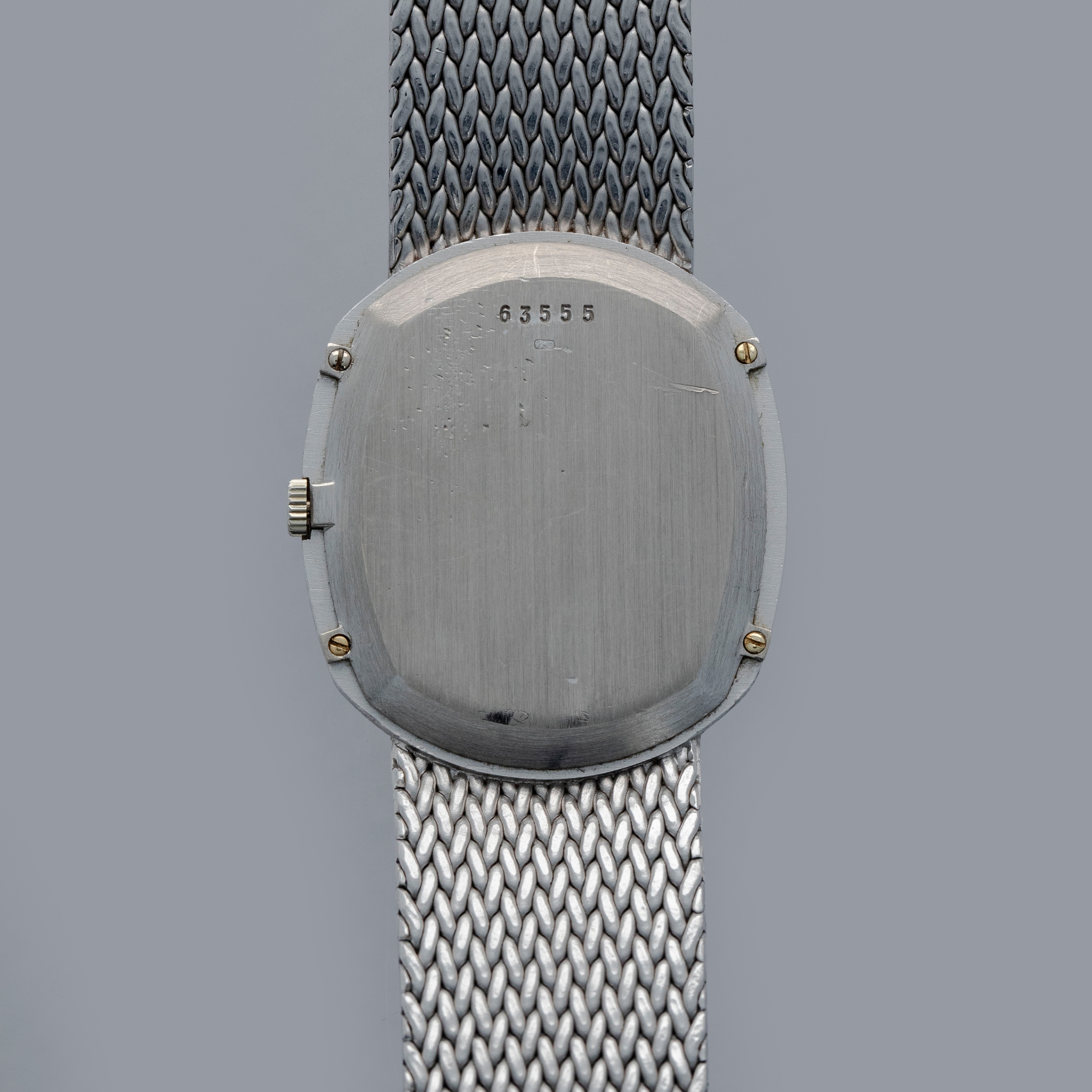 The watch is in overall excellent condition. The textured white gold case with integrated bracelet shows only minor signs of surface wear. The case back has some scratches and marks but retains a well-defined stamp and hallmark. The original lapis lazuli dial is in excellent condition, with no visible hairline cracks on the dial surface. The white gold hands are clean. The bracelet currently fits a 7 1/4” wrist.