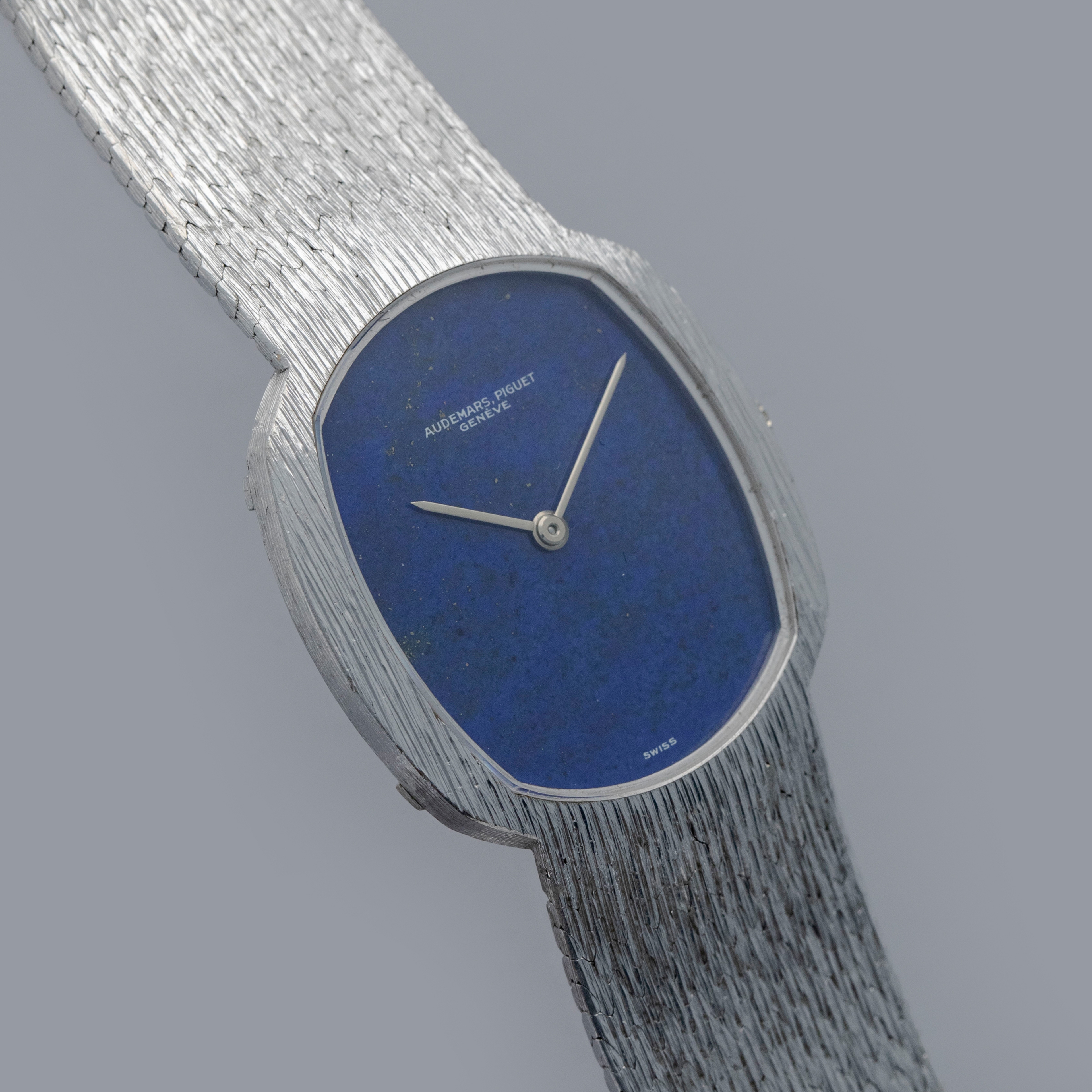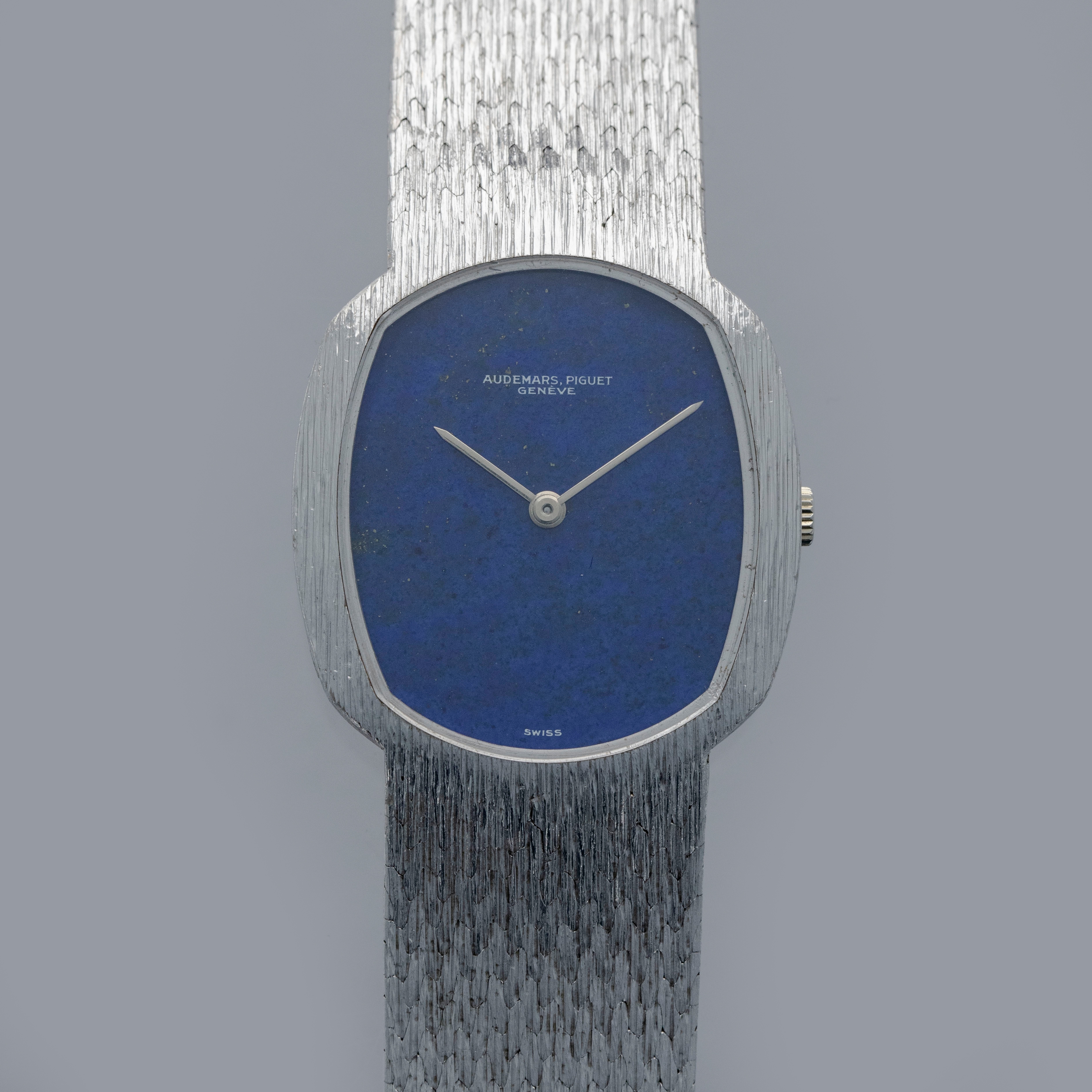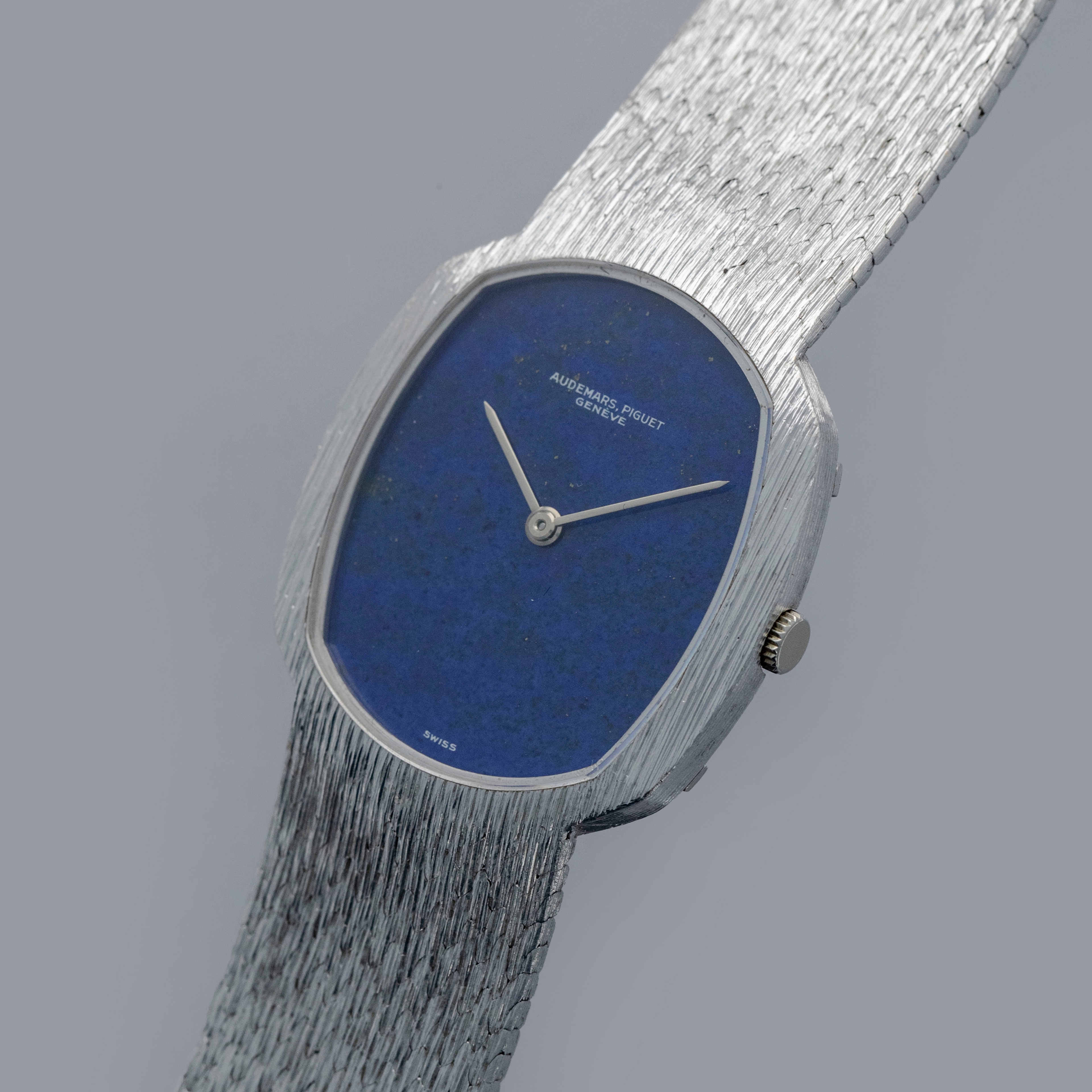 Famed for their embrace of avant-garde aesthetics, Audemars Piguet’s design language has become known for how clearly it breaks away from the typically reserved designs of its fellow watchmakers. Offered here as the embodiment of that idea is an 18kt white gold timepiece that features a vertical brushed bezel whose texture is continued along and through its tightly woven 18kt white gold integrated bracelet that effectively hides the bracelet’s links, making it seem like one continuous piece of metal. Contrasting this bright abundance of white gold is this timepiece’s gorgeous blue lapis lazuli dial. Featuring very few inclusions, this example’s dial is absolutely pristine with only gentle golden spotting evenly dispersed throughout, with AP's signature at 12 o'clock standing as the only thing found on this display. An interesting blend of colors and textures, this timepiece champions AP’s artistic creativity and their craftmanship alike to stunning effect.