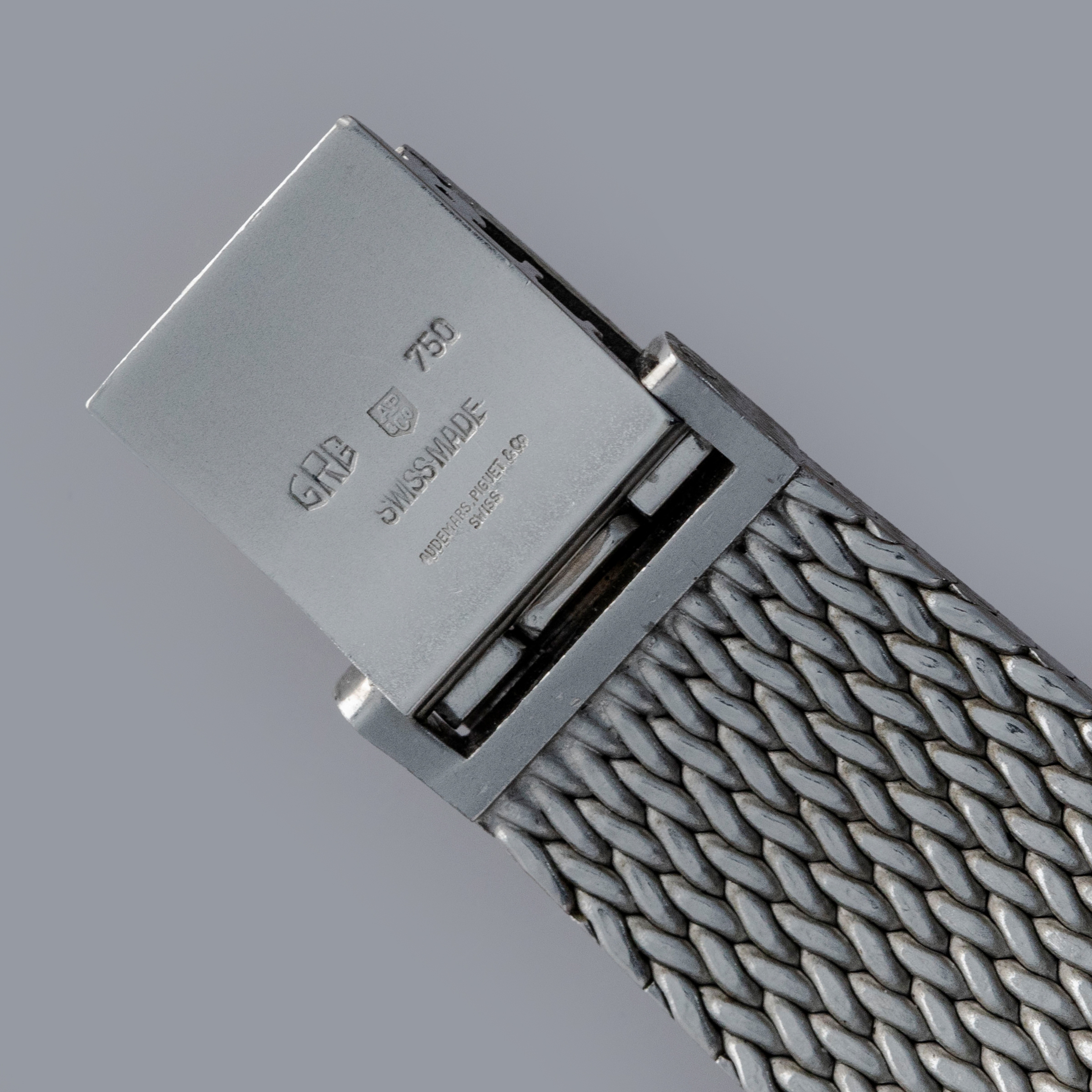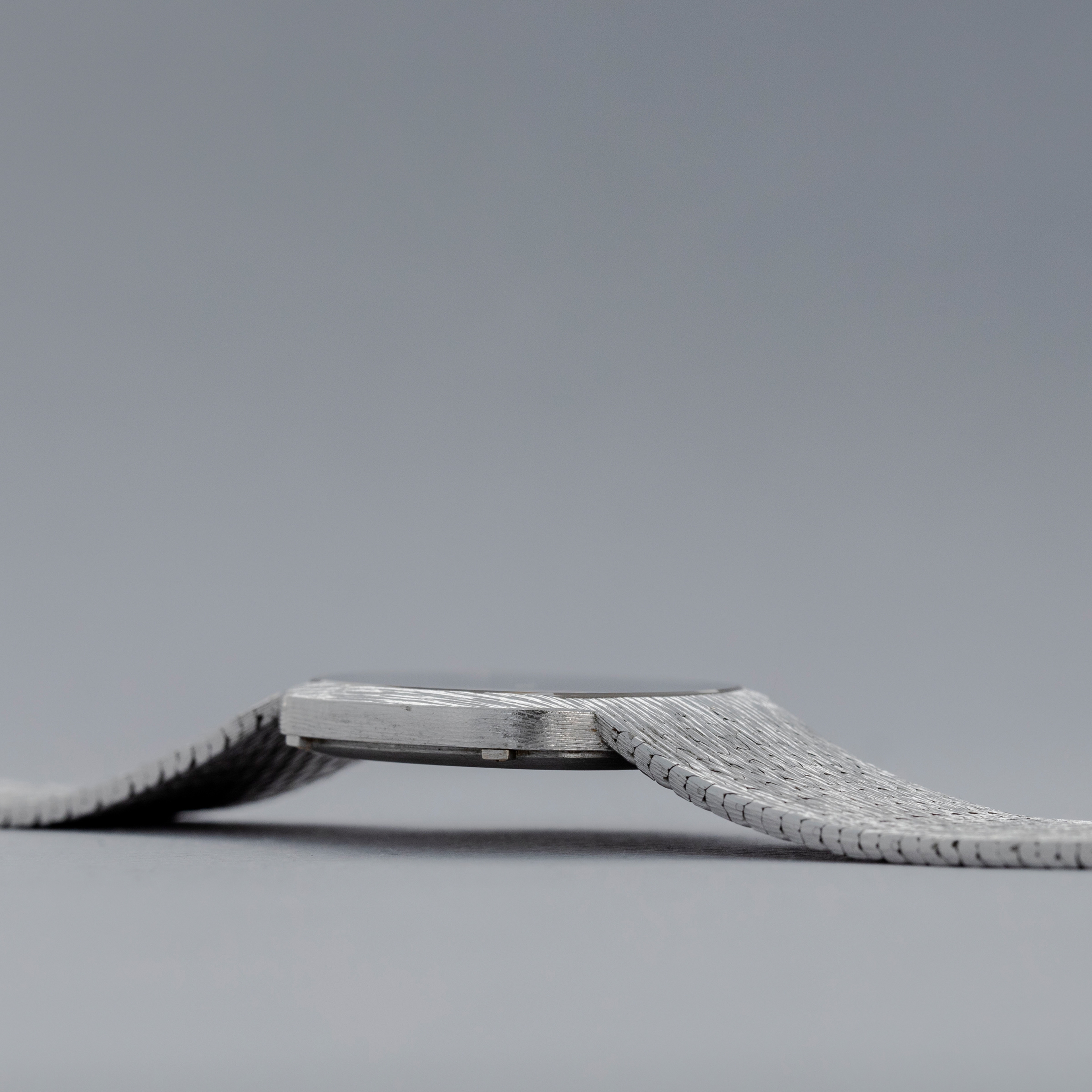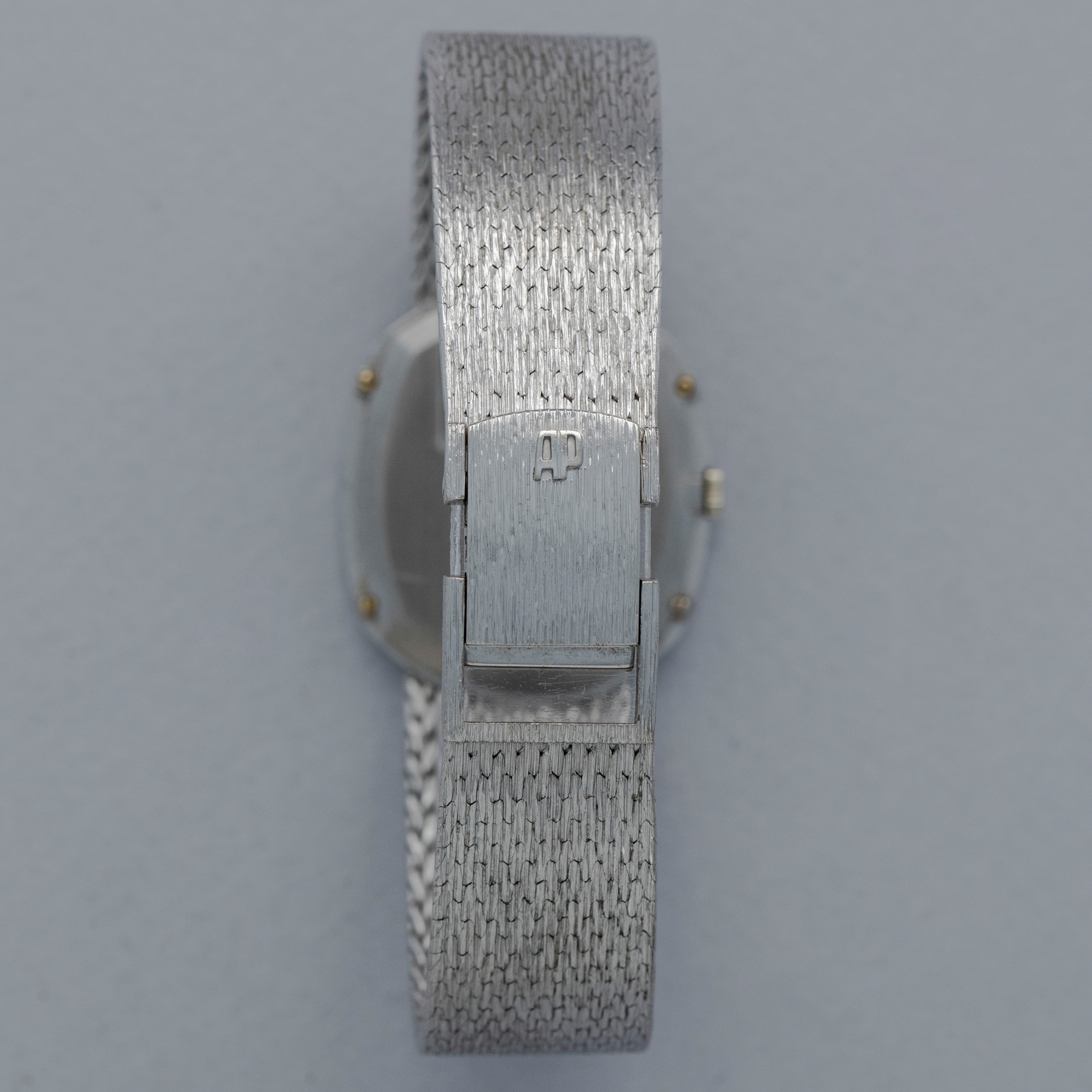 Famed for their embrace of avant-garde aesthetics, Audemars Piguet’s design language has become known for how clearly it breaks away from the typically reserved designs of its fellow watchmakers. Offered here as the embodiment of that idea is an 18kt white gold timepiece that features a vertical brushed bezel whose texture is continued along and through its tightly woven 18kt white gold integrated bracelet that effectively hides the bracelet’s links, making it seem like one continuous piece of metal. Contrasting this bright abundance of white gold is this timepiece’s gorgeous blue lapis lazuli dial. Featuring very few inclusions, this example’s dial is absolutely pristine with only gentle golden spotting evenly dispersed throughout, with AP's signature at 12 o'clock standing as the only thing found on this display. An interesting blend of colors and textures, this timepiece champions AP’s artistic creativity and their craftmanship alike to stunning effect.