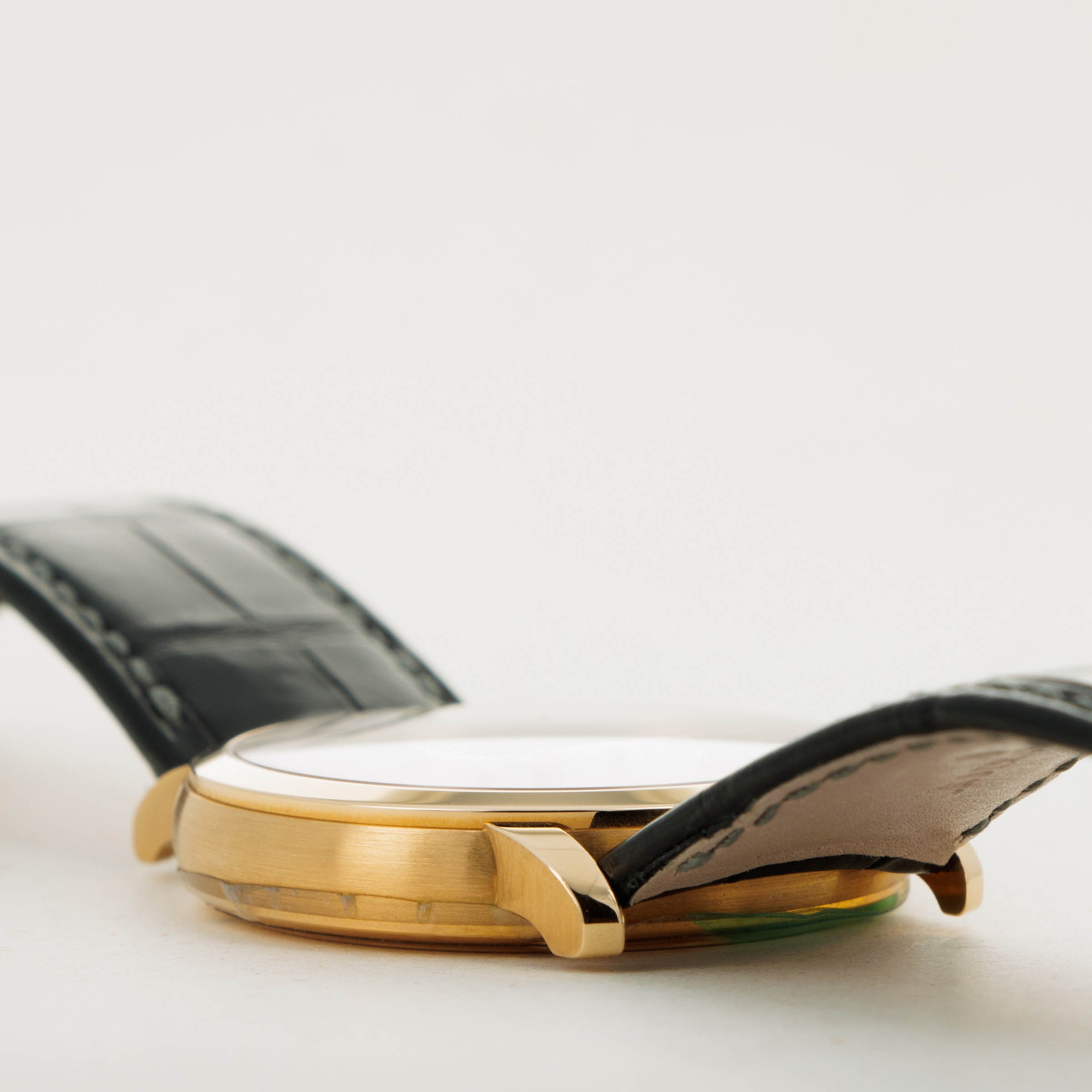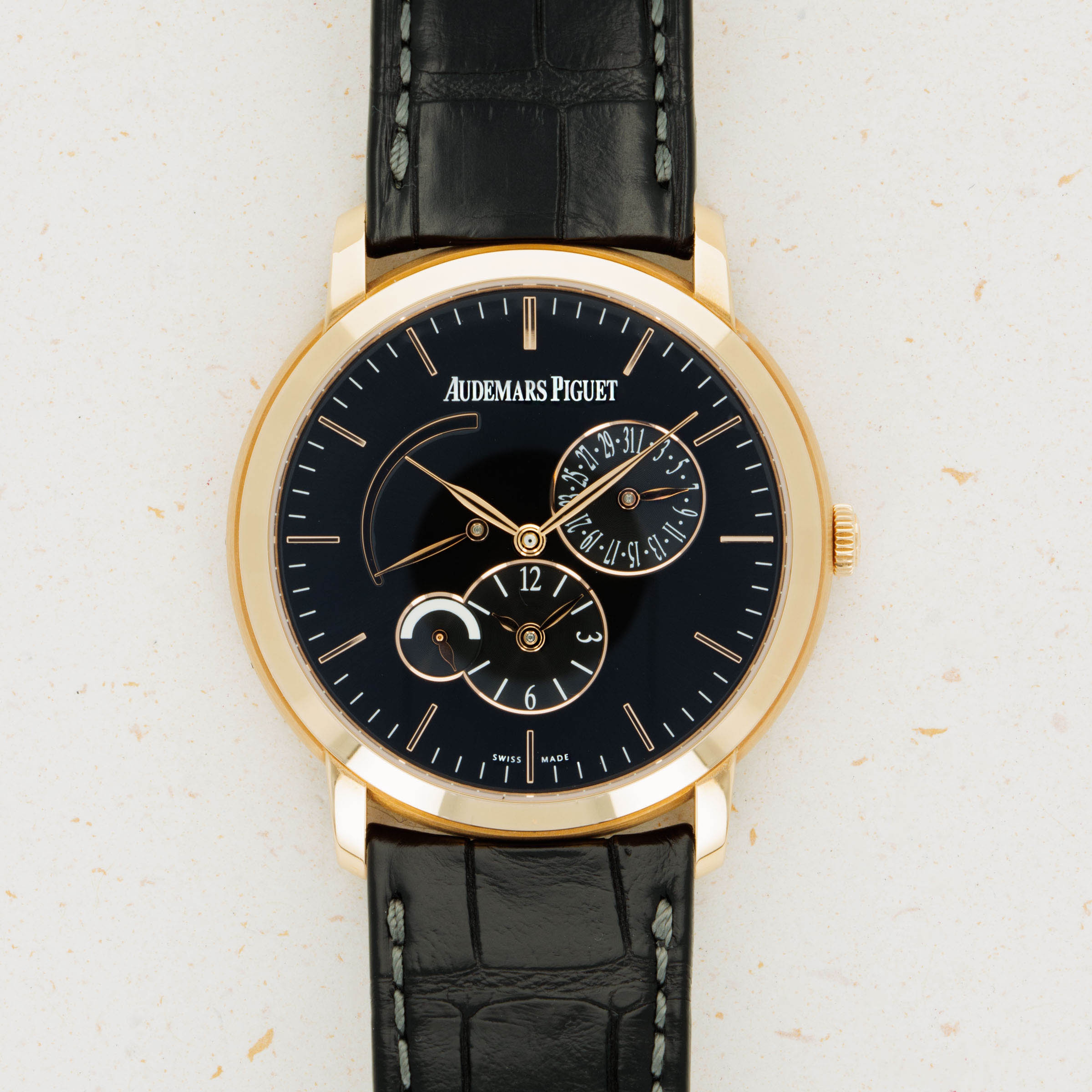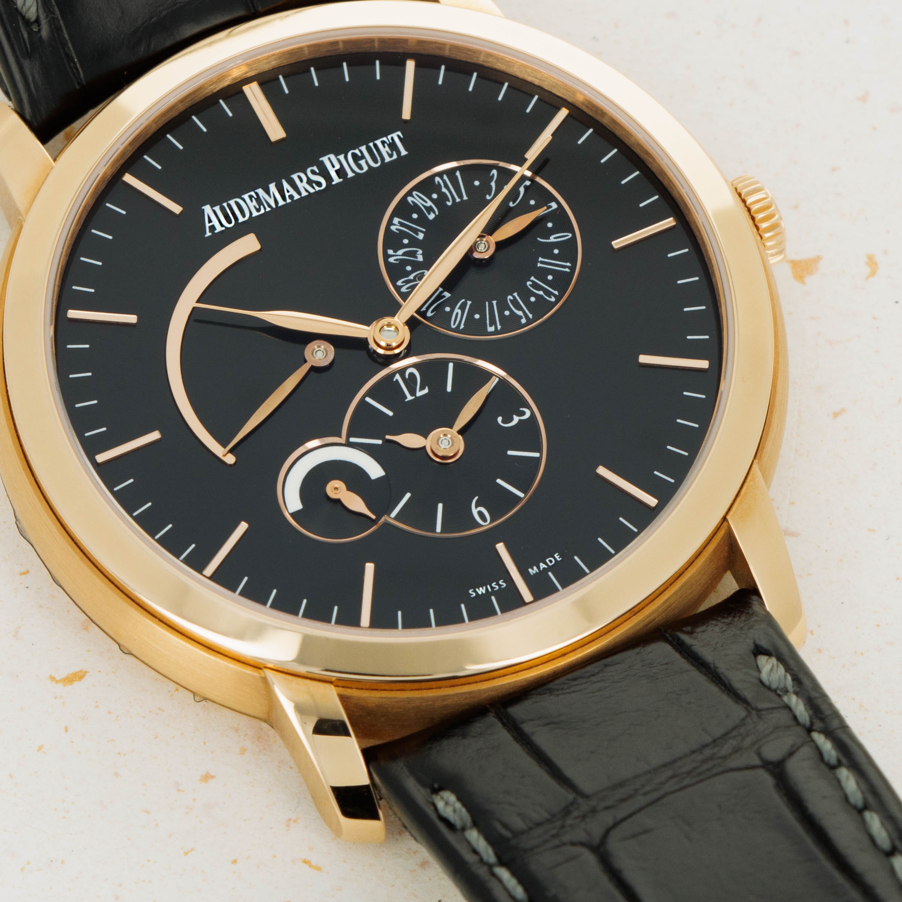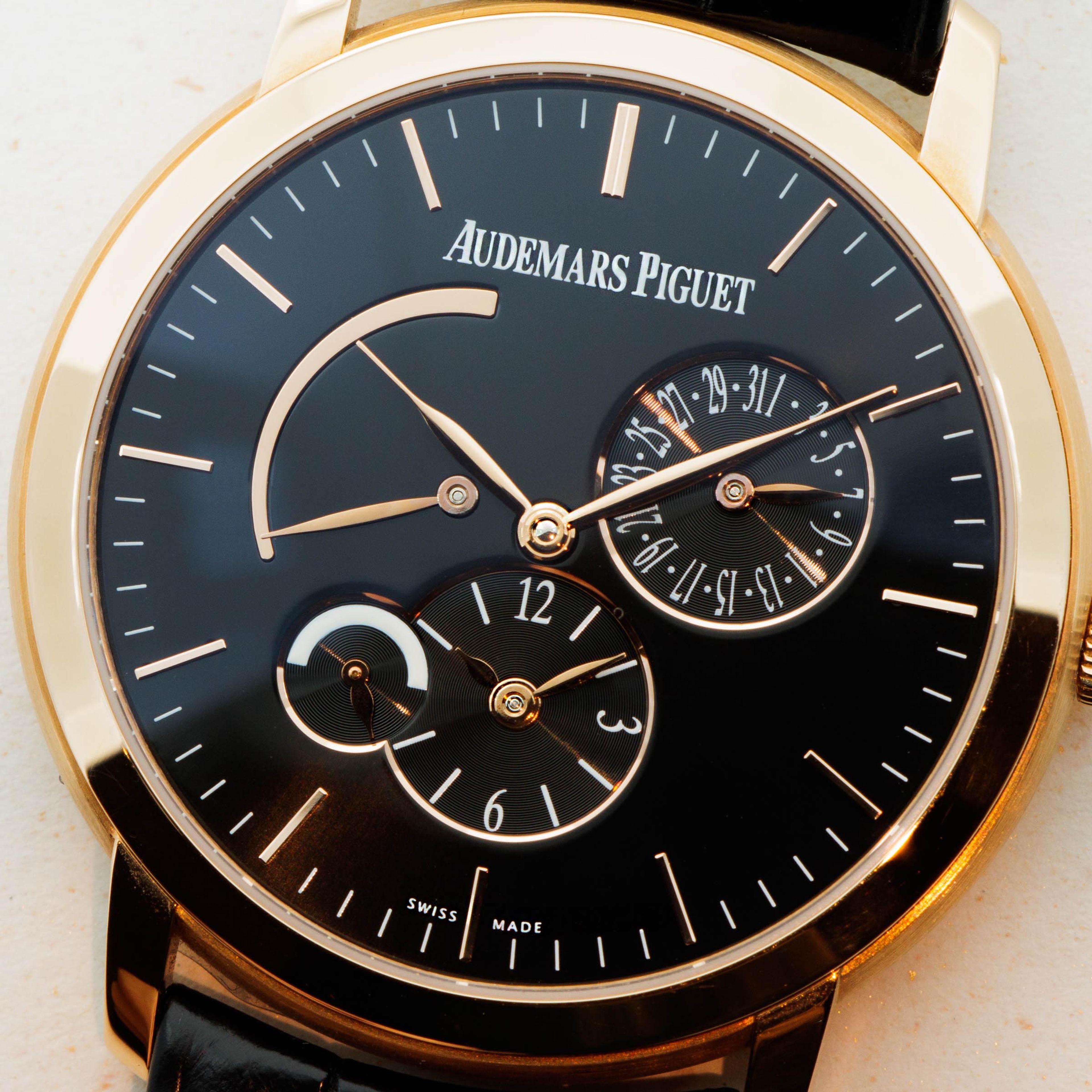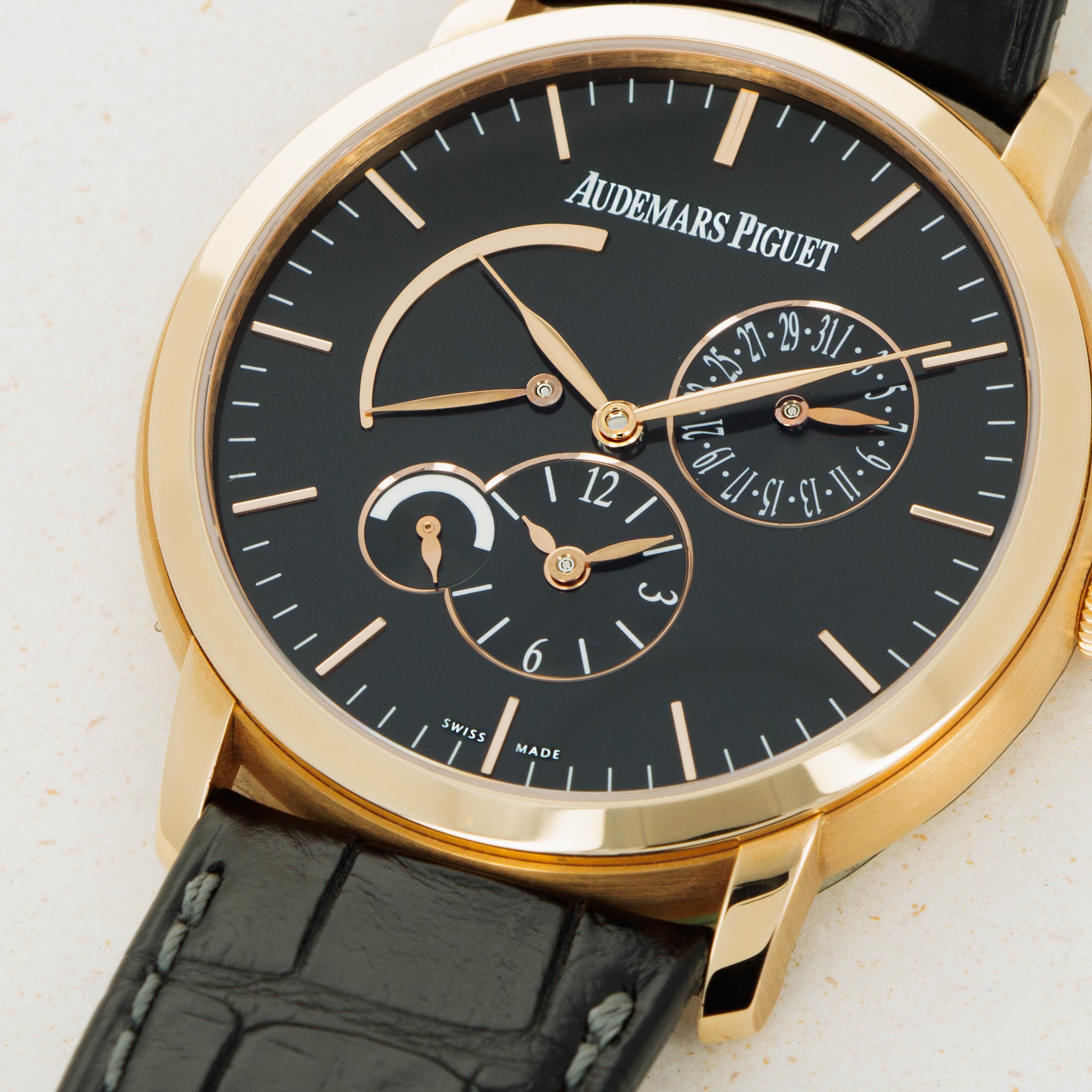 Boasting an excellently executed black dial, this example features rose gold applied indices, three handsomely recessed subdials with gold surrounds and a beautifully clear power reserve indicator that combine with the 18kt rose gold construction to absolute perfection.