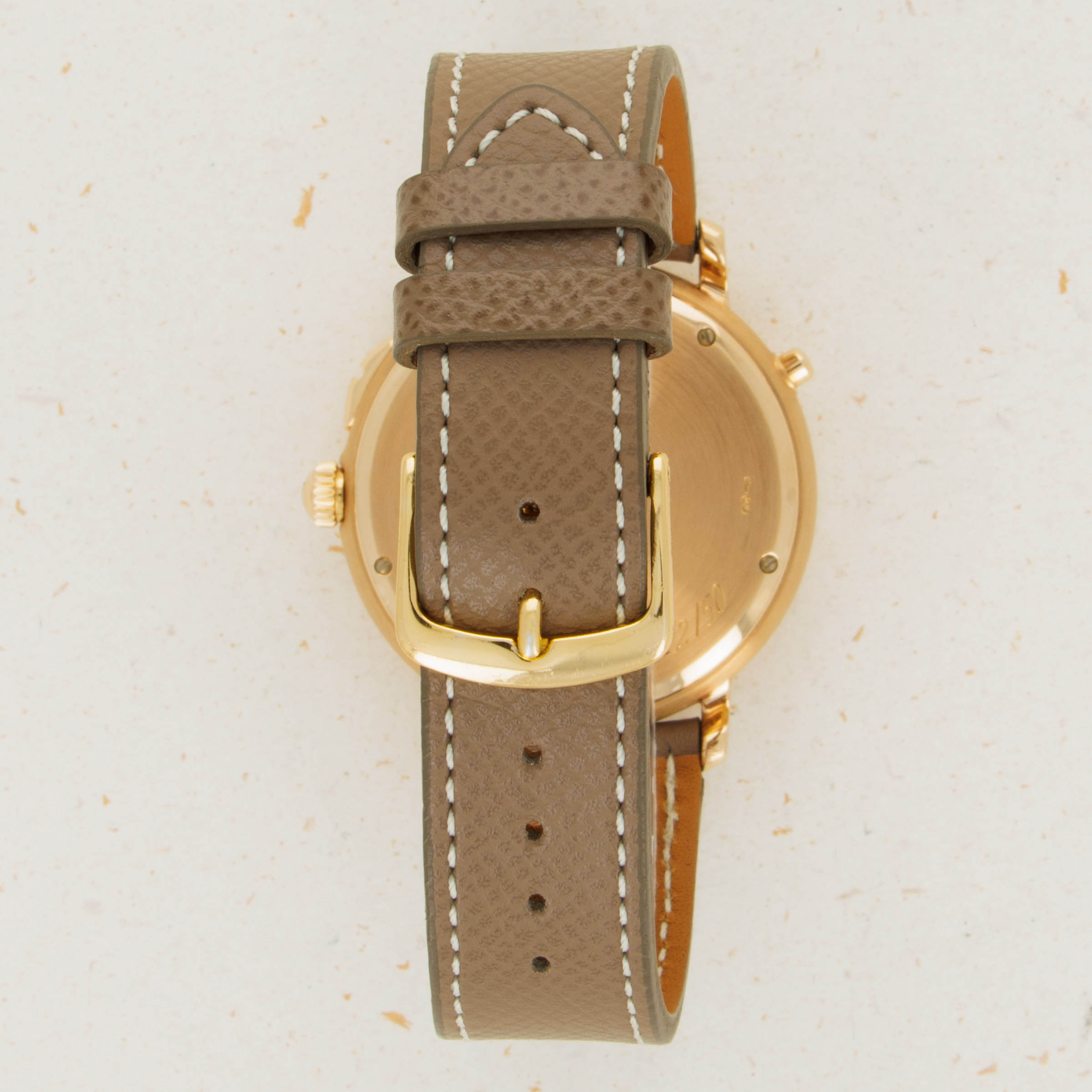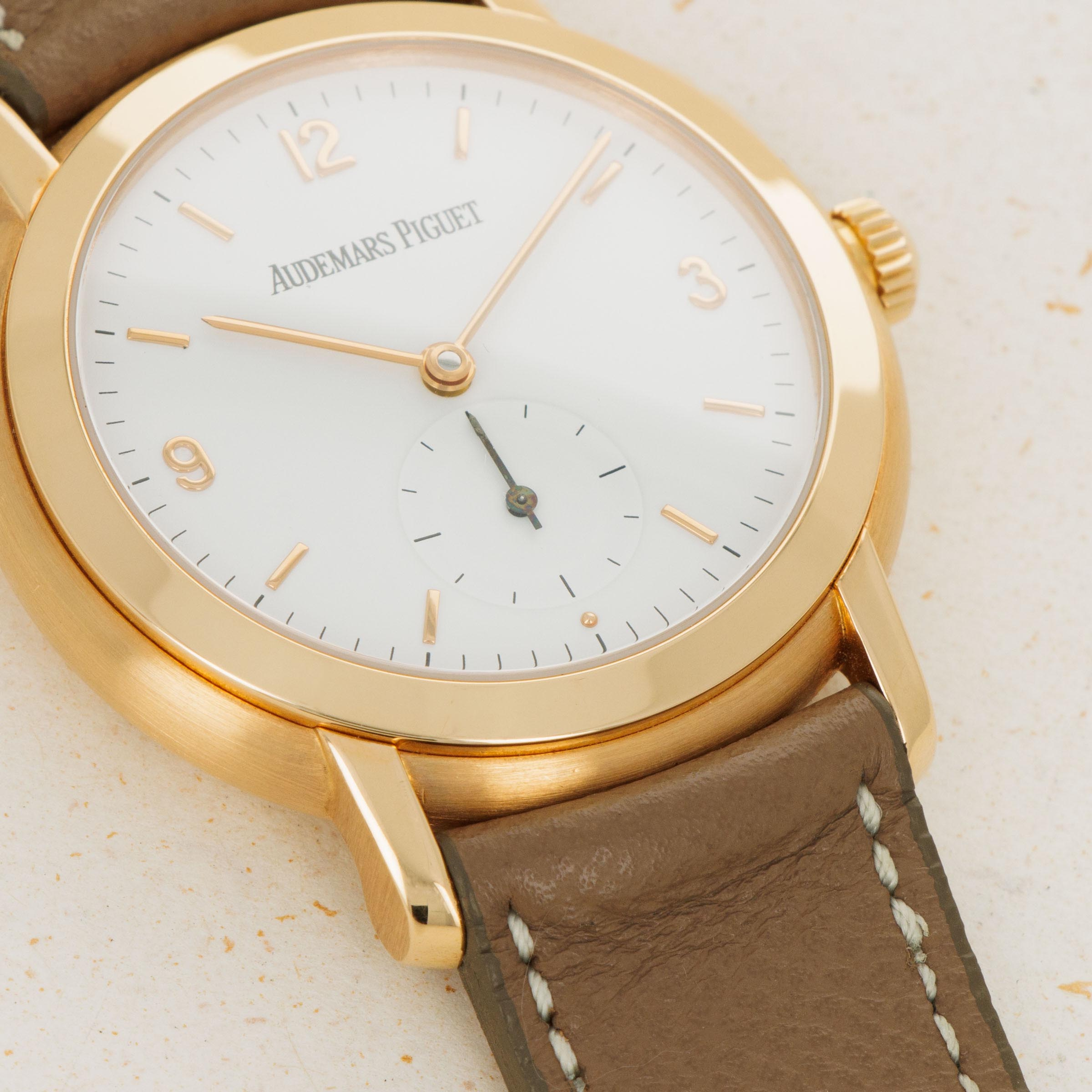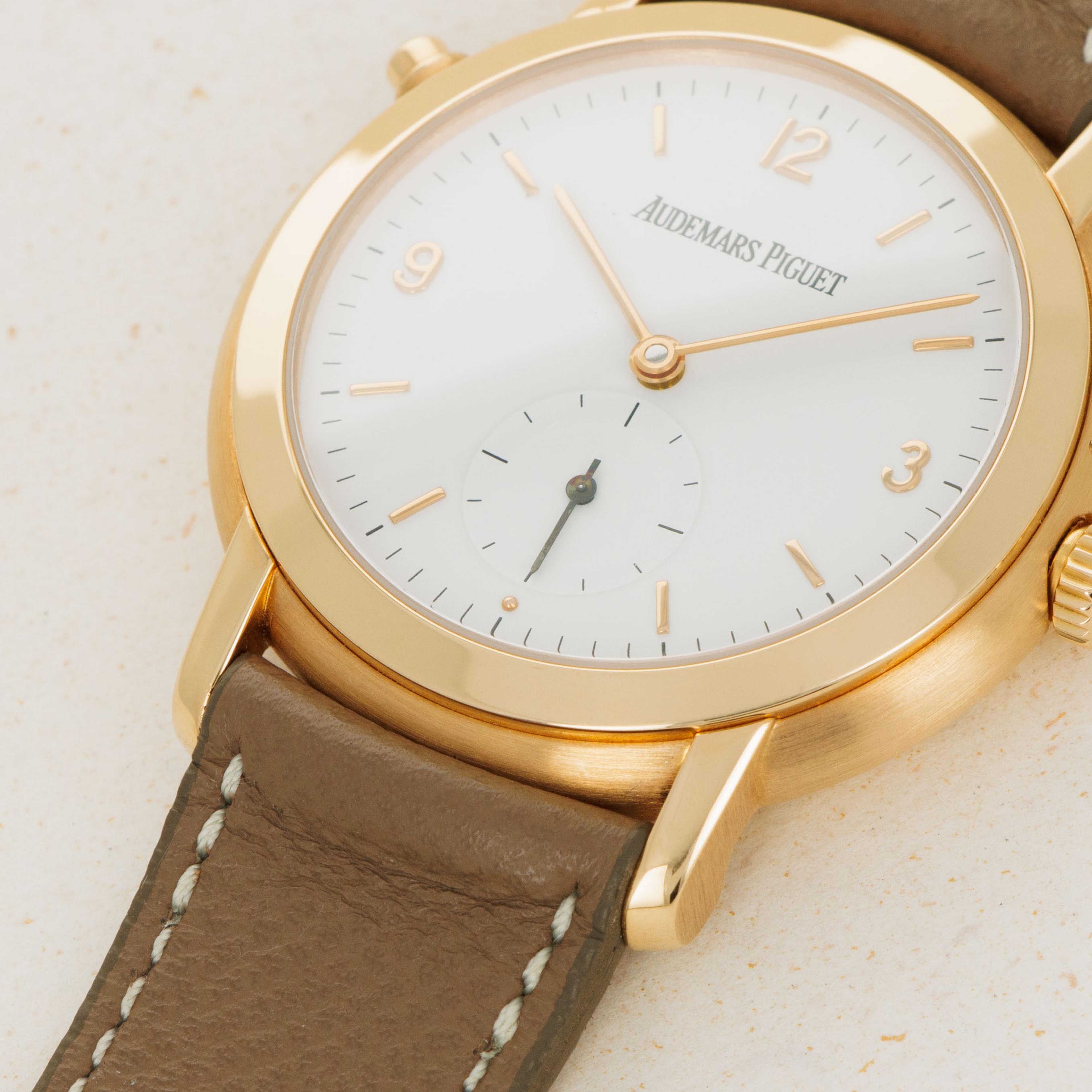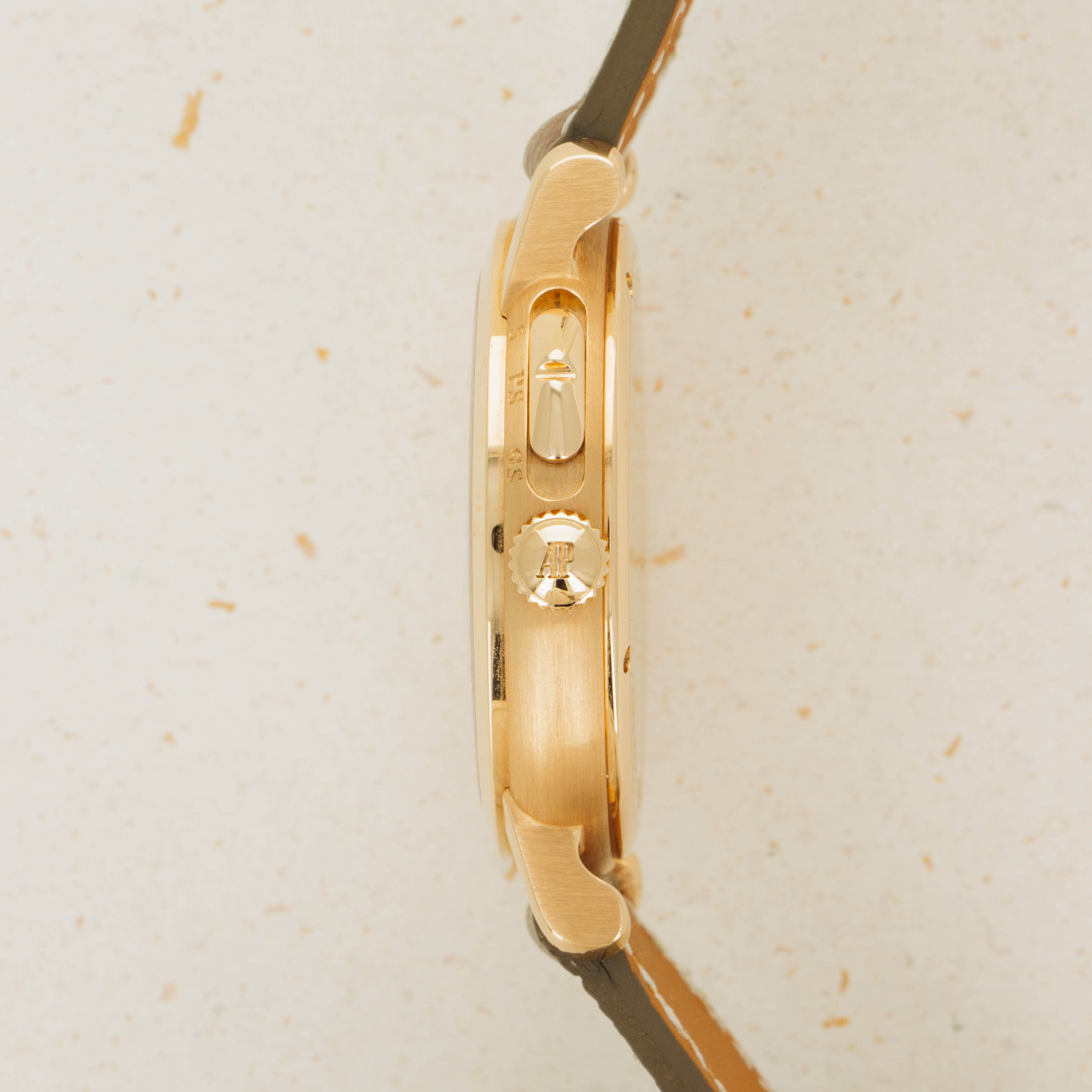 Watch is in excellent overall condition. Case exhibits light surface wear, with some visible marks on the bezel and lugs. Engraving on case and caseback is crisp and fully legible, showing minimal polishing. Dial near-mint with no signs of aging. The watch comes on a generic strap and plated non-AP buckle. PLEASE NOTE: Watch is rose and not yellow gold. It is a 25750OR.