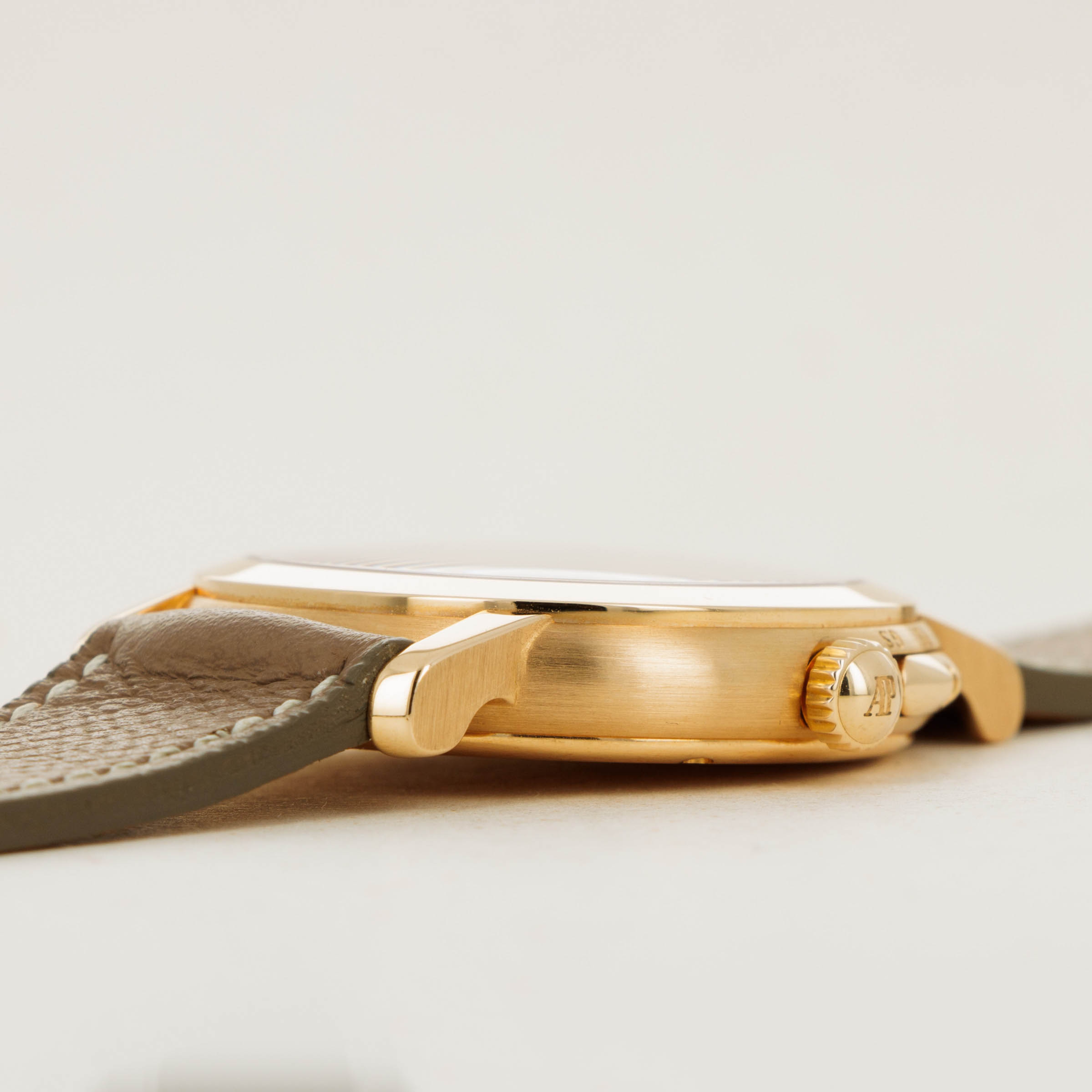 Representing AP’s very roots as a traditional watchmaker, the Jules Audemars collection has often been AP’s vehicle to demonstrate their innovative talents as one of horology’s best watchmakers. Launched around 1990, the Jules Audemars Grand Sonnerie for example, was made as a limited edition collection of 50 pieces that was produced over a 7-year timespan due to the incredible complexity of its manual-wind cal. 2868 movement that features both a grande and petite sonnerie. Featuring a stunning symmetrical white dial with applied golden indices and hands, the ref. 25750OR’s white display features no suggestion of the incredibly complex movement that lies beneath it. Instead, AP have only hinted at the cal. 2868’s sonnerie complications through the pusher at 10 o’clock on the ref. 25750OR’s 18kt rose gold case. Housed within an almost perfectly symmetrical 39mm 18kt rose gold case that contrasts a polished bezel with a beautiful satin-brushed midcase, the ref. 25750OR is intensely refined and elegant on the wrist, as one would expect from a watch of this caliber from a brand like Audemars Piguet.