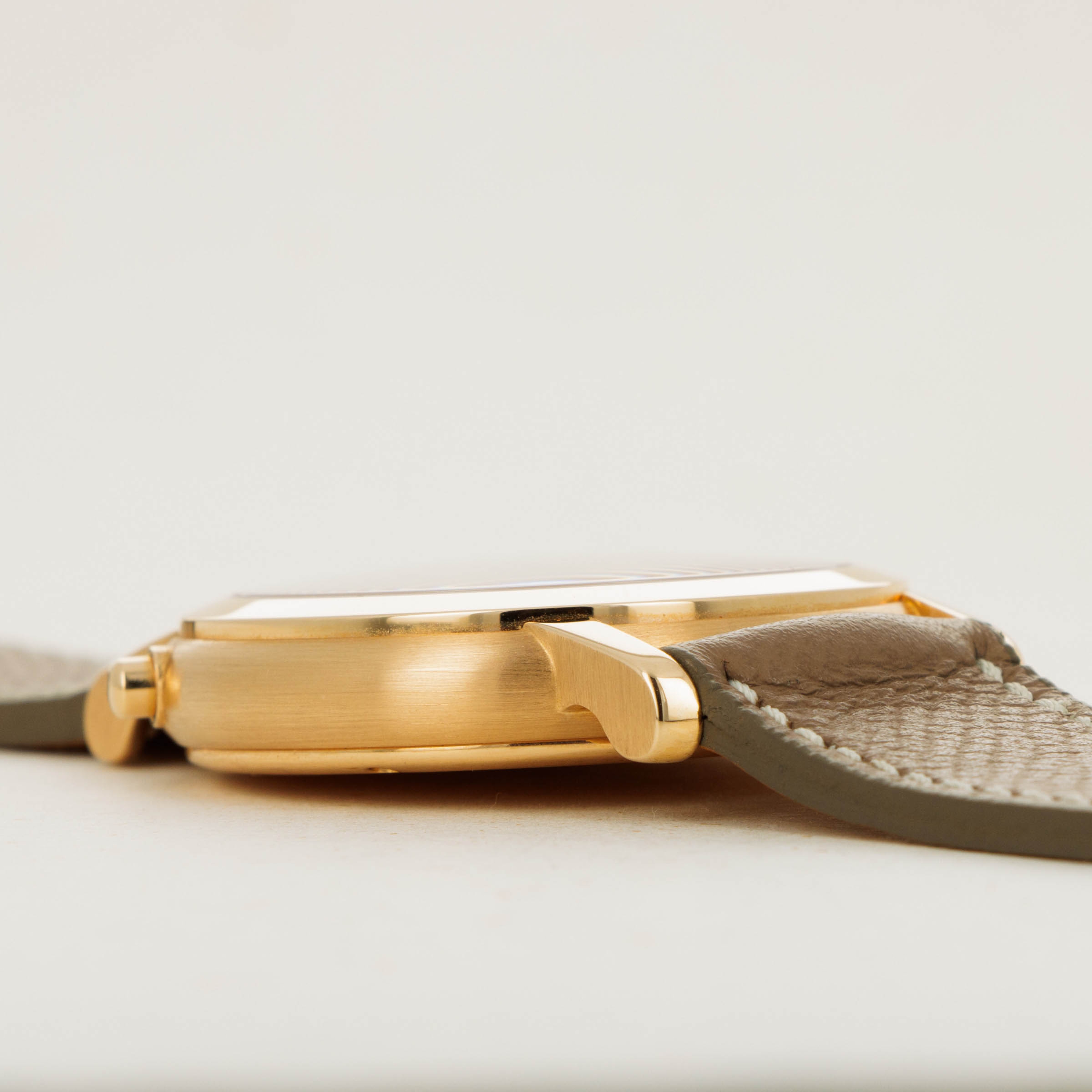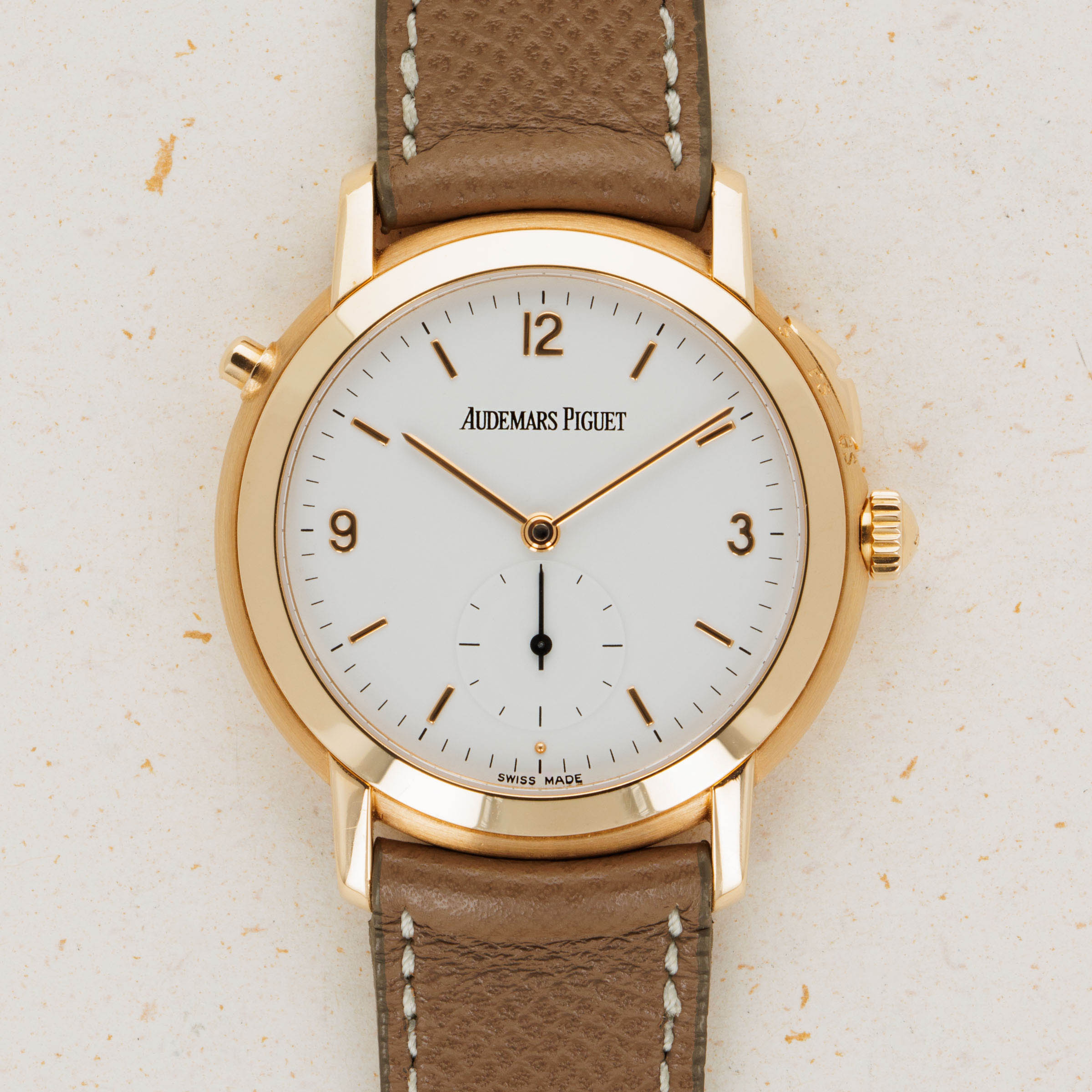 While relatively simple with its applied gold hour markers and hands and seconds subdial at 6 o'clock, the ref. 25750BA's white dial hides the fact that it is an incredibly complicated timepiece - a fact that is only hinted at by its pusher at 10 o'clock.