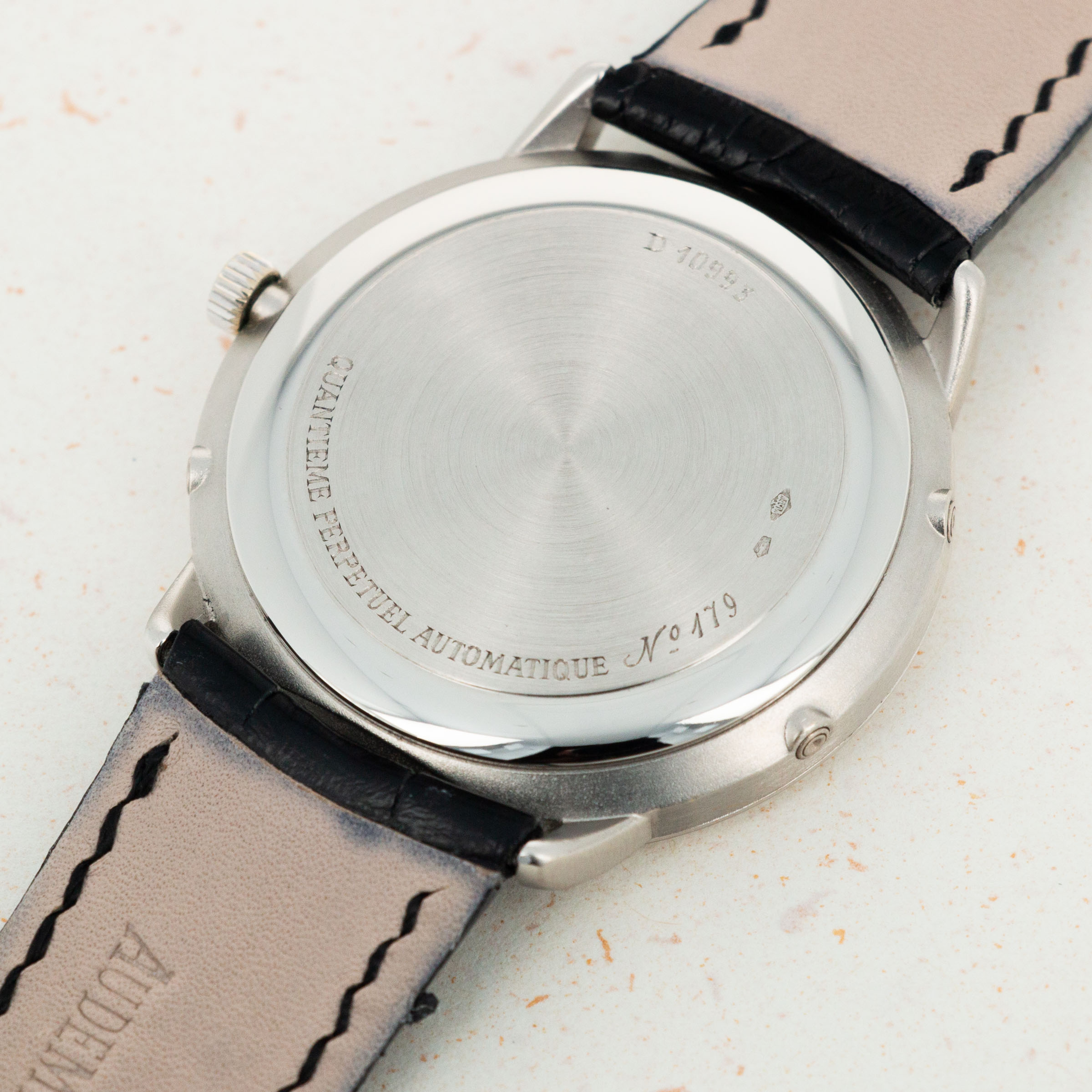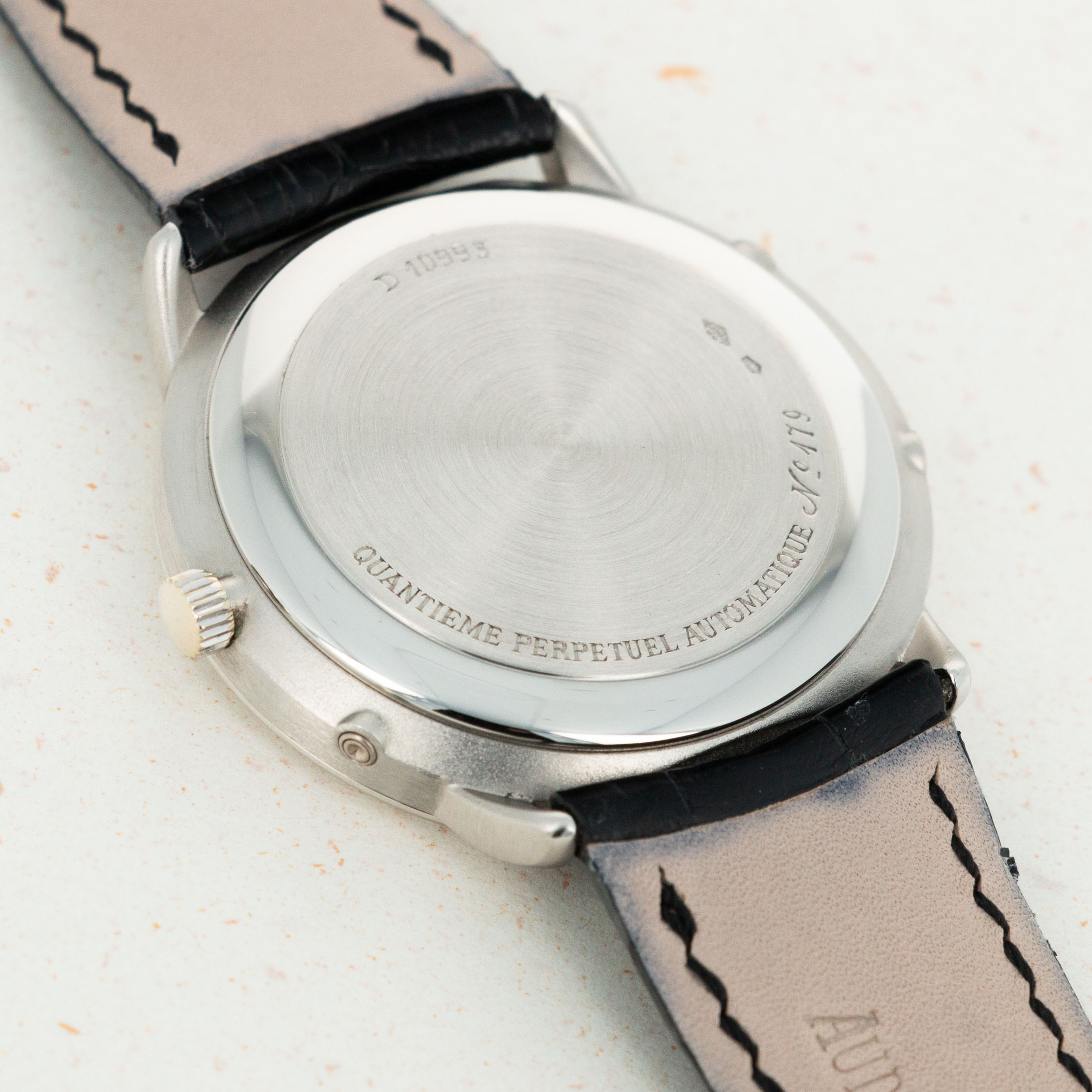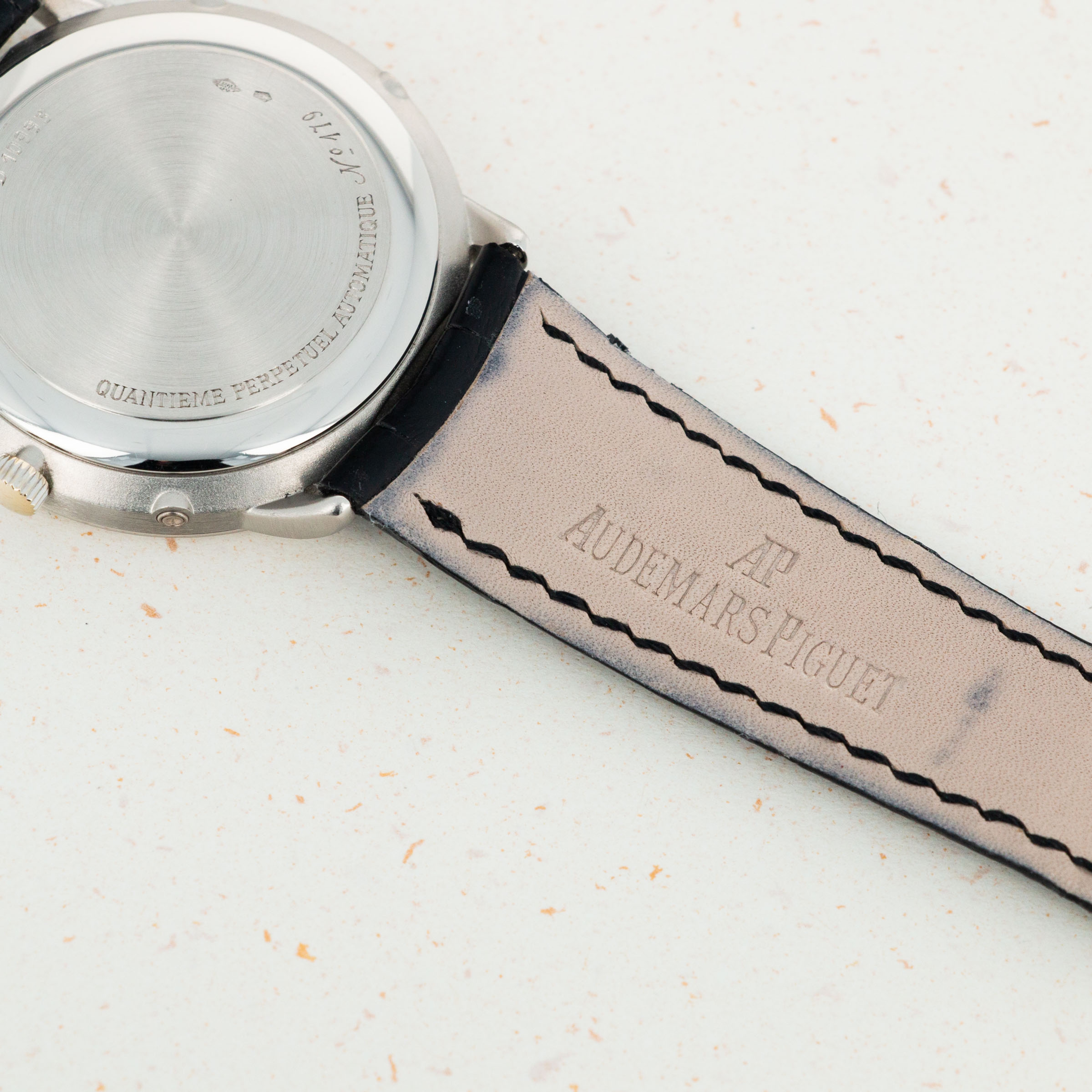 This example features a solid caseback with rounded detail around the edge- characteristic of the latter series of productions of the Ref. 25657. This series is prior to Audemars Piguet introducing a clear exhibition back on the Quantieme Perpetual models.