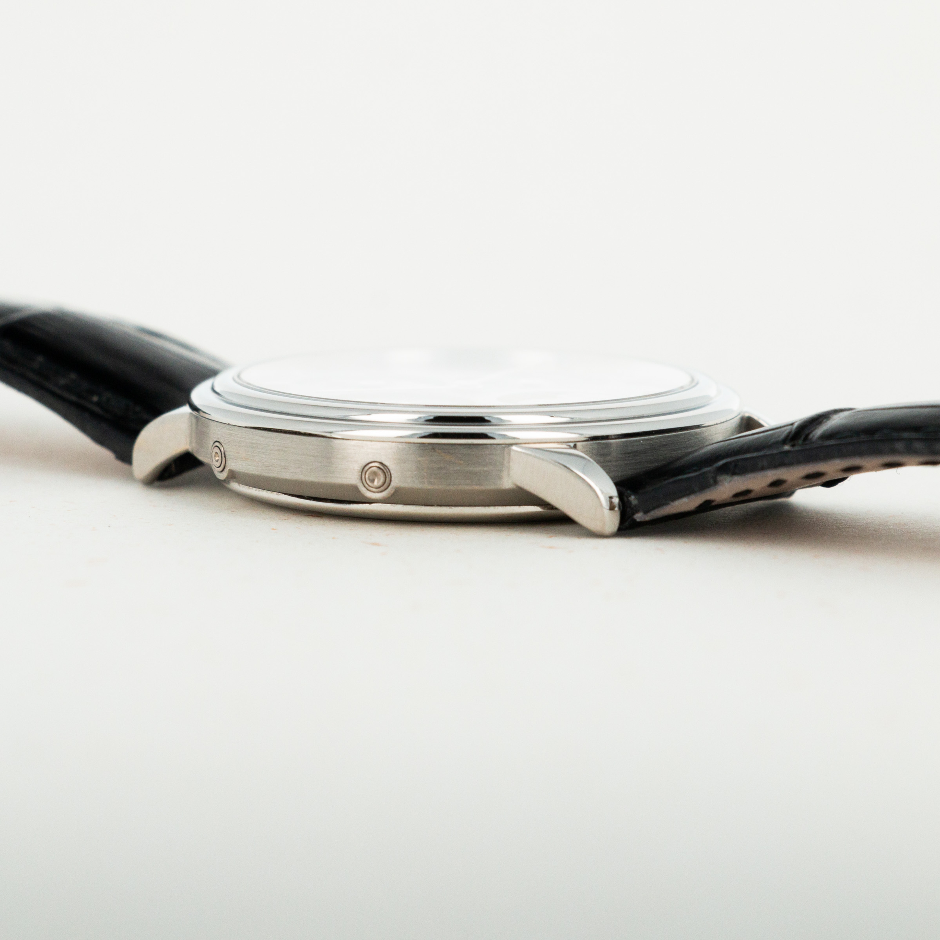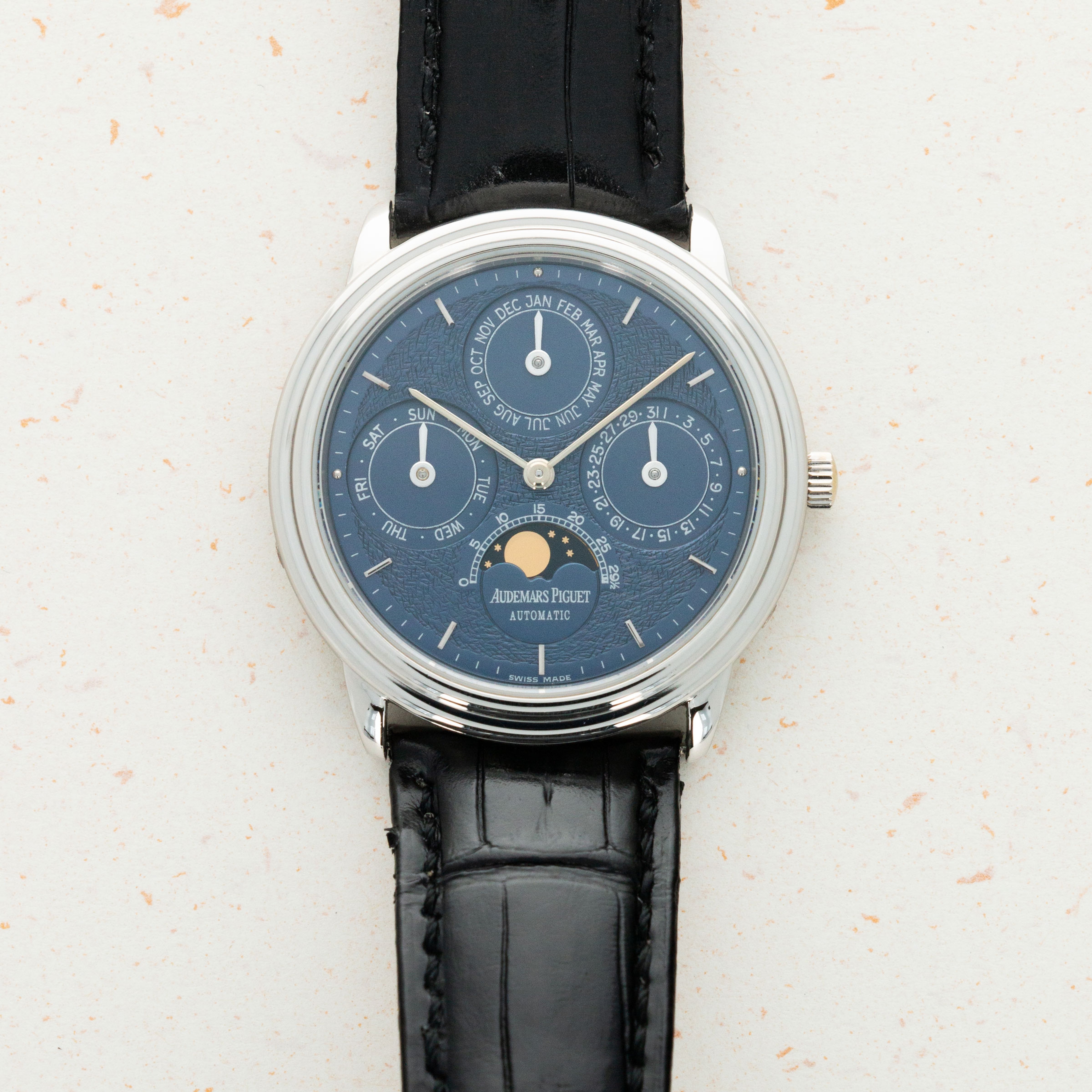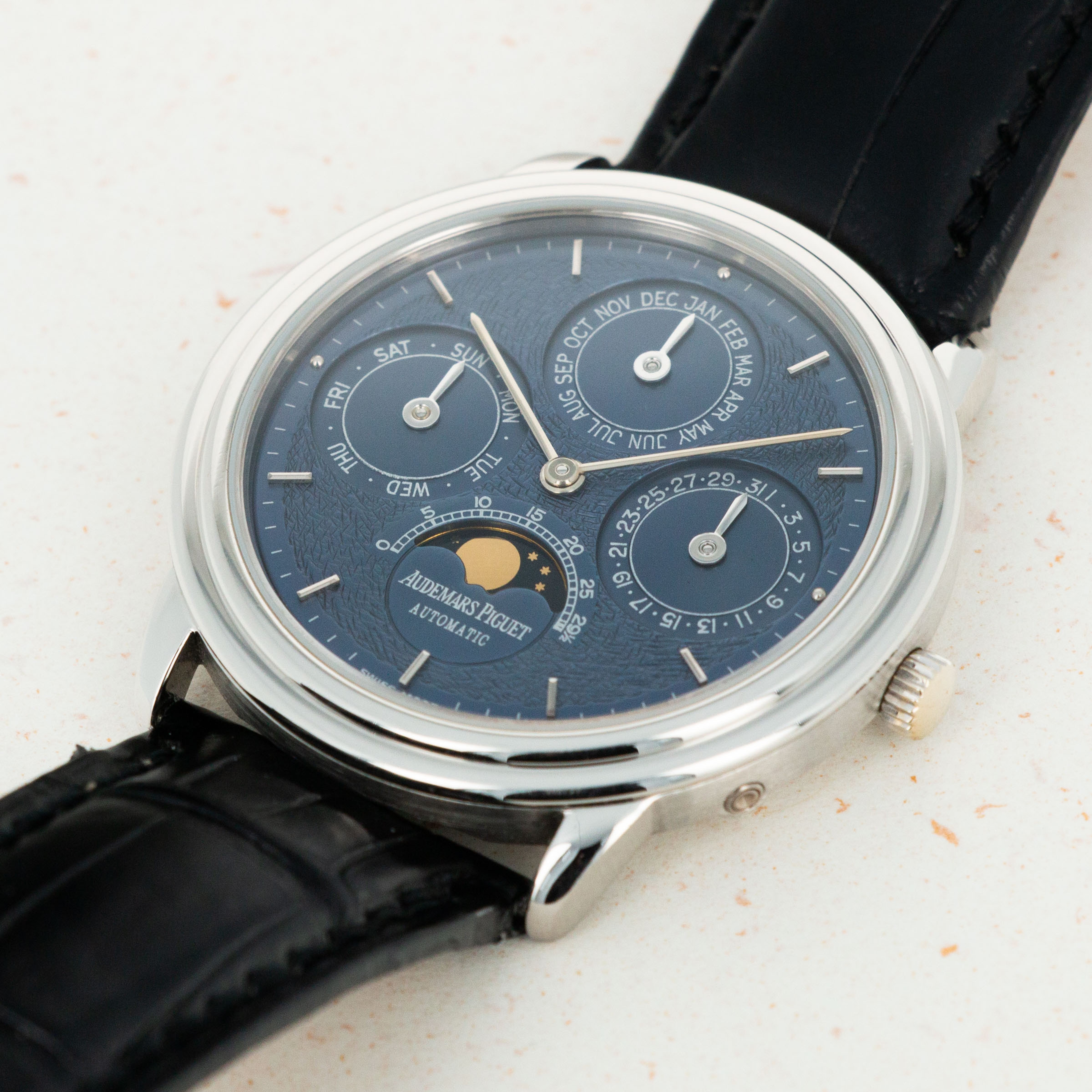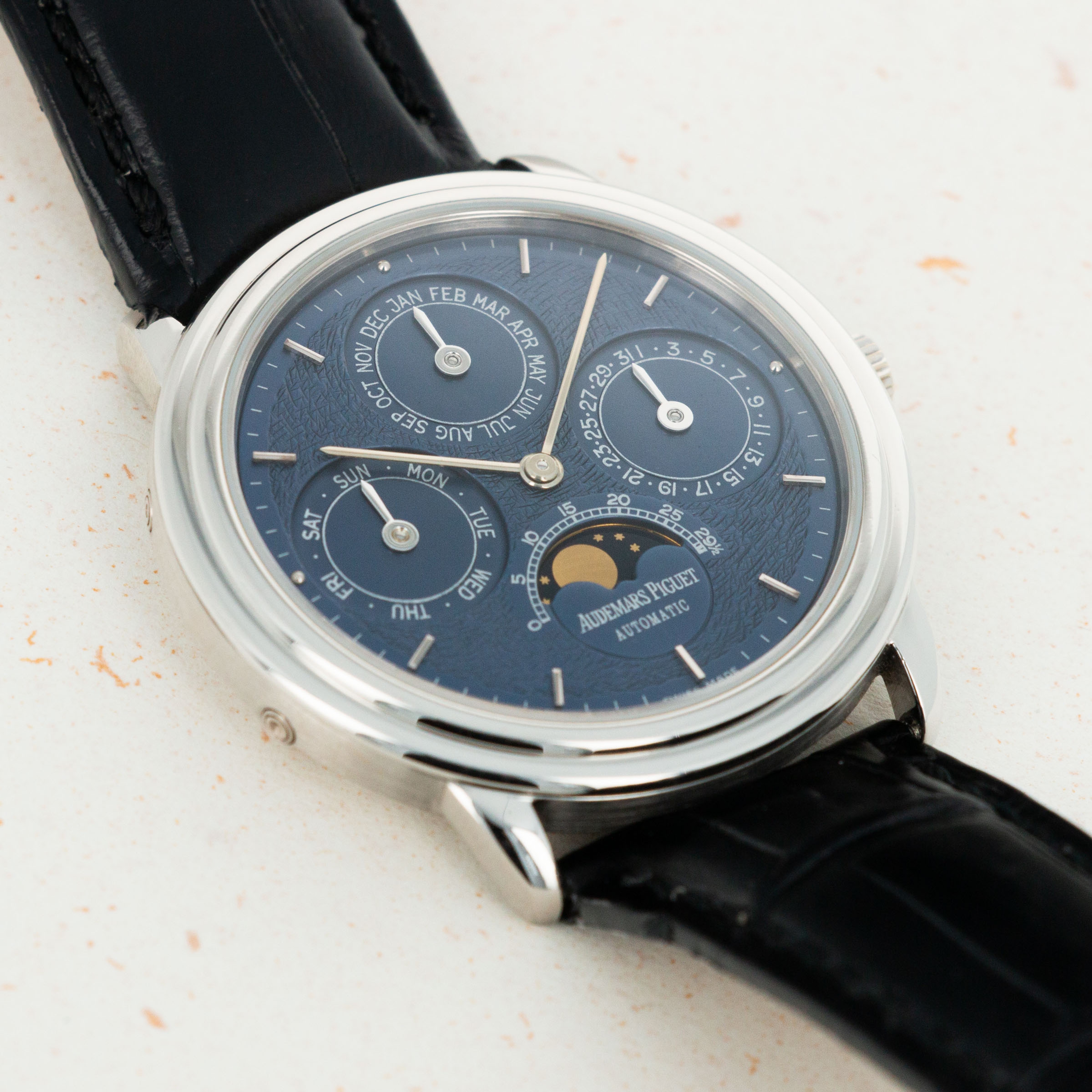 Made of white gold, the 'Tuscan' blue dial is one of the rarest and most sought-after variations. The details in the finish are absolutely superb.