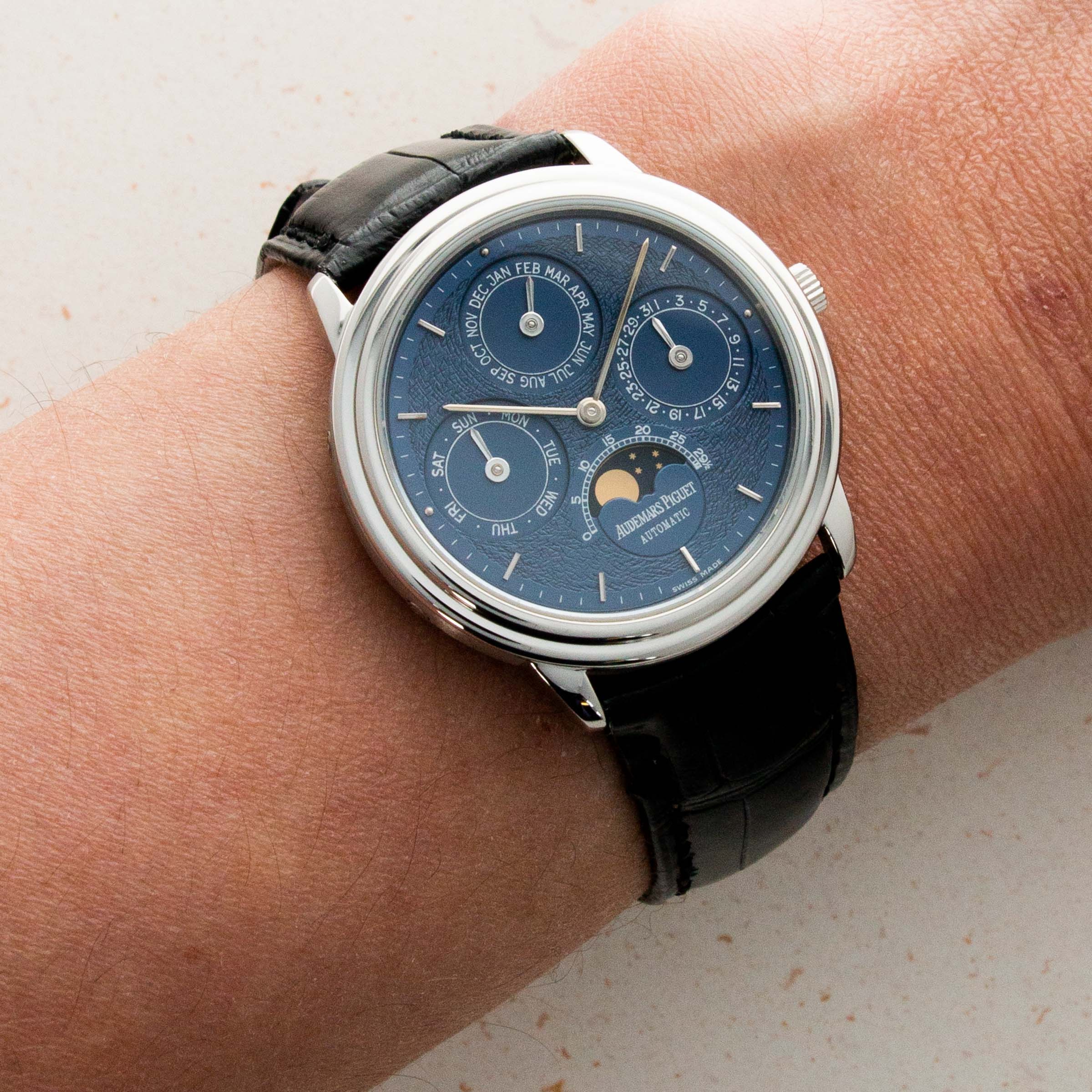 Introduced in 1978, the Quantieme Perpetual was an extraordinary achievement in watchmaking. At the time it was released, it reigned as the world's thinnest, self-winding perpetual calendar. The movement was used in only a handful of models by Audemars Piguet, most notably, the Royal Oak.