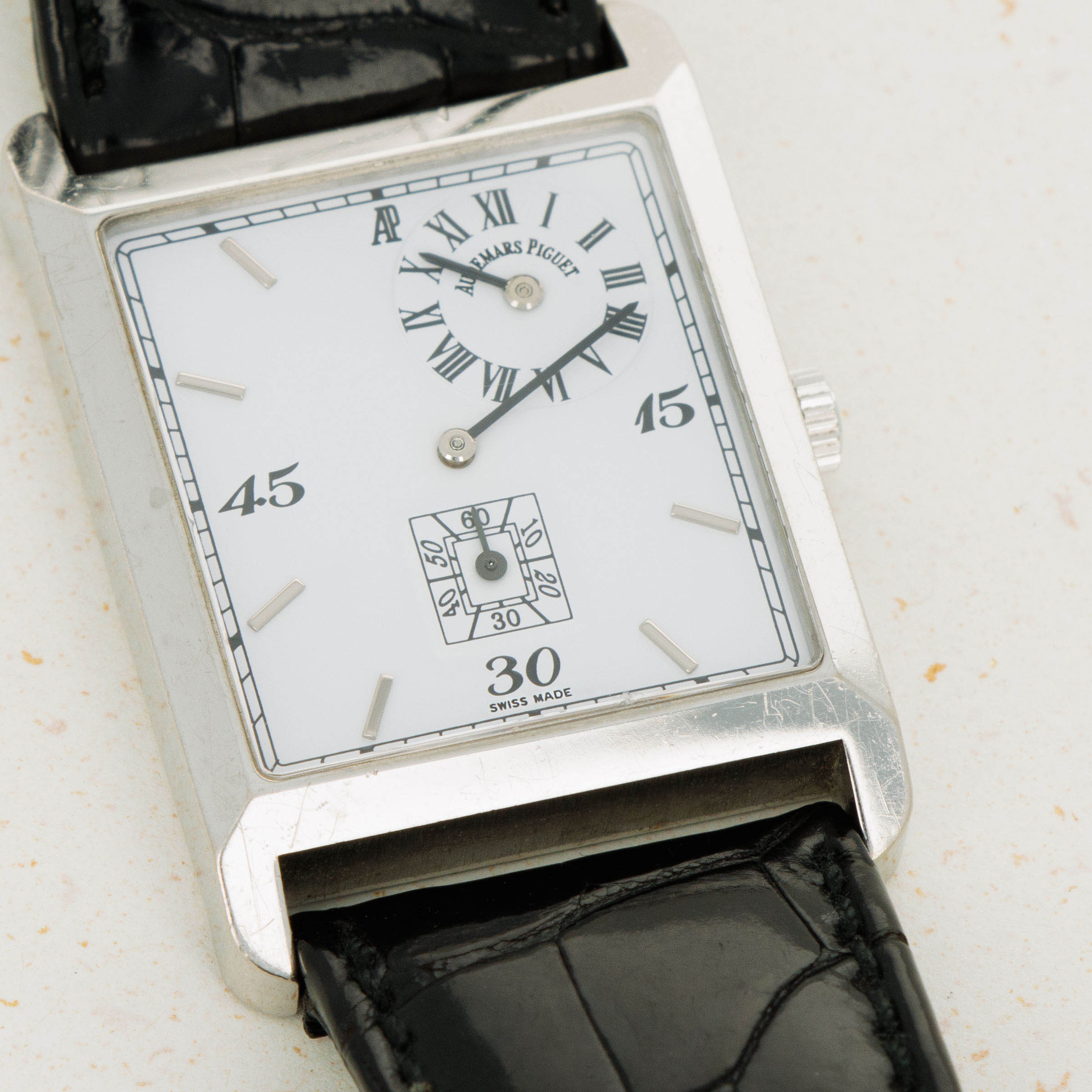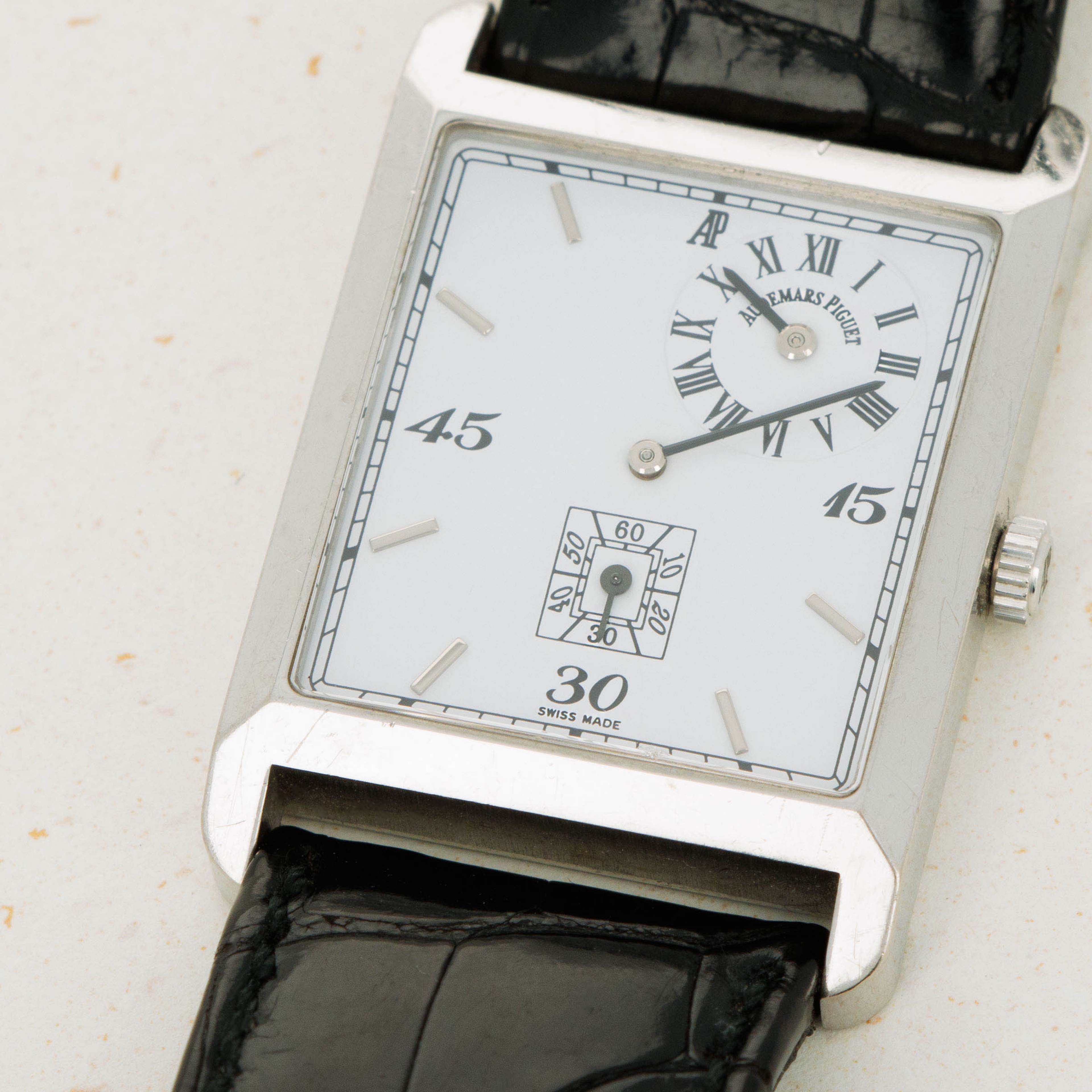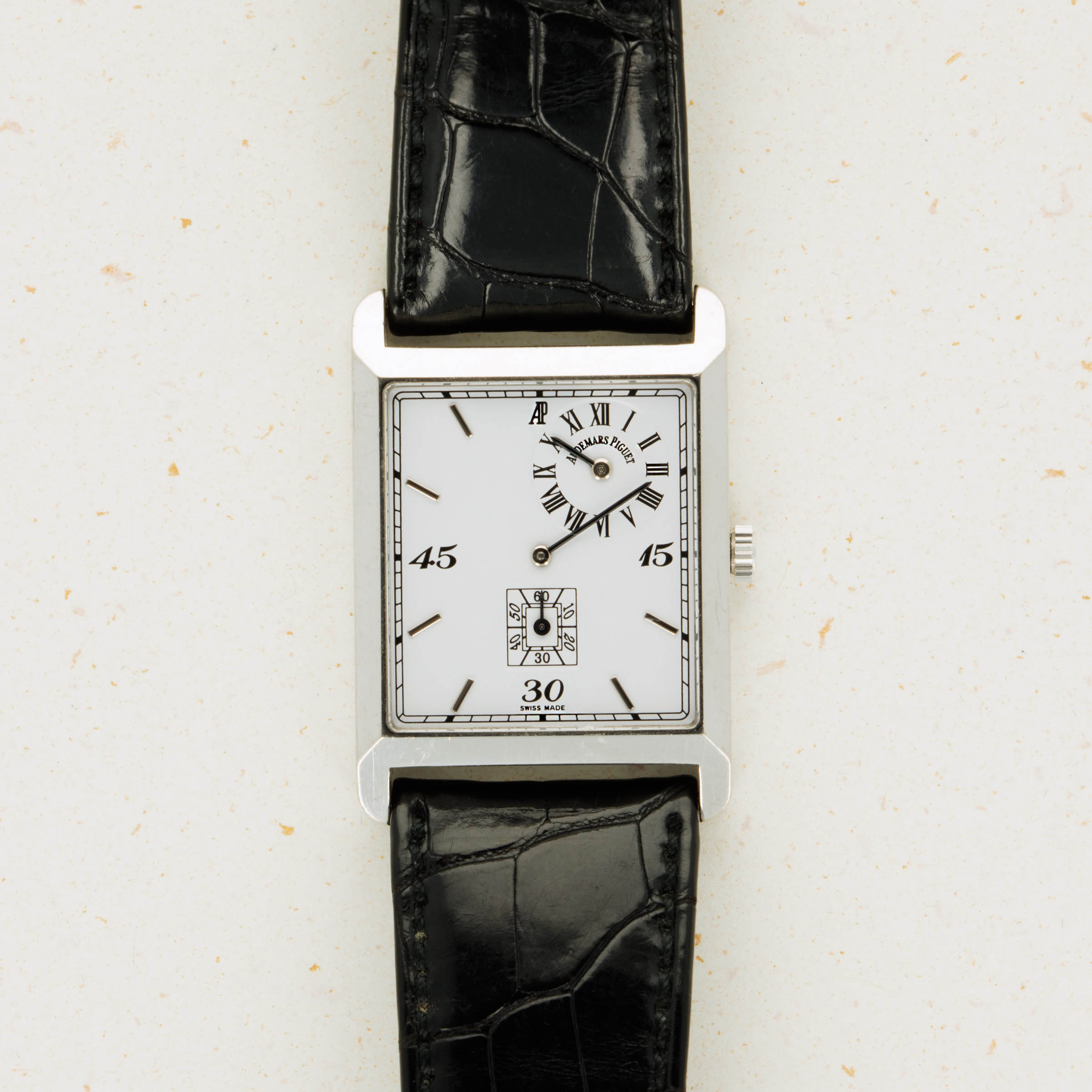 Launched in 2000 as an homage to the Audemars Piguet timepieces that have come before it, the Audemars Piguet Museum Collection Regulator 25845BC.O.0002.01, a rare find in the world of horology. Made of 18kt white gold and boasting a rectangular case design, it wears with an understated sense of style that is befitting of its status as a regulator watch, an unconventional beast in and of itself. Boasting a pristine white dial punctuated by faceted backened gold baton hands, white gold indices, and stark black quarter-hour Arabic numerals, the ref. 25845BC showcases a beautiful synergy between elegance, exclusivity, and expert craftsmanship. A regulator watch, as its name suggests, the 25845BC features a regulator dial and thus uses its central hands to display the minutes with the hours displayed in its subdial at 1 o' clock and the seconds in its subdial at 6 o' clock. Featuring a fittingly understated 18kt white gold case to match its understated white dial, the ref. 25845BC wears wonderfully on the wrist thanks to its 38mm x 29mm measurements sitting in line with modern style. Launched as a limited edition of just 2000 pieces, the ref. 25845BC is a true collectors piece that embraces traditional aesthetic and blends it with modern proportions and craftsmanship to create a truly special piece that is far outside of what modern AP has come to signify.