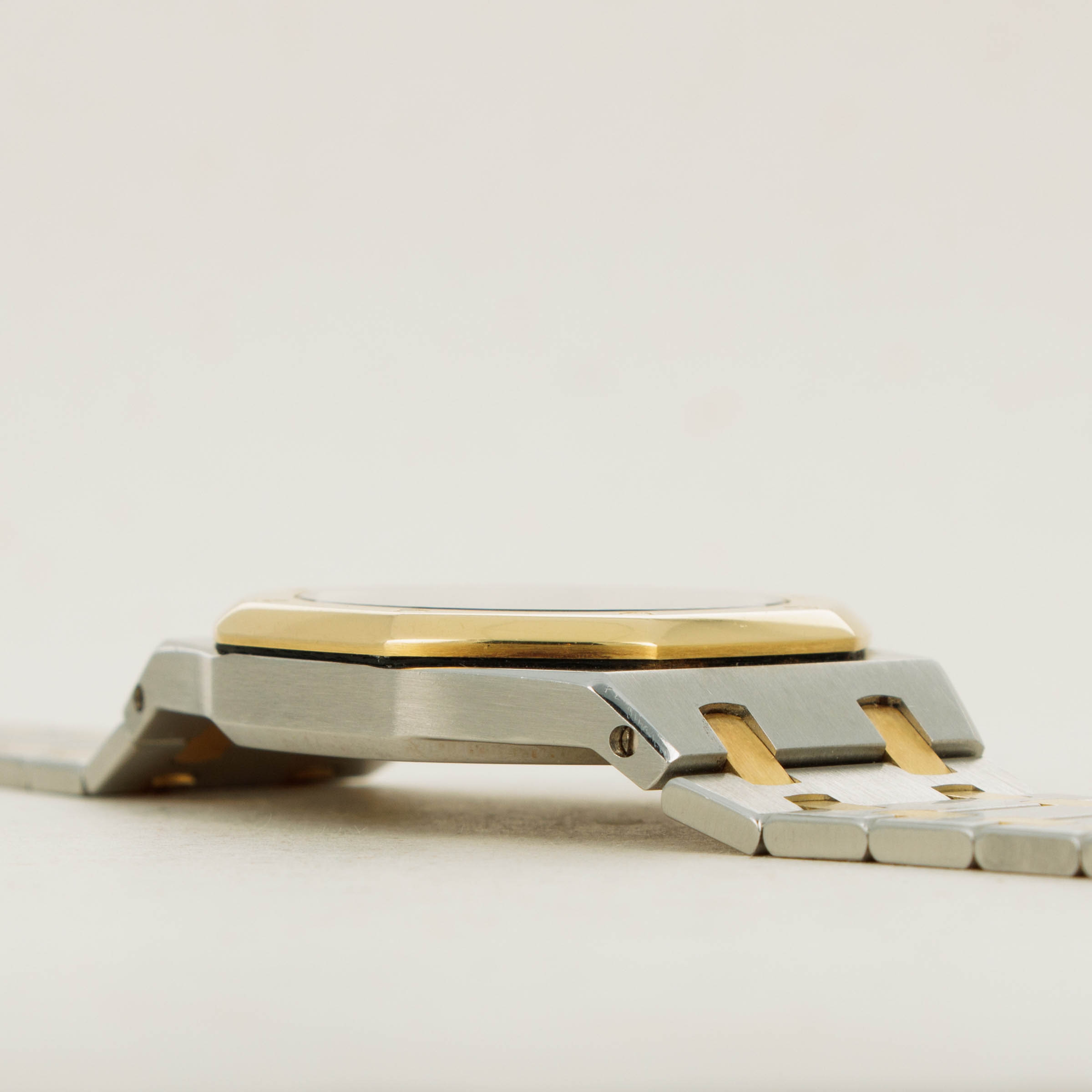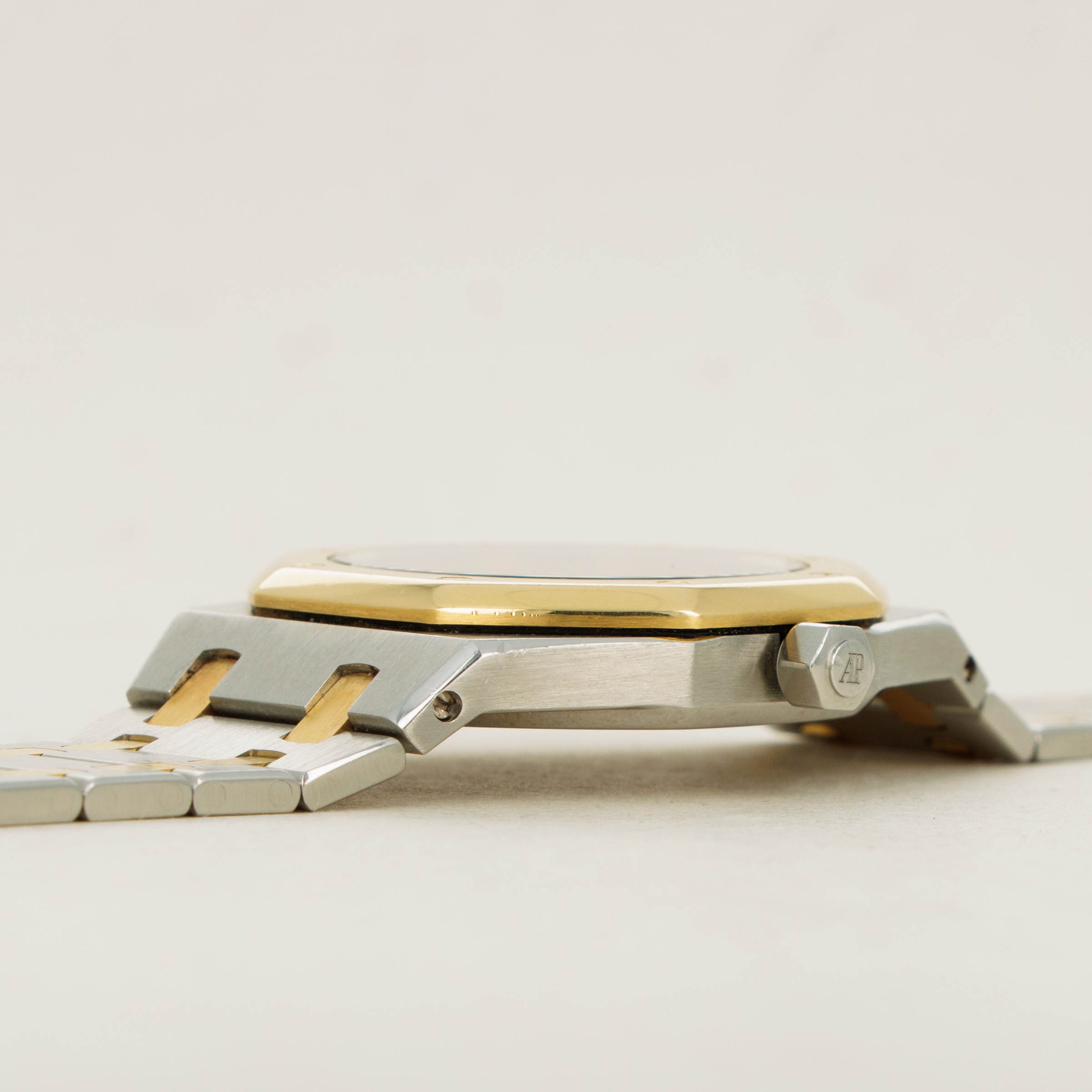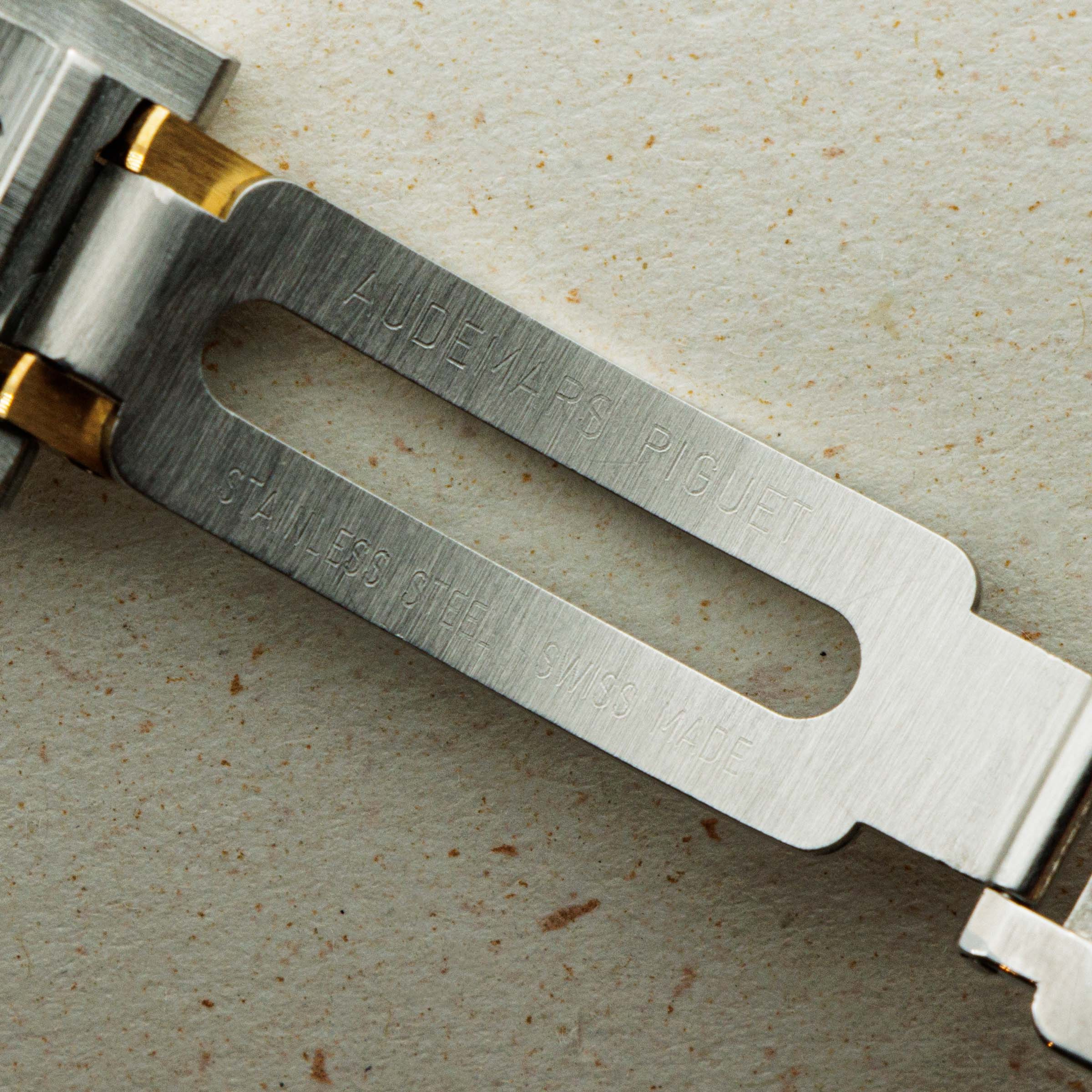 As one of the integral parts of the Royal Oak's aesthetic, its stunning three-piece link bracelet is wonderfully complemented by a two-tone construction with its large stainless steel links held together by two small 18k yellow gold links - as perfectly displayed by the ref. 14790's two-tone 36mm construction.