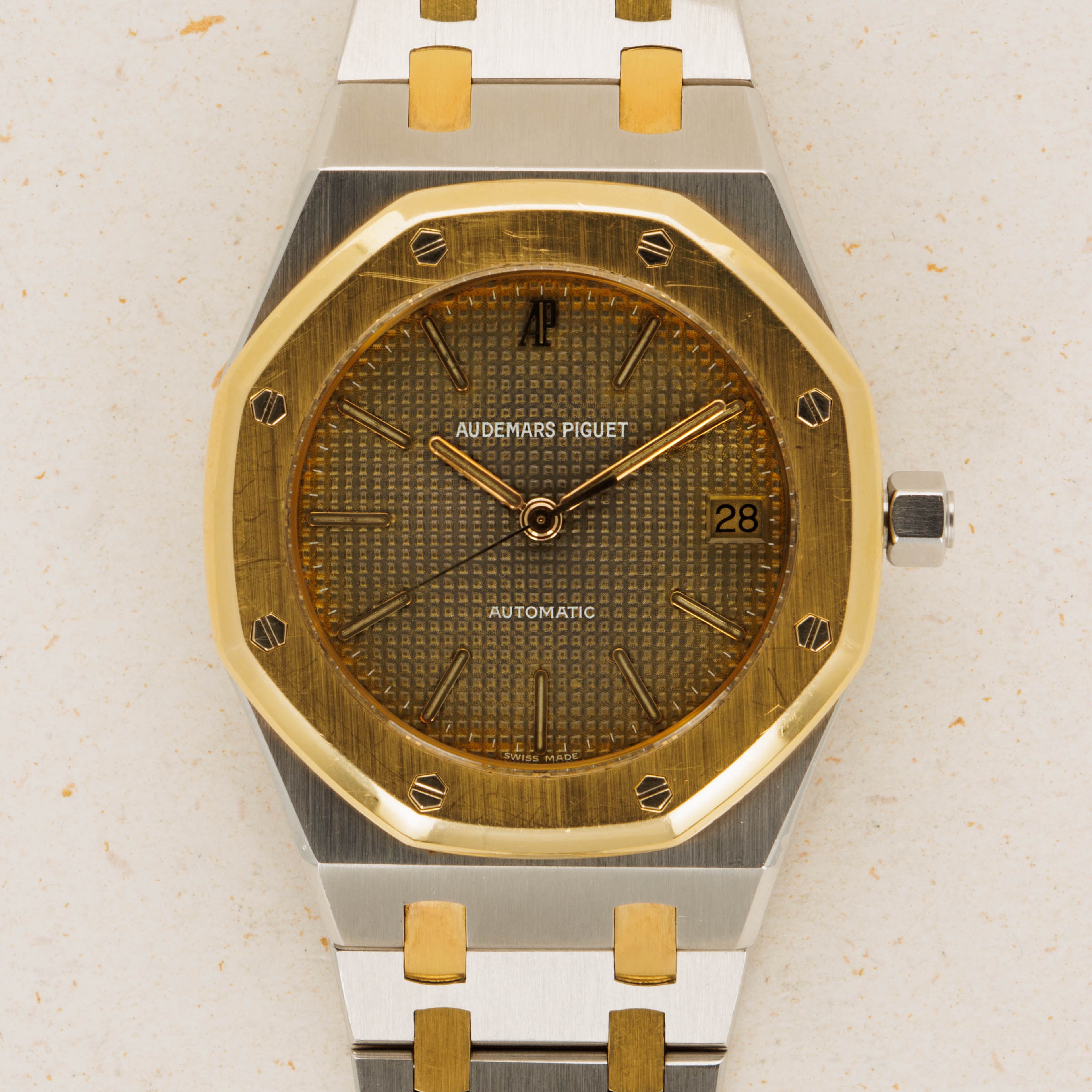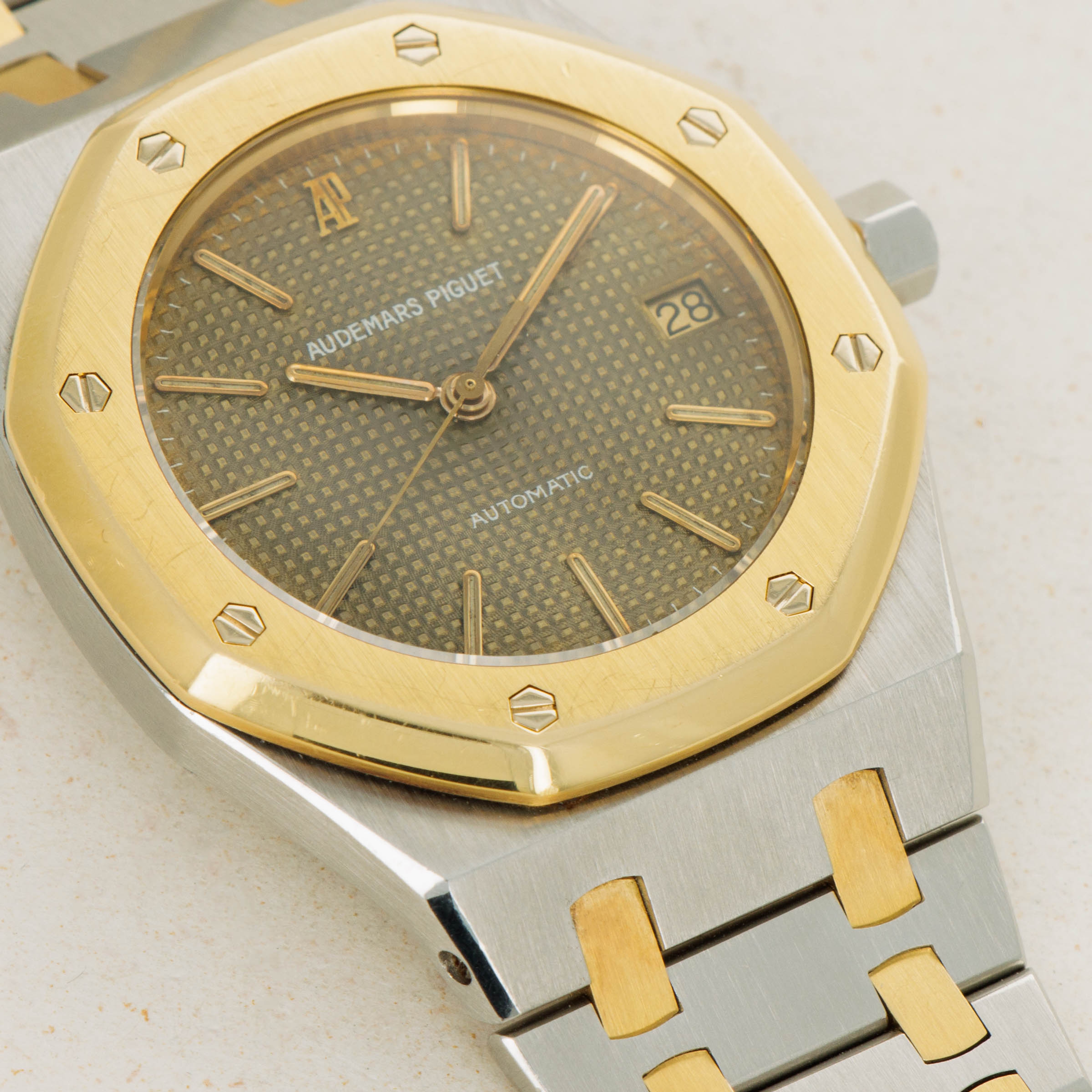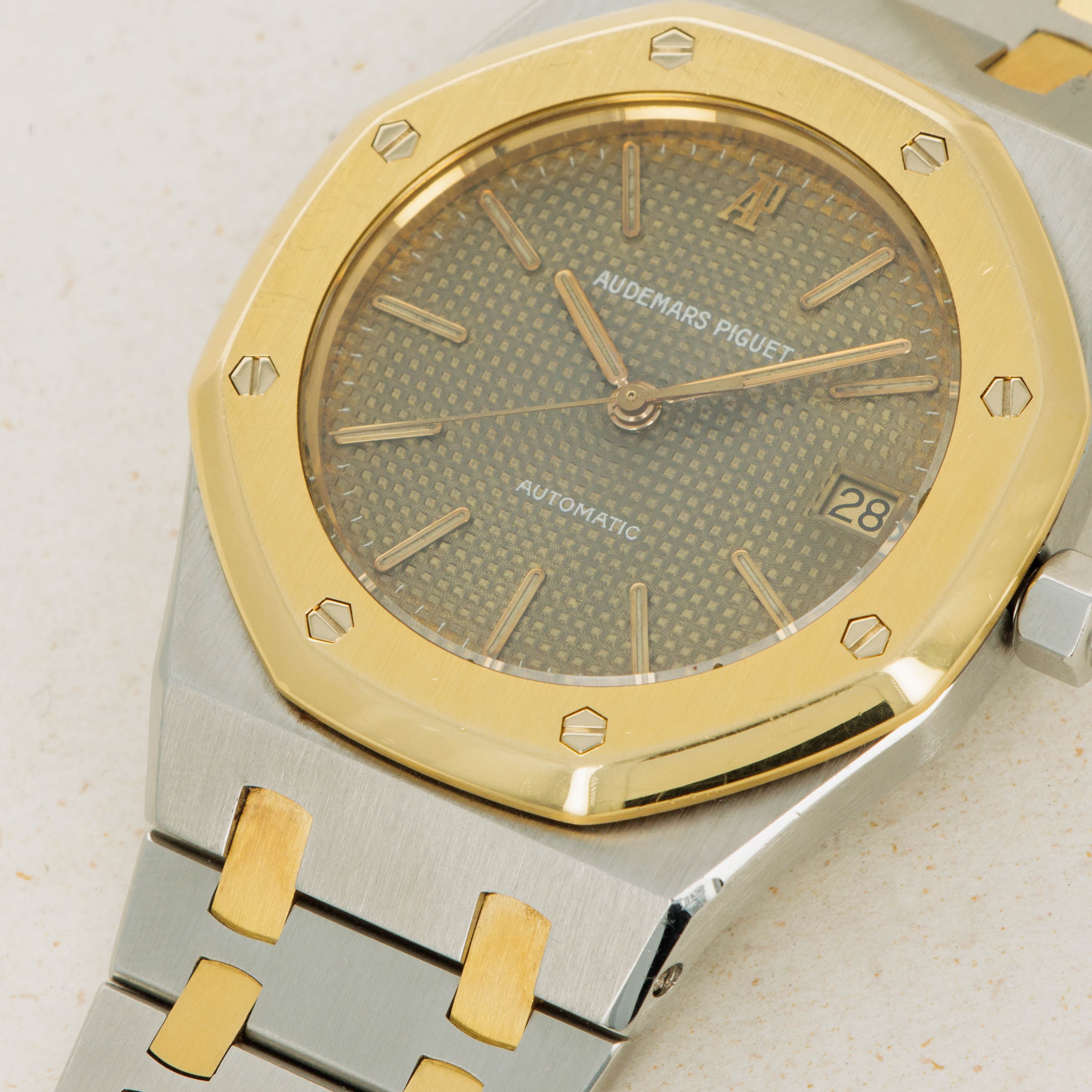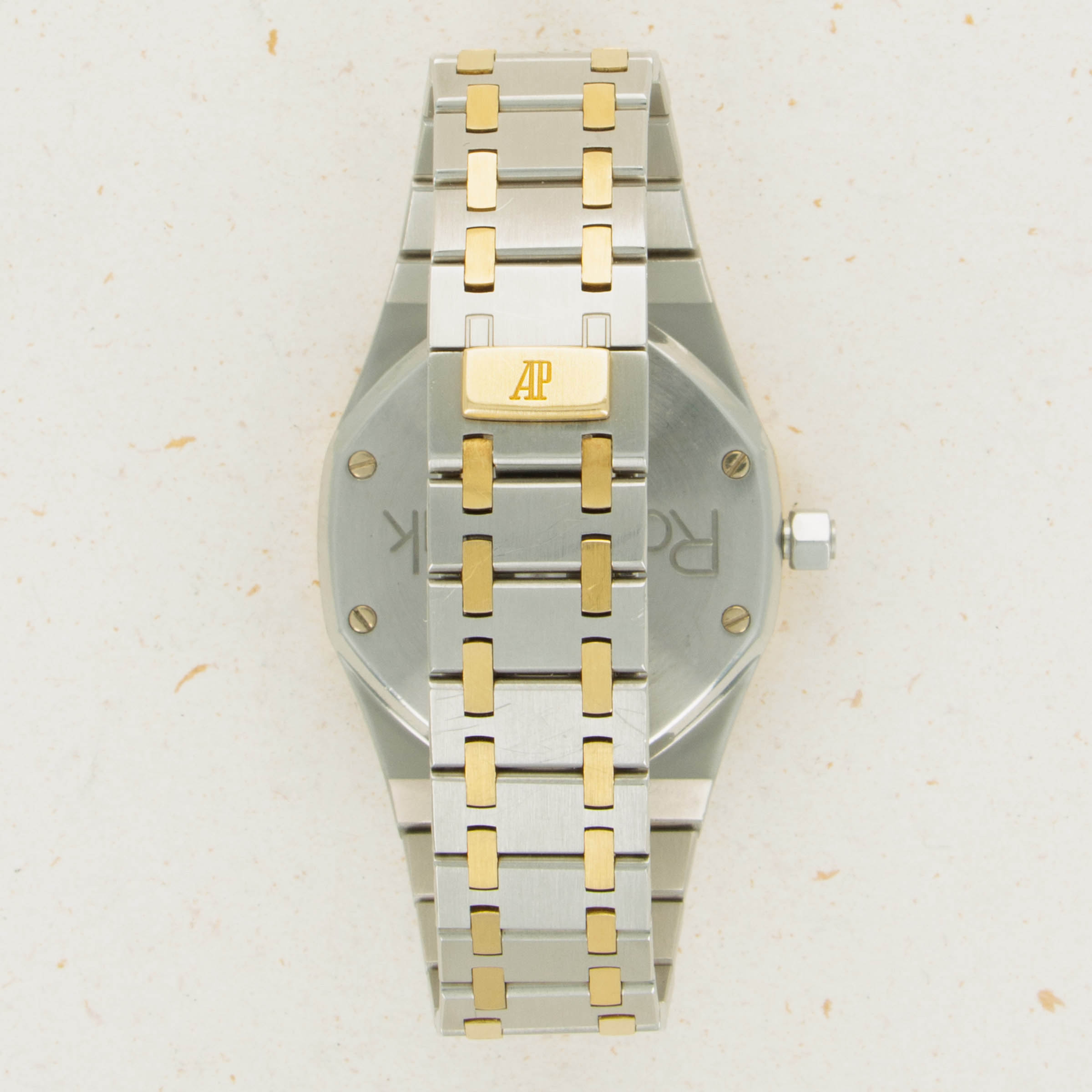 As one of the integral parts of the Royal Oak's aesthetic, its stunning three-piece link bracelet is wonderfully complemented by a two-tone construction with its large stainless steel links held together by two small 18k yellow gold links - as perfectly displayed by the ref. 14790's two-tone 36mm construction.