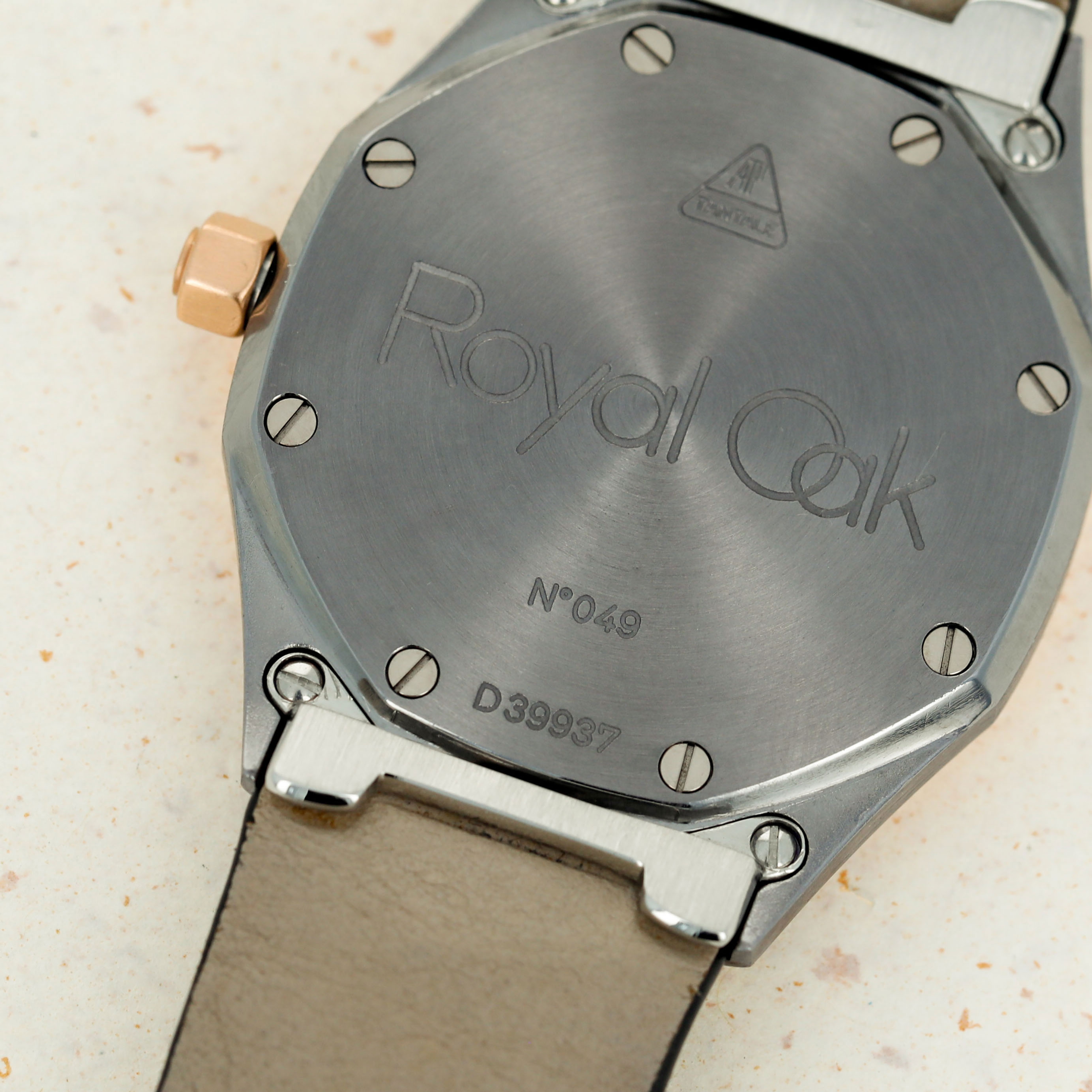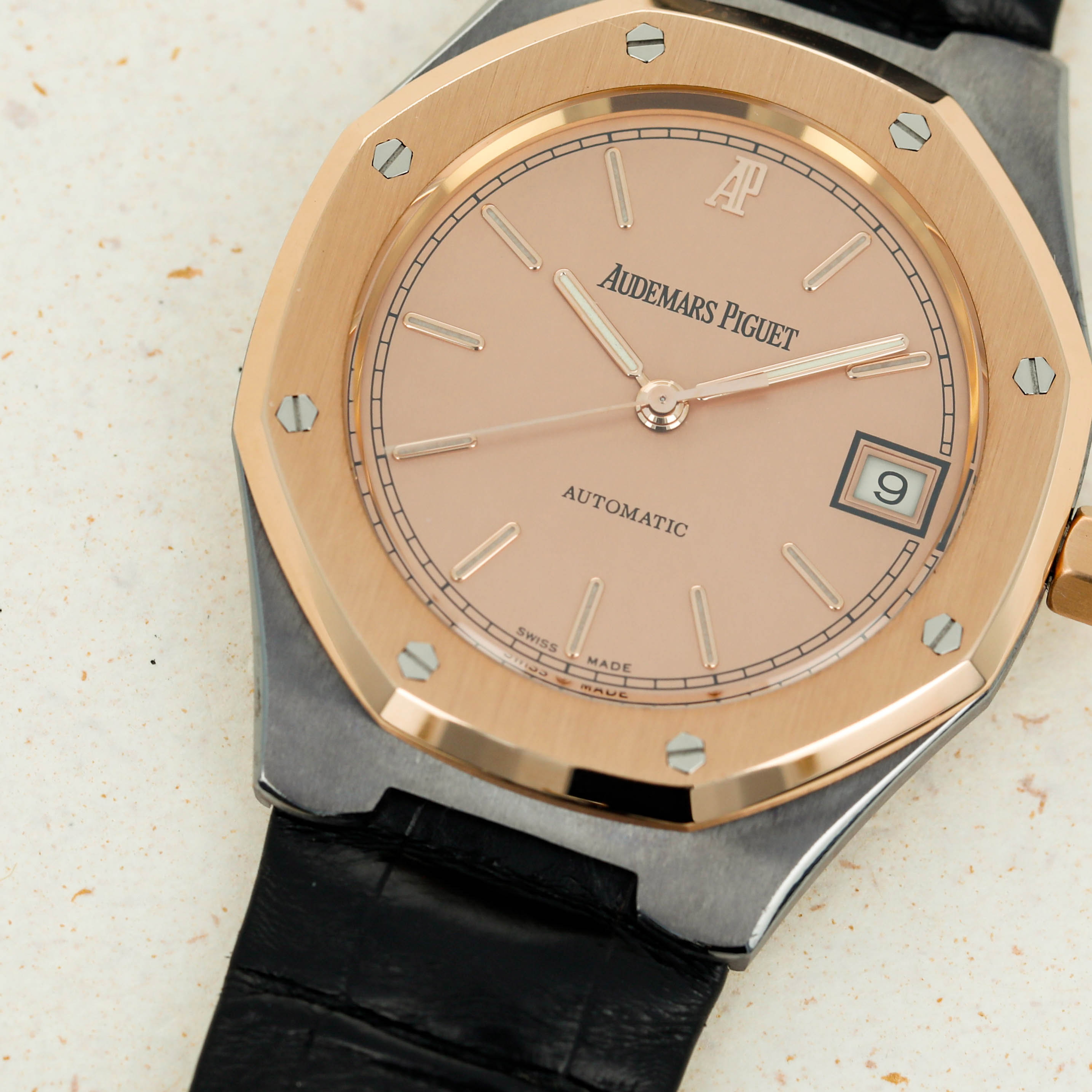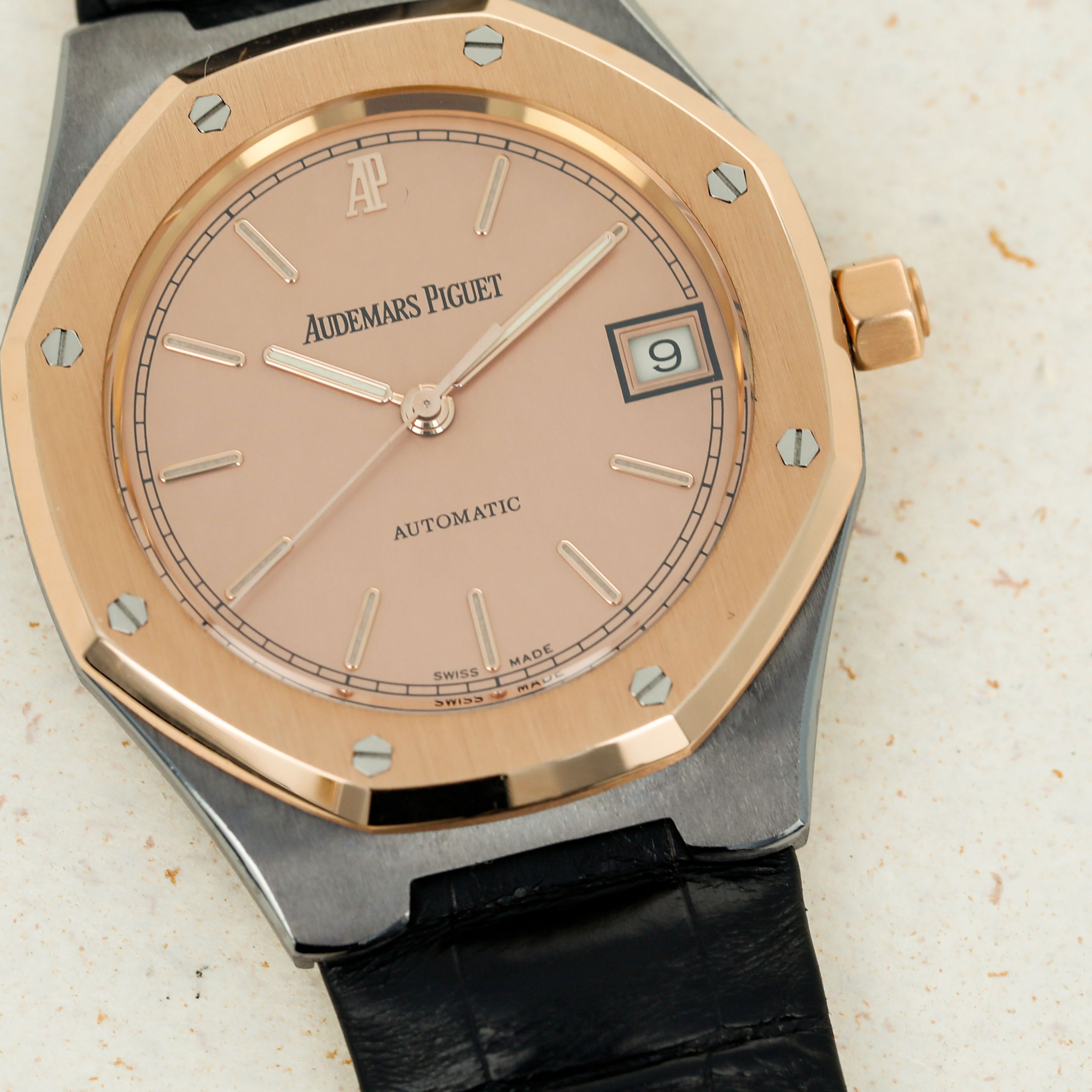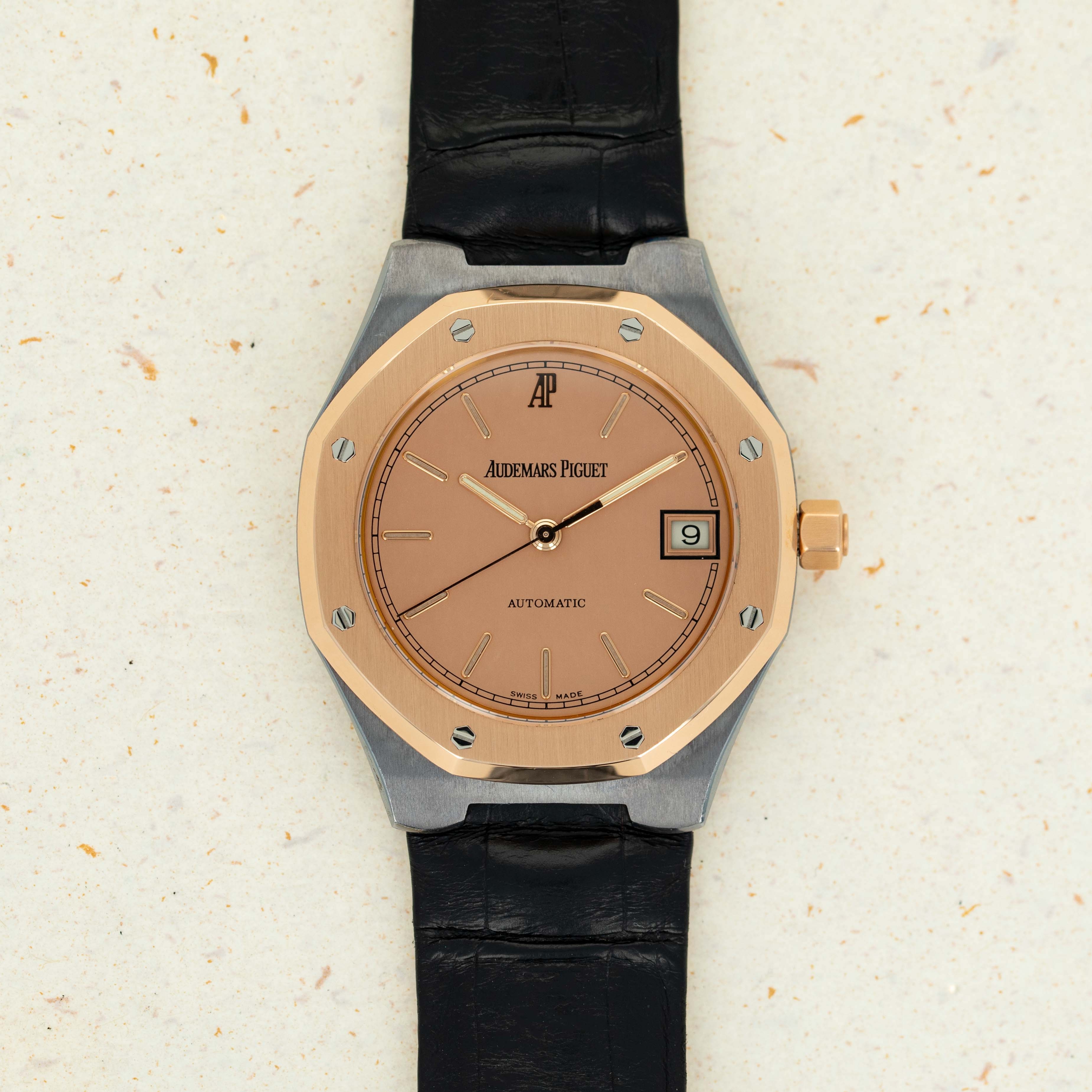 Beautifully matching its rose gold bezel and crown, this example sports a salmon dial that lacks the Royal Oak's signature 'Tapisserie' texture, giving it a unique look for a Royal Oak.
