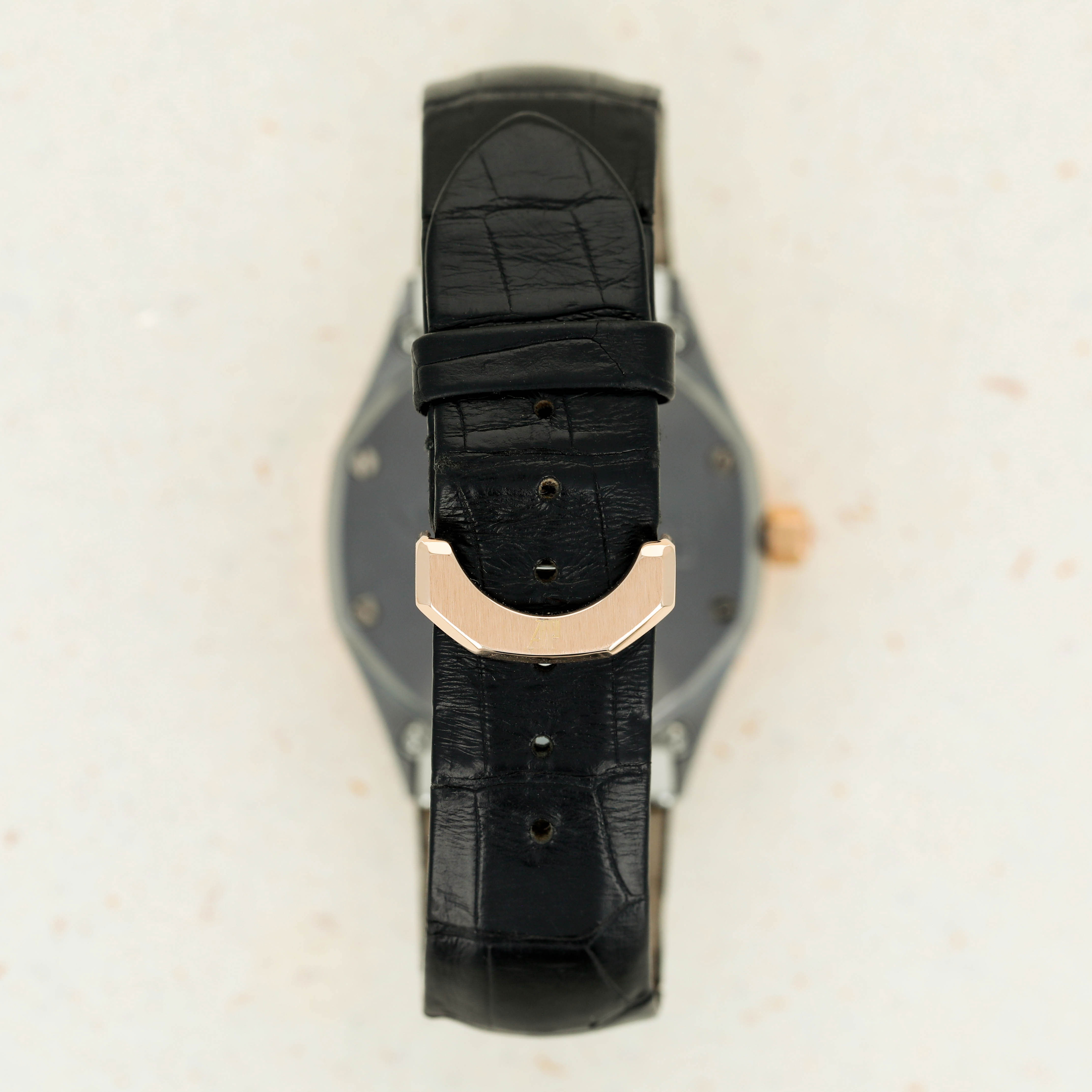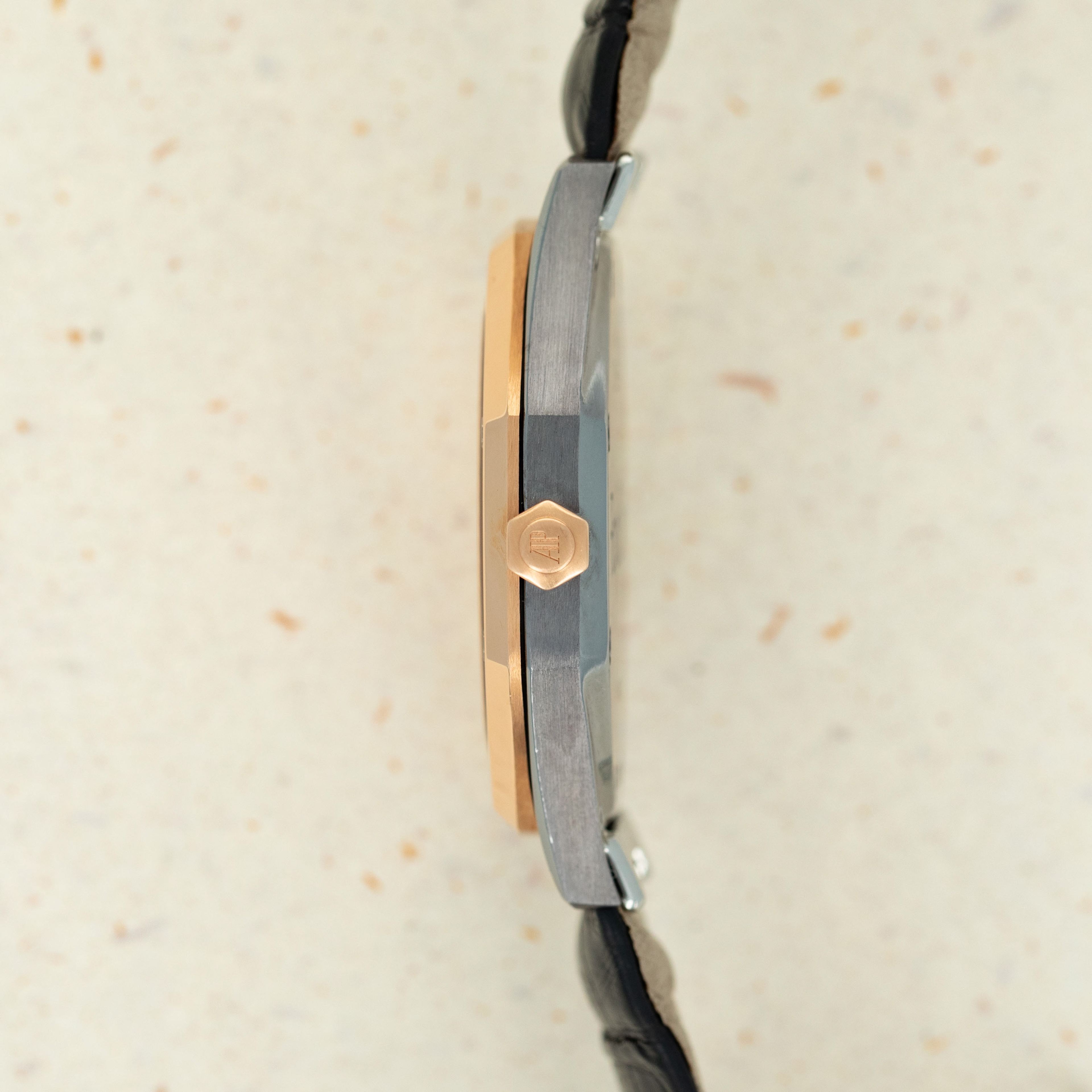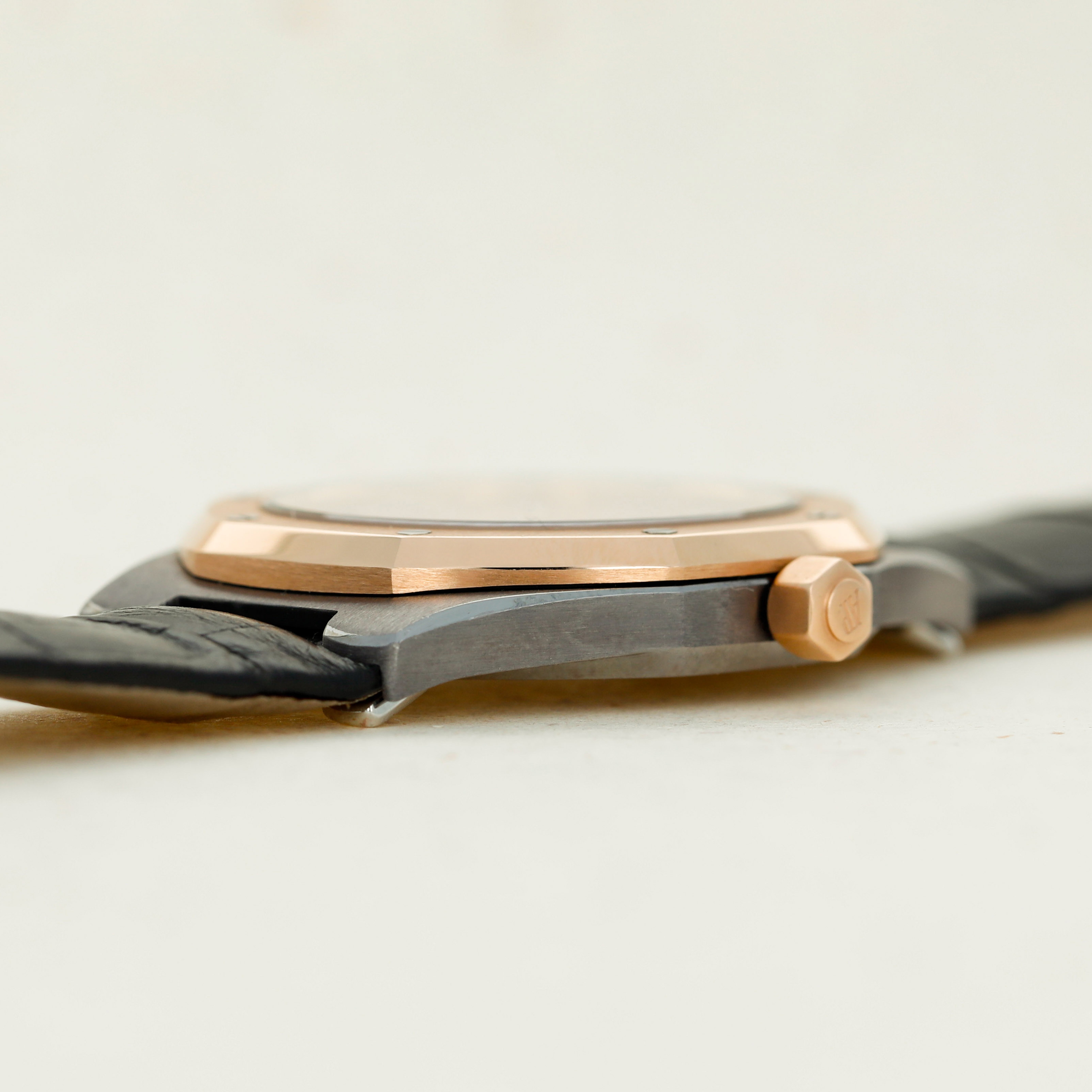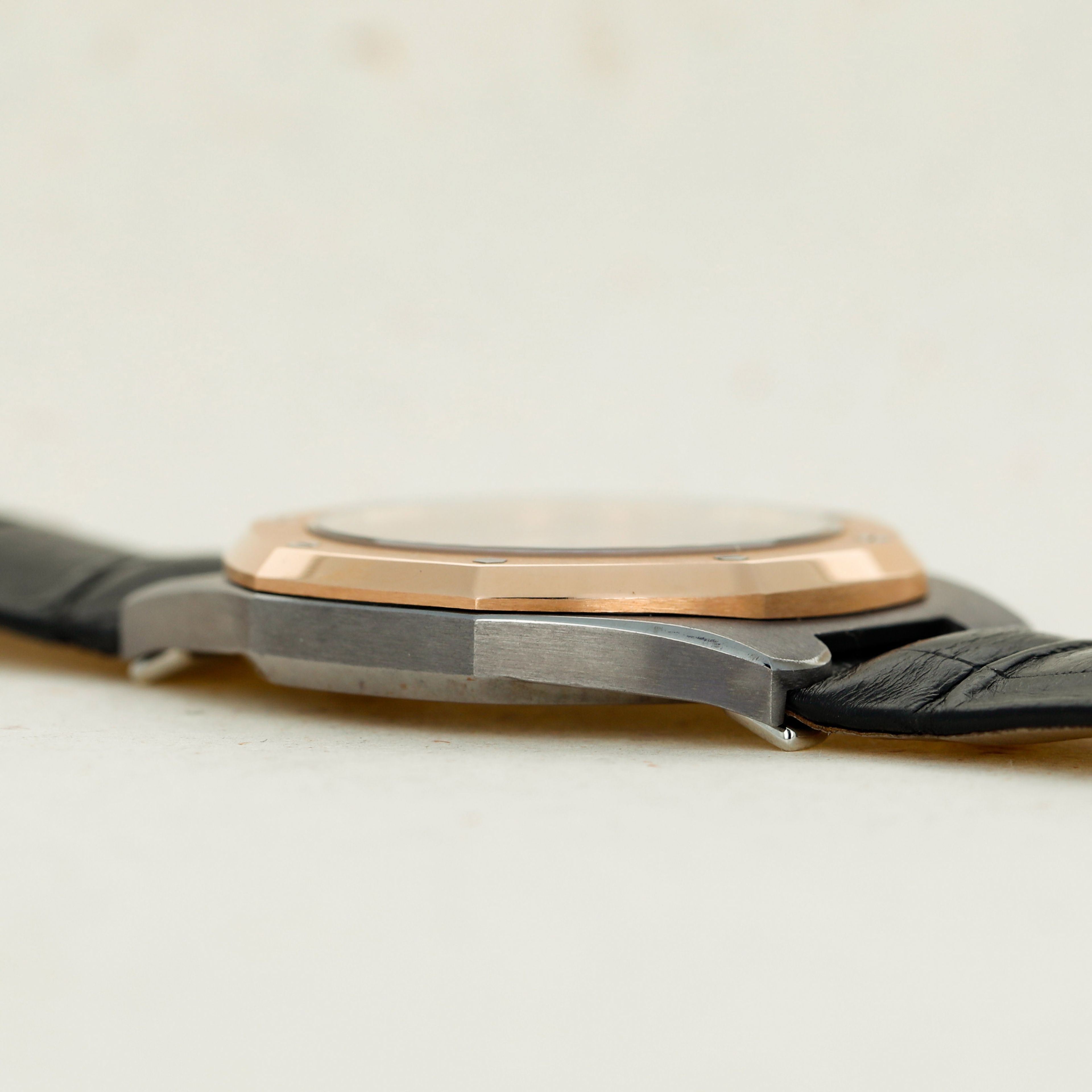 Boasting an interesting construction for a Royal Oak, the ref. 14800TR features different lugs from the Royal Oak's typical design, whereby its lugs take a more typical approach to merging onto the leather strap via the outsides of the strap. Additionally, it also features a two-tone aesthetic that is not often seen in watchmaking and is anchored in the pairing between rose gold's warm allure and the famously hard and corrosion-resistant metal tantalum's blue-grey color.