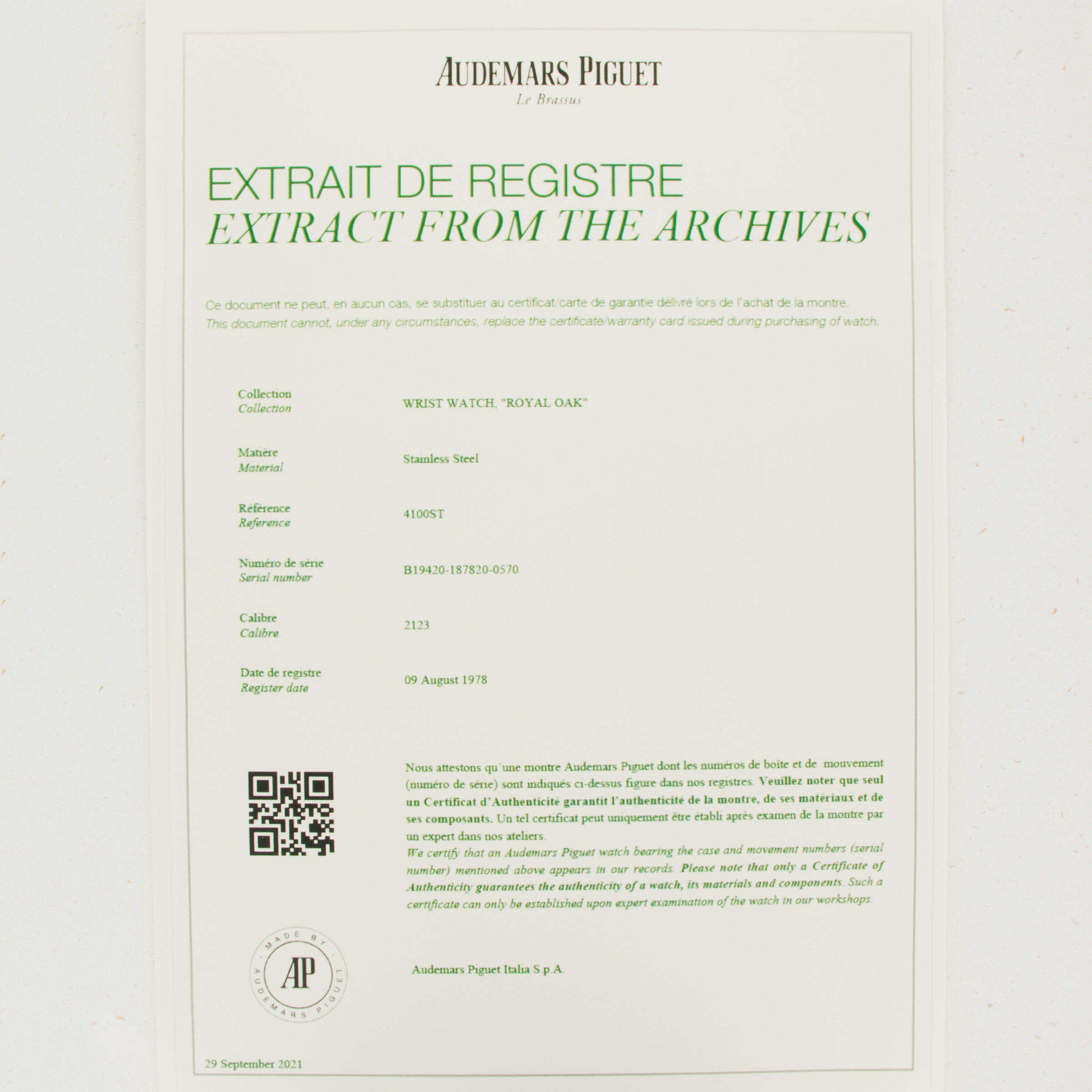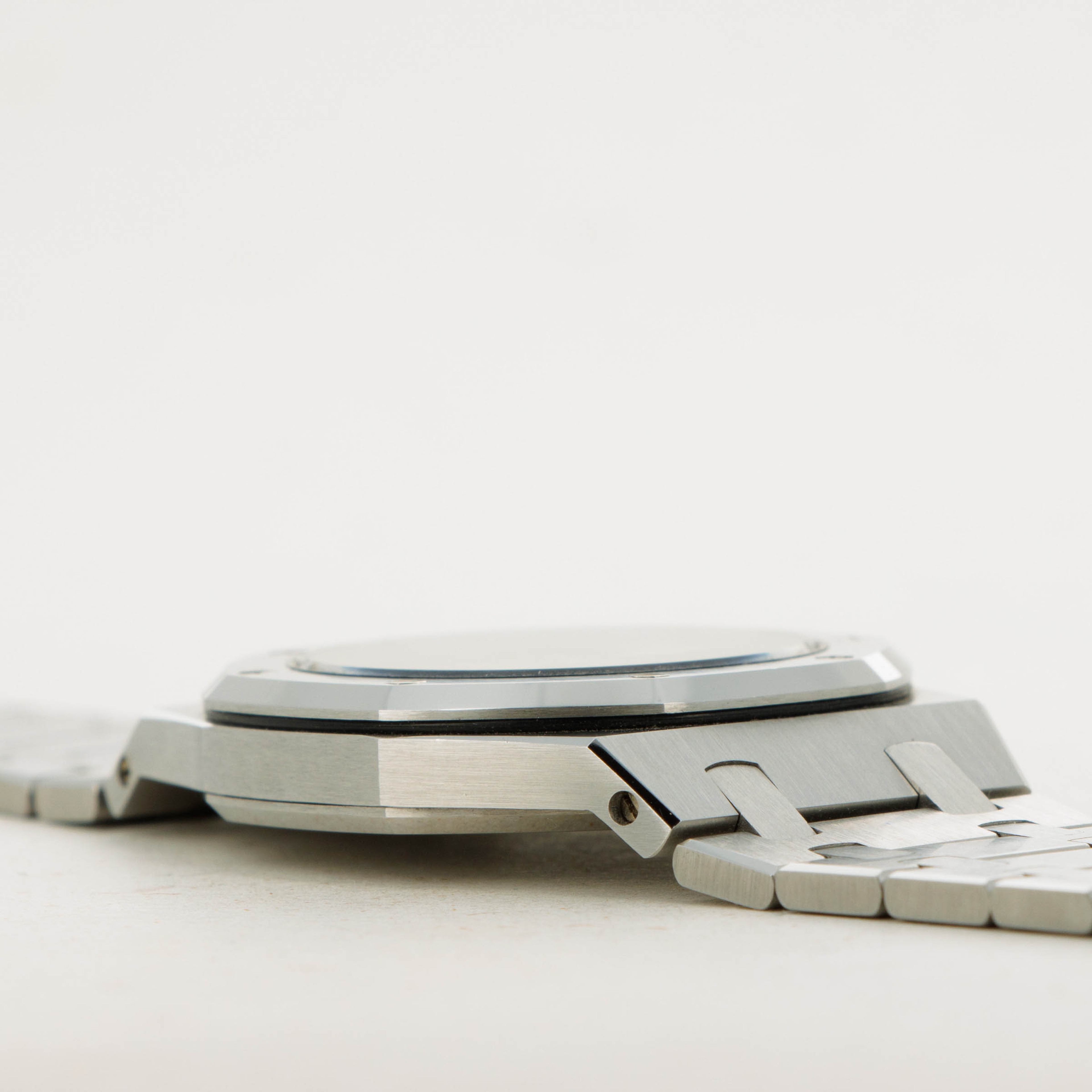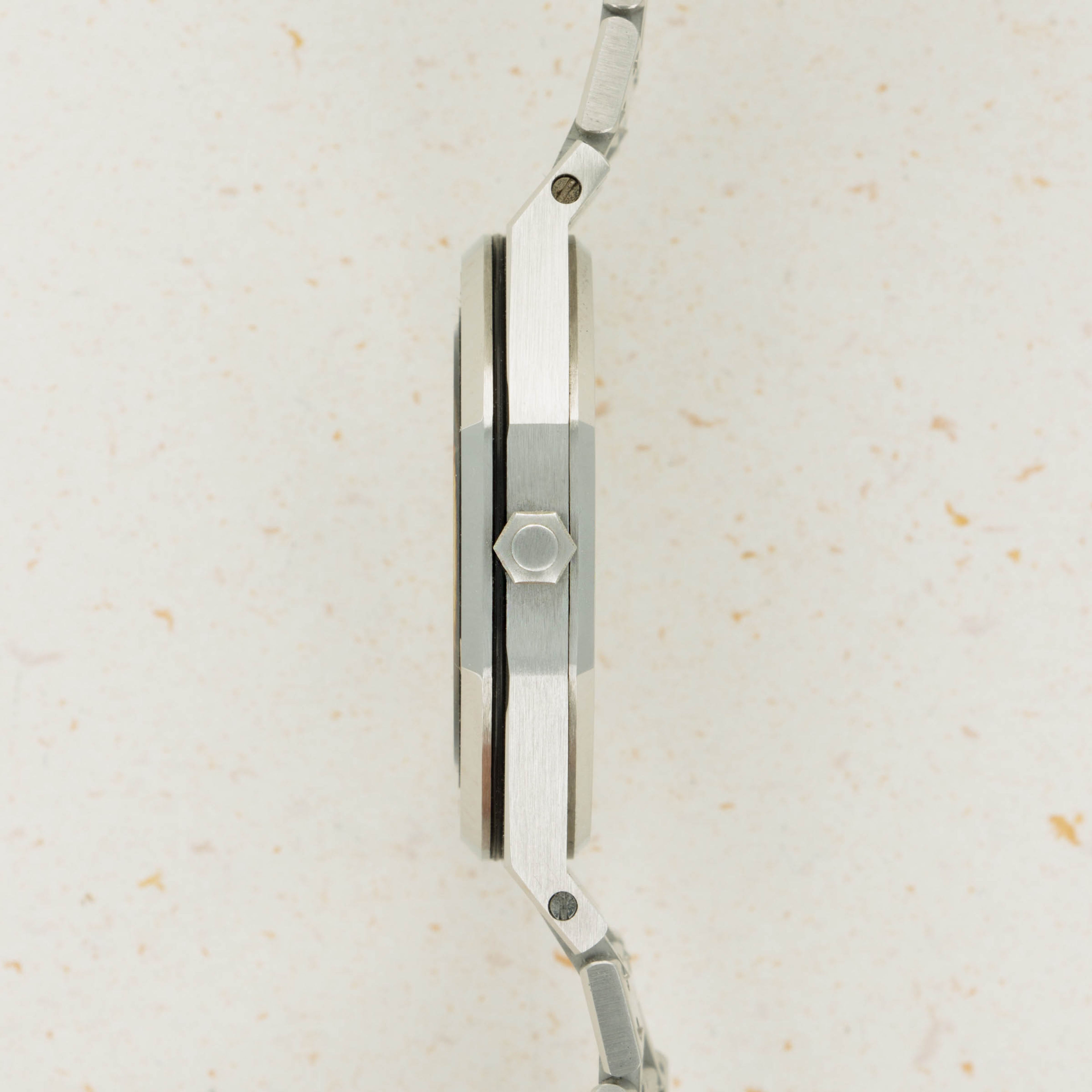 Released in 1972 and designed by Gerald Genta, watchmaking's most famous designer, the Audemars Piguet Royal Oak was the first stainless steel luxury sports watch ever to exist. Released as a tactic to survive the quartz crisis, the Royal Oak can single-handedly be thanked for AP's existence today due to its astounding success, albeit it wasn't an overnight hit. Its sizeable tonneau-shaped case, signature integrated bracelet, octagonal bezel, exposed screws, and steel construction failed to win over collectors until a few years later. With its 39mm stainless steel case it was quickly nicknamed the “Jumbo” due to how much larger it was compared to other watches from the time. As a result, AP decided to down-size the Royal Oak in 1976 by launching the ref. 8638, a 29mm female variant and the ref. 4100ST, which we have here, in 1977. Sized at 35mm, the ref. 4100ST was much more in tune with how large watches were in the seventies and thus a popular model with around 8400 pieces produced between 1977 and 1984. Launched as the third Royal Oak variant ever, the ref. 4100ST features the Royal Oak’s signature ‘Petite Tapisserie’ dial, but with the inclusion of a central seconds hand, the result of its automatic cal. 2325 movement. Launched in stainless steel, two-tone and all gold, the model we have here is the stainless steel variant – the truest reflection of the Royal Oak’s iconic identity.