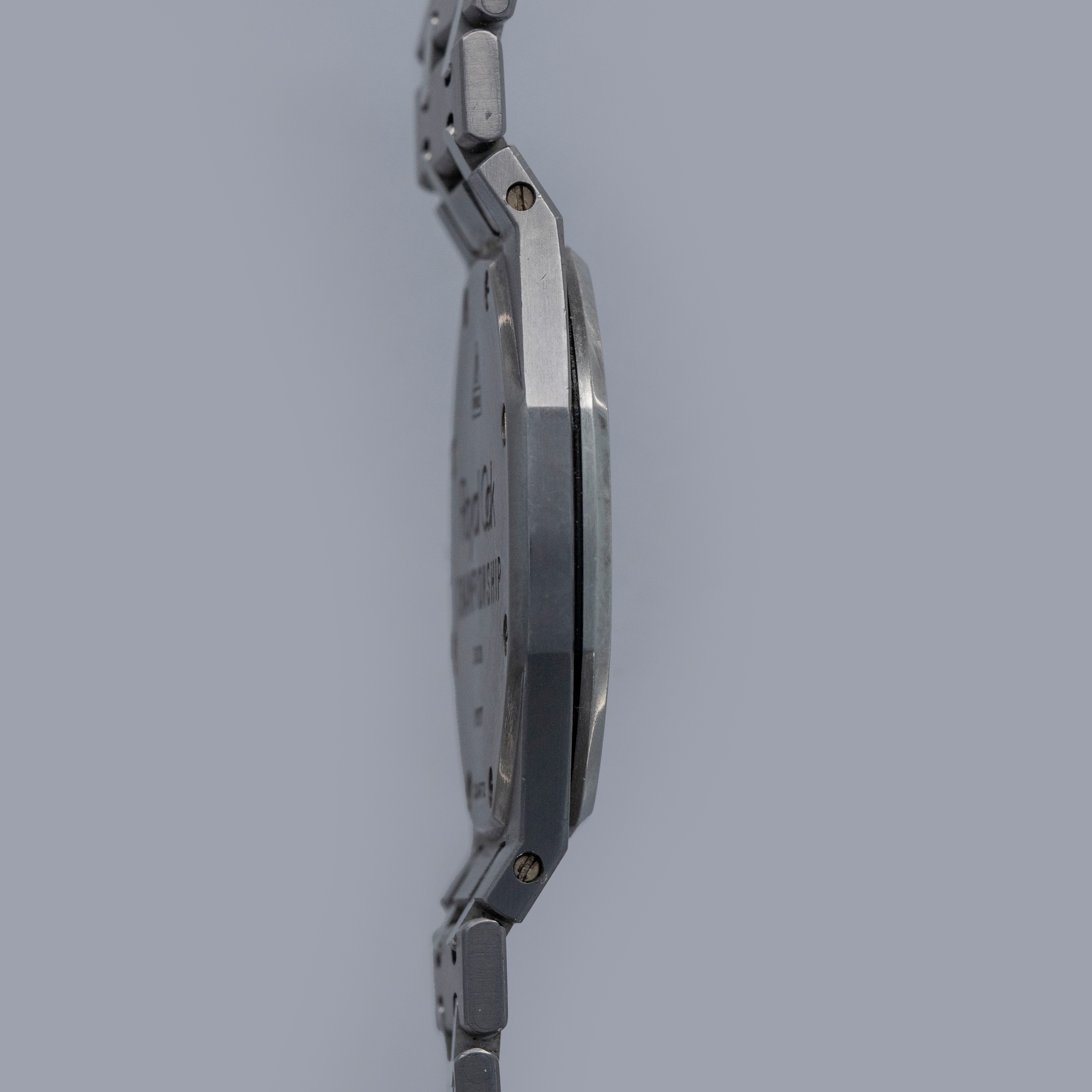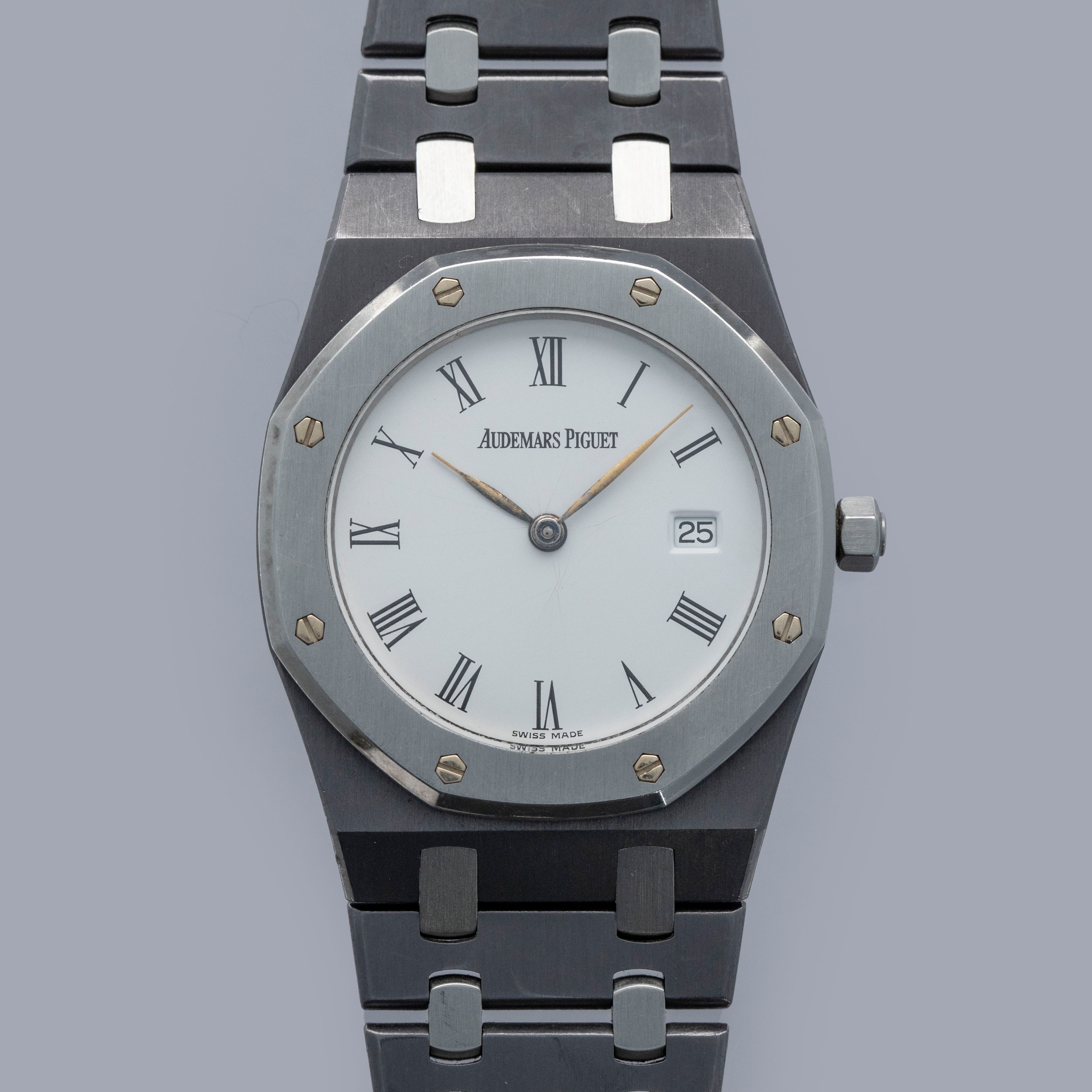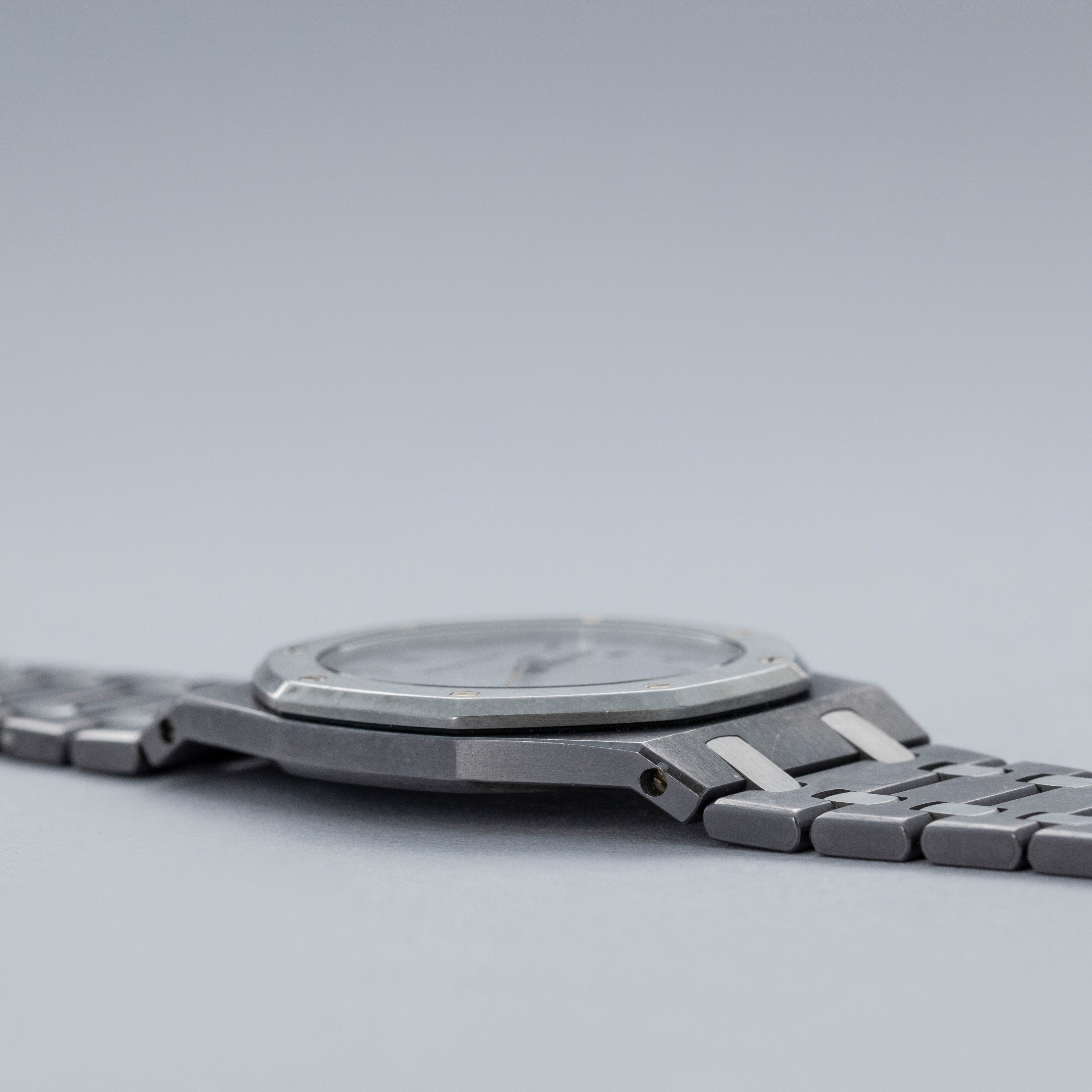 Released in the 90s, the AP Royal Oak ref. 56175 is a wonderful example of the Royal Oak's ability to be sized up or down depending on the customers that AP wanted their watch to cater for. A 33mm diameter timepiece, the ref. 56175 is indeed a scaled-down version of Gerald Genta's iconic design, with every aspect of its construction equally scaled-down so precisely that nothing is out of place. Constructed from tantalum and stainless steel, and powered by a quartz movement, this the ref. 56175TT caters to the original ideology that spurred the Royal Oak's design as an everyday luxury sports watch, but with a twist in that it swaps the Royal Oak's typical stainless steel for a metal seldom seen in watchmaking, and most commonly seen in the aerospace industry. Fitted with a white Roman numeral dial displaying just the time, the Royal Oak ref. 56175 is understated due to its lack of exuberant functions while retaining its iconic design and strong presence on the wrist. Launched as a limited edition variant of the ref. 56175, the ref. 56175TT boasts just 2000 pieces as part of its reference, and so this is a truly rare occasion to add this piece to your collection.