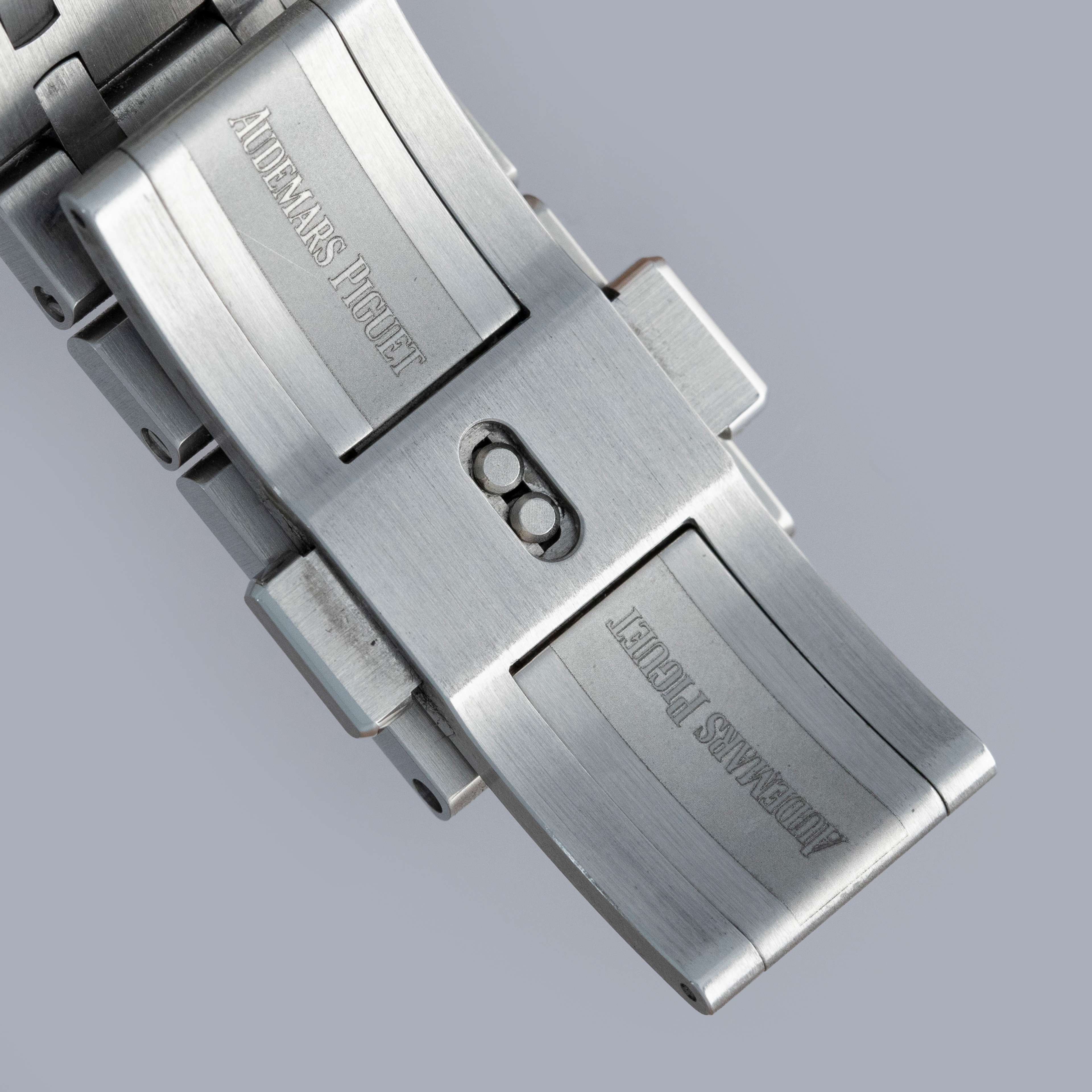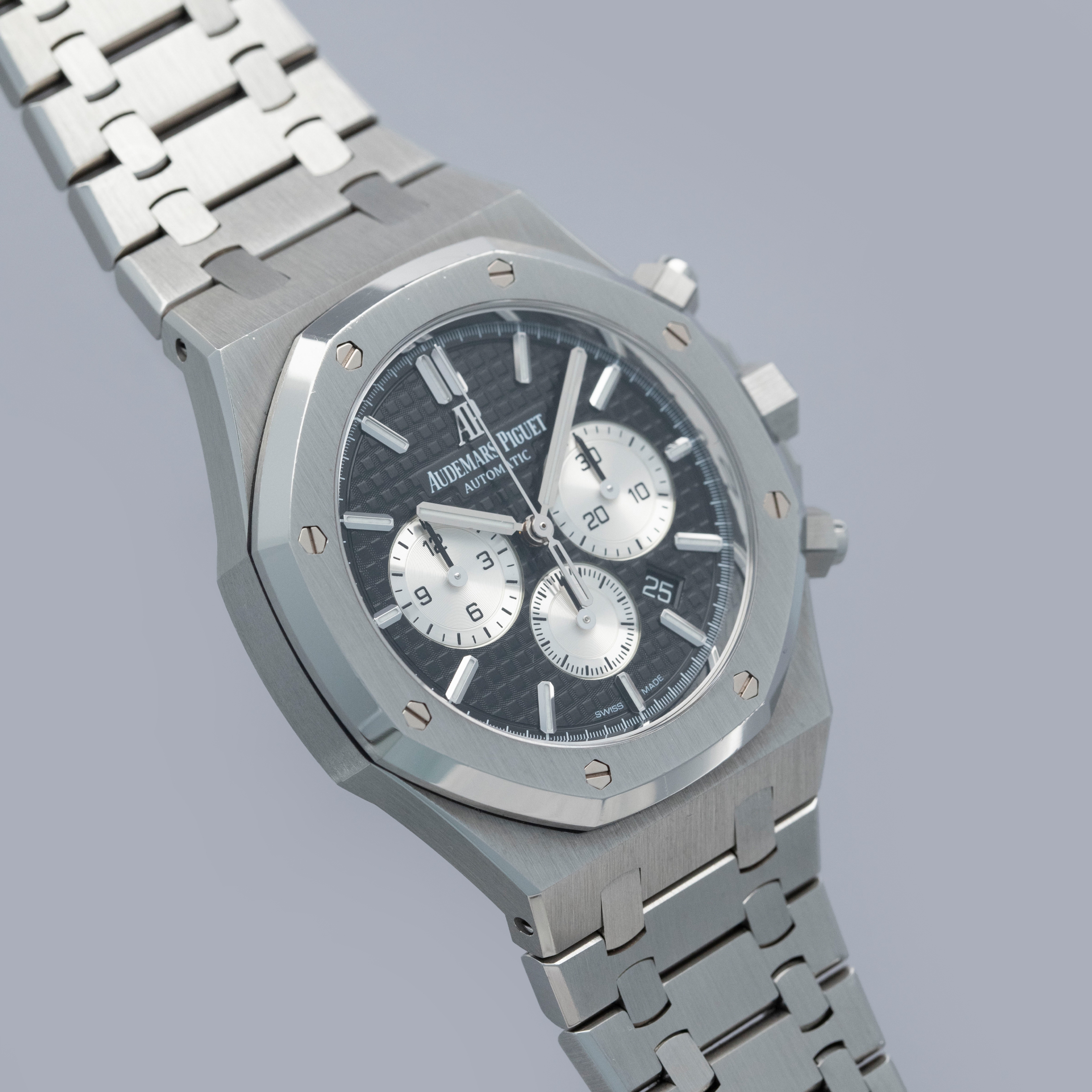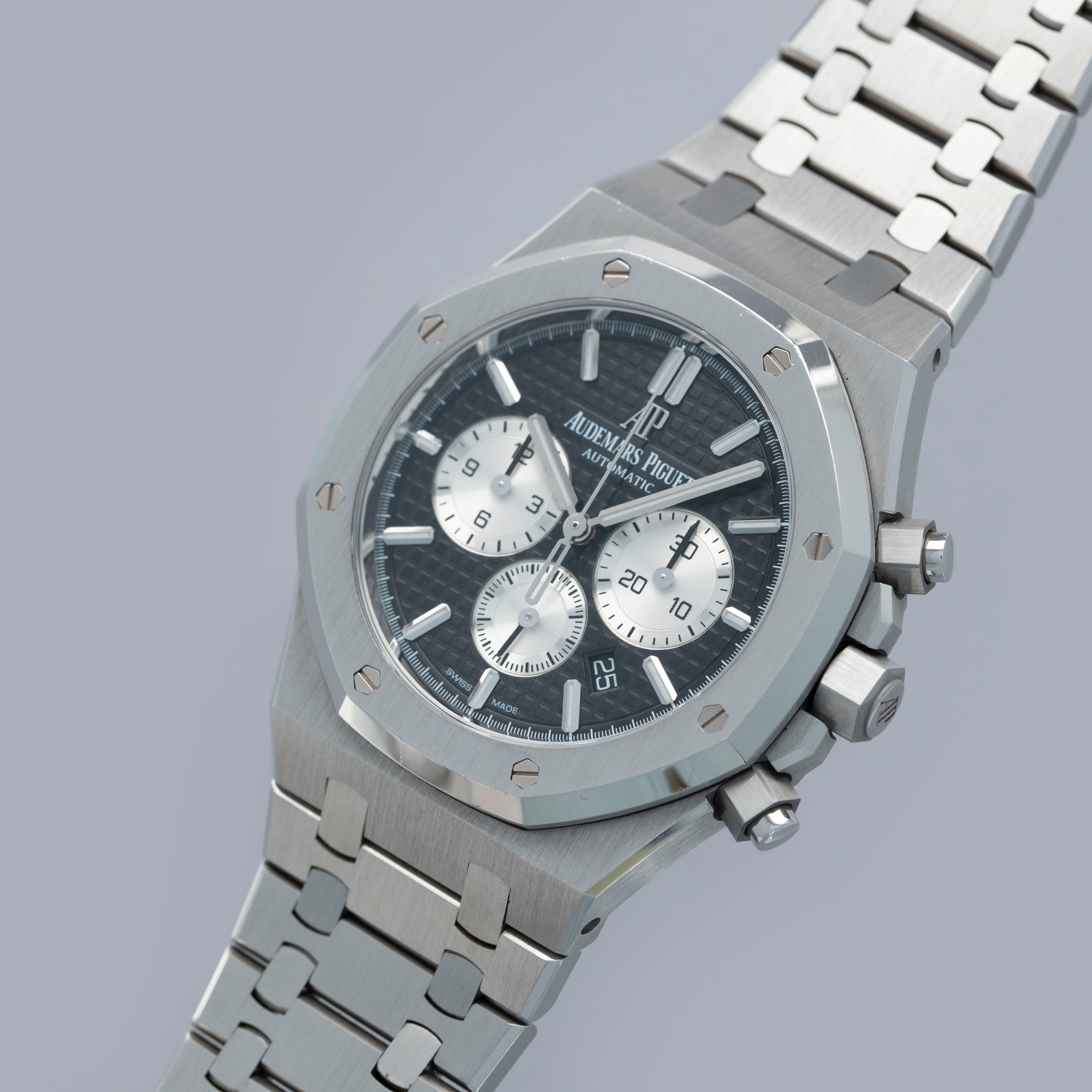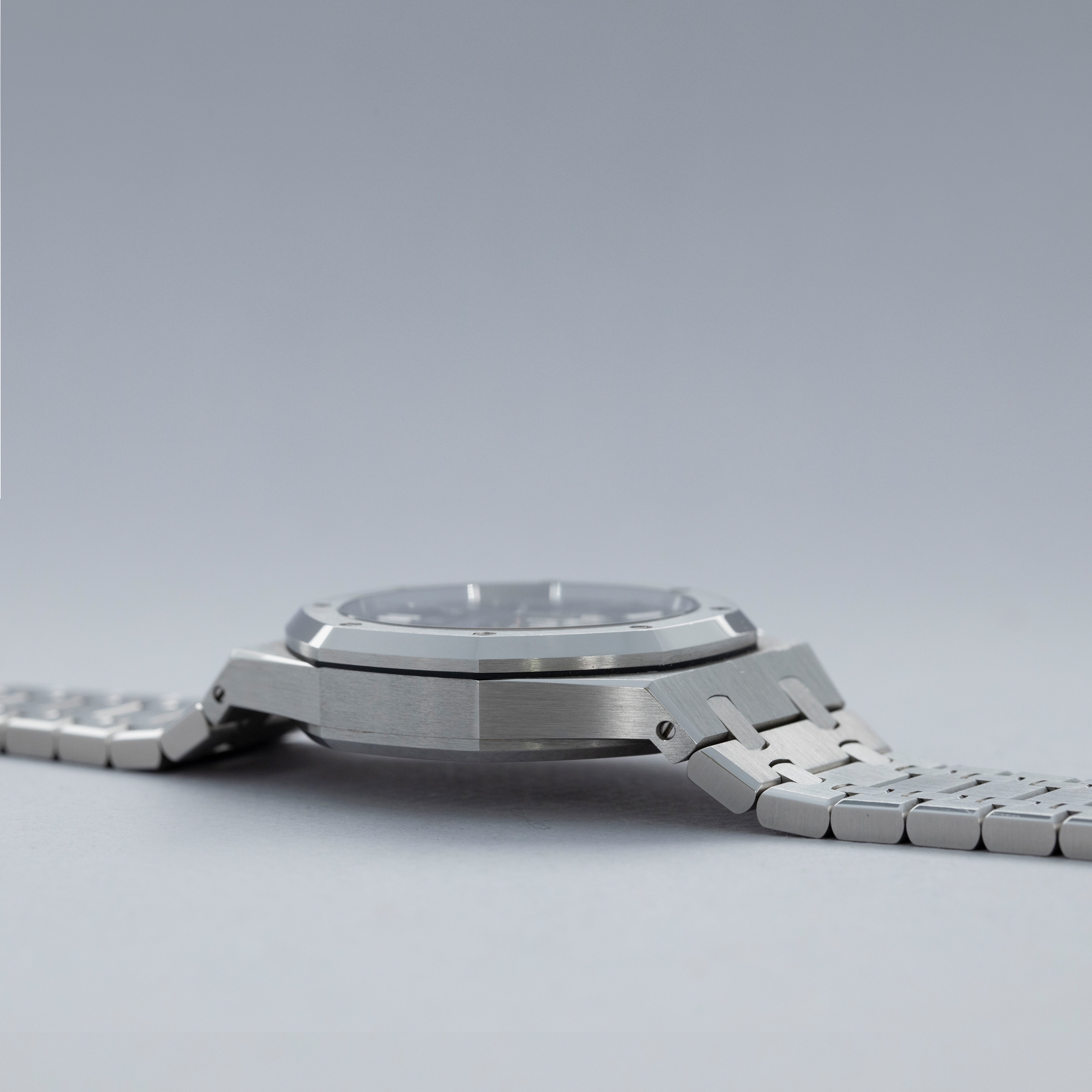 Creating a legible black and silver design, this Royal Oak features a beautiful black Grande Tapisserie dial with gorgeous silver subdials and white gold applied indices and hands that all join together to work in perfect harmony with one another.