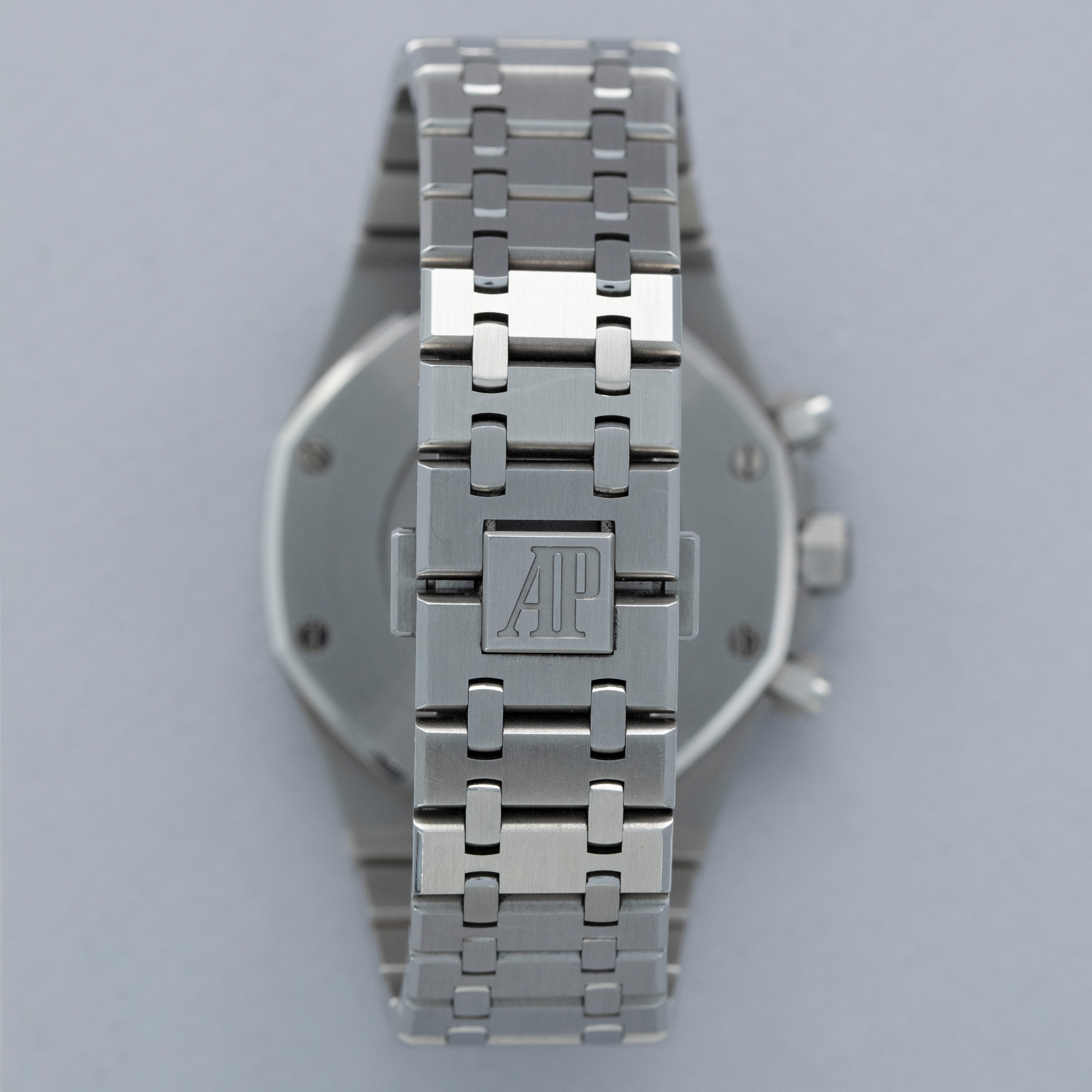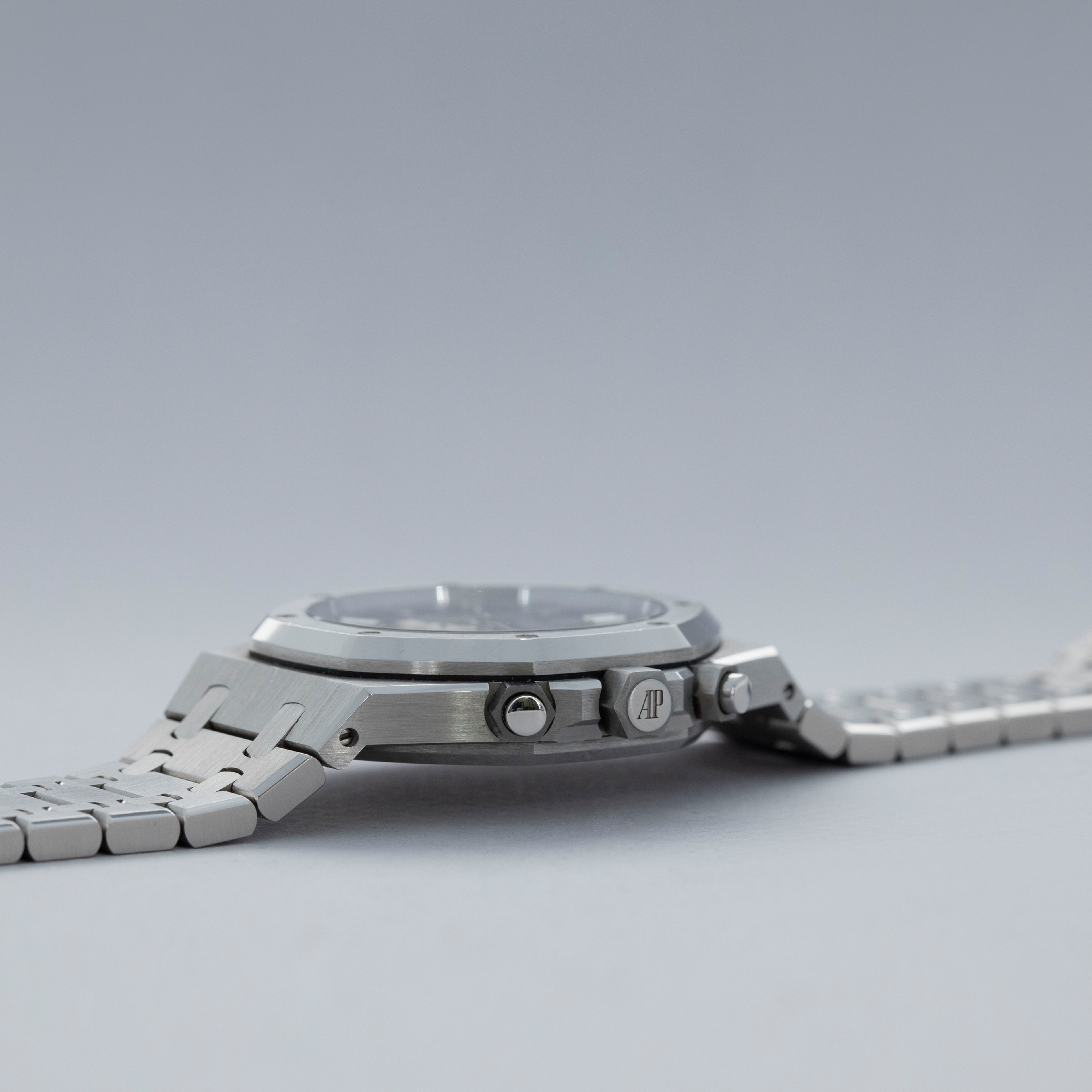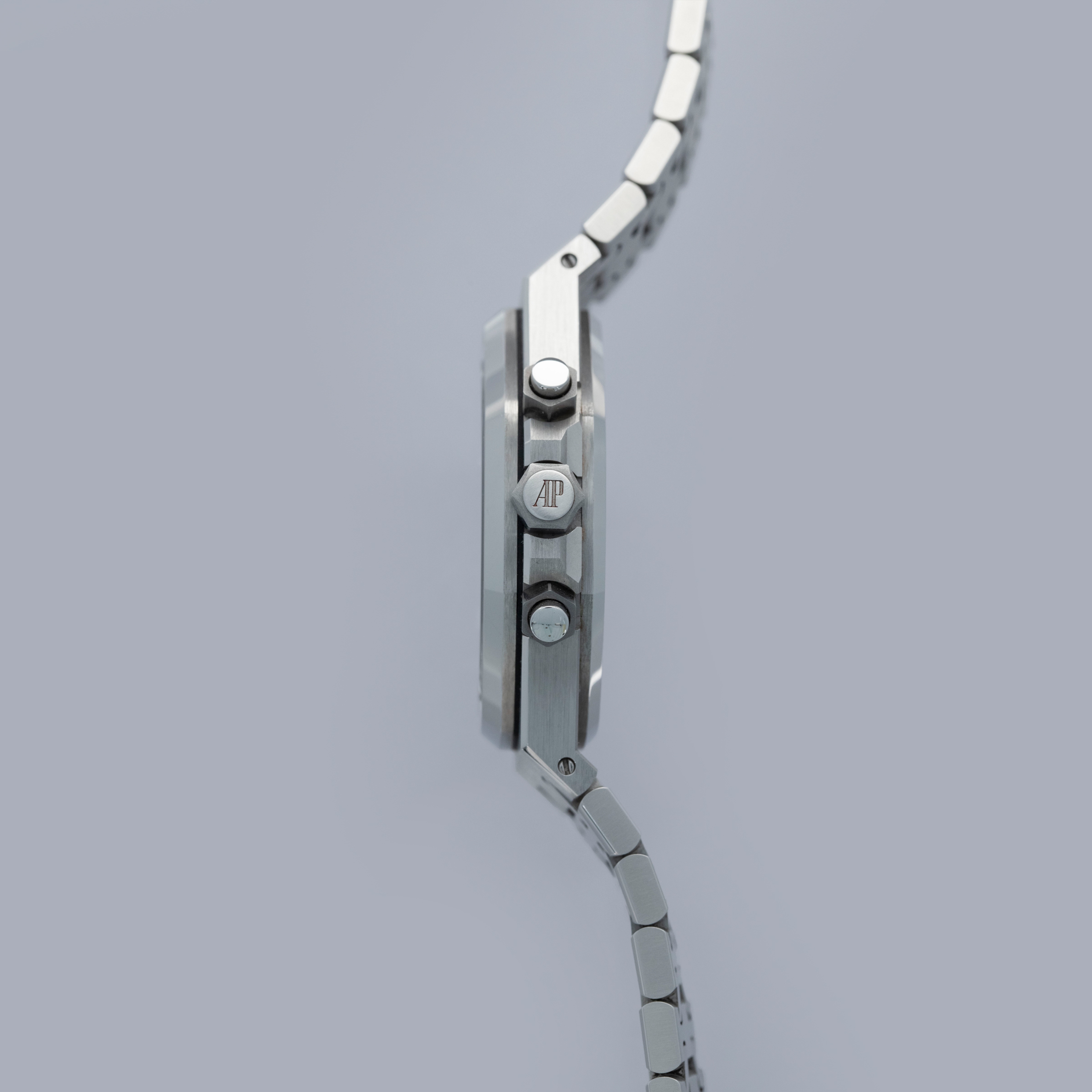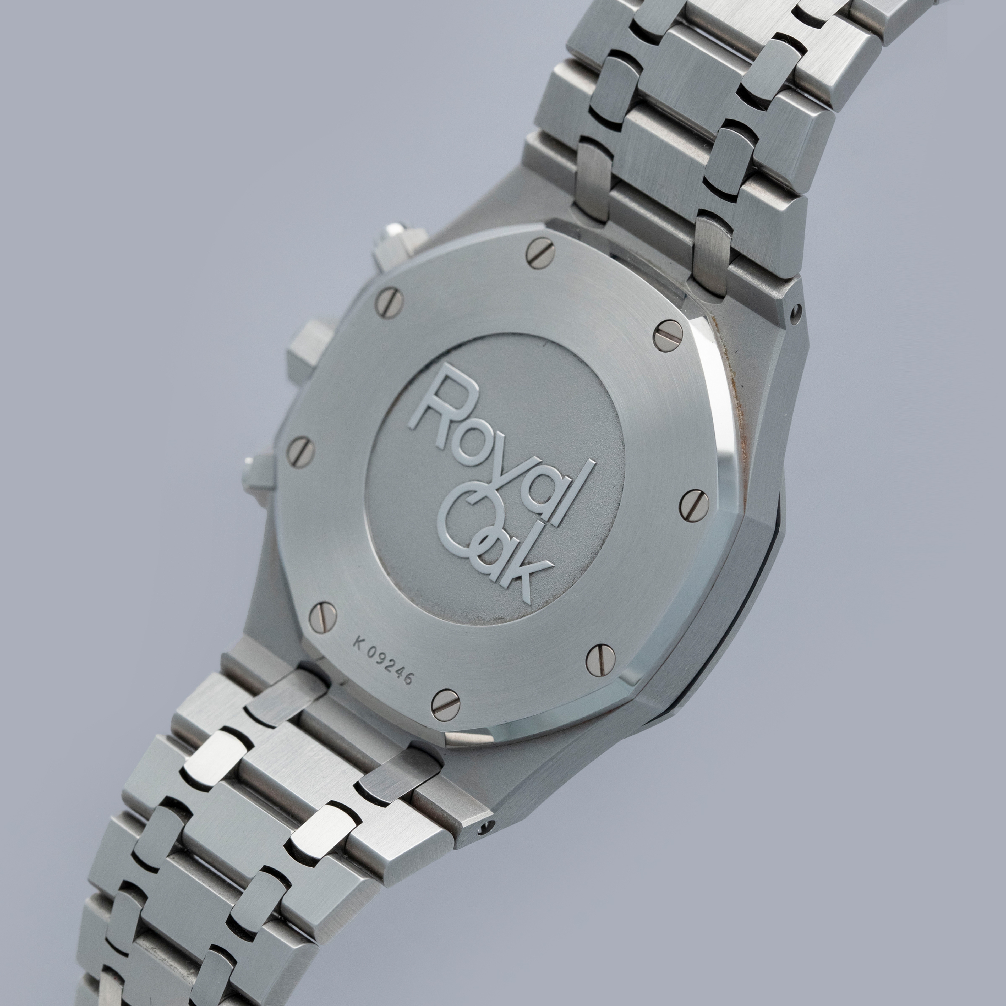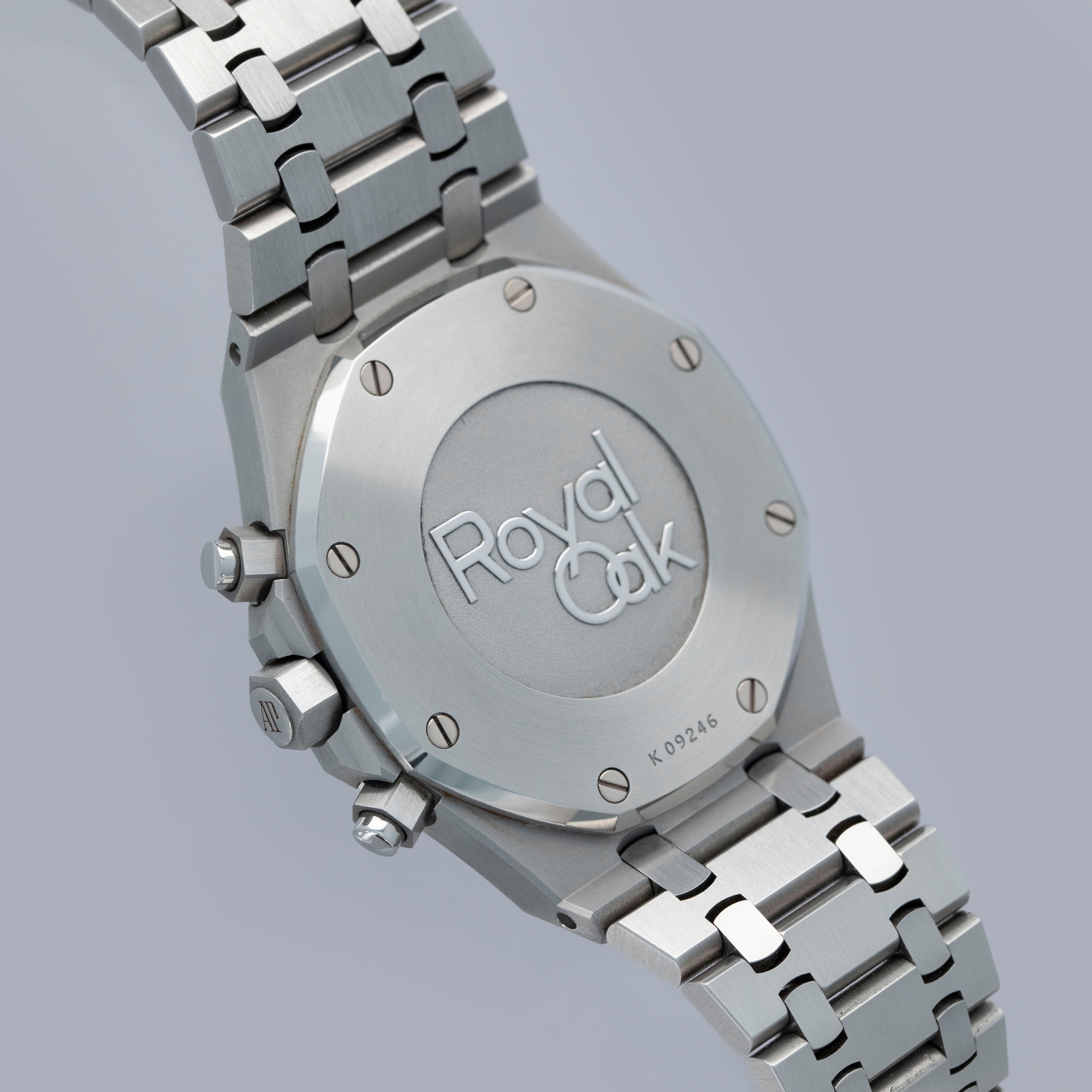 Creating a legible black and silver design, this Royal Oak features a beautiful black Grande Tapisserie dial with gorgeous silver subdials and white gold applied indices and hands that all join together to work in perfect harmony with one another.